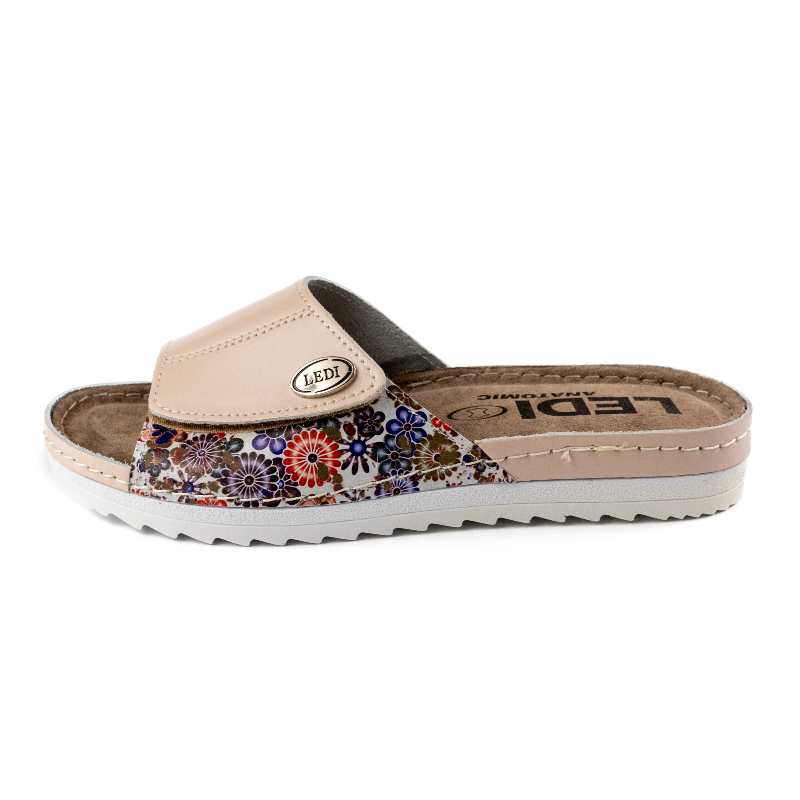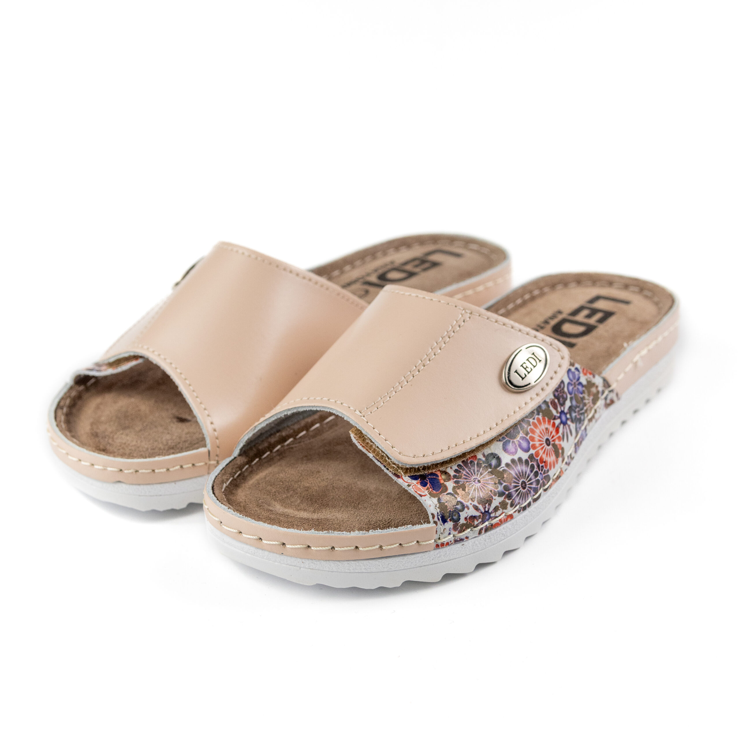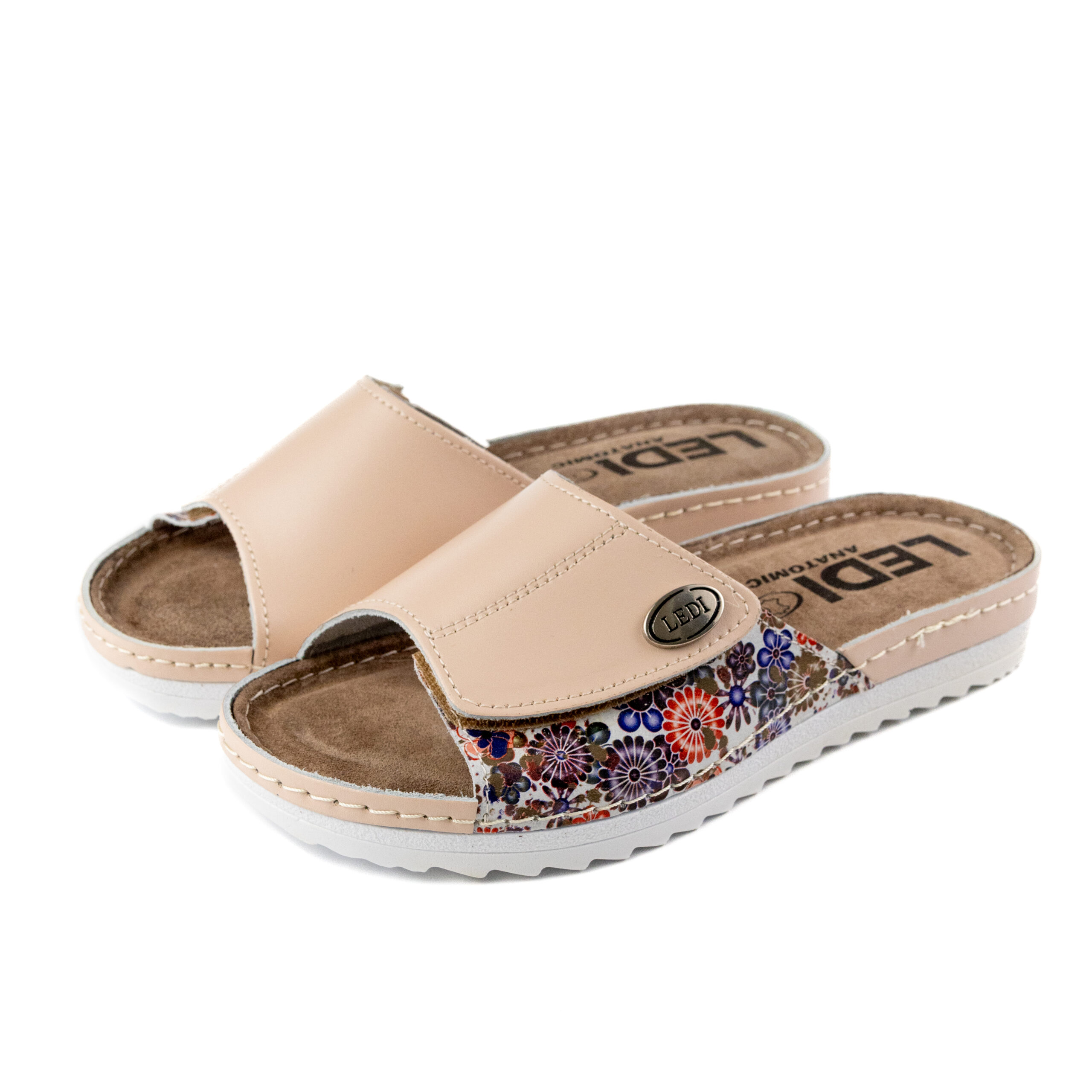Дамски анатомични чехли, естествена кожа, на велуризиран табан,който не позволява приплъзване на крака вследствие на изпотяване, на олекотено полиуретаново ходилo с височина 2см. Моделът предлага възможност за промяна на обема в юзовата част чрез самозалепващото се велкро, намиращо се под брендирания аксесоар "LEDI".