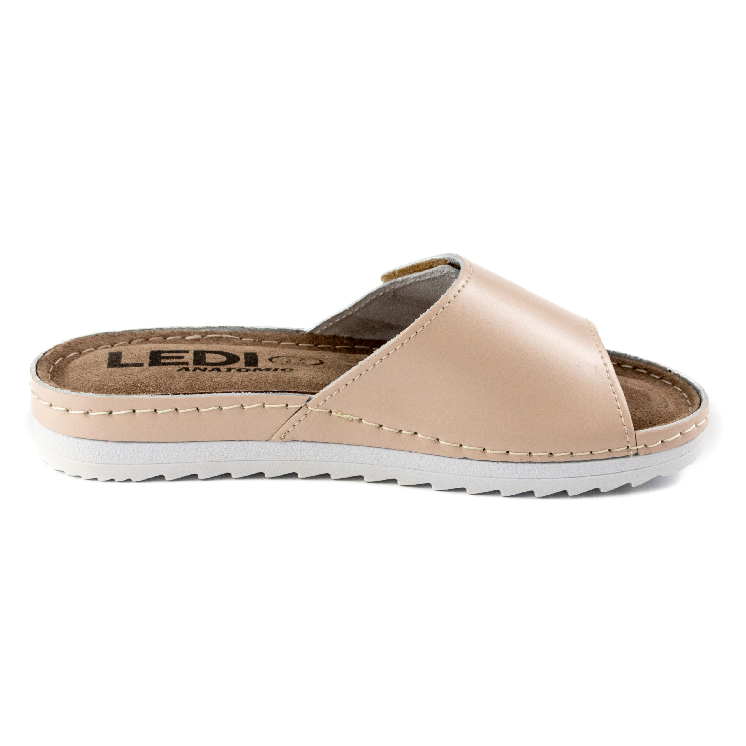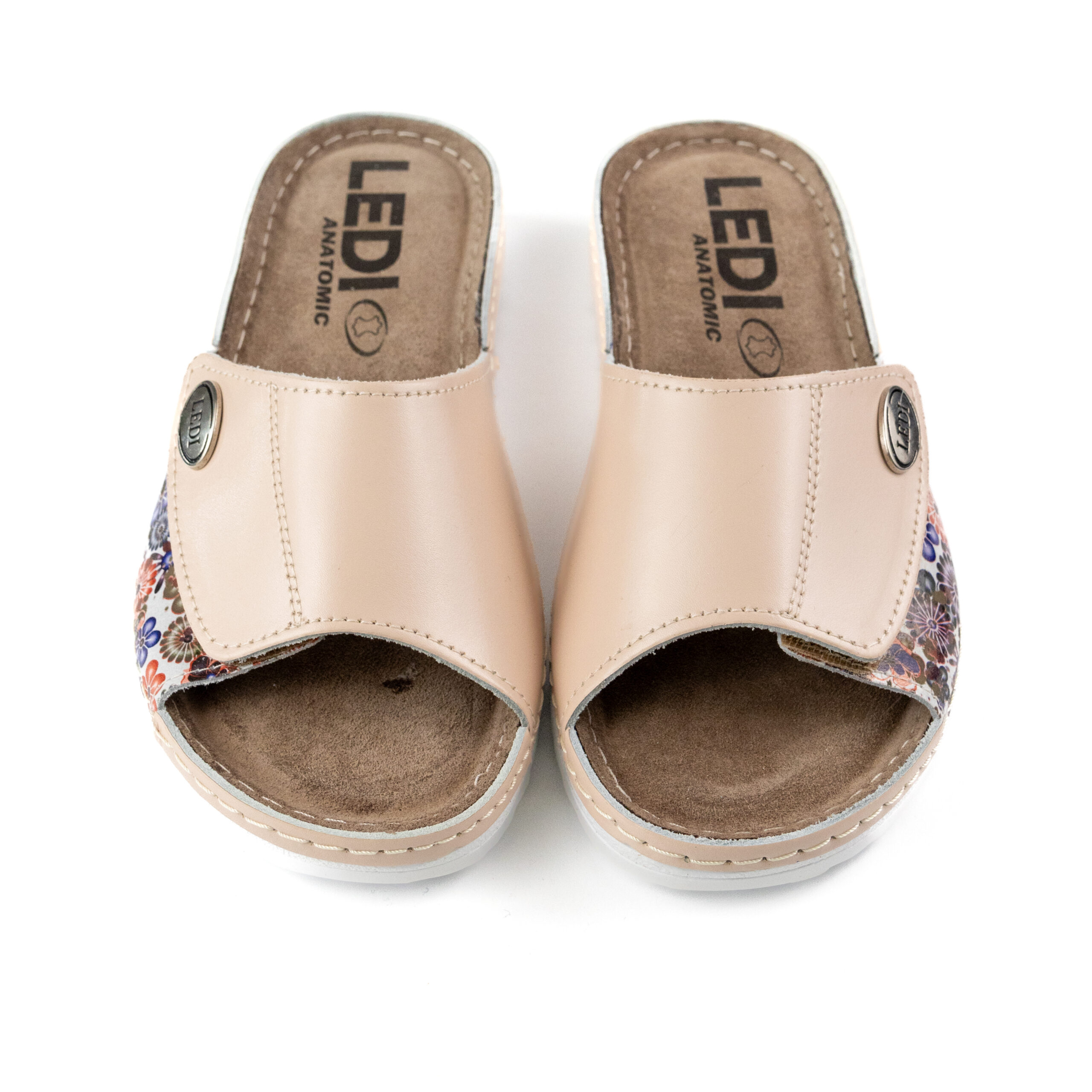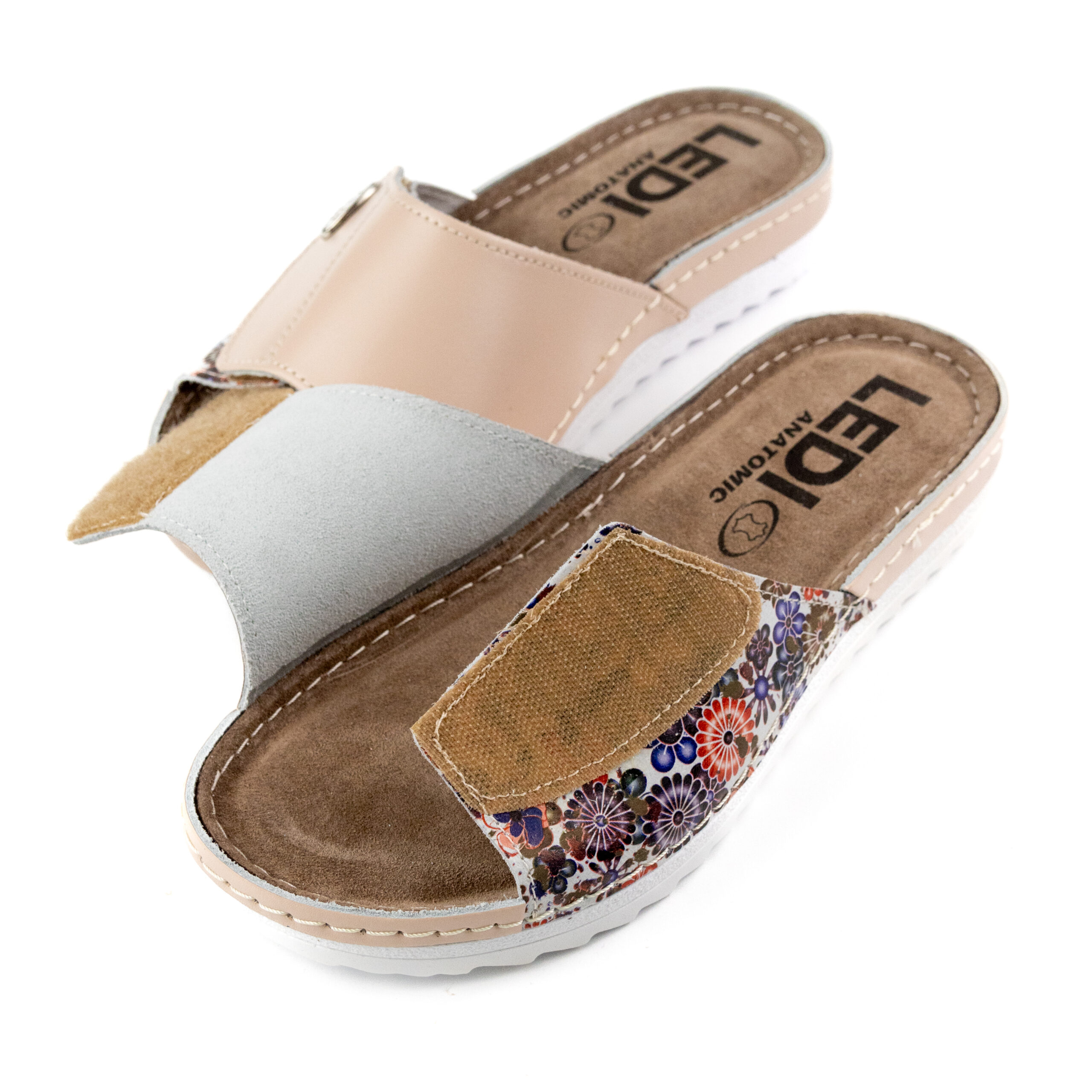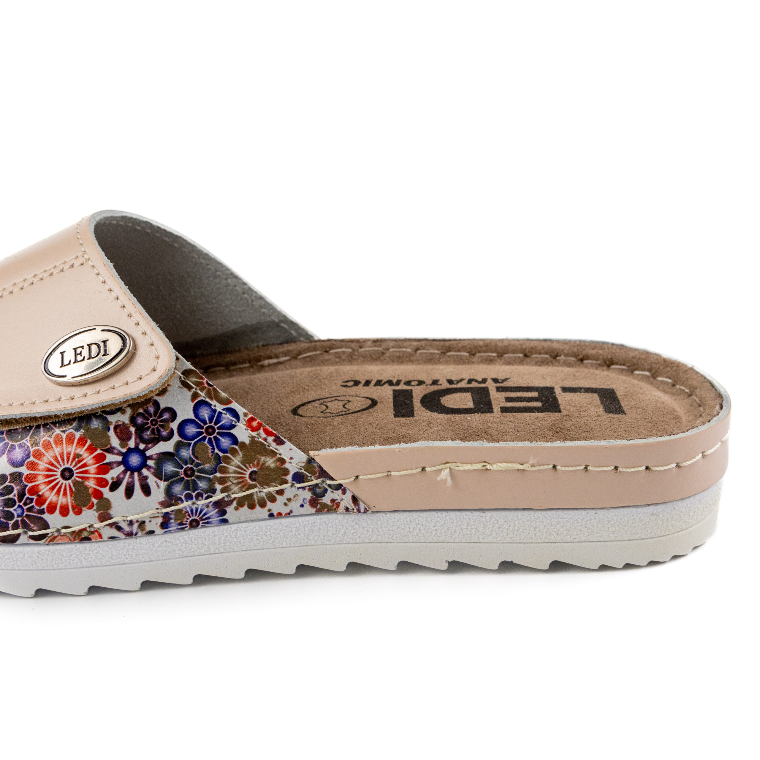 Дамски анатомични чехли, естествена кожа, на велуризиран табан,който не позволява приплъзване на крака вследствие на изпотяване, на олекотено полиуретаново ходилo с височина 2см. Моделът предлага възможност за промяна на обема в юзовата част чрез самозалепващото се велкро, намиращо се под брендирания аксесоар "LEDI".