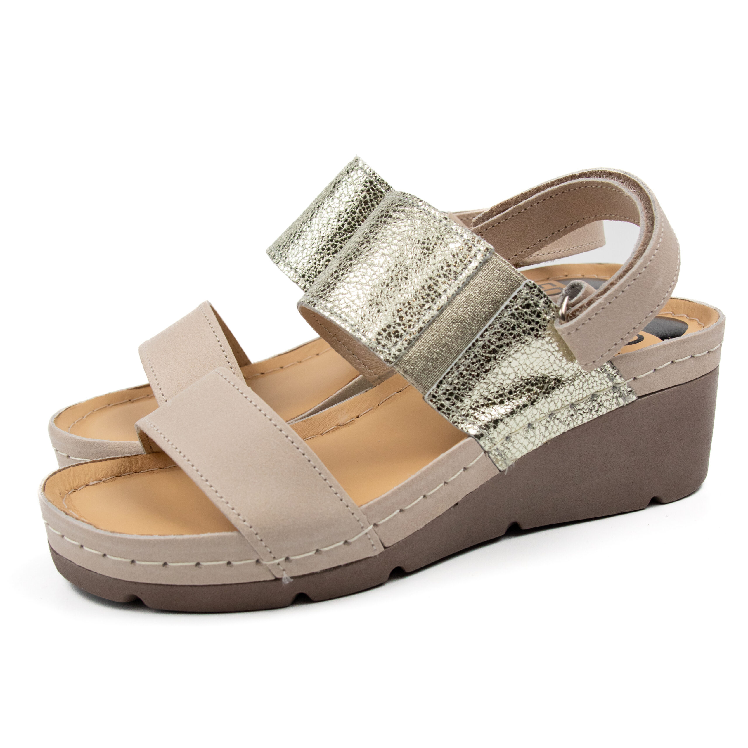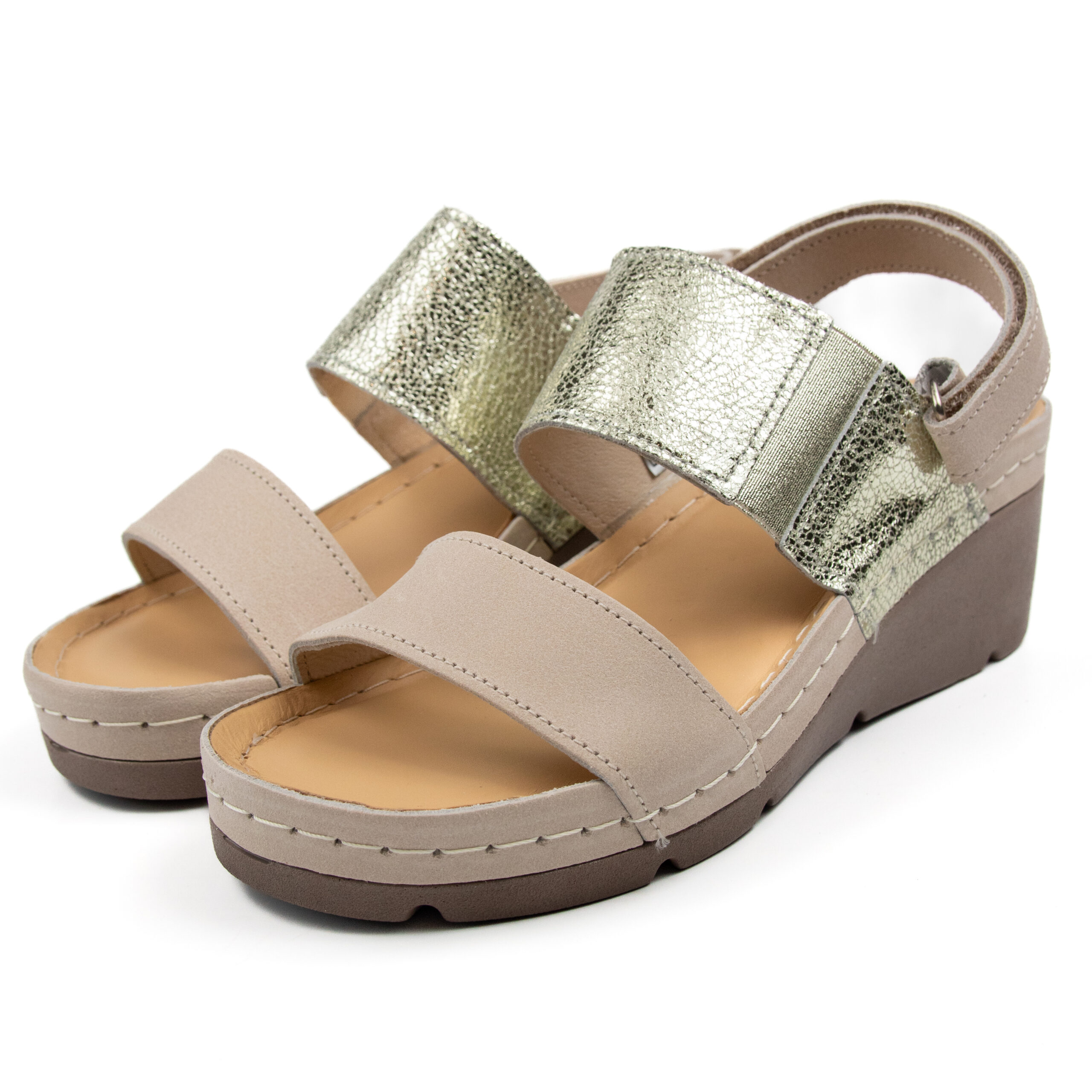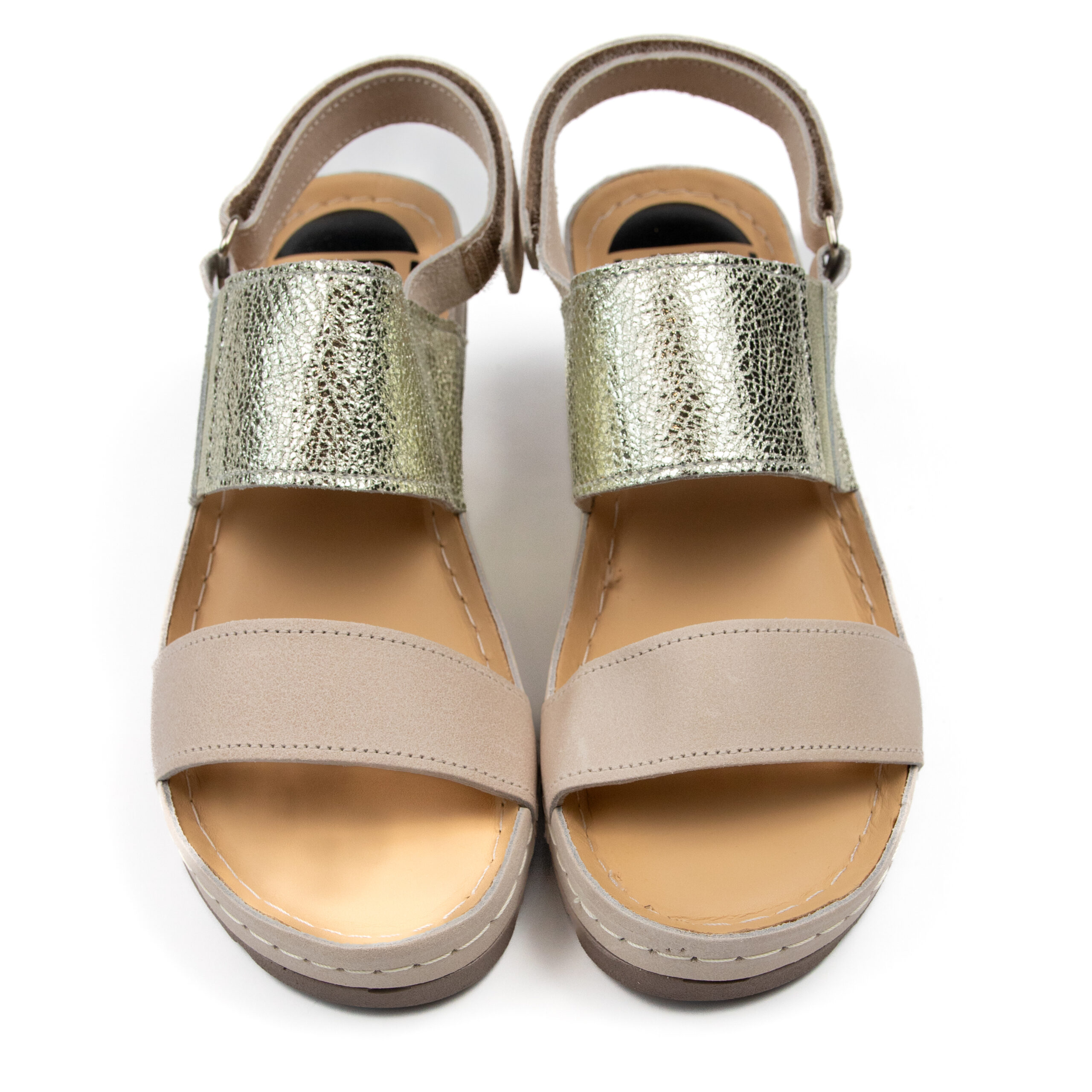 Дамски анатомичен сандал, естествена кожа,комбинация от бежово и златно, табанът е средна твърдост, на олекотено полиуретаново ходилo с височина 5см.