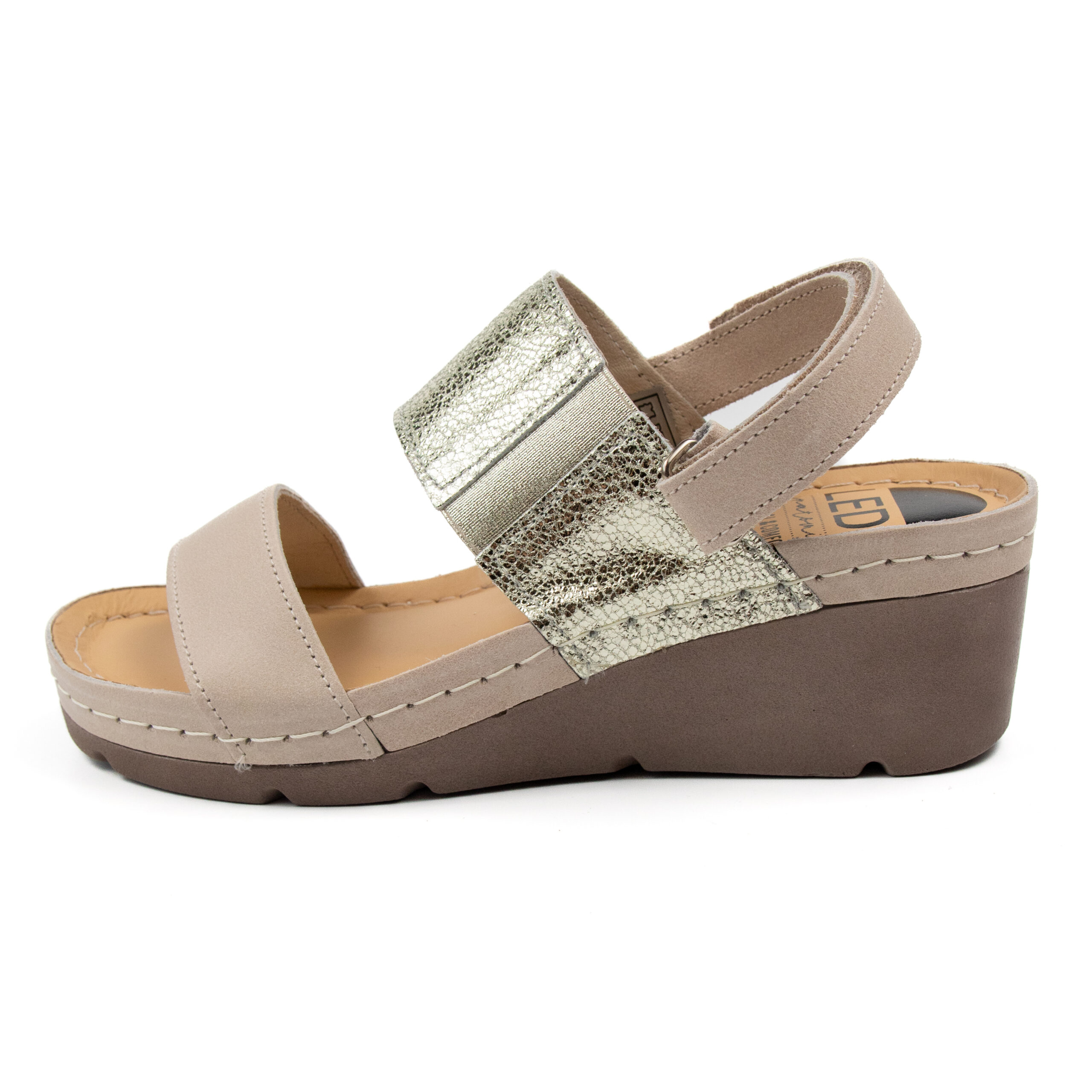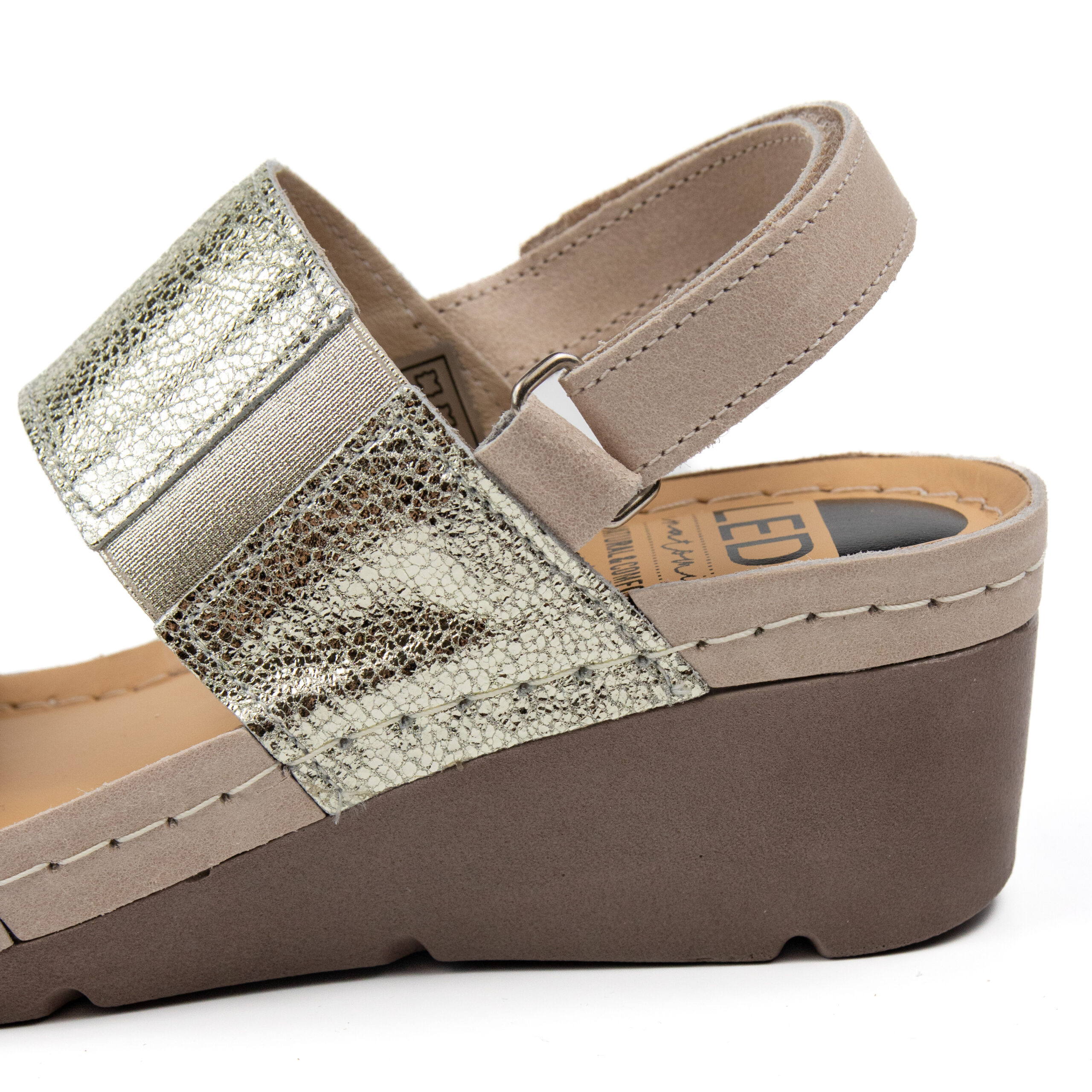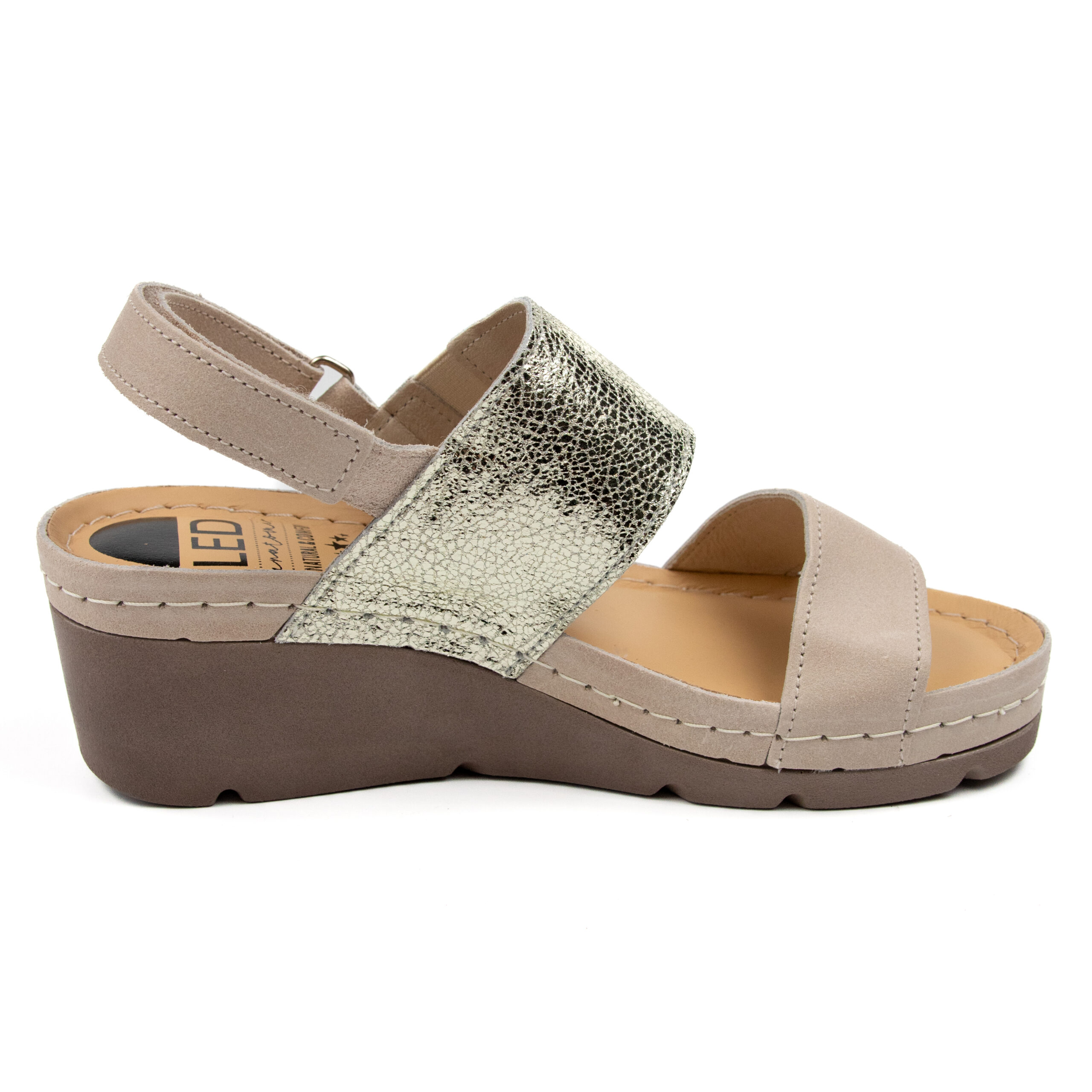 Дамски анатомичен сандал, естествена кожа,комбинация от бежово и златно, табанът е средна твърдост, на олекотено полиуретаново ходилo с височина 5см.