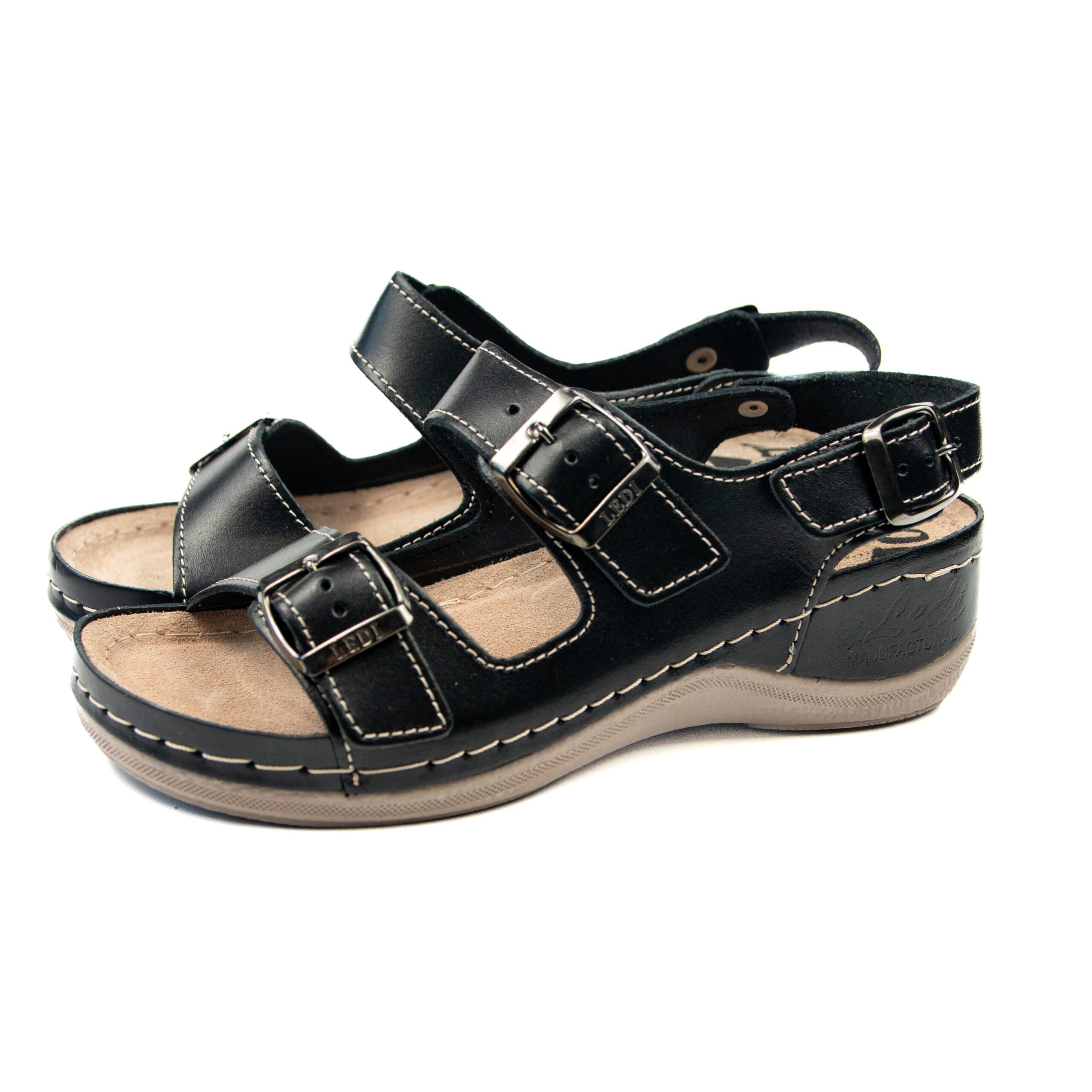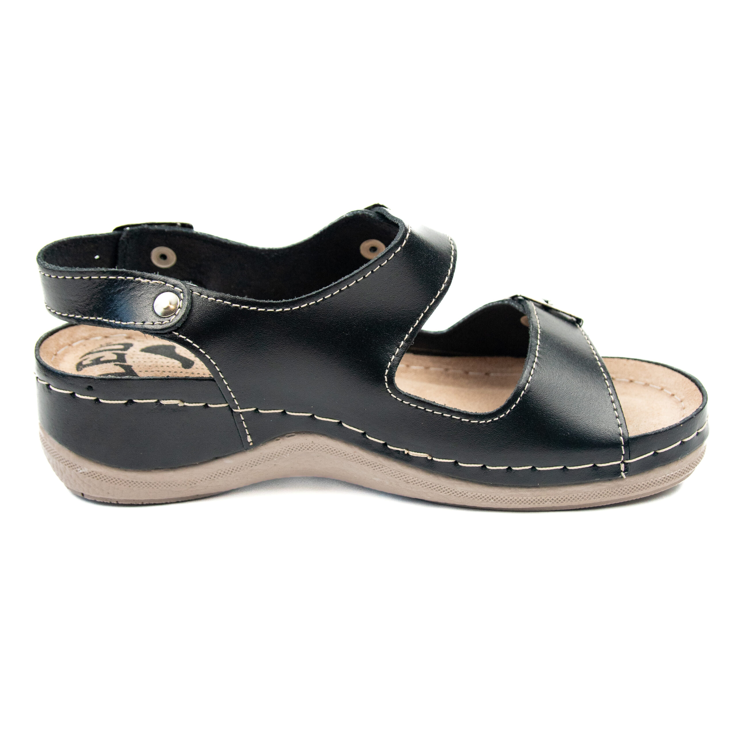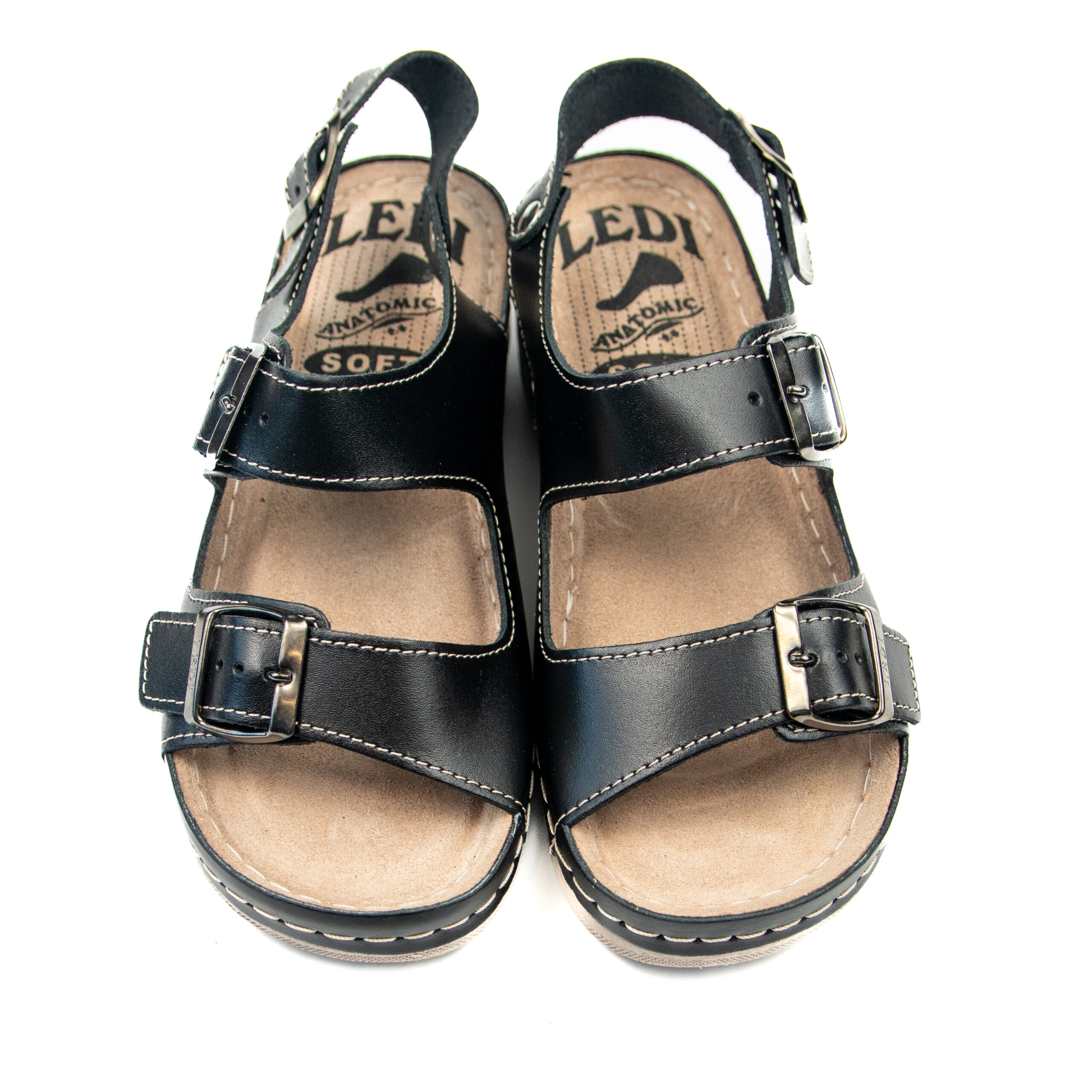 Дамски анатомичен сандал, естествена кожа, черен цвят, табанът е средна твърдост - SOFT, на олекотено полиуретаново ходилo с височина 5см.