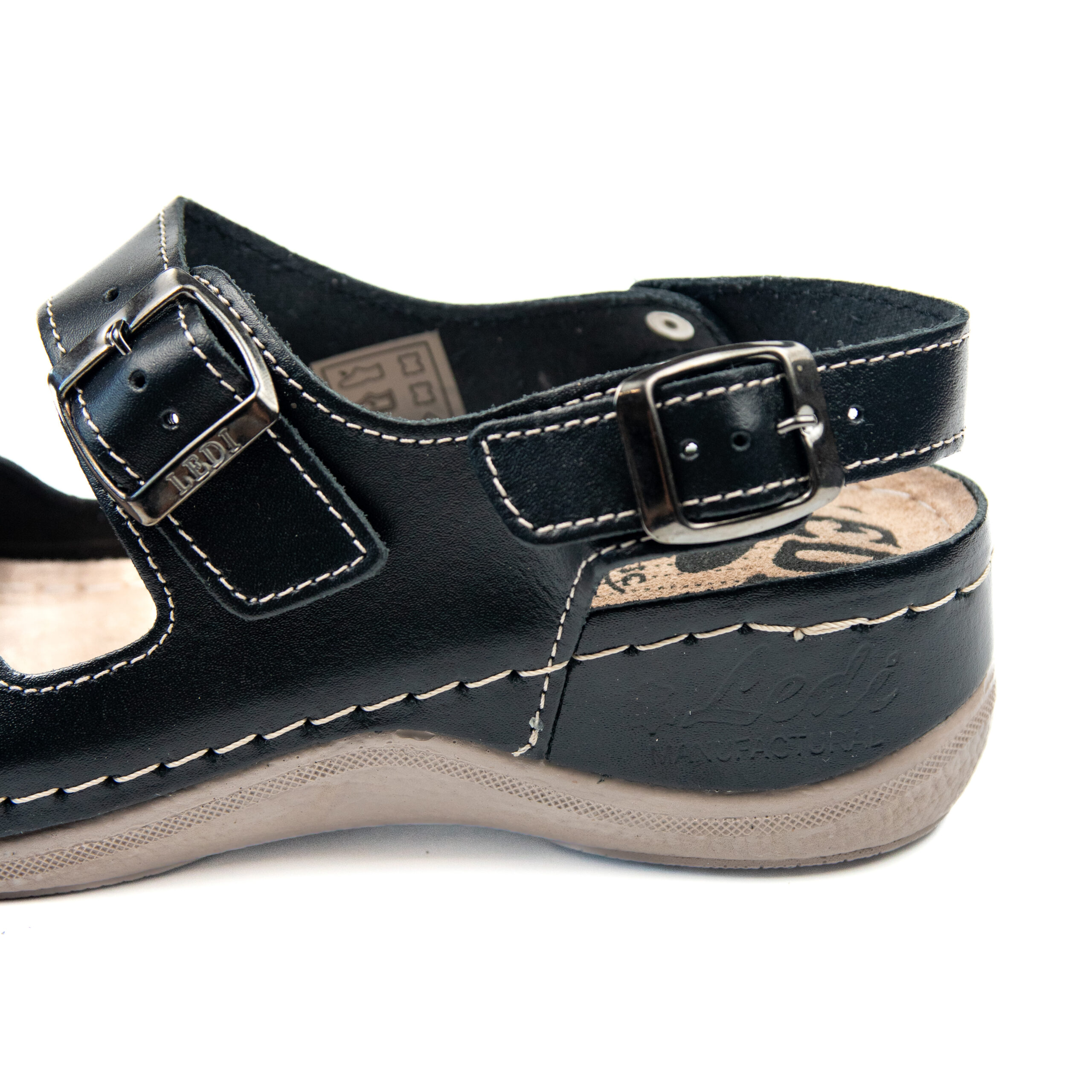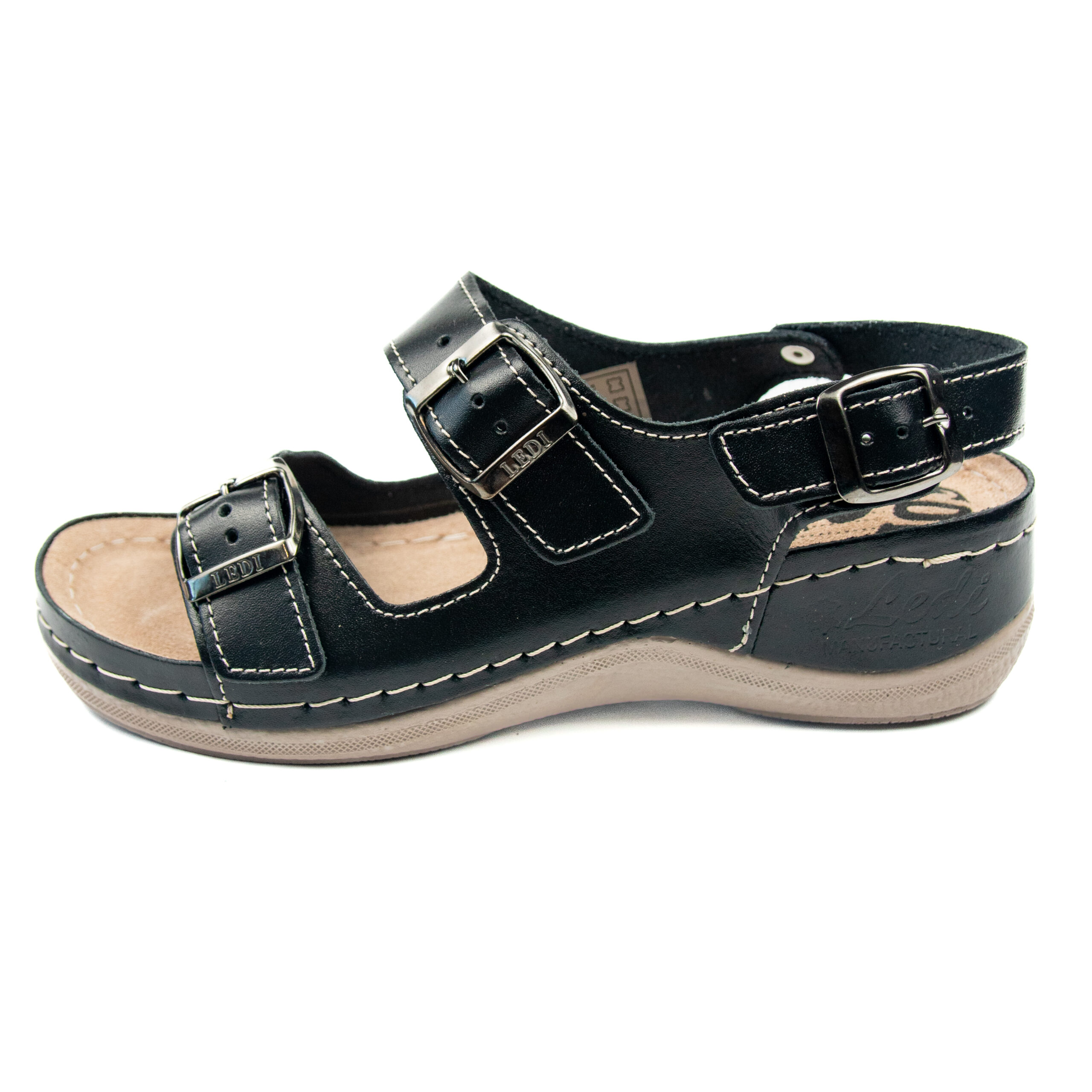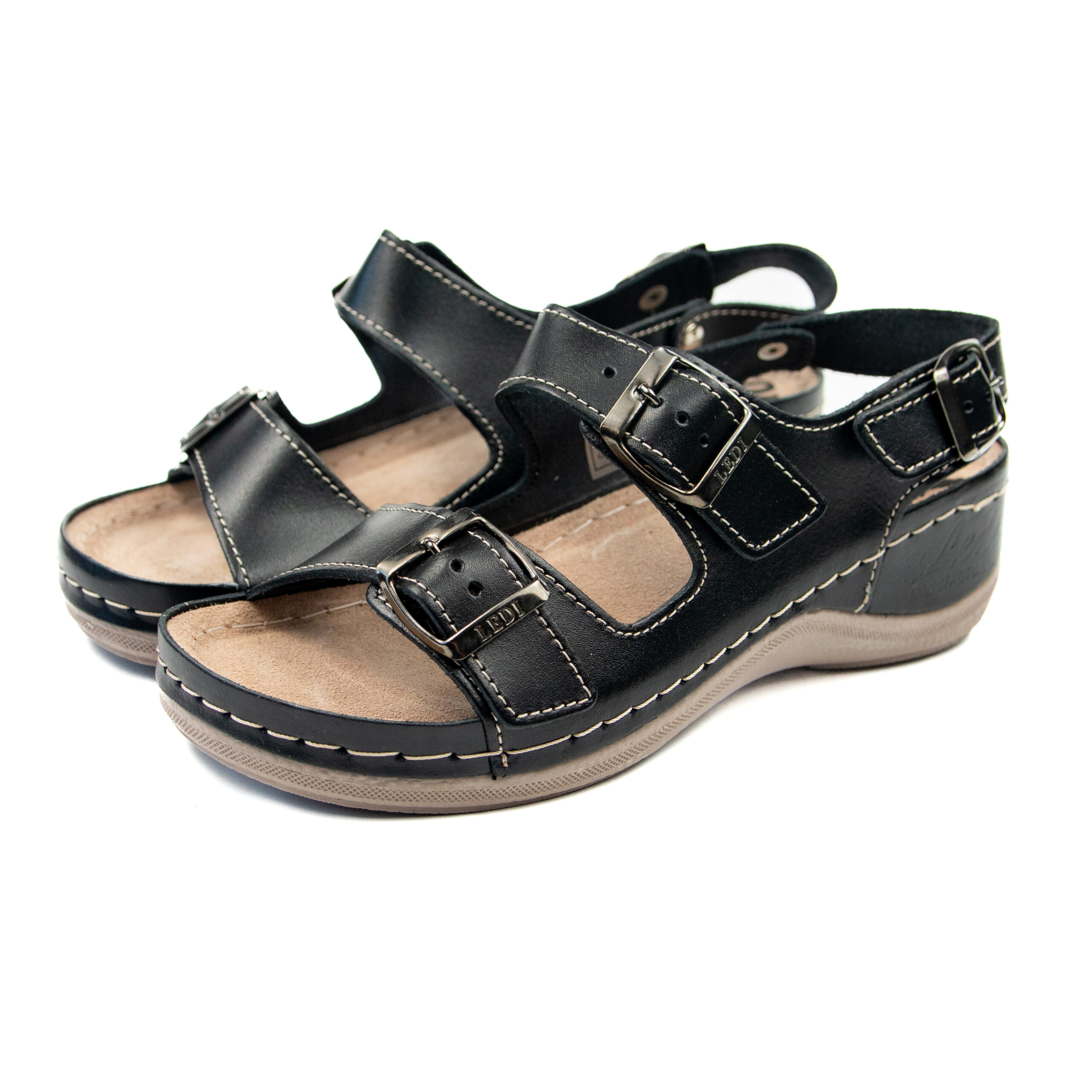Дамски анатомичен сандал, естествена кожа, черен цвят, табанът е средна твърдост - SOFT, на олекотено полиуретаново ходилo с височина 5см.