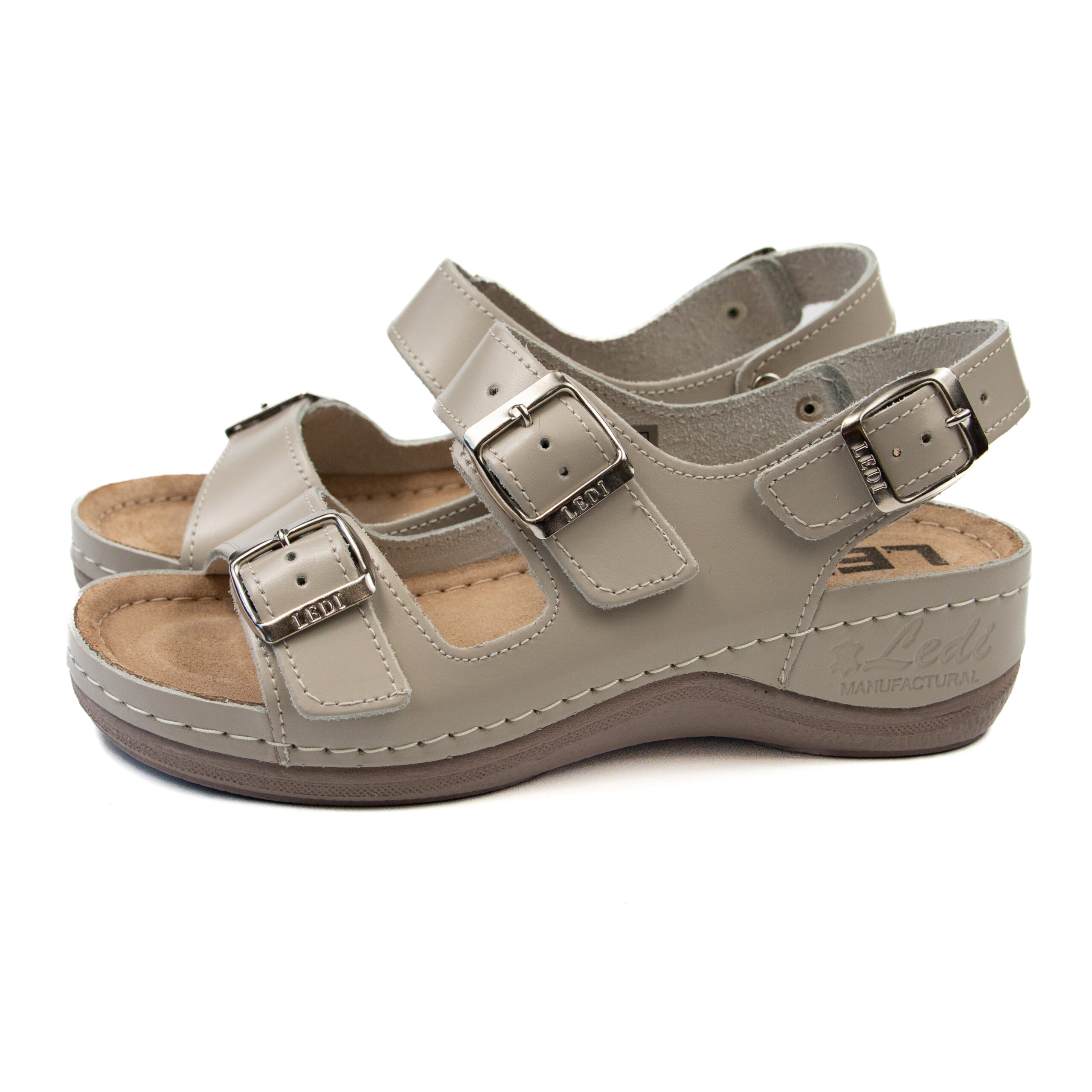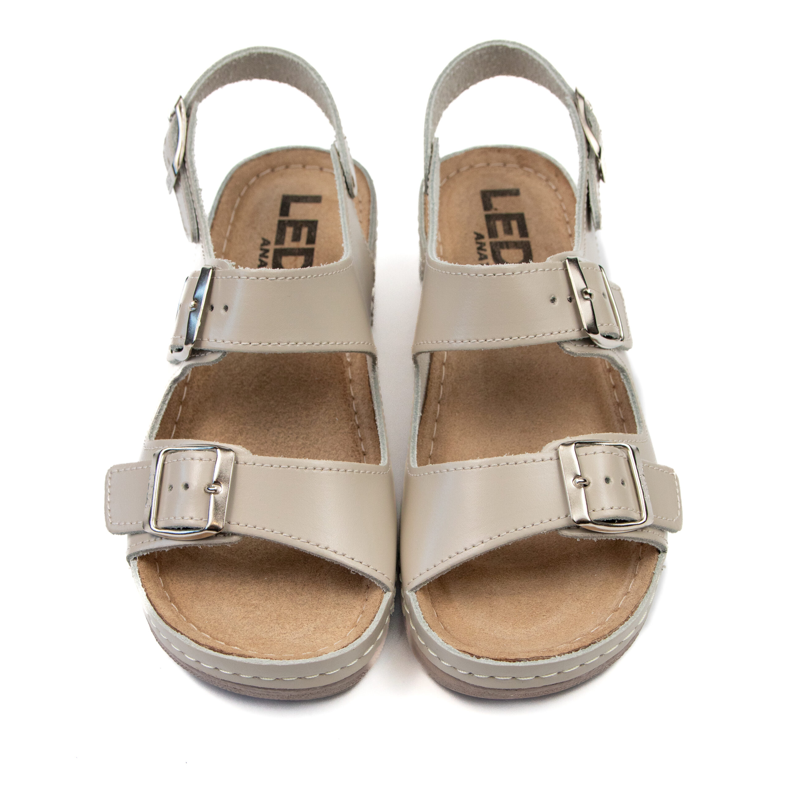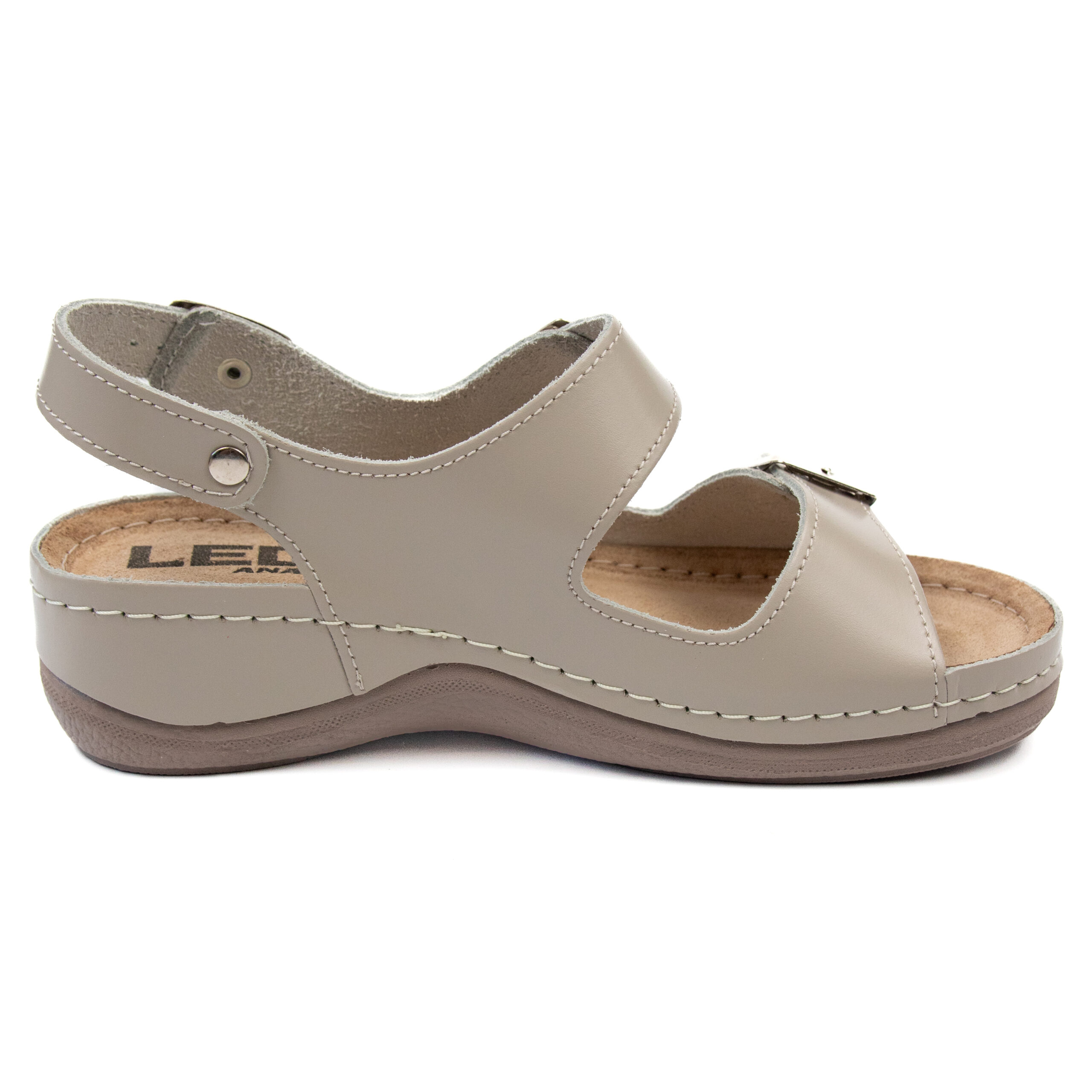 Дамски анатомичен сандал, естествена кожа, бежов цвят, табанът е средна твърдост - SOFT, на олекотено полиуретаново ходилo с височина 5см.