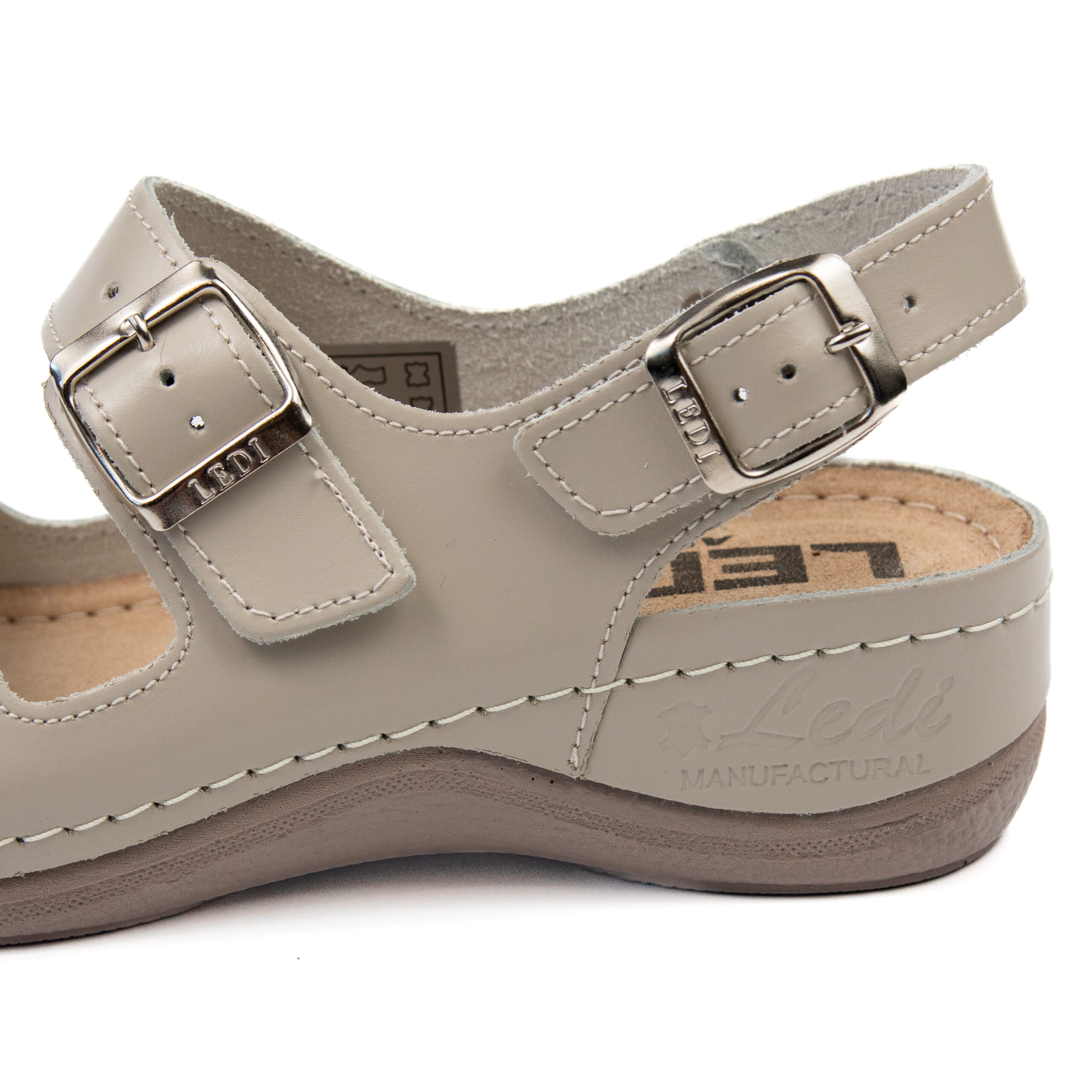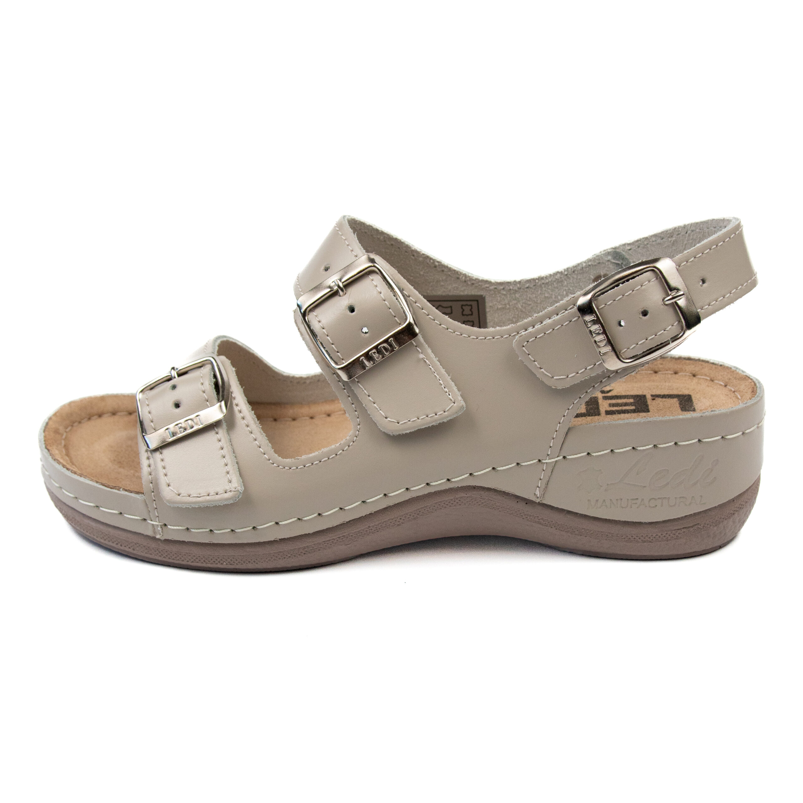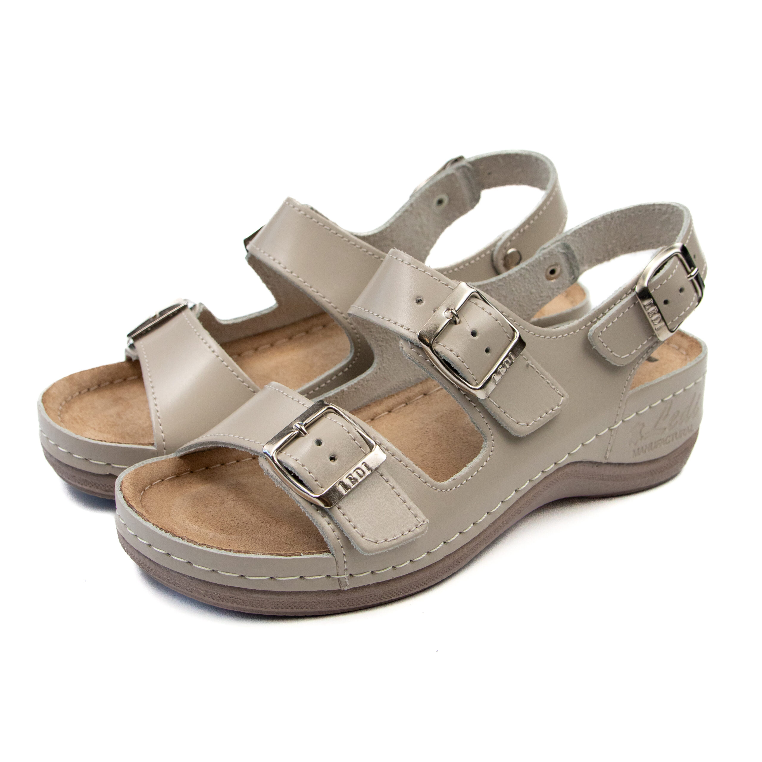 Дамски анатомичен сандал, естествена кожа, бежов цвят, табанът е средна твърдост - SOFT, на олекотено полиуретаново ходилo с височина 5см.