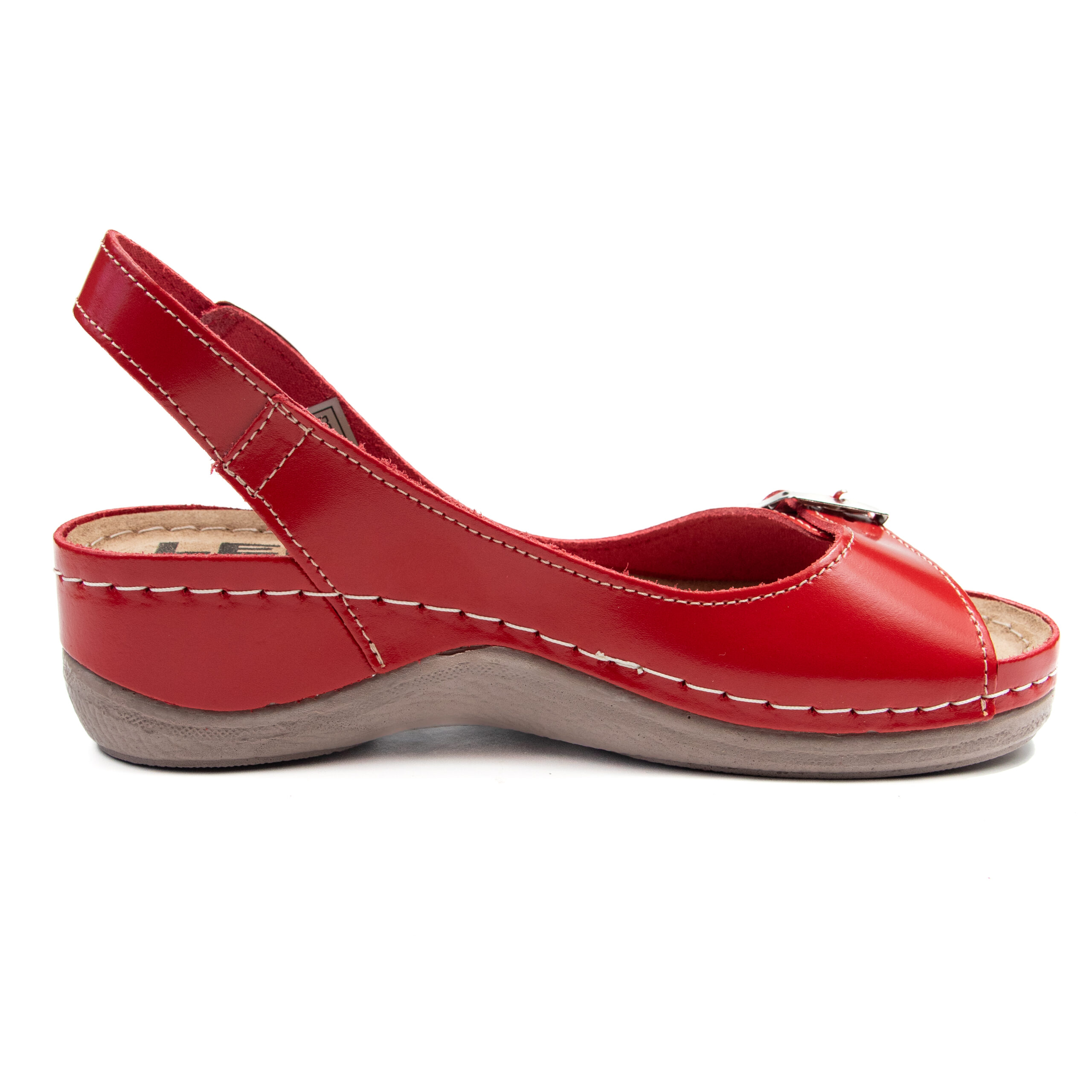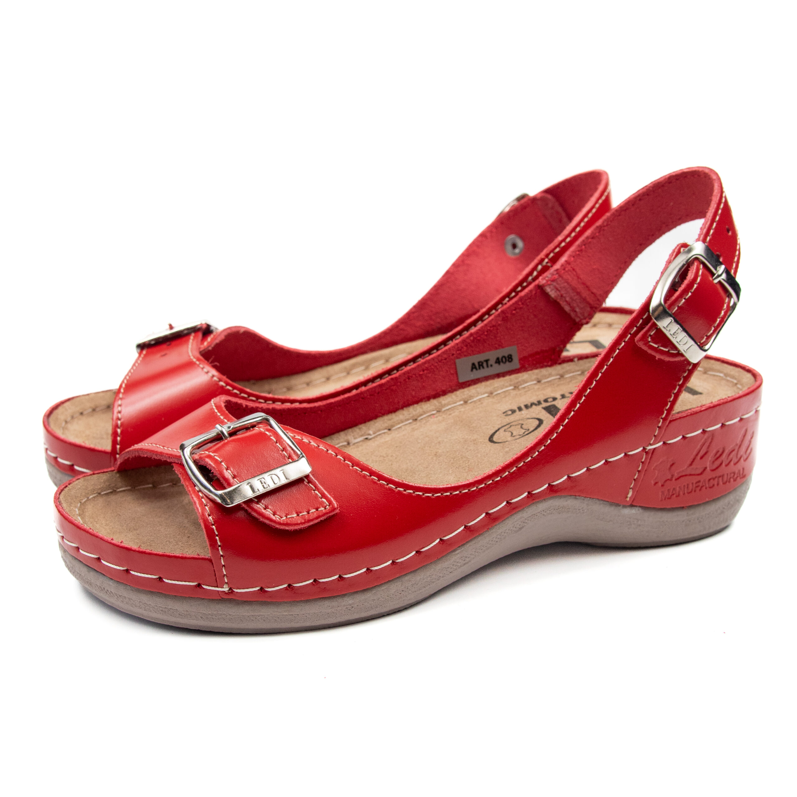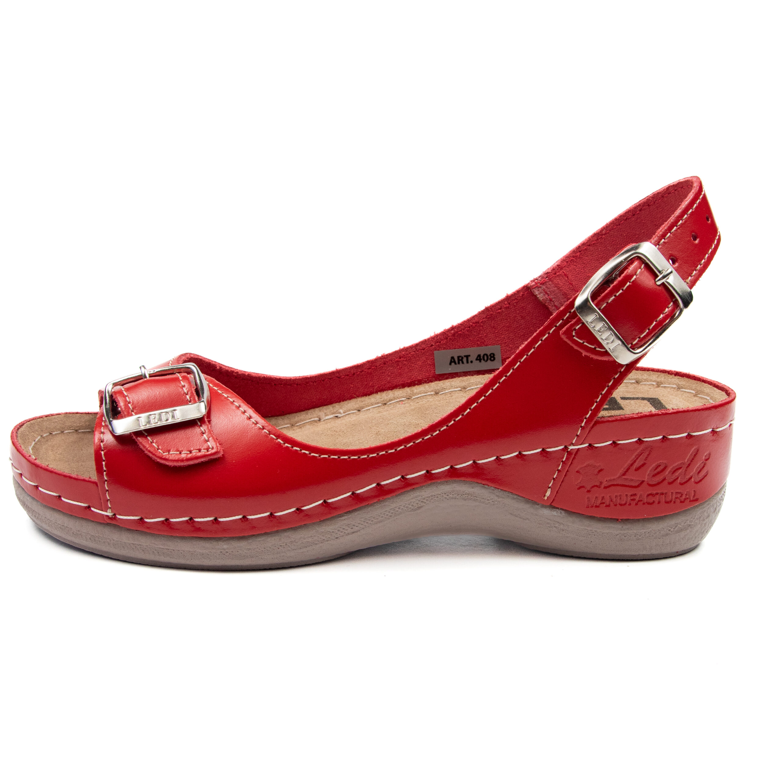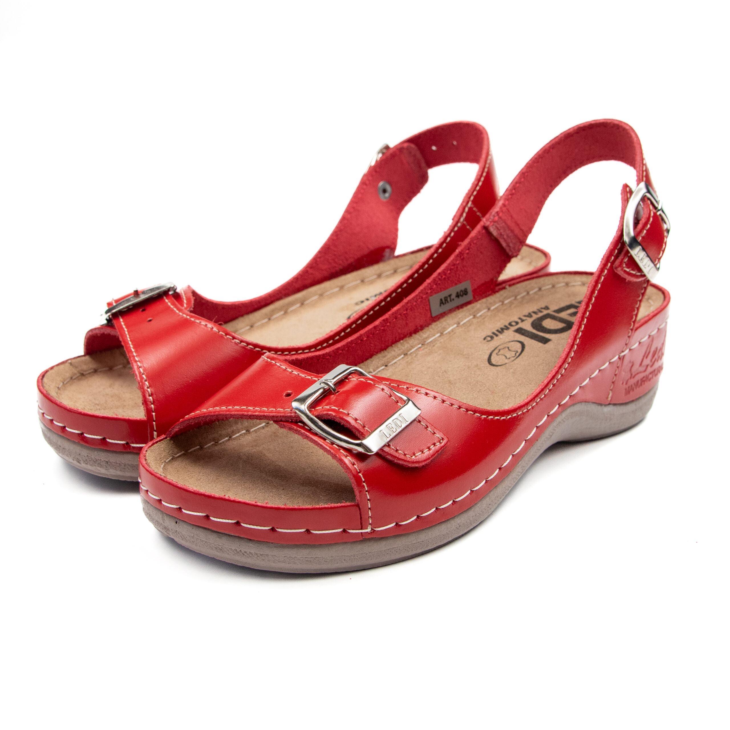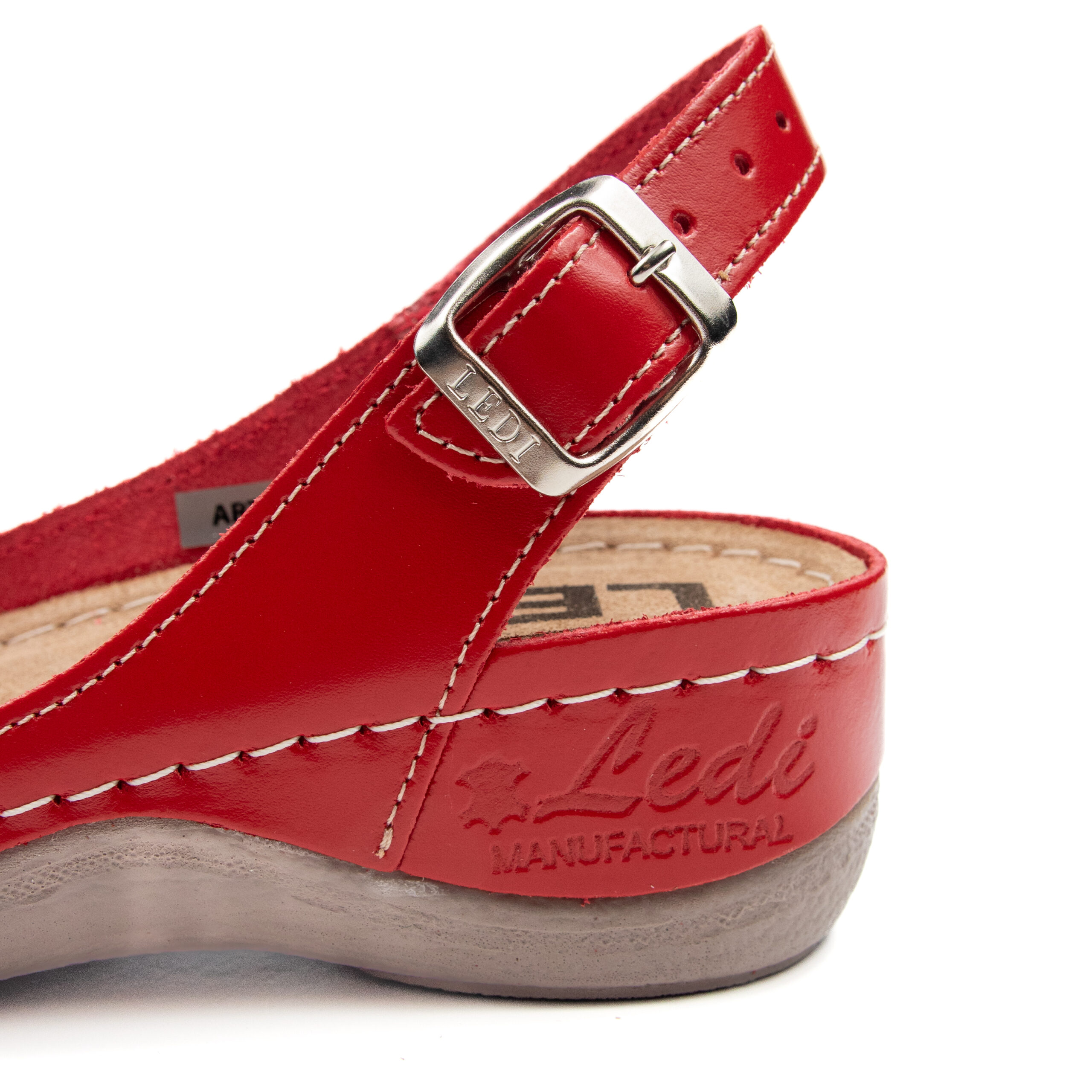 Дамски анатомичен сандал, естествена кожа, червен цвят, табанът е средна твърдост - SOFT, на олекотено полиуретаново ходилo с височина 5см.