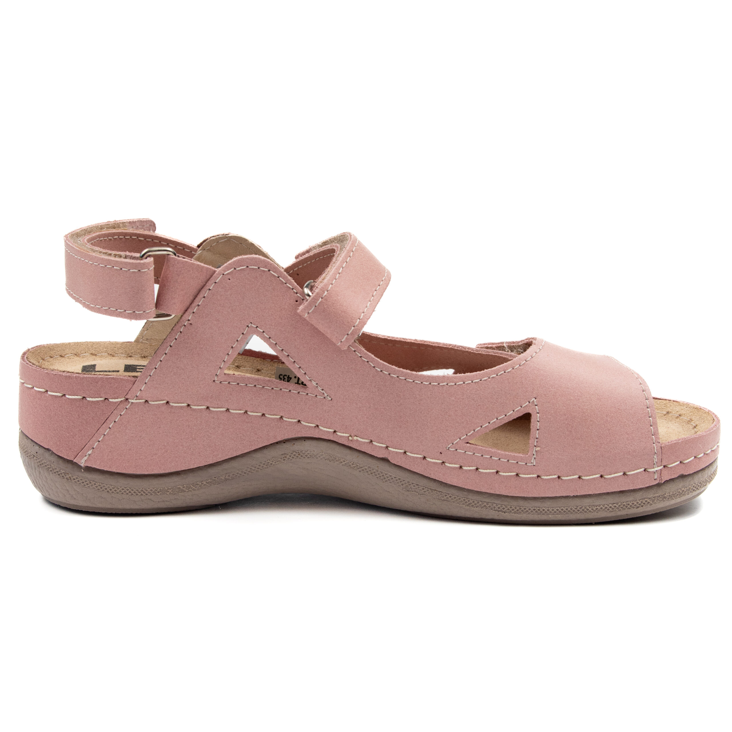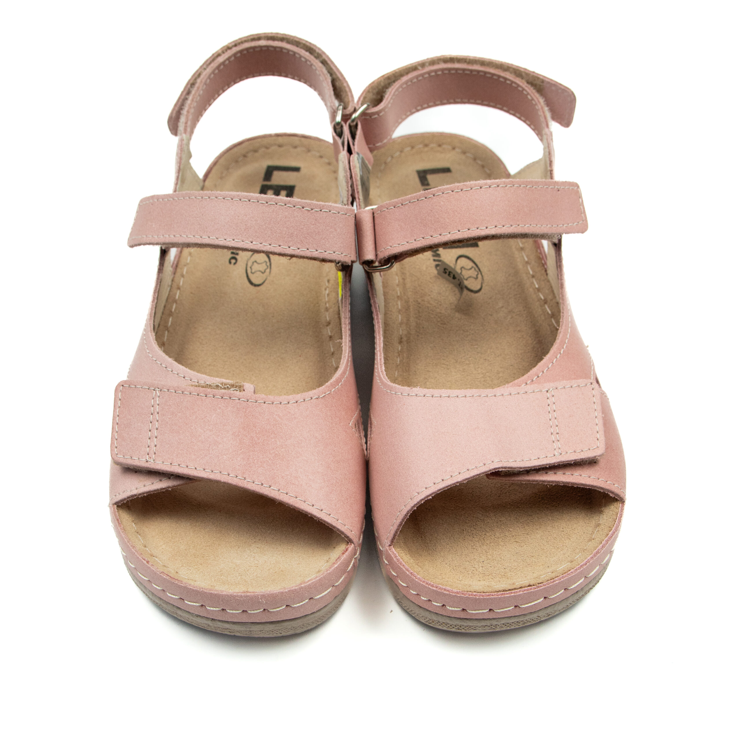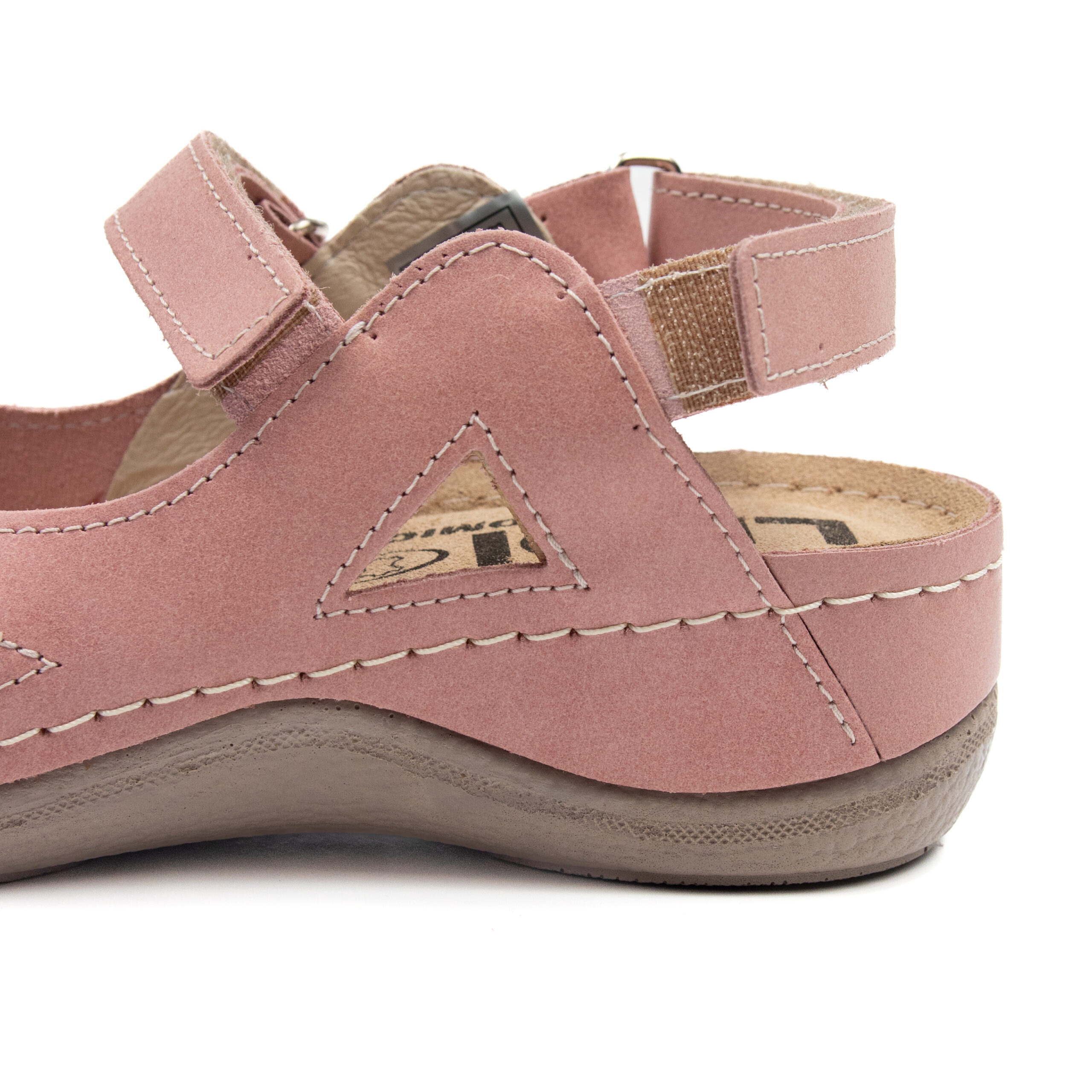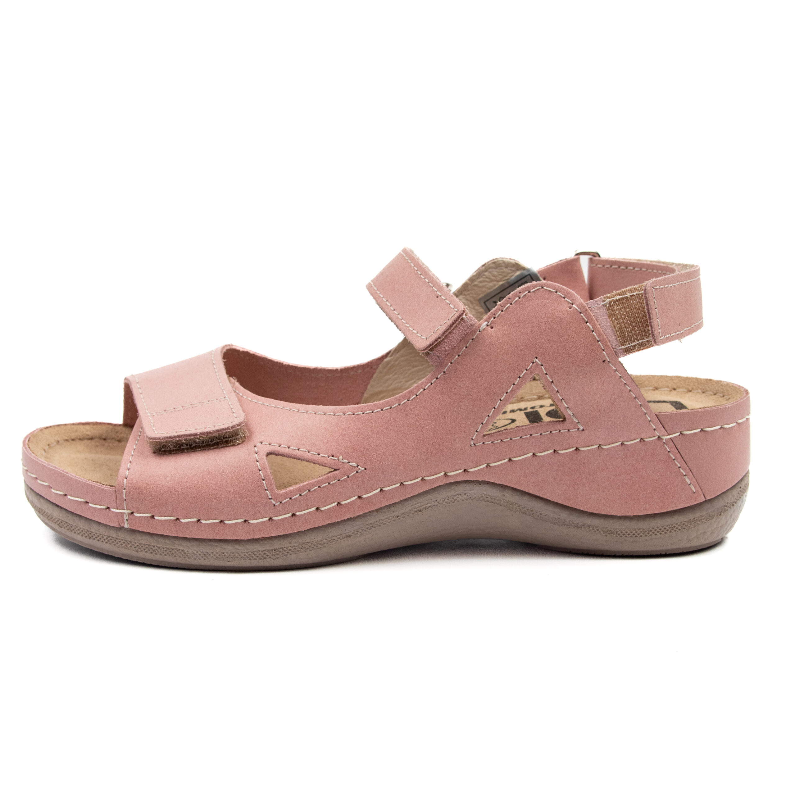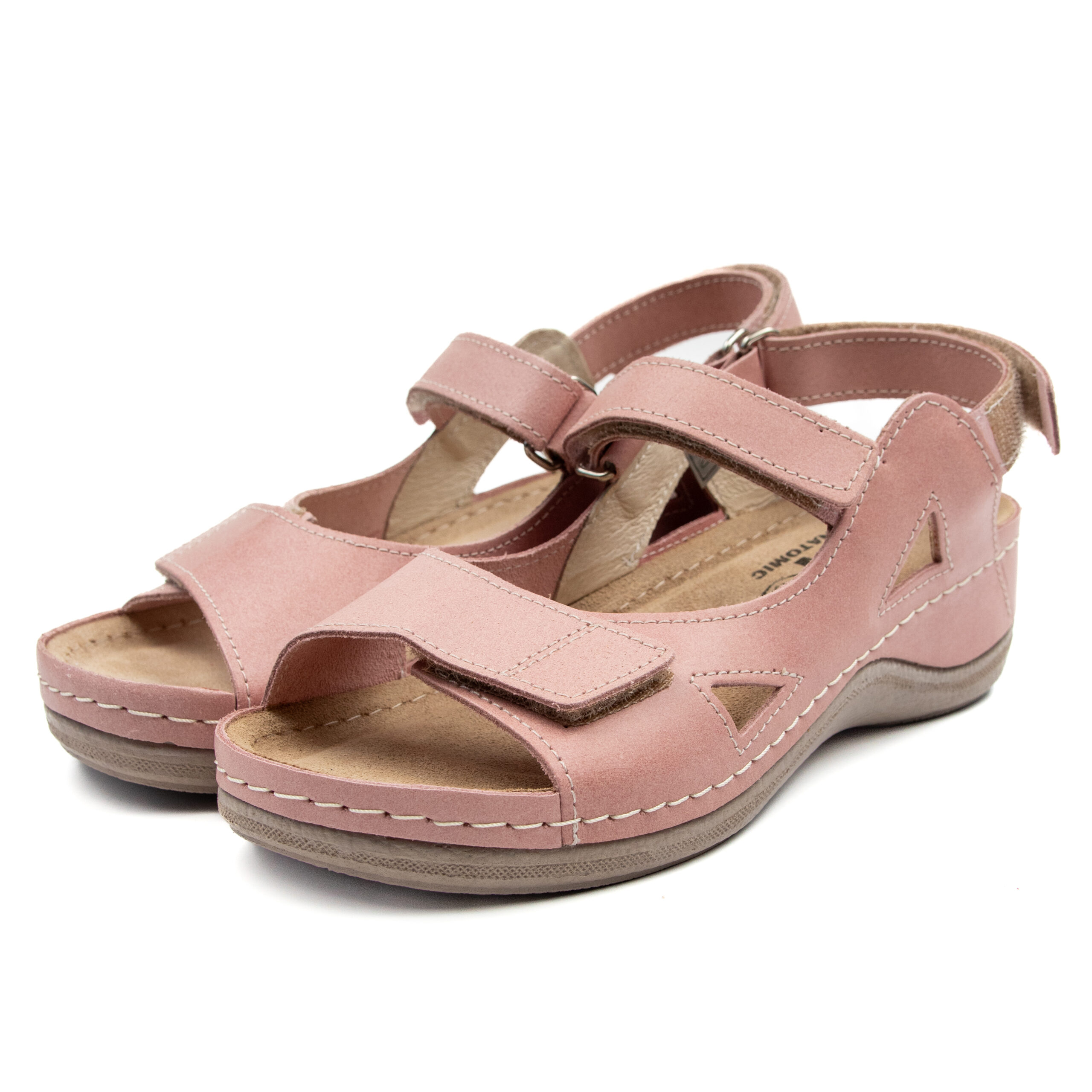 Дамски анатомичен сандал с три регулиращи се каишки, естествена кожа, цвят пудра, табанът е средна твърдост - SOFT, на олекотено полиуретаново ходилo с височина 5см.