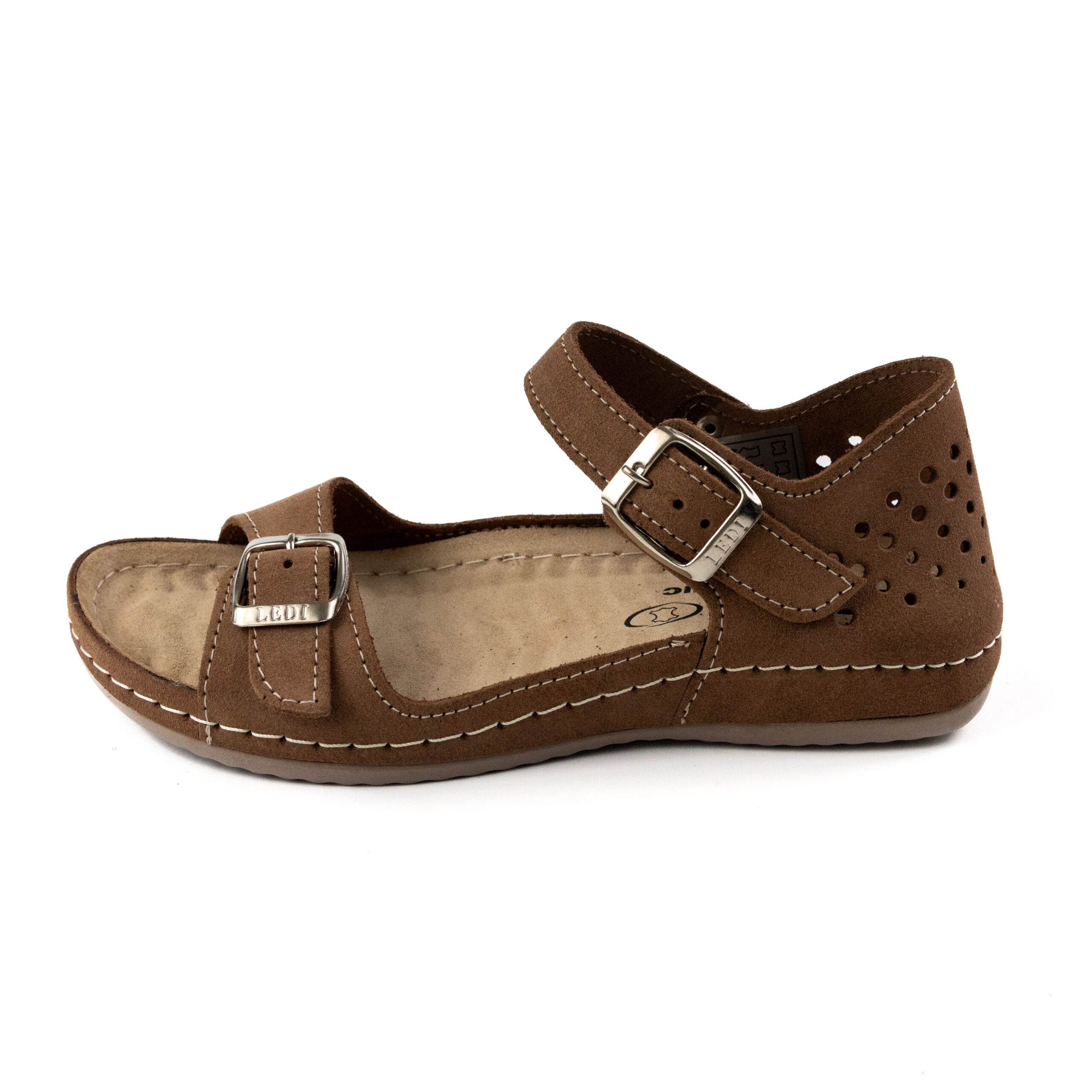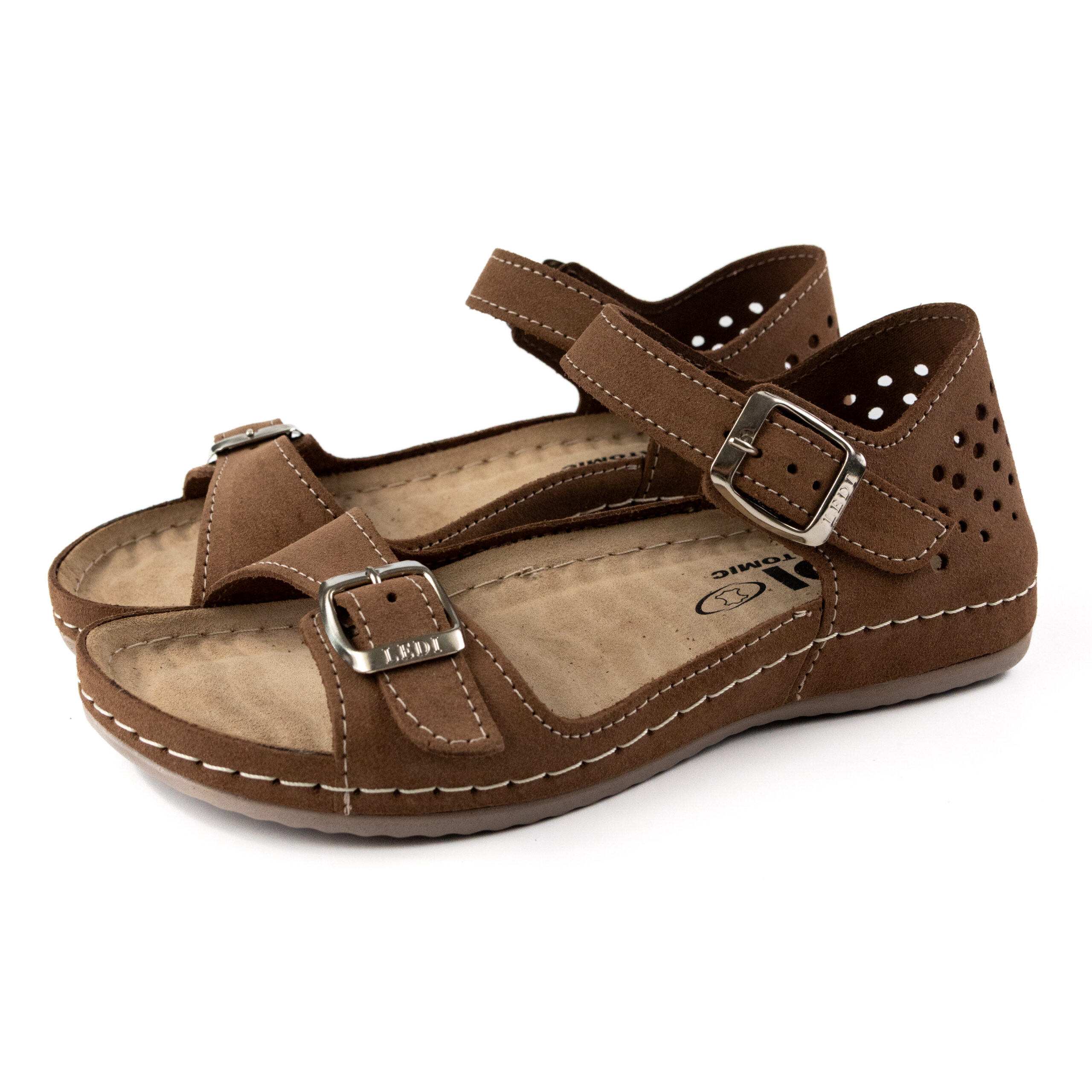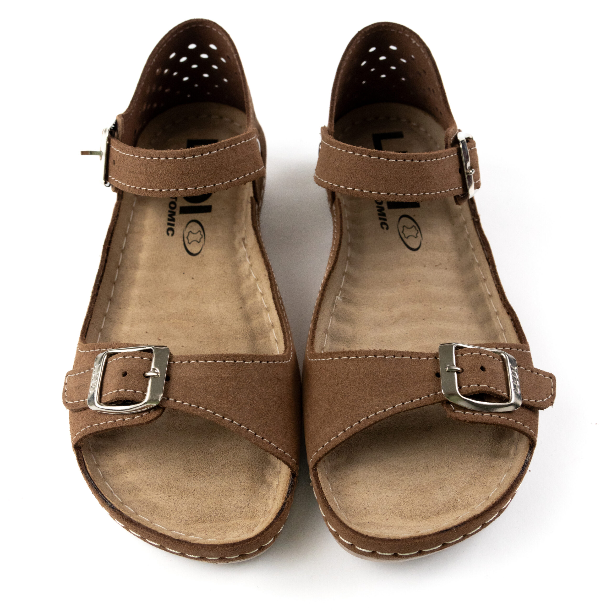 Дамски анатомични сандали, естествен велур, светло кафяв цвят, на велуризиран табан,който не позволява приплъзване на крака вследствие на изпотяване, на олекотено полиуретаново ходилo с височина 2см.