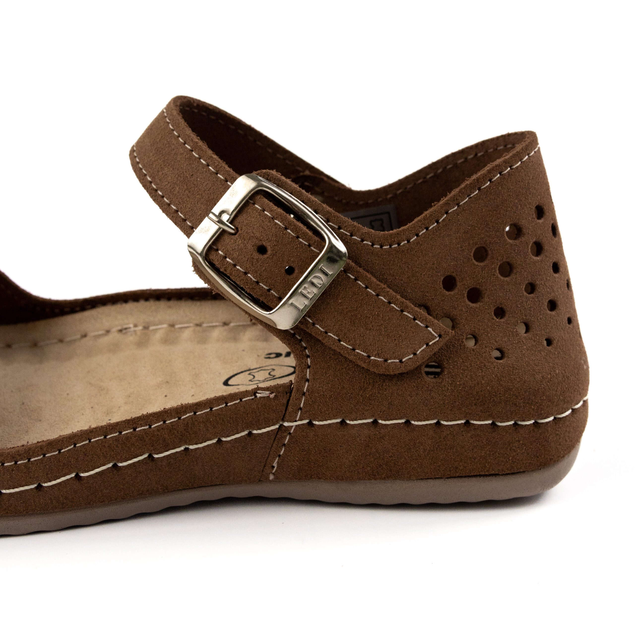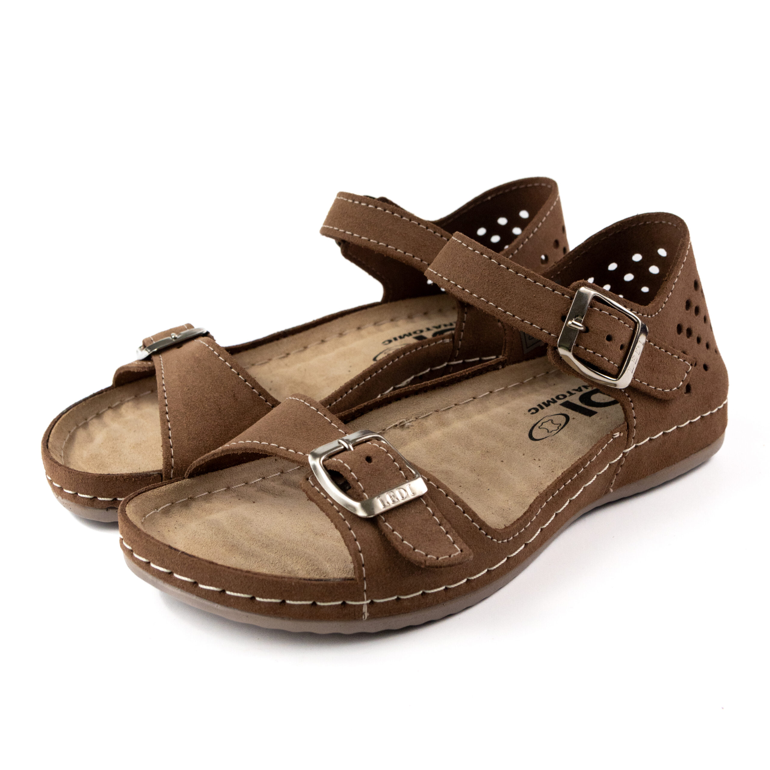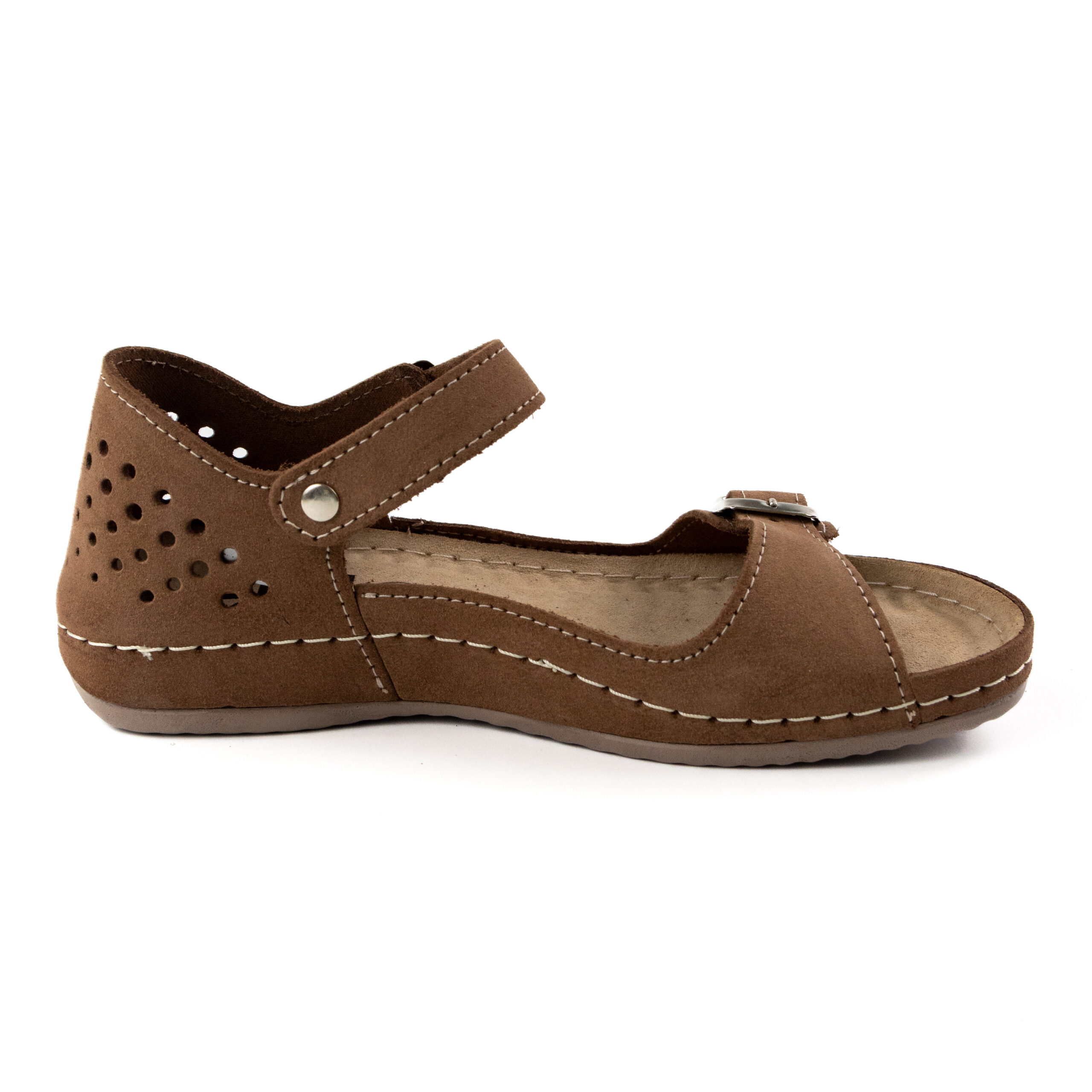 Дамски анатомични сандали, естествен велур, светло кафяв цвят, на велуризиран табан,който не позволява приплъзване на крака вследствие на изпотяване, на олекотено полиуретаново ходилo с височина 2см.