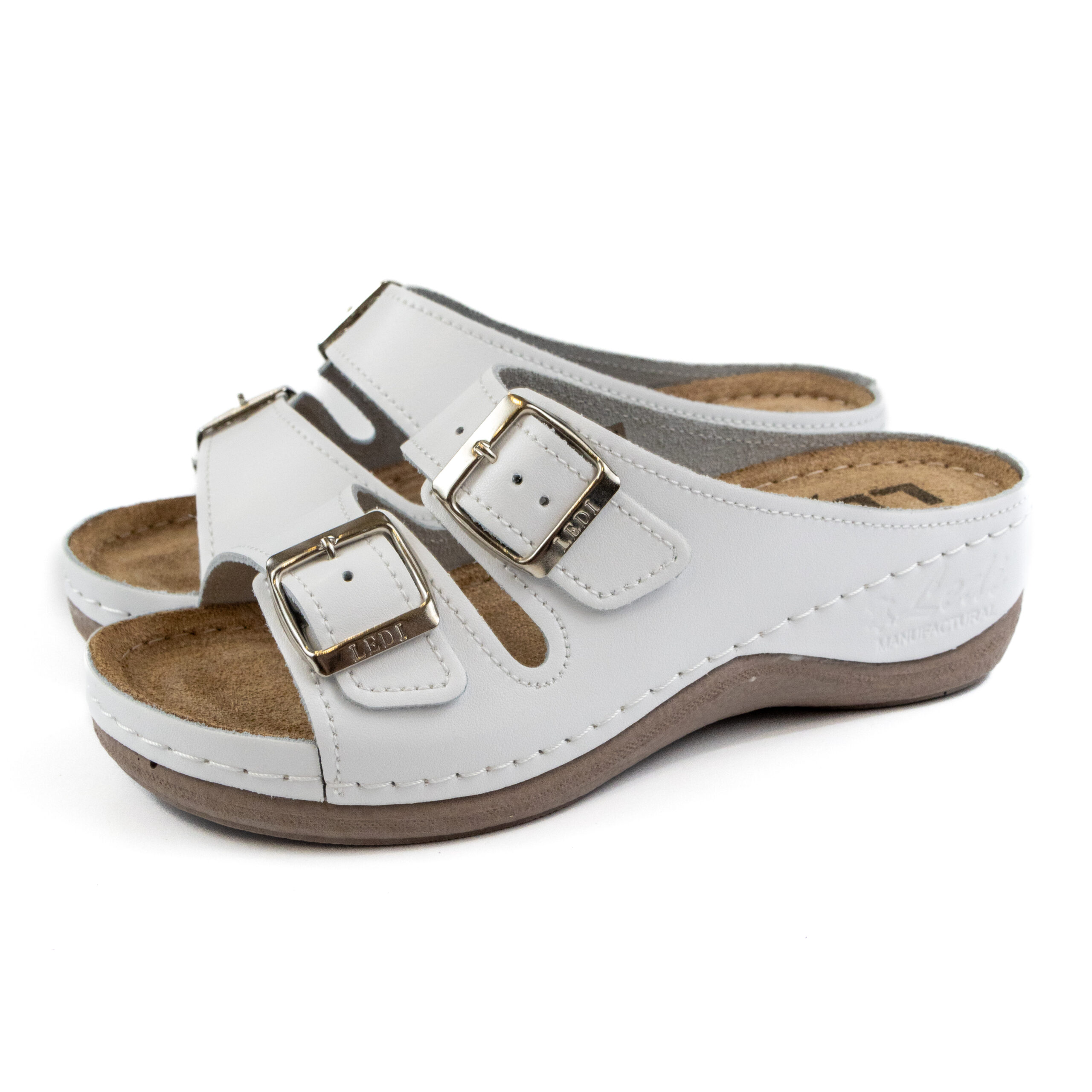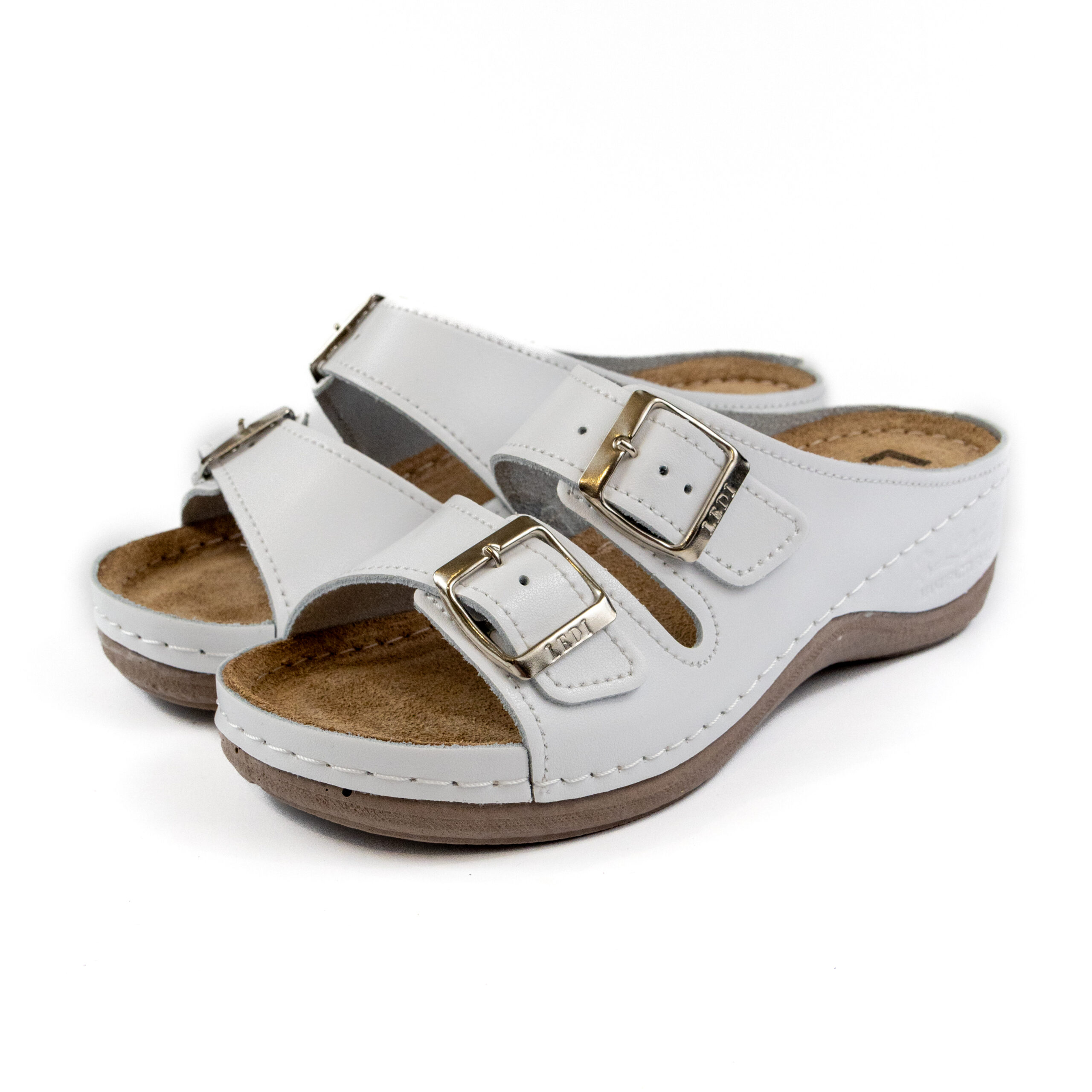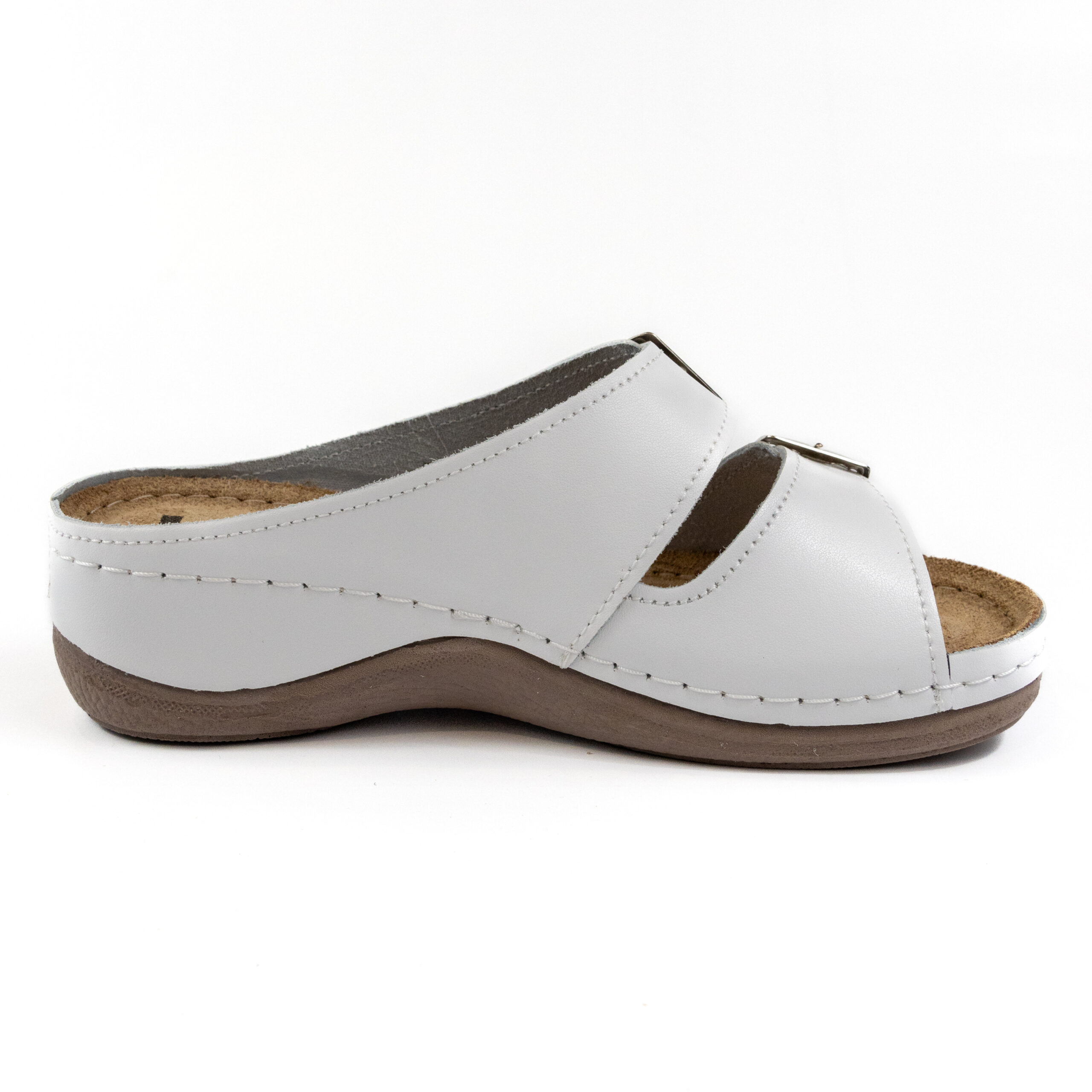 Дамско анатомични чехли, перфорирана естествена кожа, бял цвят, табанът е средна твърдост - SOFT, на олекотено полиуретаново ходилo с височина 5см.