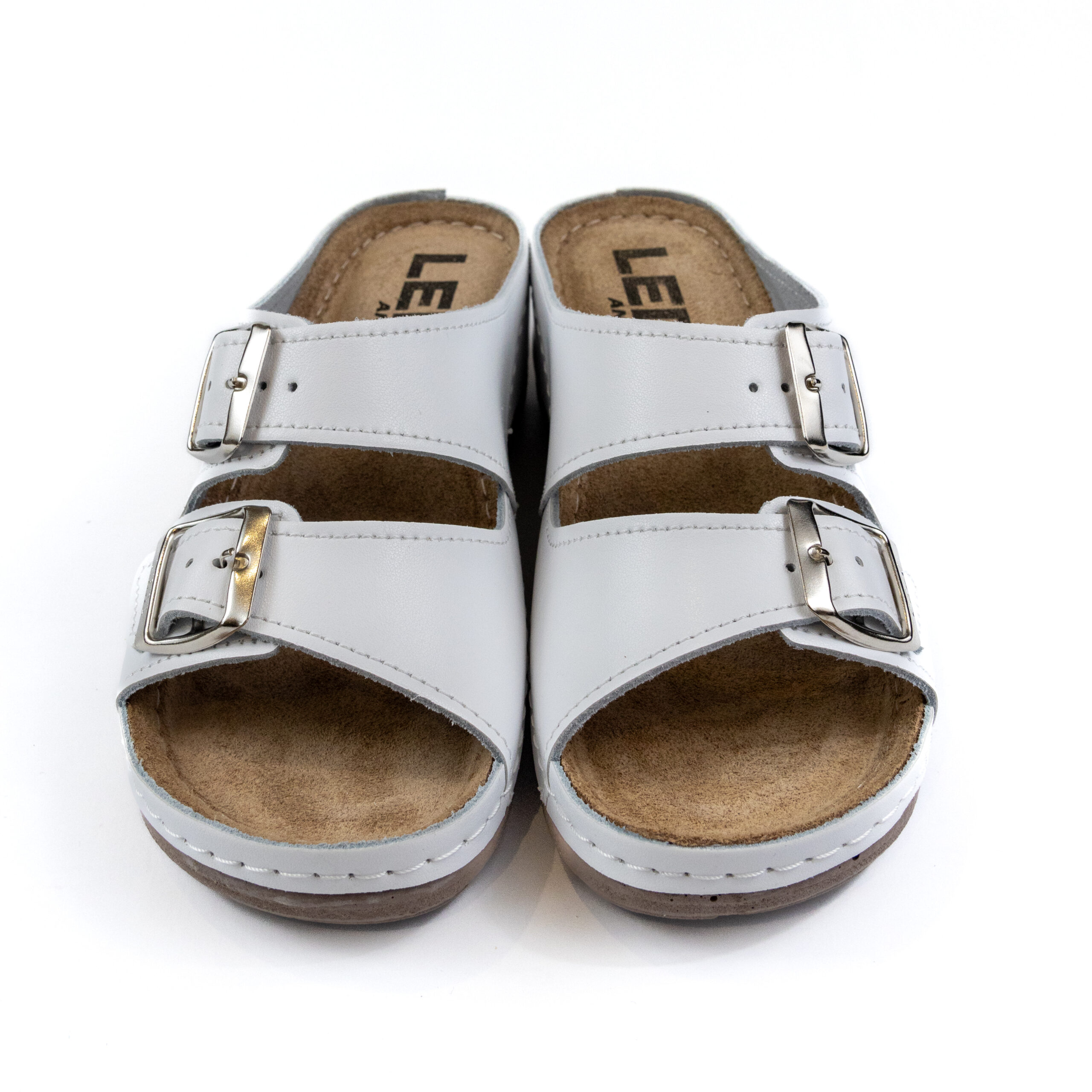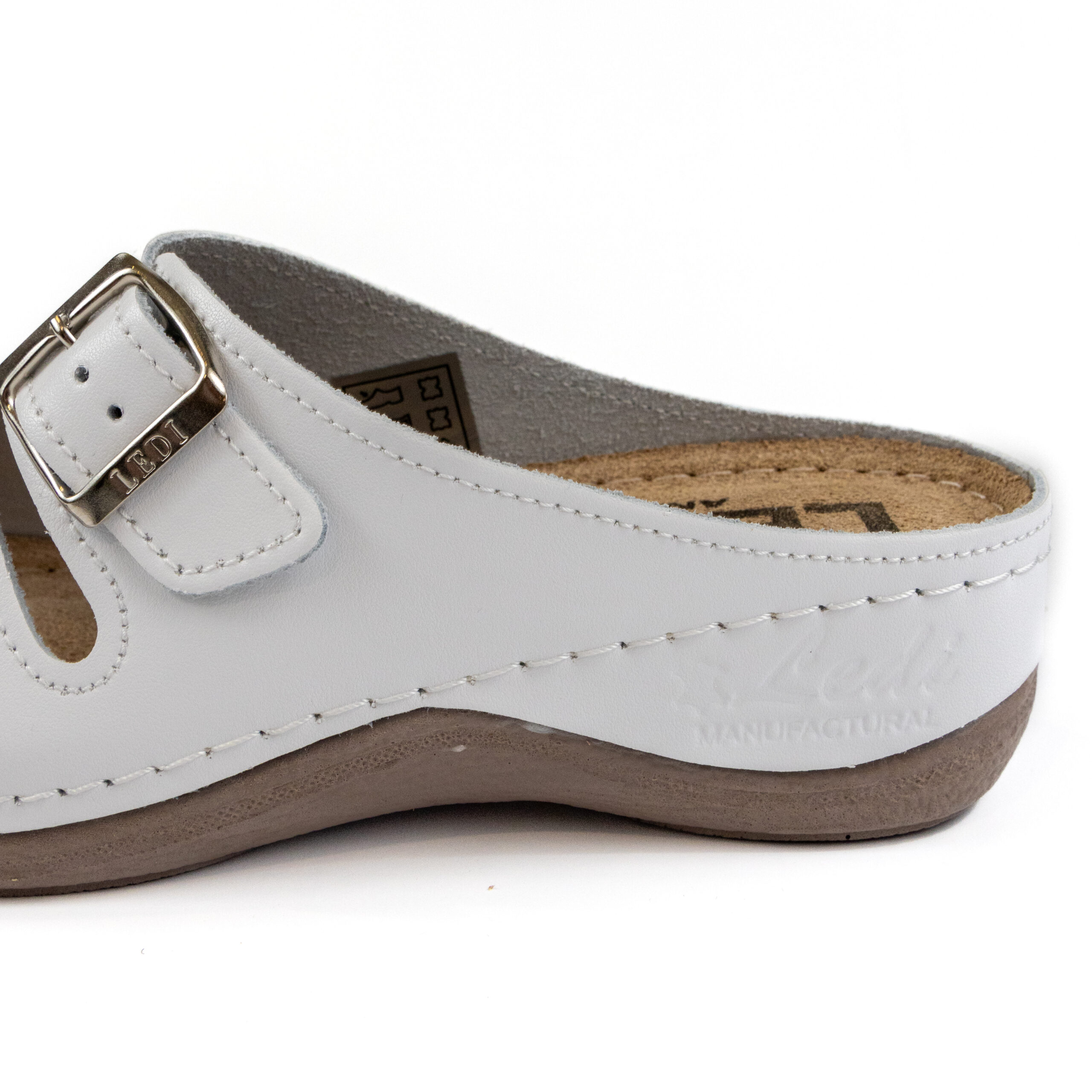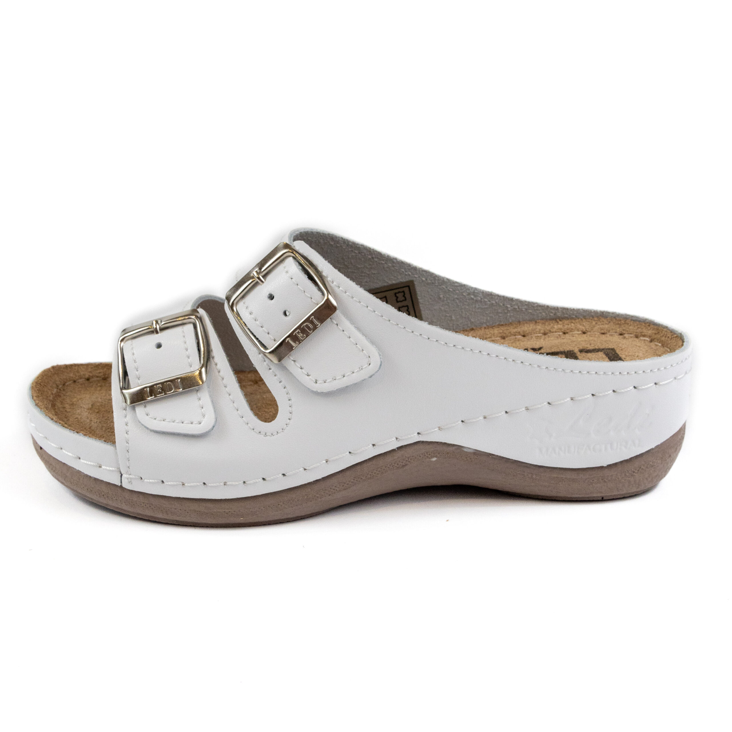 Дамско анатомични чехли, перфорирана естествена кожа, бял цвят, табанът е средна твърдост - SOFT, на олекотено полиуретаново ходилo с височина 5см.