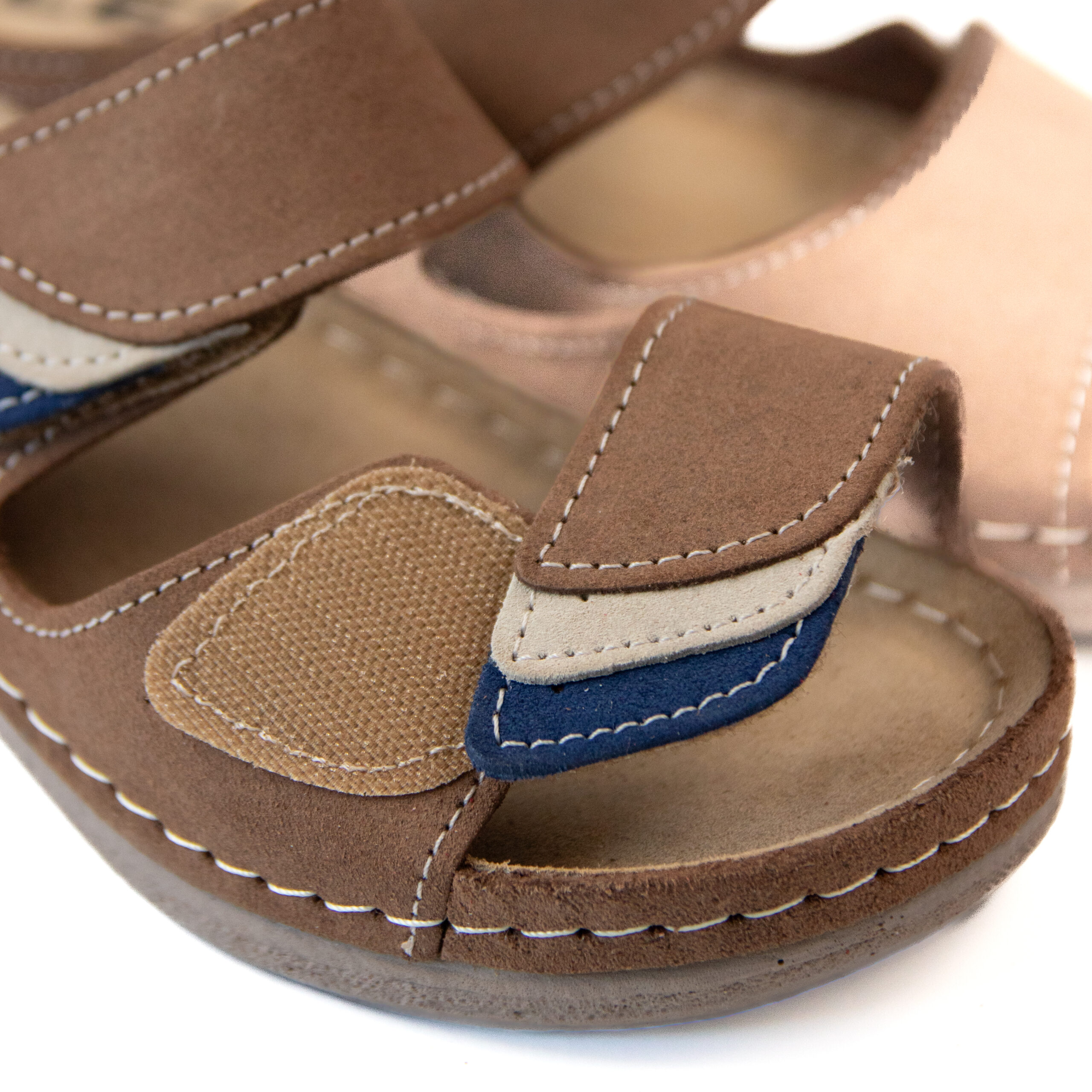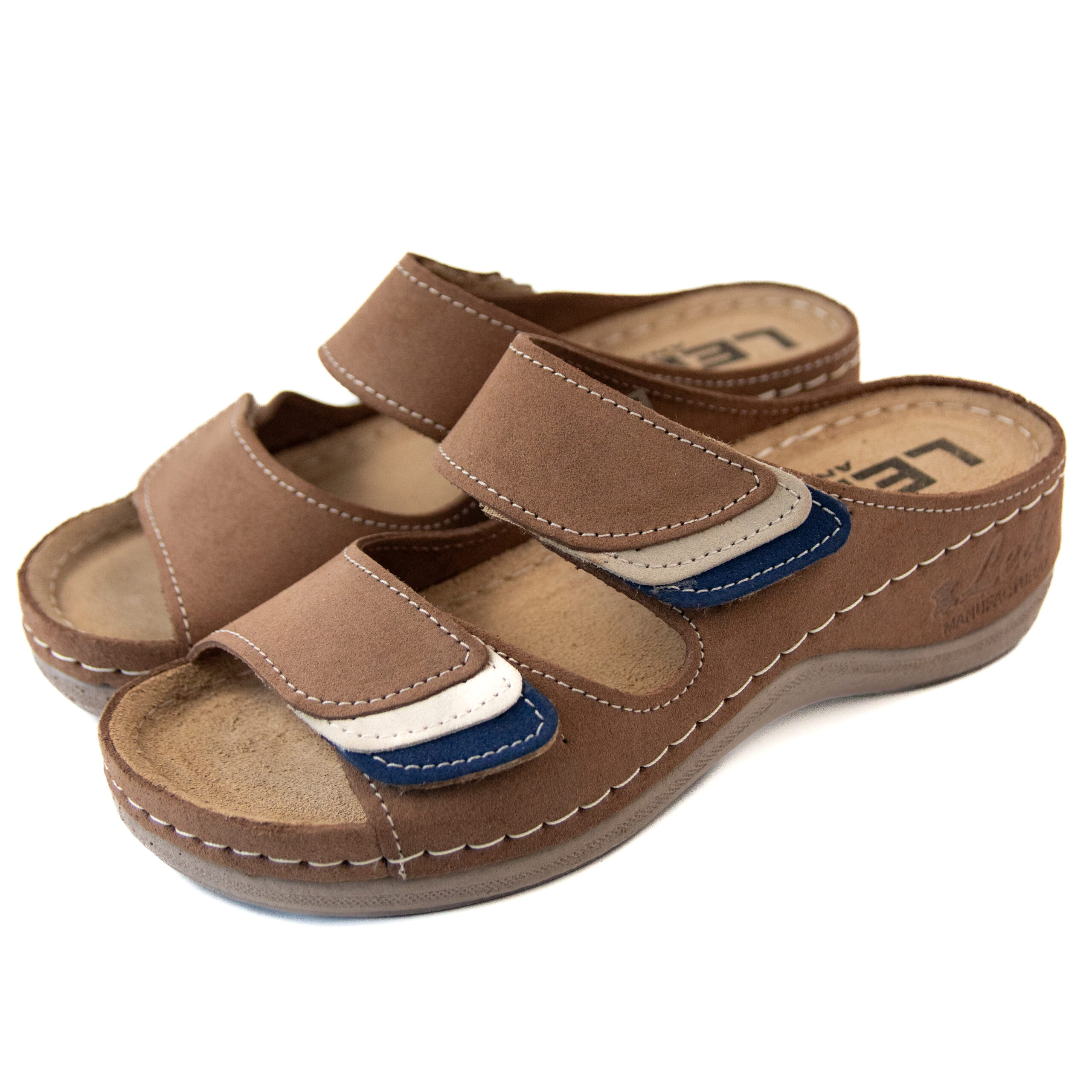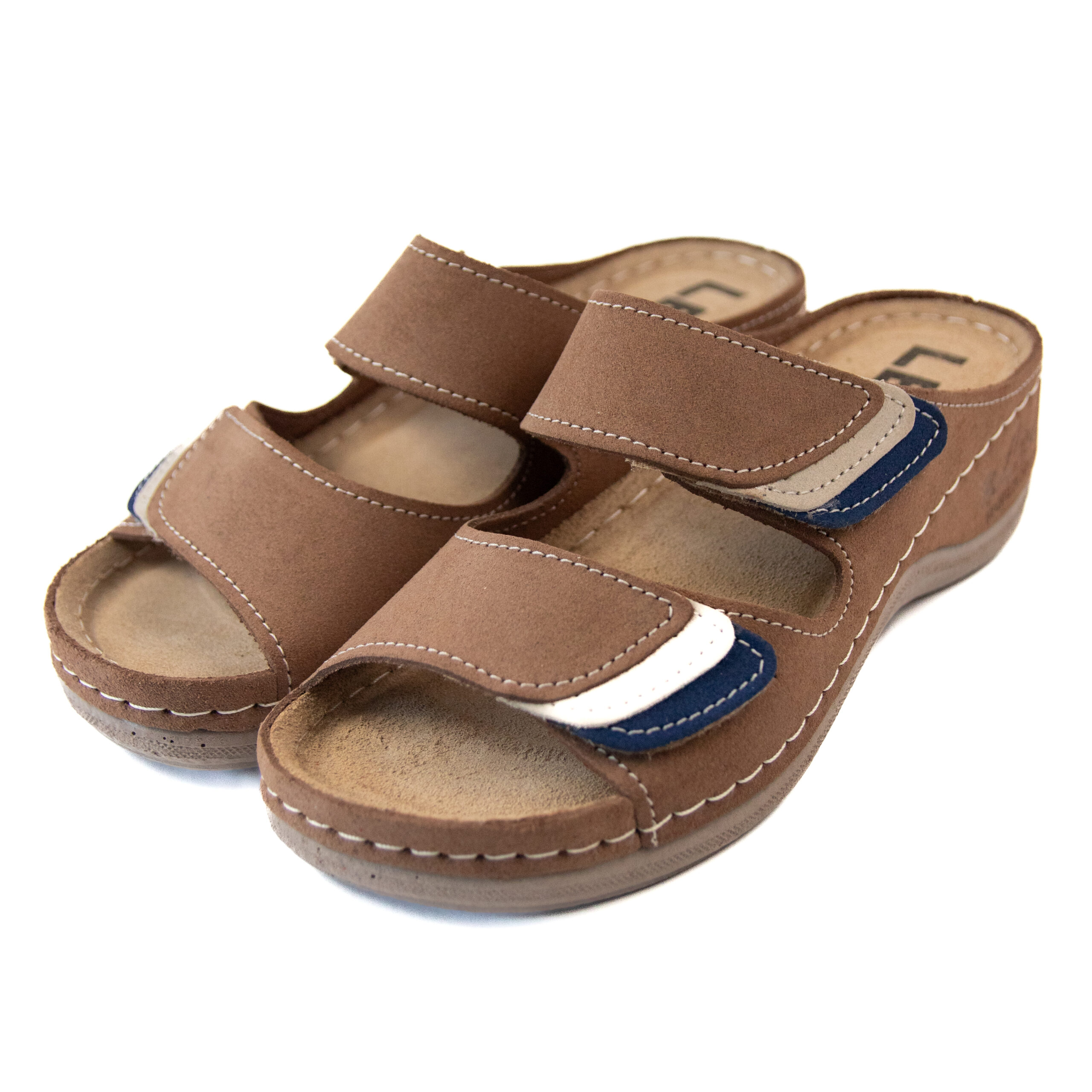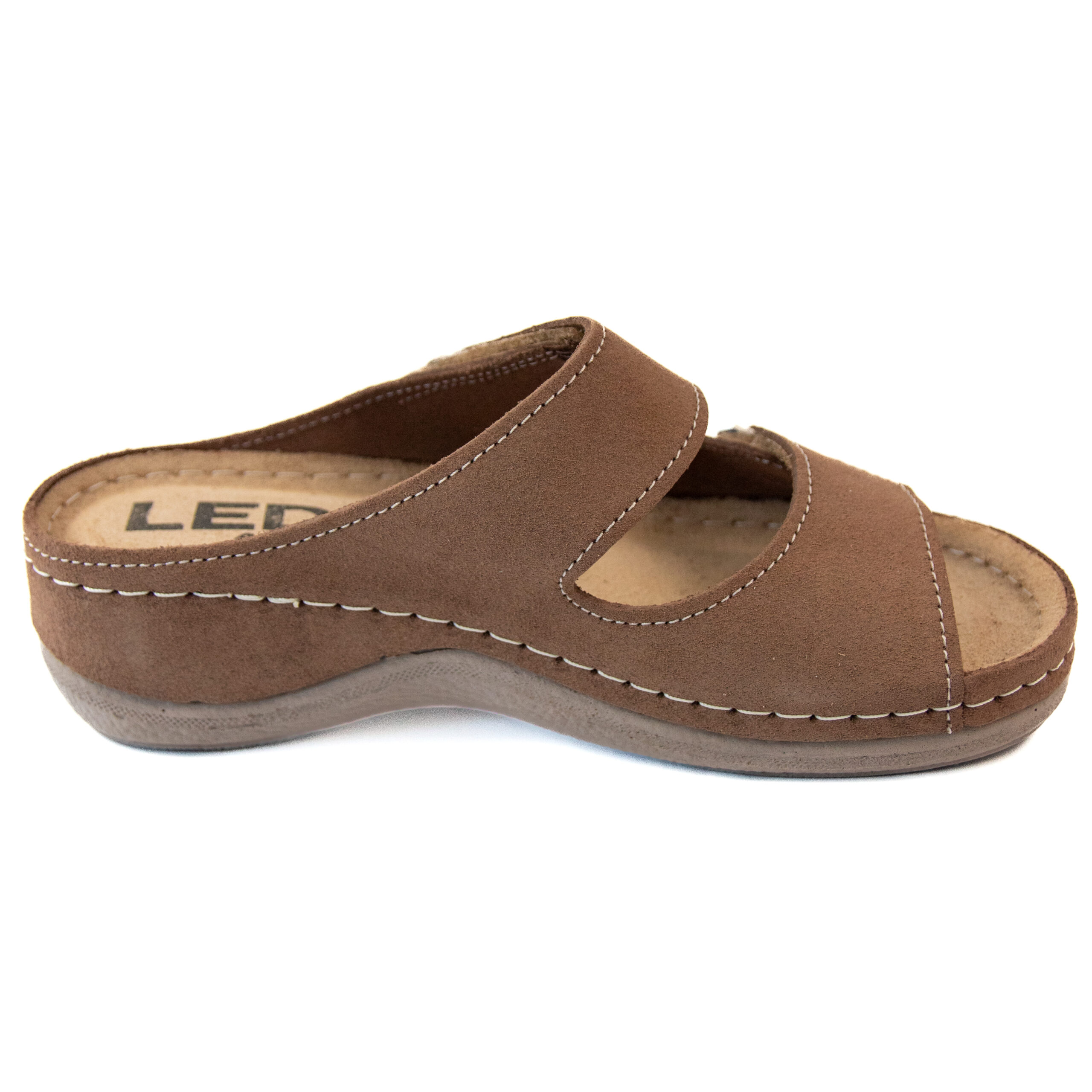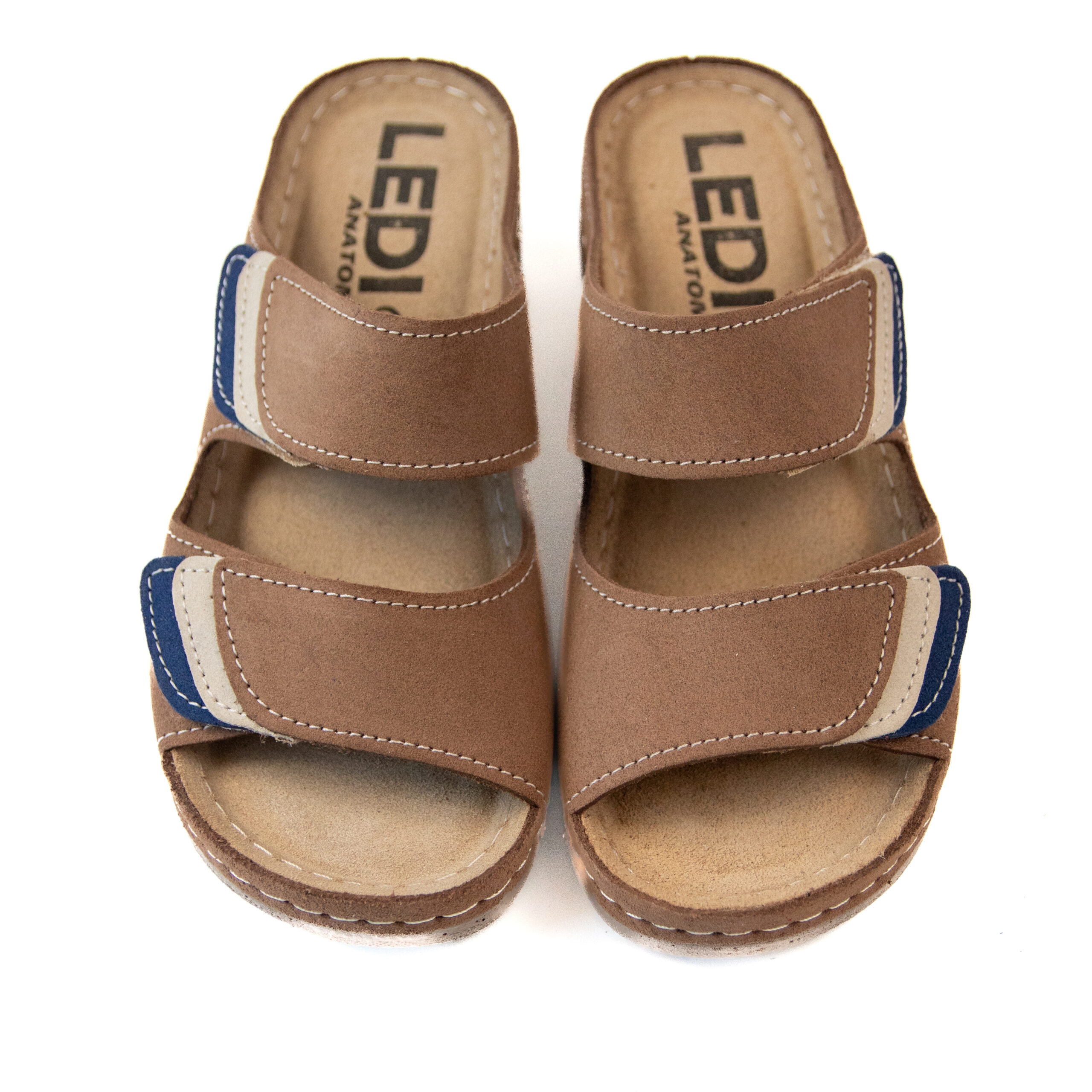 Дамски анатомични чехли, естествена кожа, кафяв цвят, табанът е средна твърдост - MEDIUM SOFT, на олекотено полиуретаново ходилo с височина 5см.
