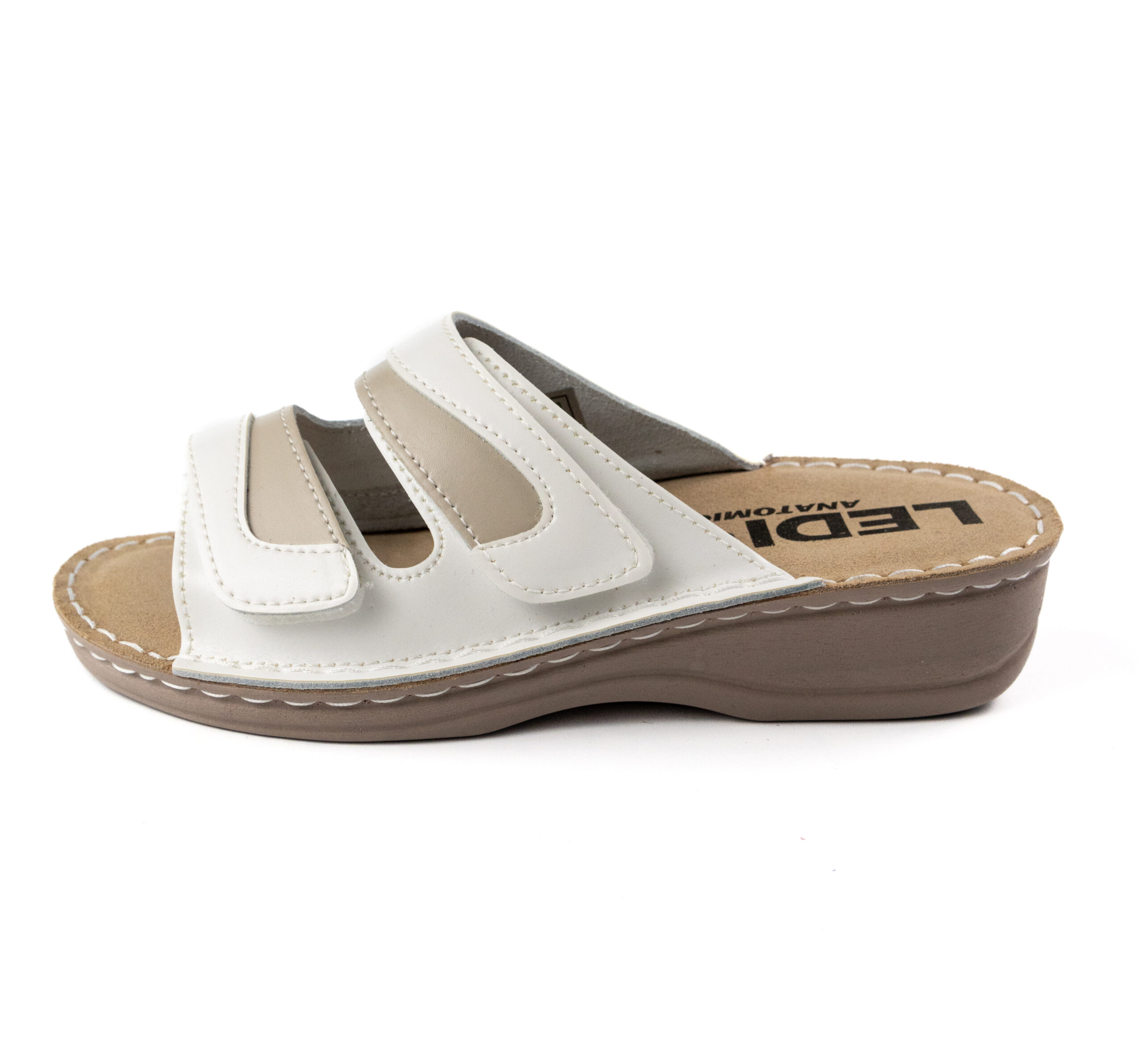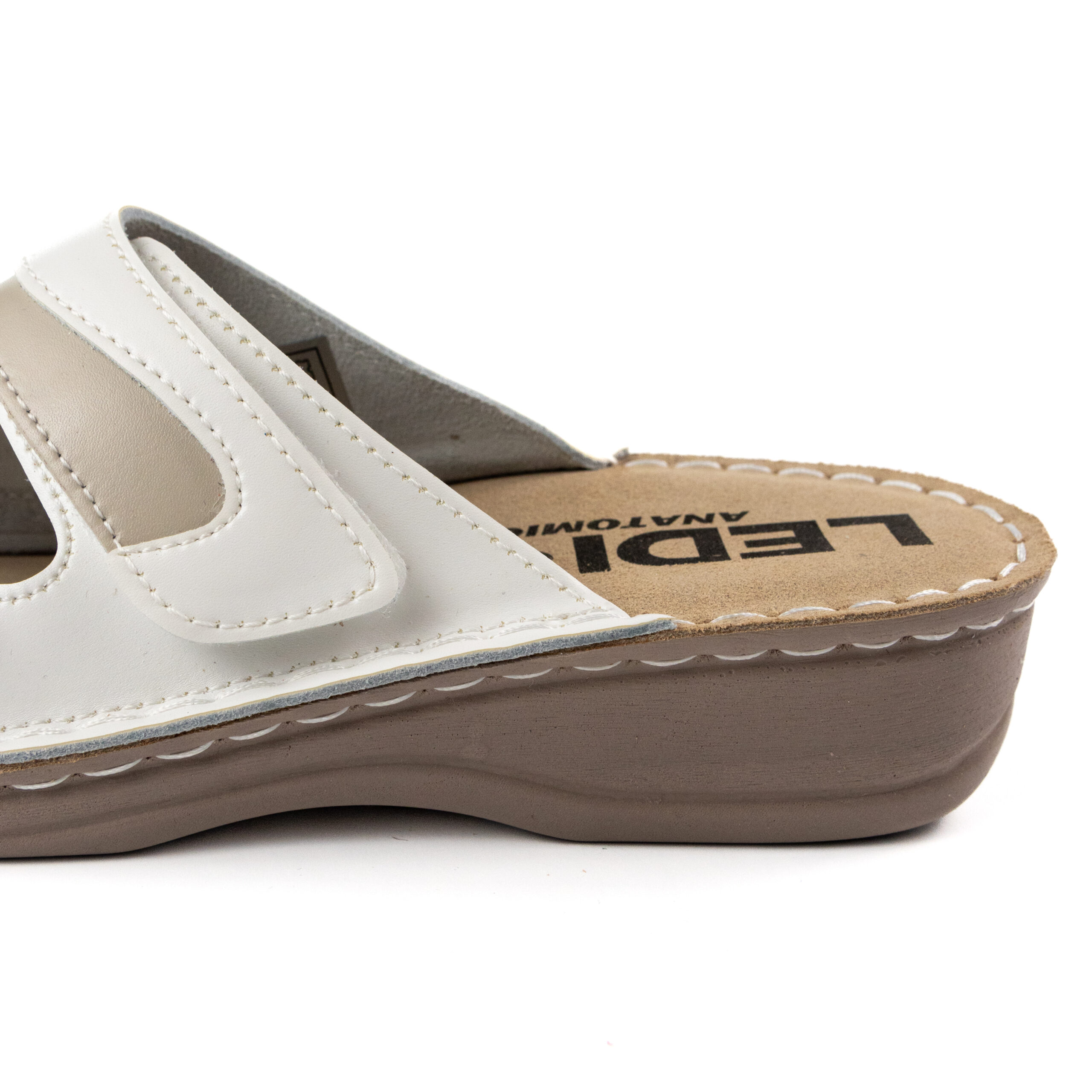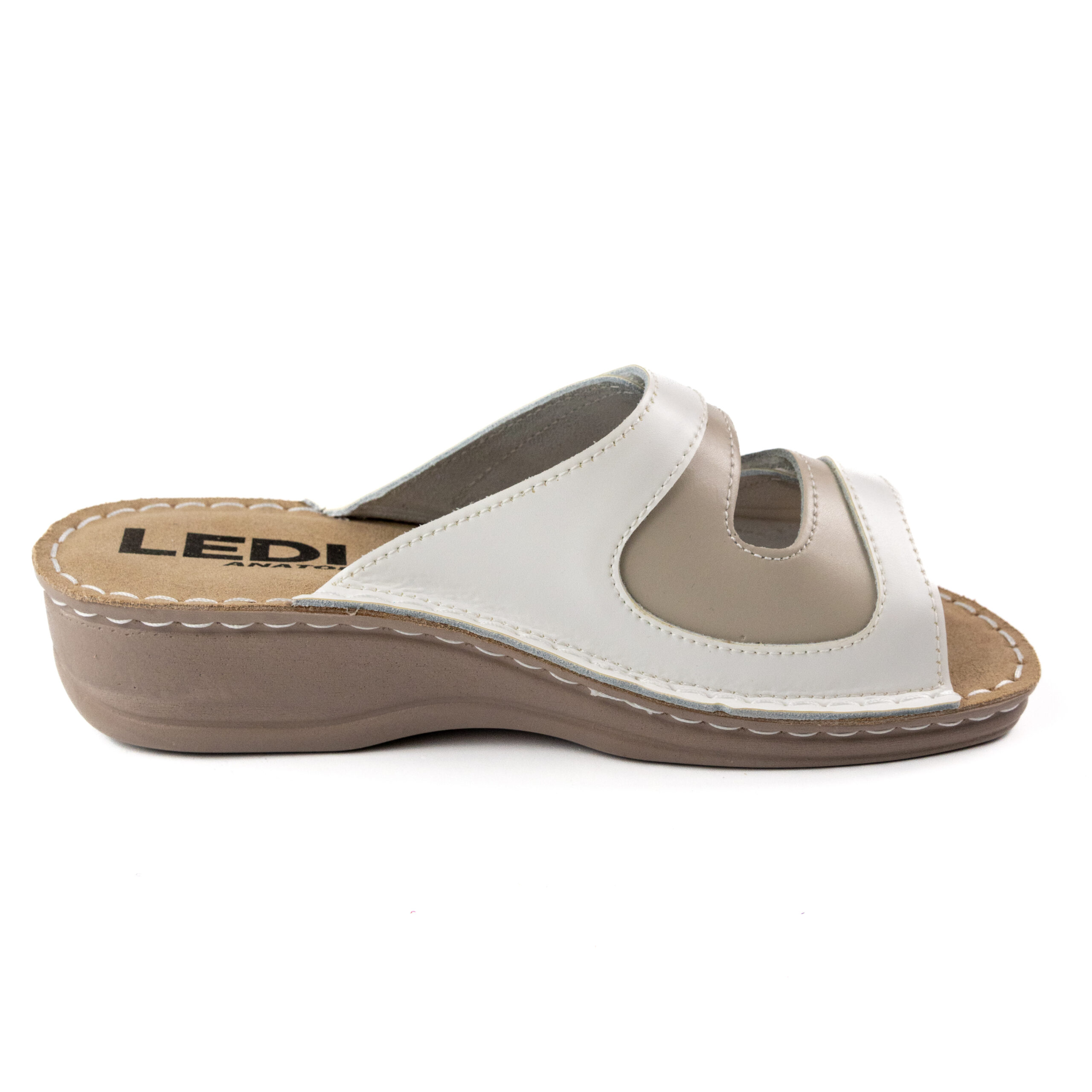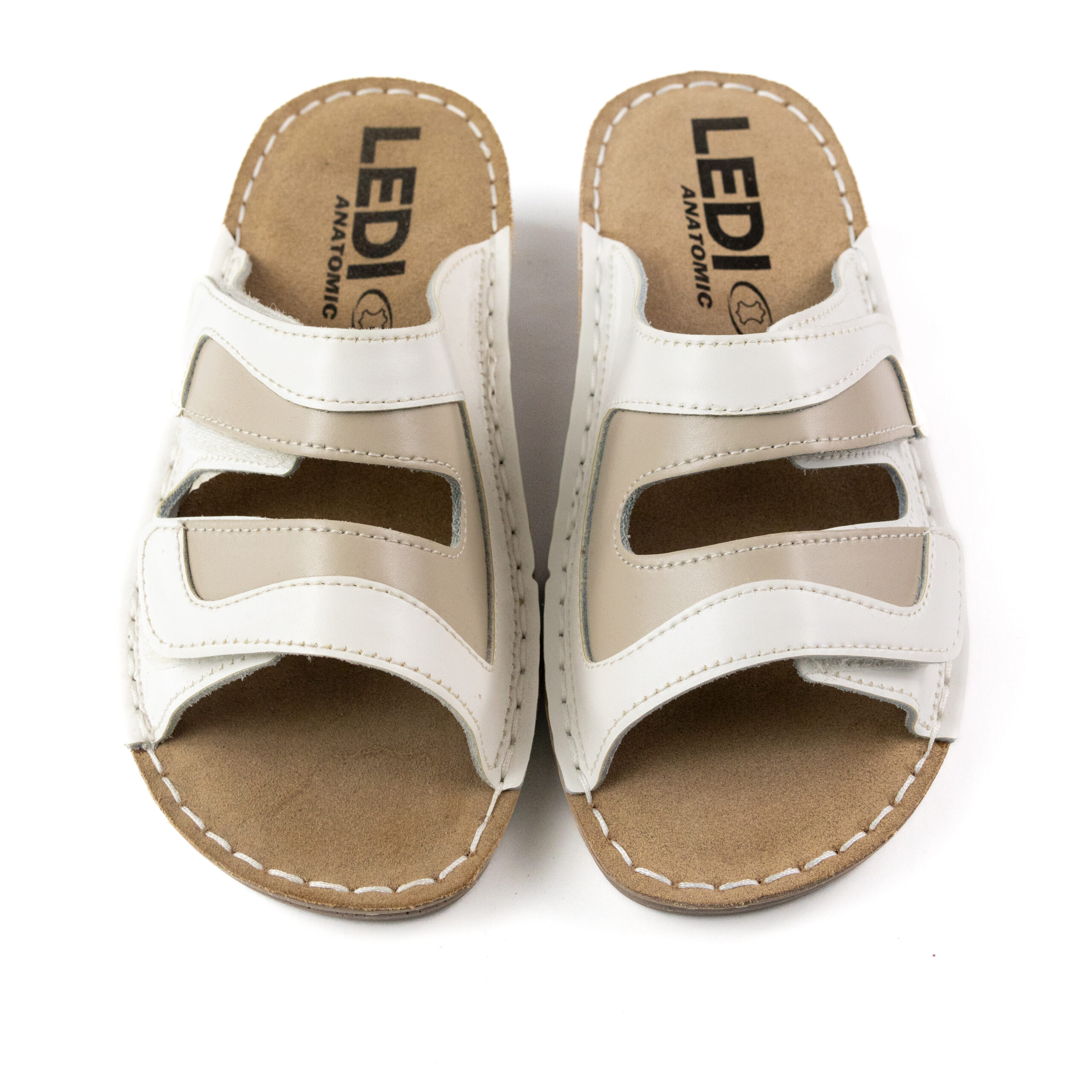 Дамски анатомични чехли, естествена кожа, основен бял цвят в комбинация с бежови детаили, на мек пено-латексов табан,заемащ формата на стъпалото, на олекотено полиуретаново ходилo с височина 3.5см.