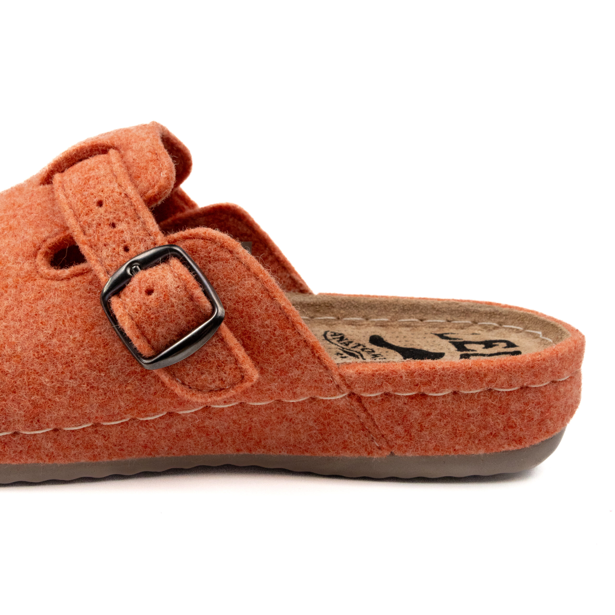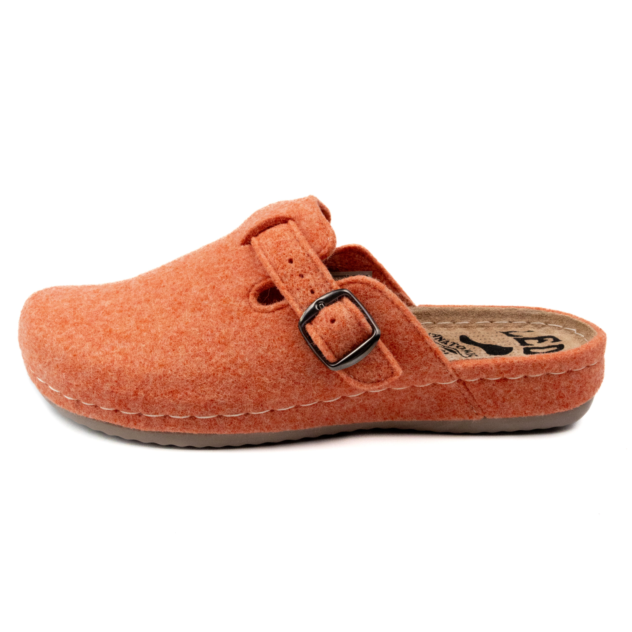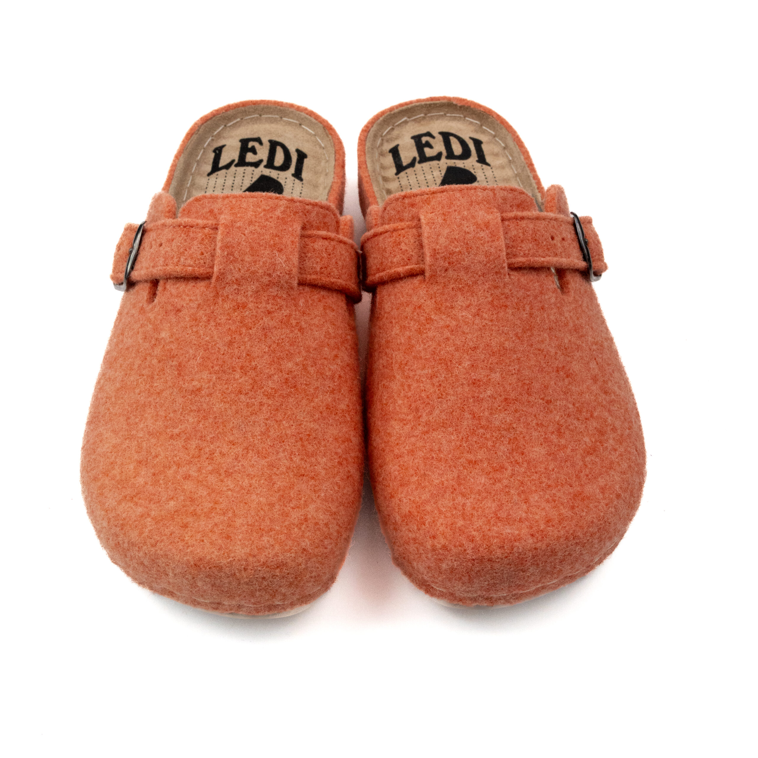 Дамски анатомични пантофи, 100% естествена вълна, цвят-кайсия , на велуризиран табан,който не позволява приплъзване на крака вследствие на изпотяване, на олекотено полиуретаново ходилo с височина 2см.Подходящ както за студените зимни вечери у дома, така и за използване навън