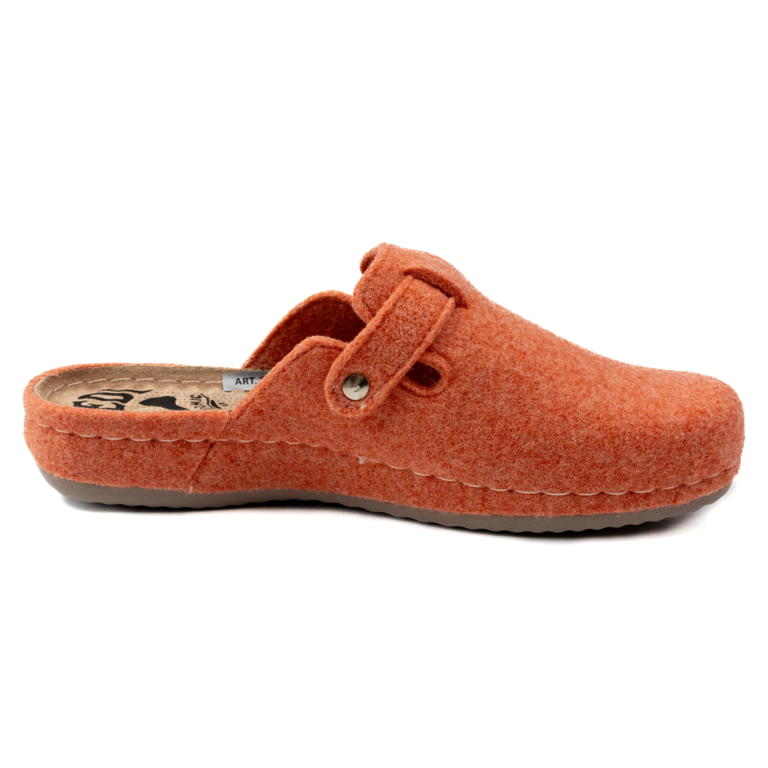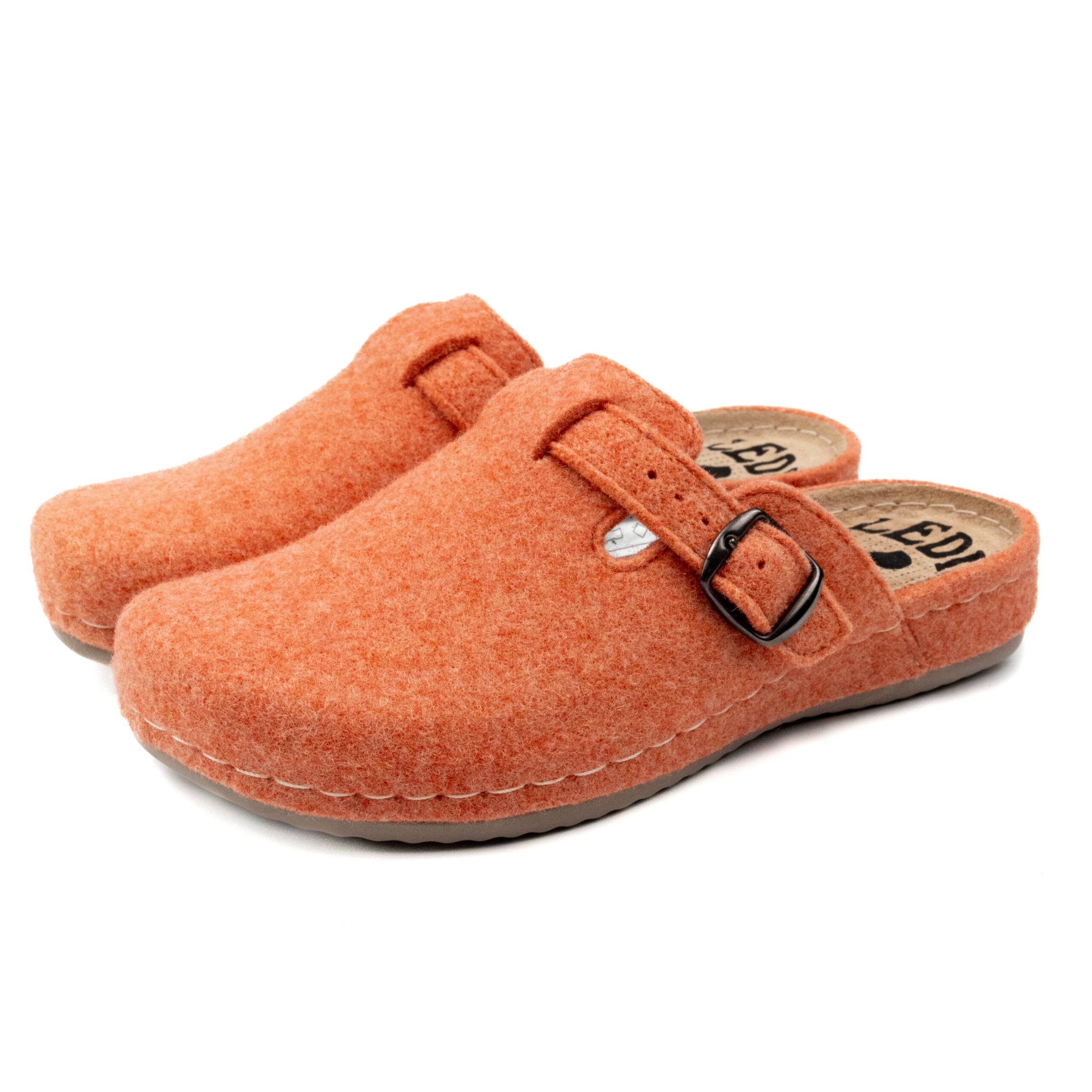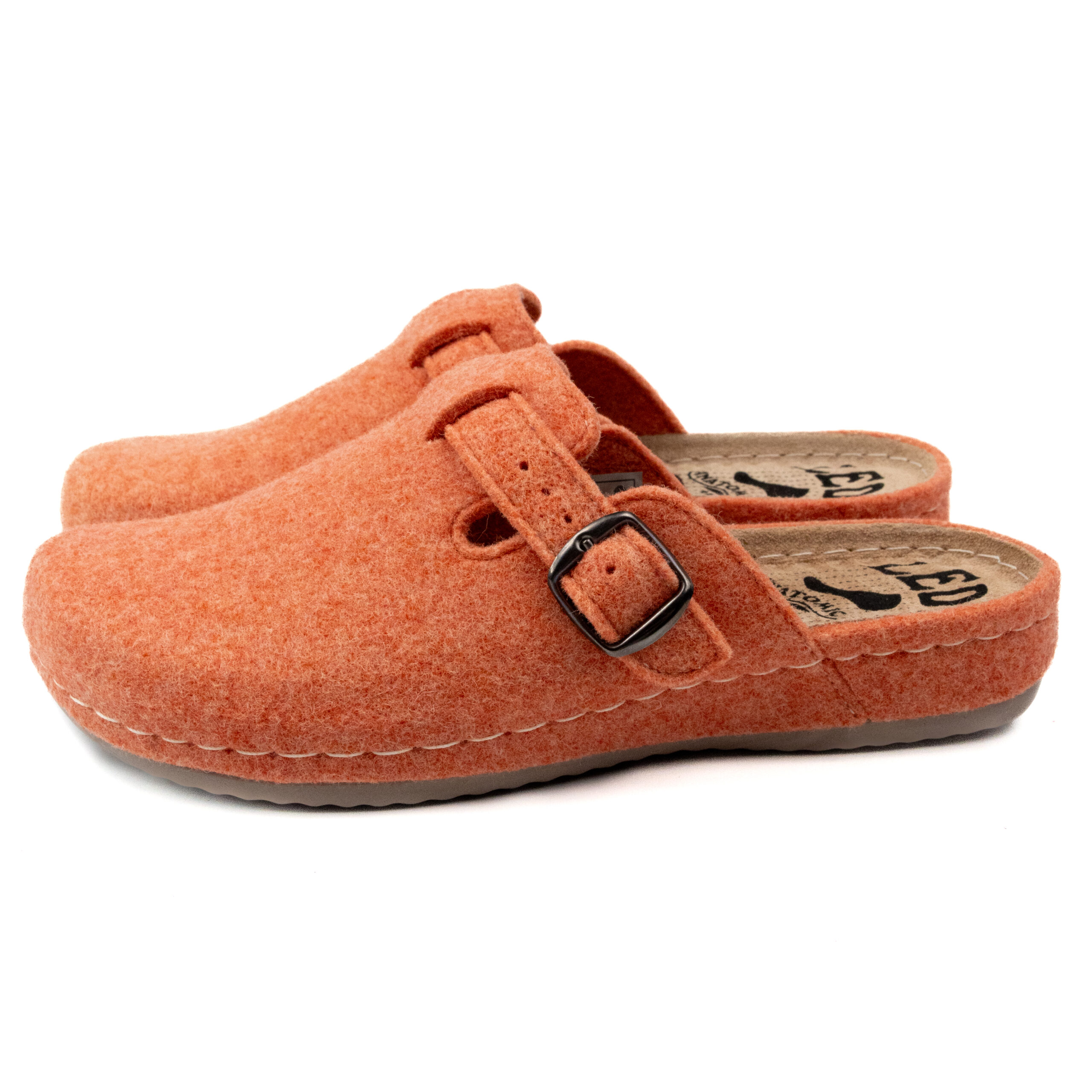 Дамски анатомични пантофи, 100% естествена вълна, цвят-кайсия , на велуризиран табан,който не позволява приплъзване на крака вследствие на изпотяване, на олекотено полиуретаново ходилo с височина 2см.Подходящ както за студените зимни вечери у дома, така и за използване навън