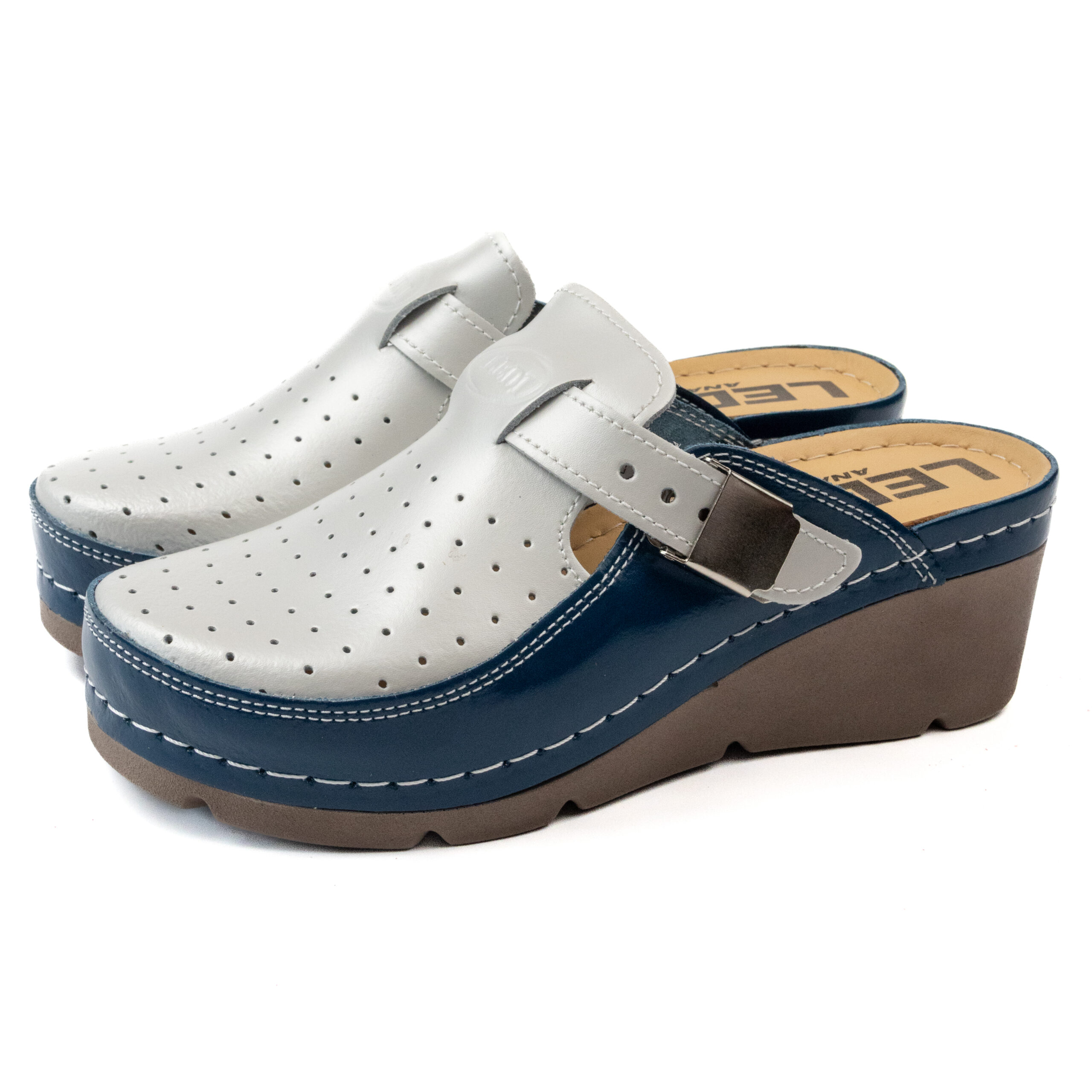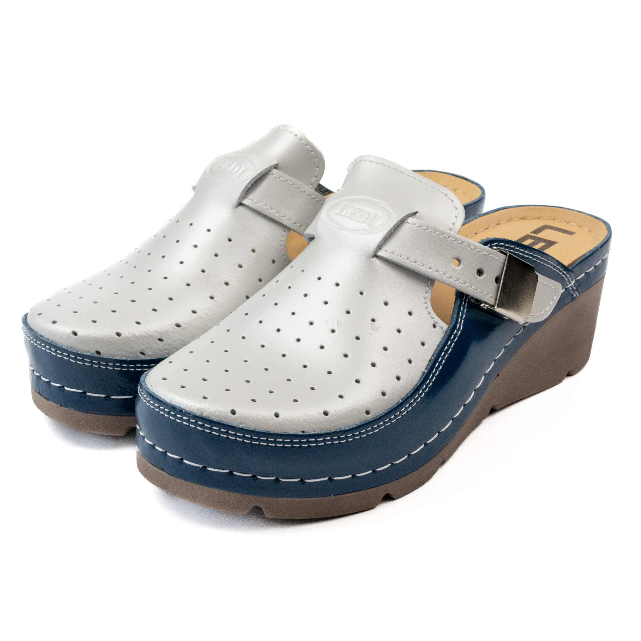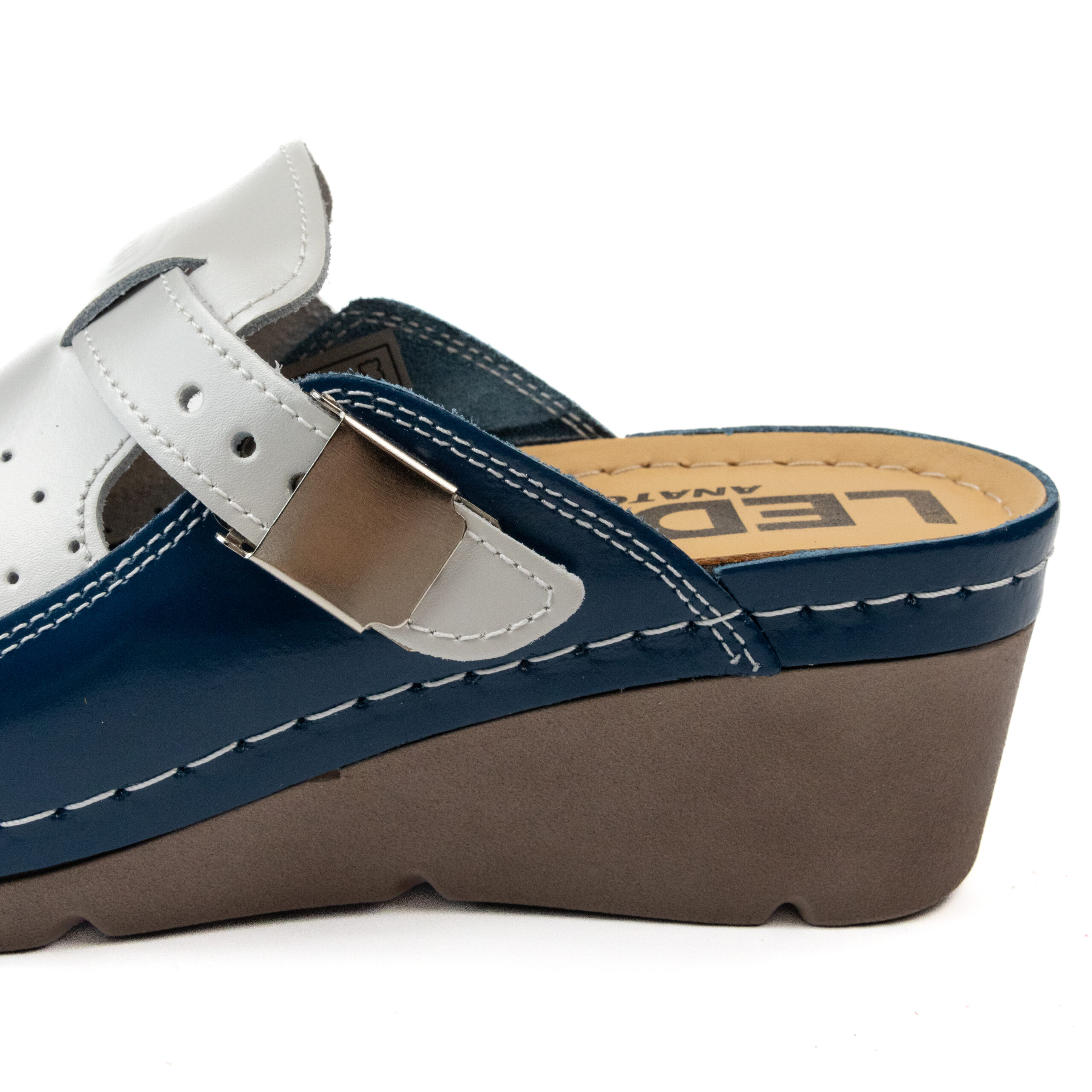 Дамско анатомично сабо, естествена кожа,комбинация от син и бял цвят, табанът е средна твърдост, на олекотено полиуретаново ходилo с височина 6см.
