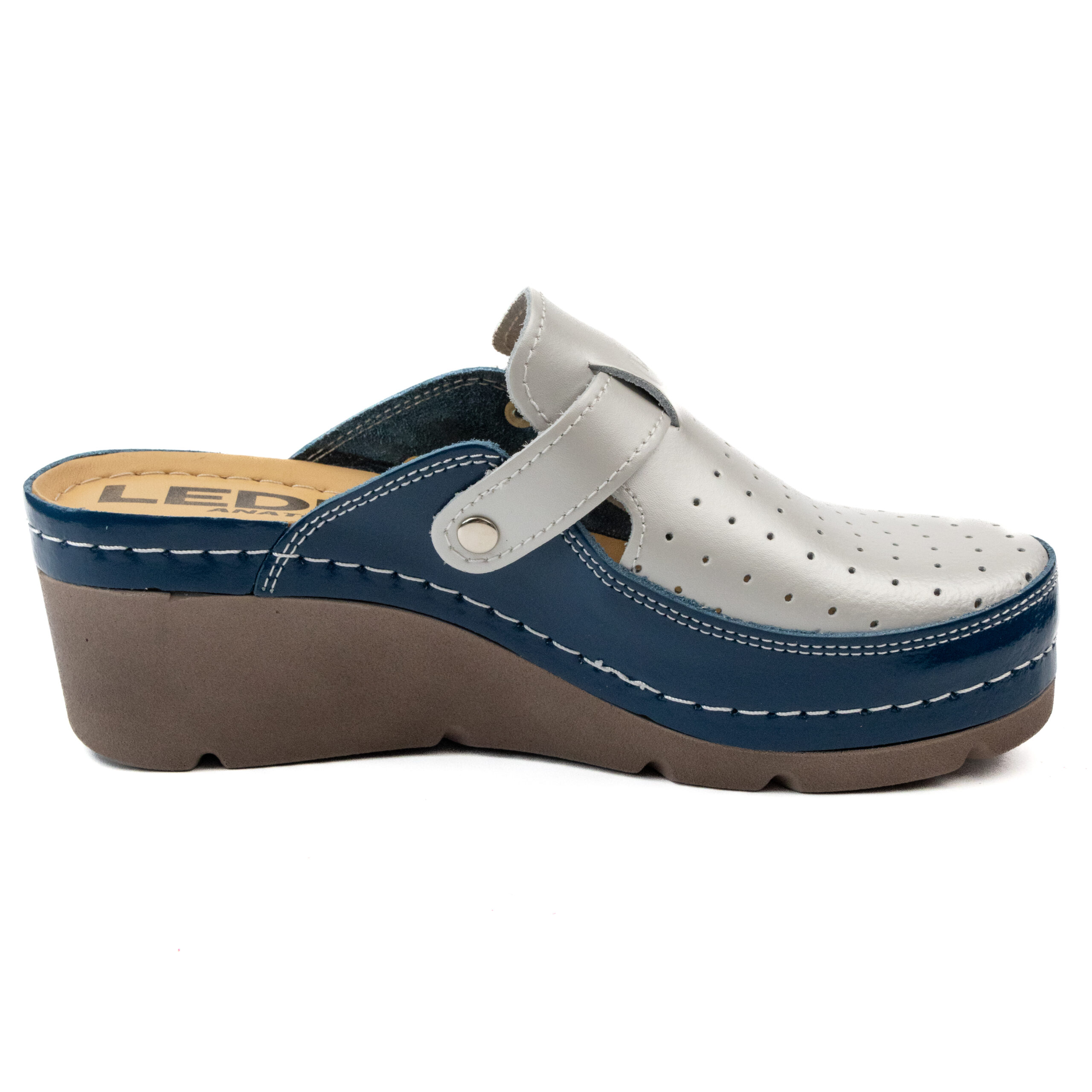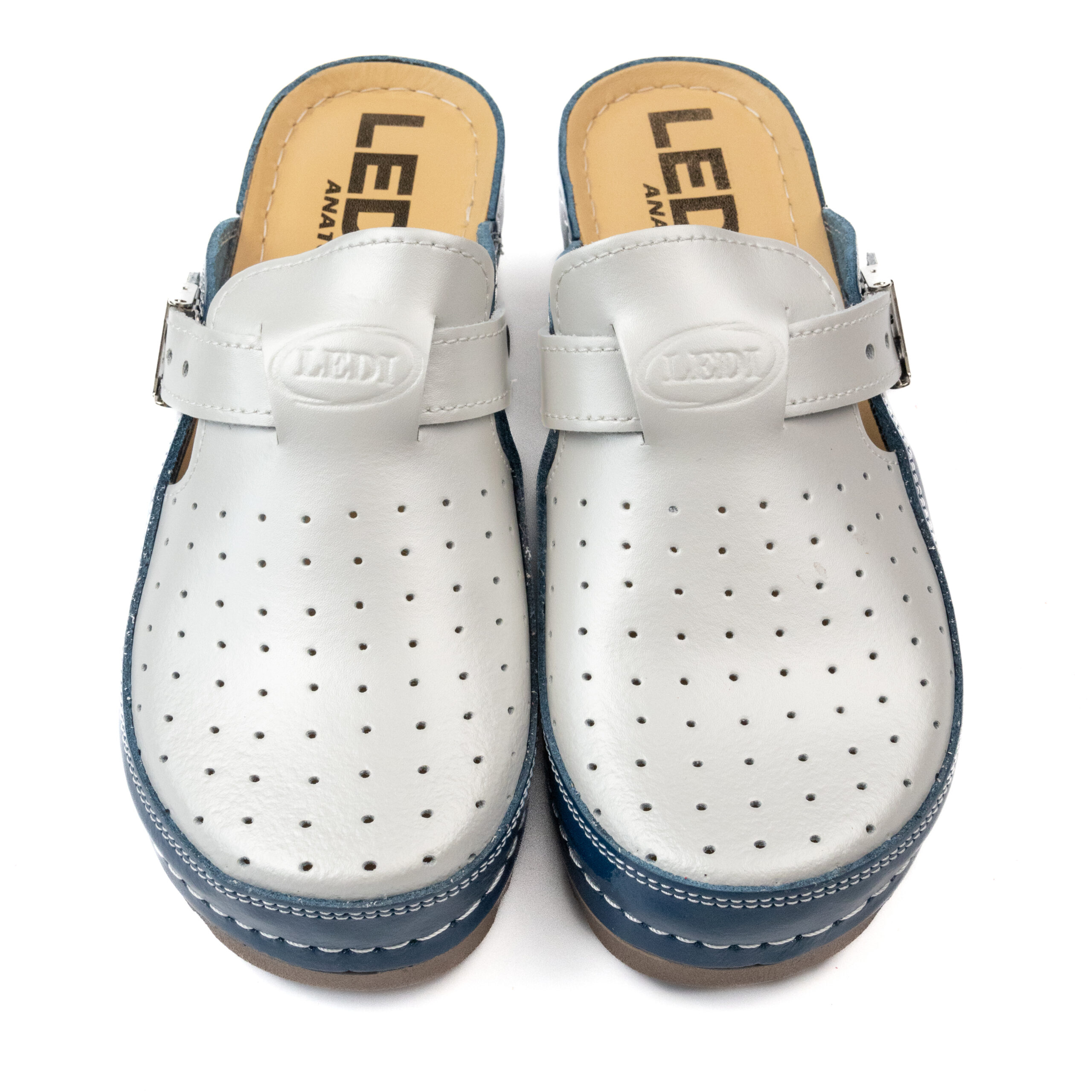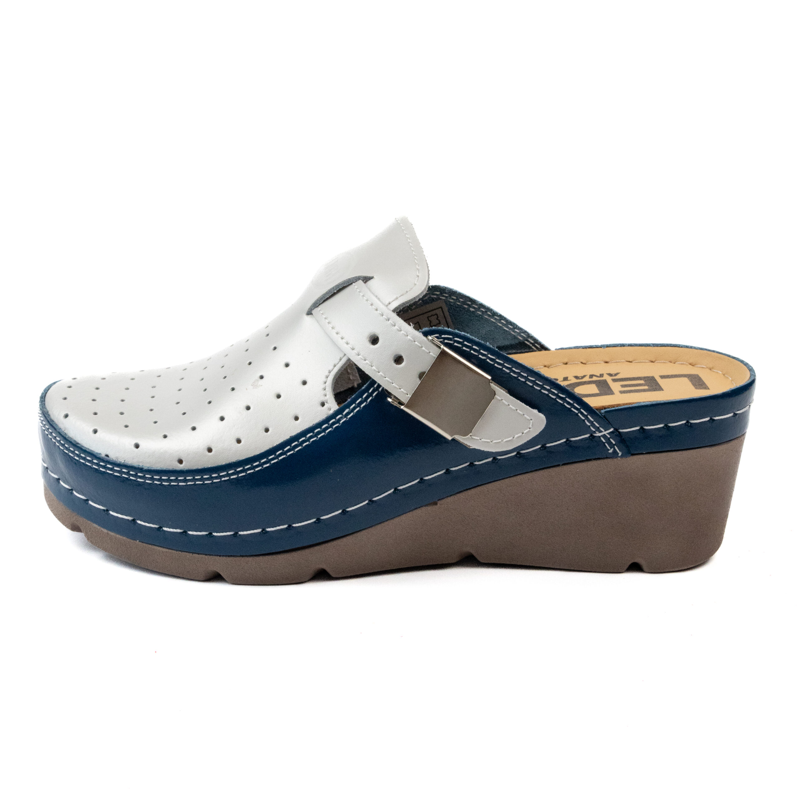 Дамско анатомично сабо, естествена кожа,комбинация от син и бял цвят, табанът е средна твърдост, на олекотено полиуретаново ходилo с височина 6см.