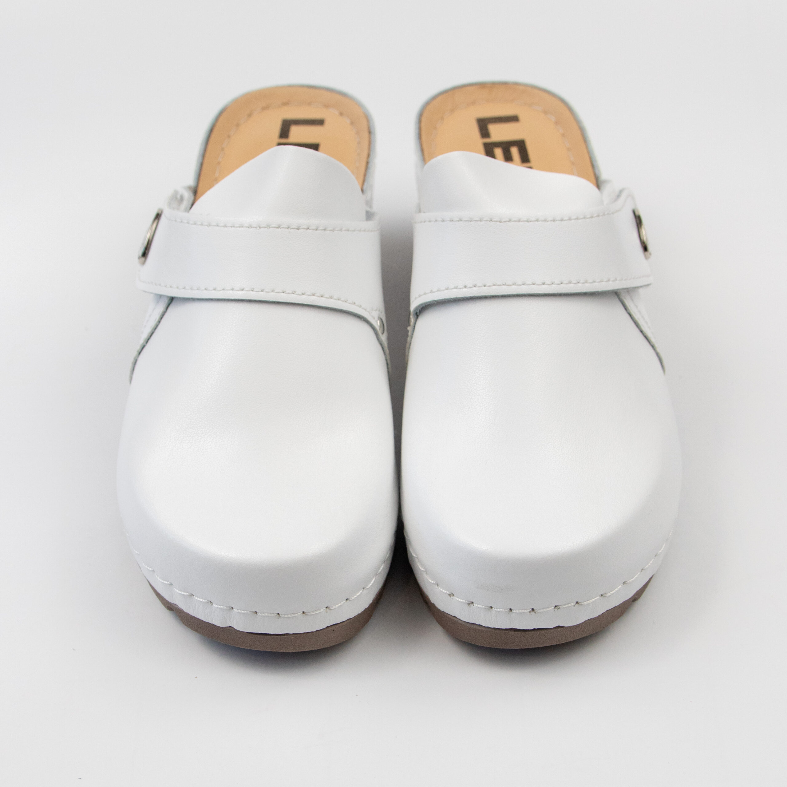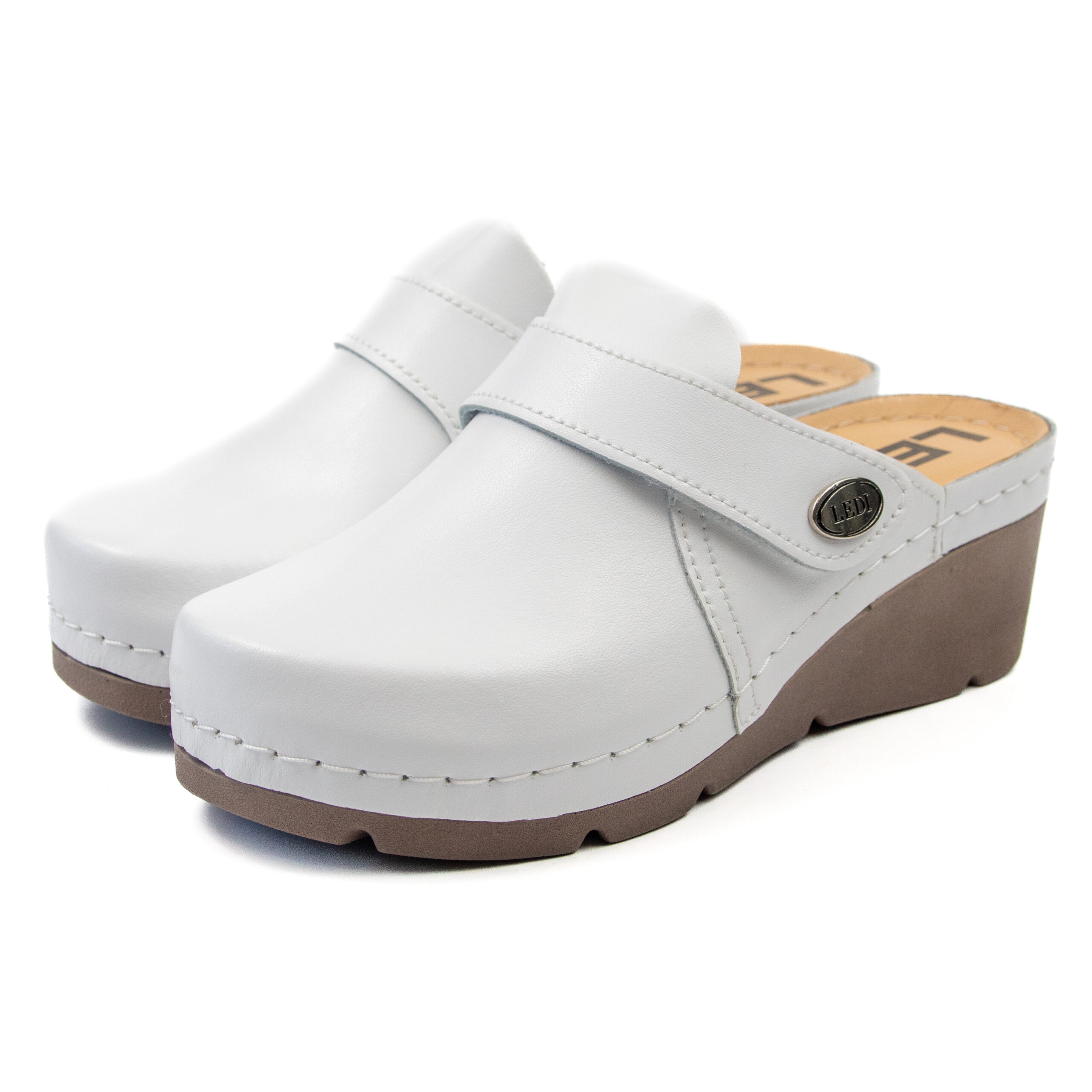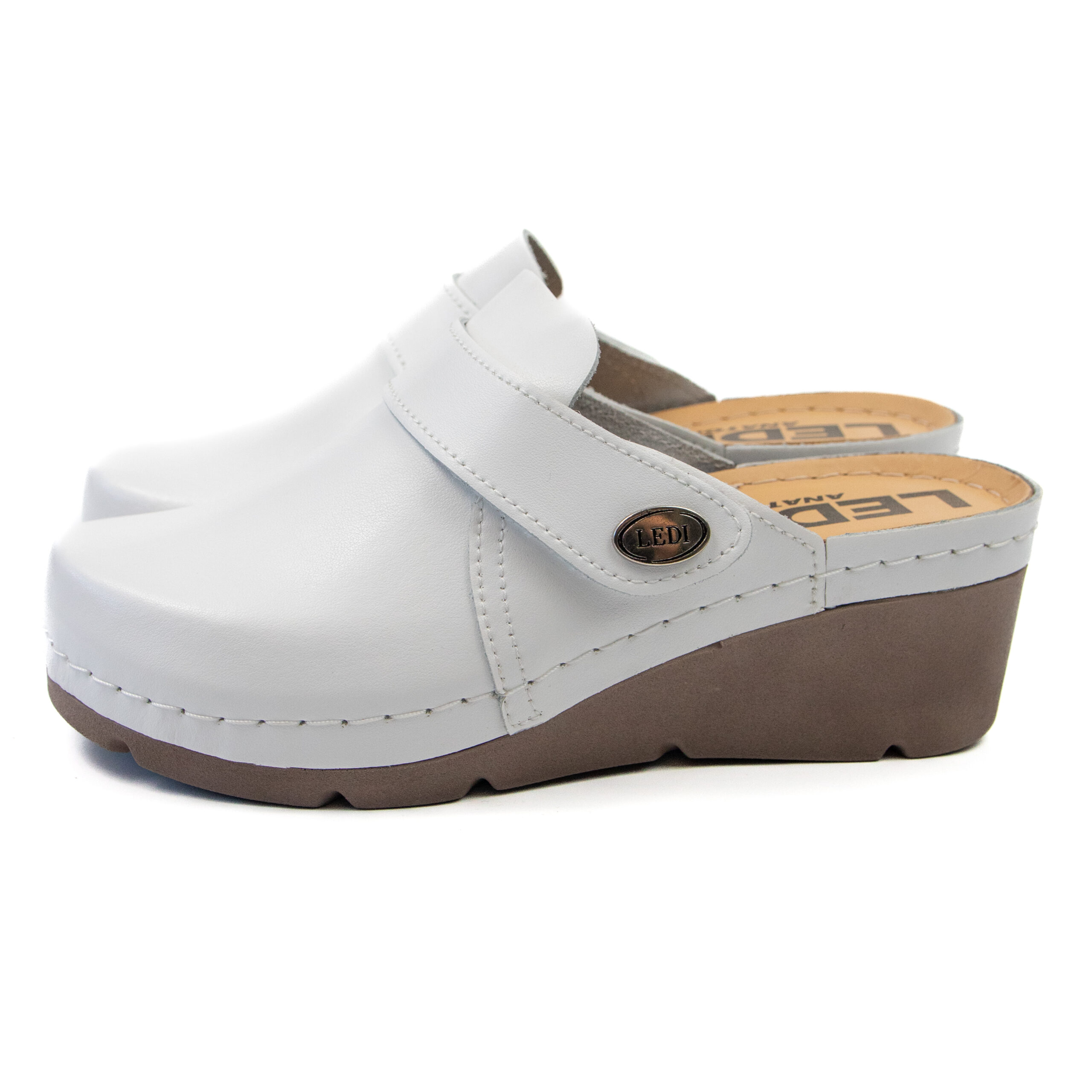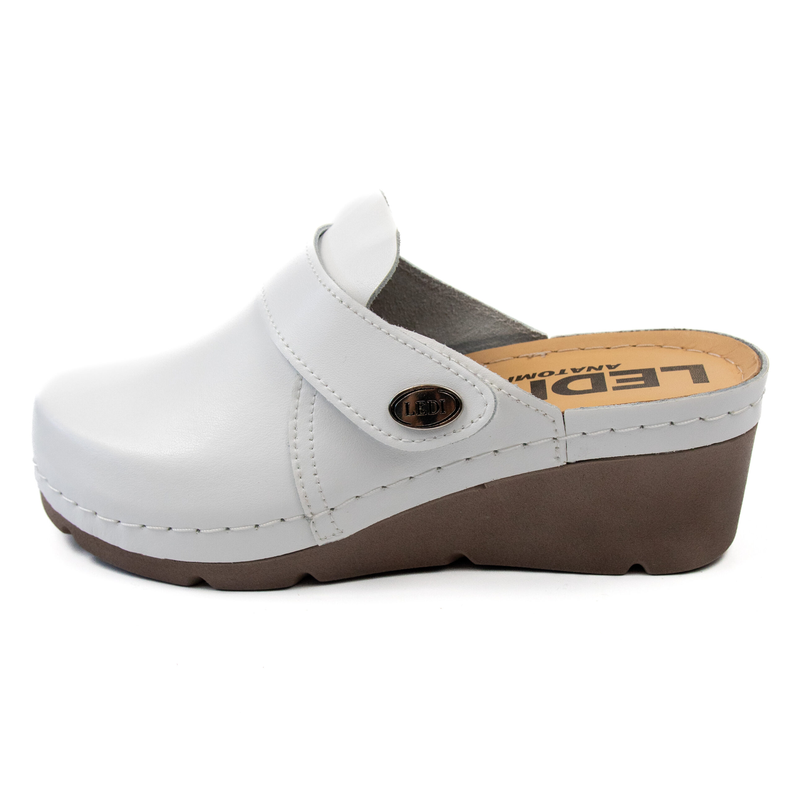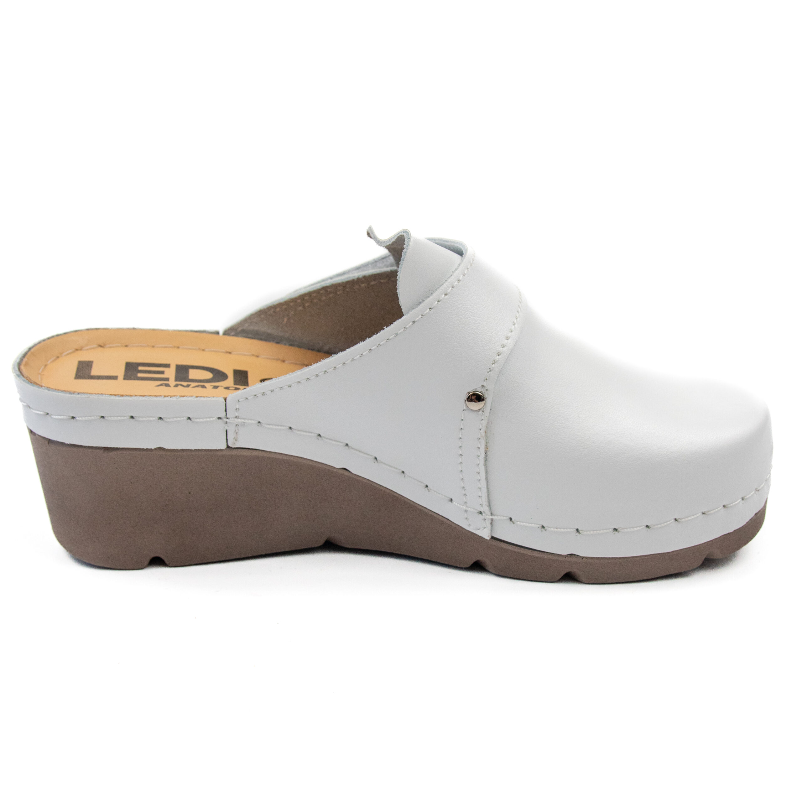 Дамско анатомично сабо, естествена кожа, бял цвят, табанът е средна твърдост, на олекотено полиуретаново ходилo с височина 6см.