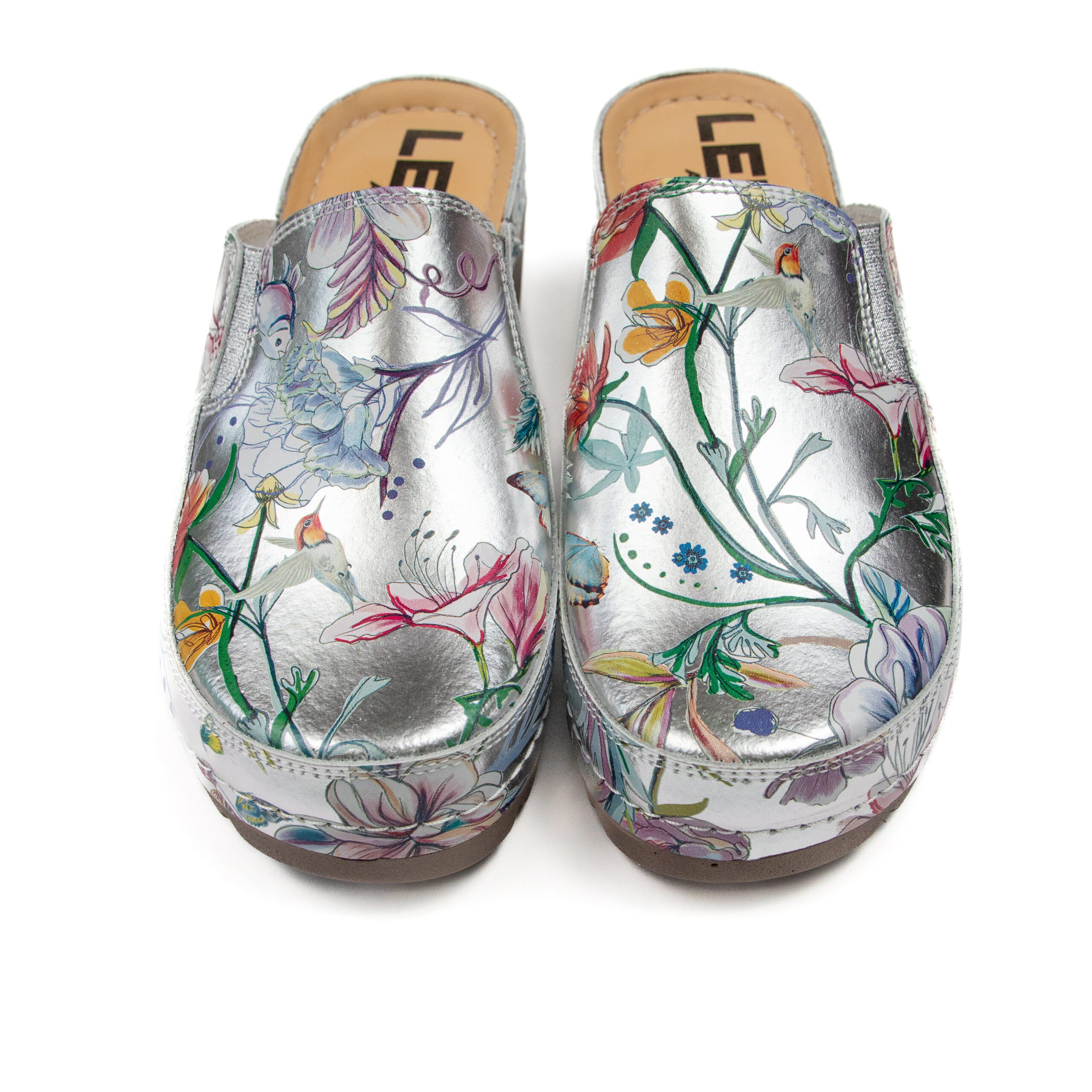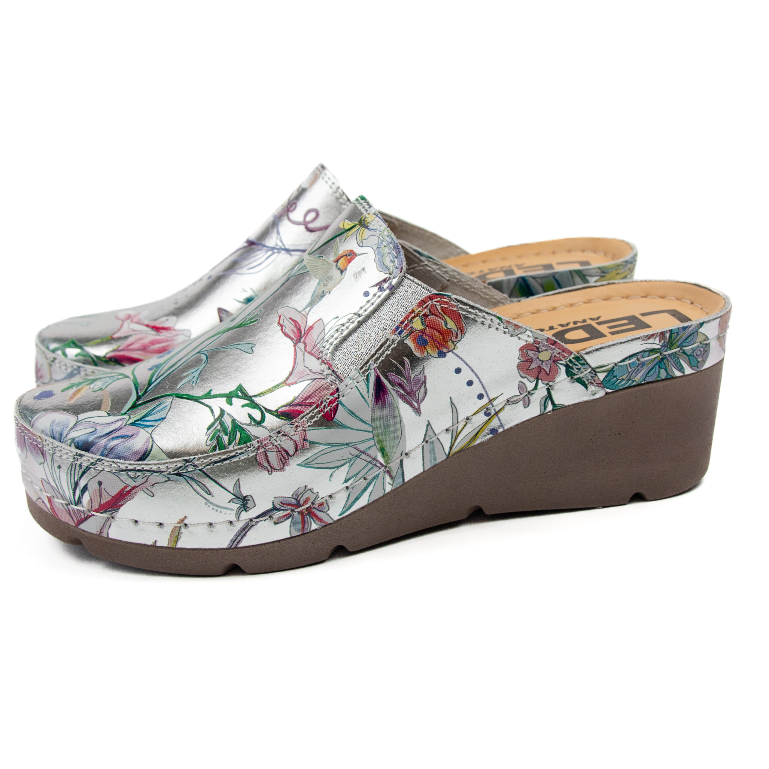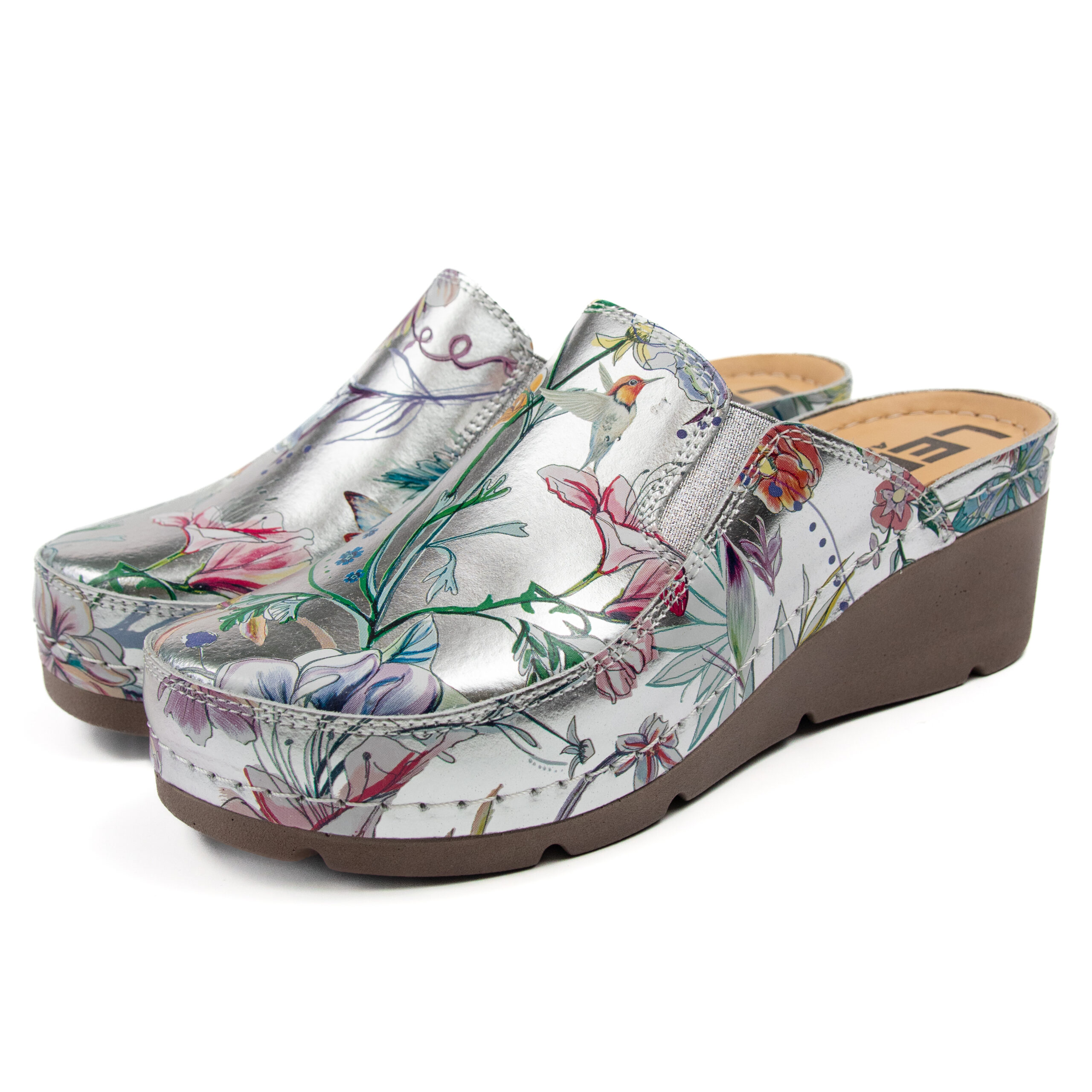 Впечатляващо дамско анатомично сабо на платформа с флорален дизайн и металически отблясък. Изработено от висококачествена естествена кожа, този модел съчетава модерен стил и максимален комфорт.