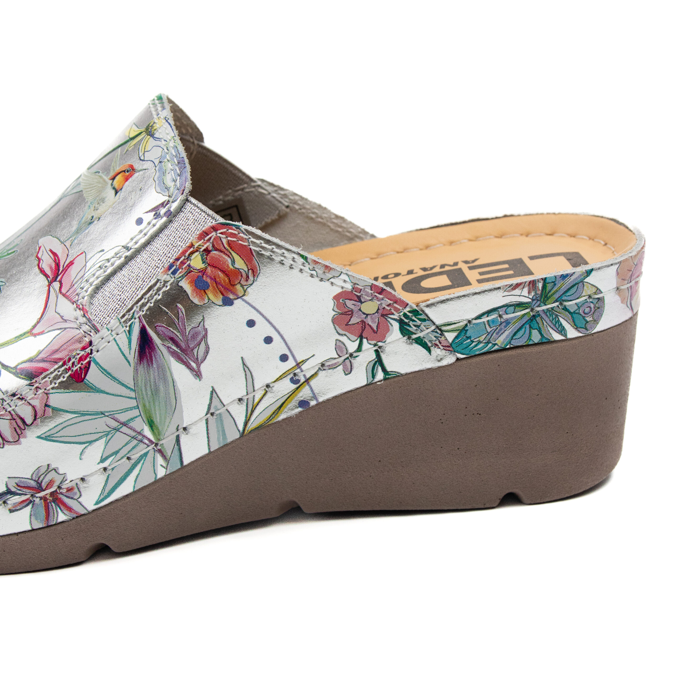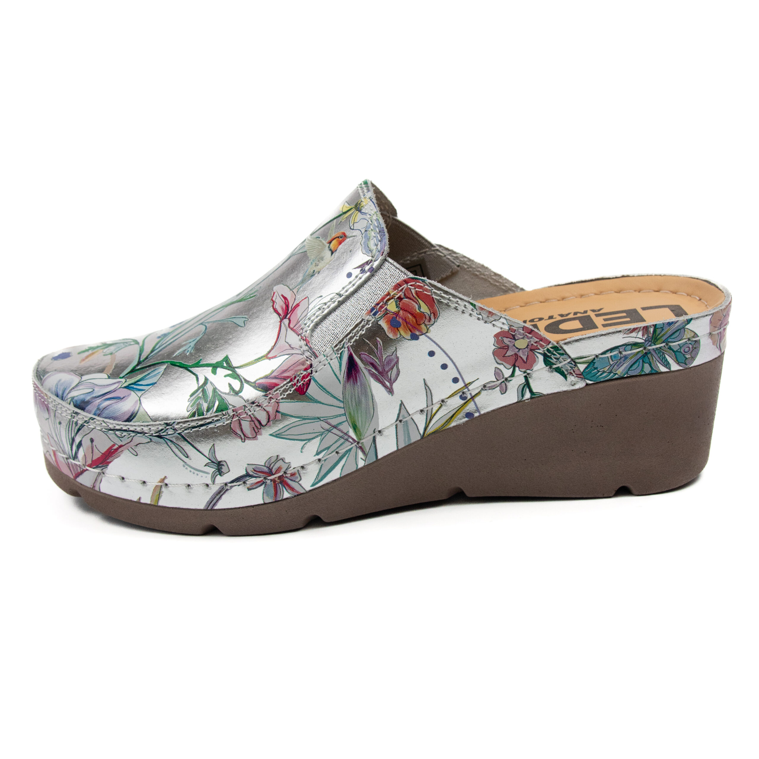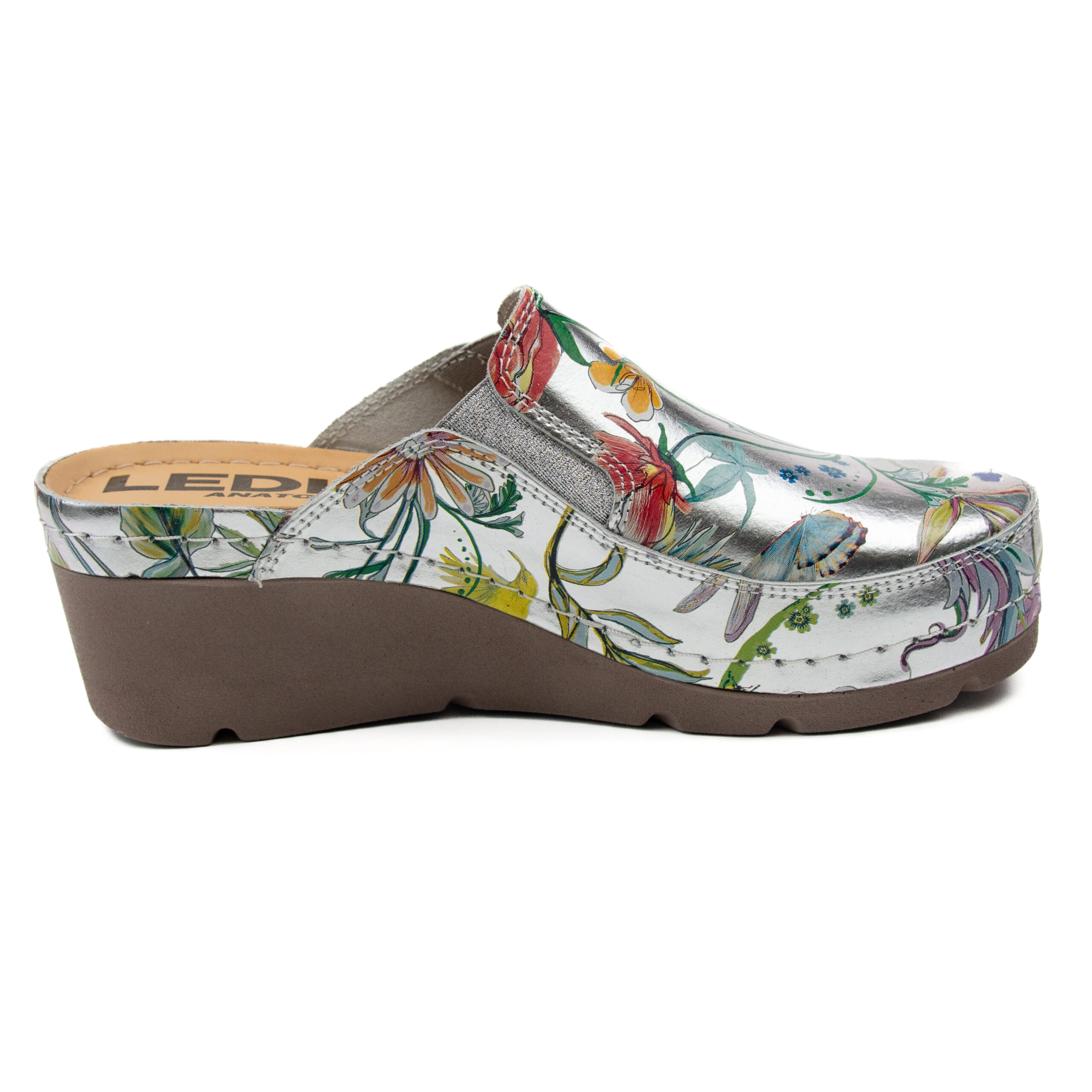 Впечатляващо дамско анатомично сабо на платформа с флорален дизайн и металически отблясък. Изработено от висококачествена естествена кожа, този модел съчетава модерен стил и максимален комфорт.