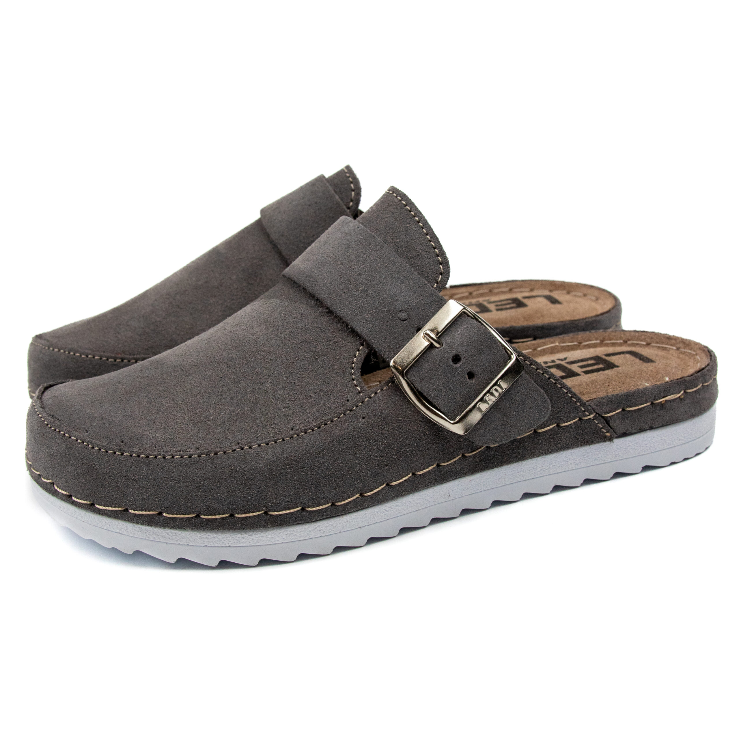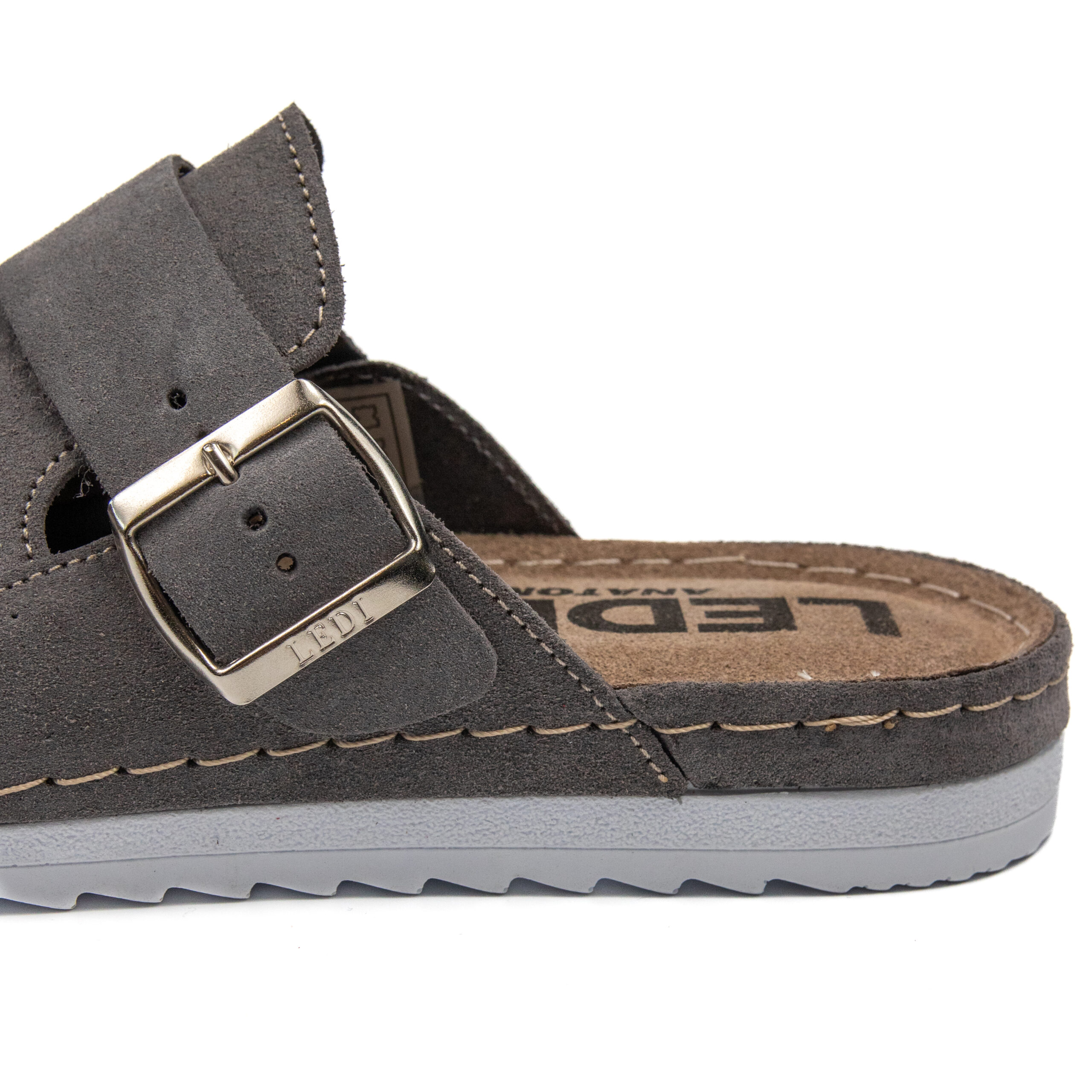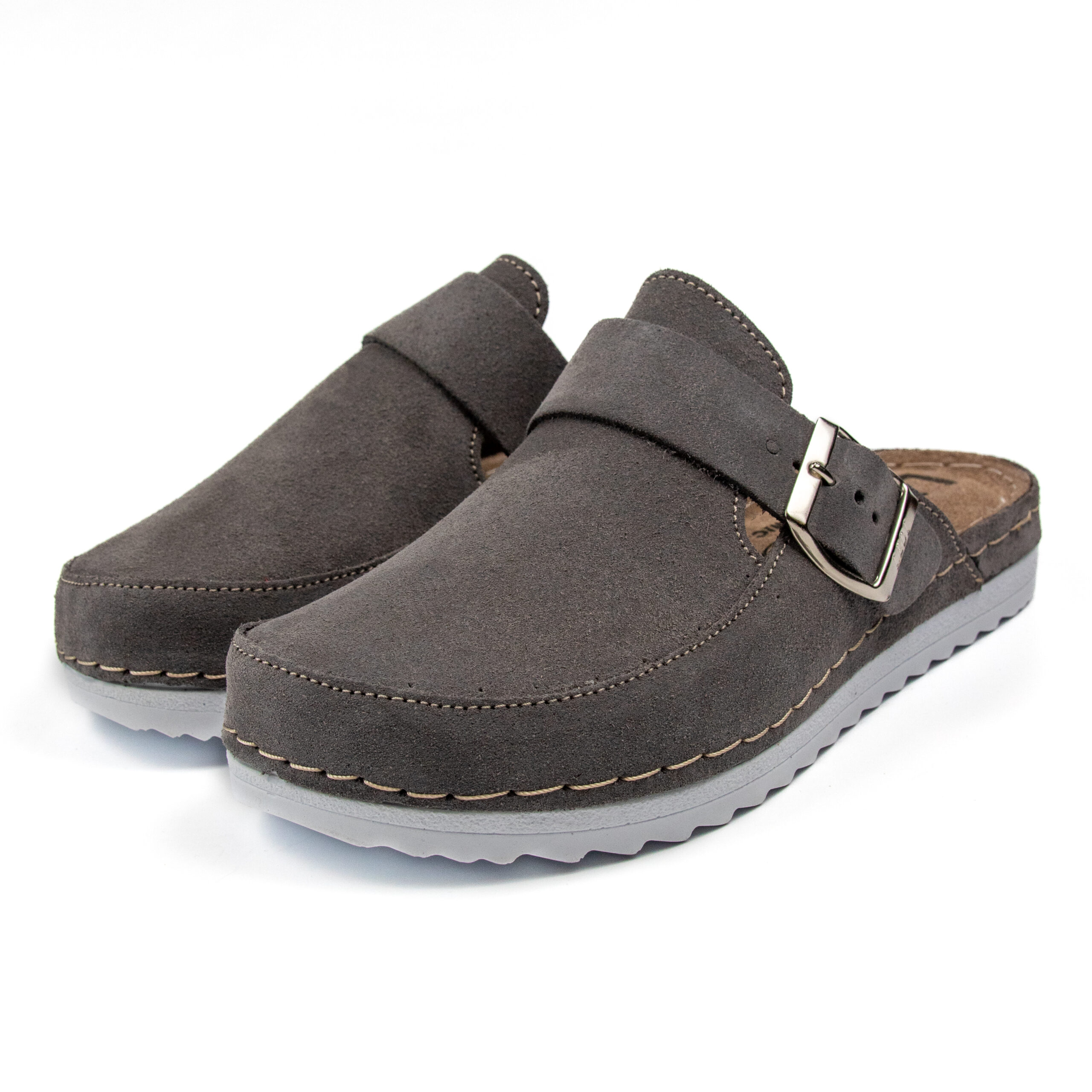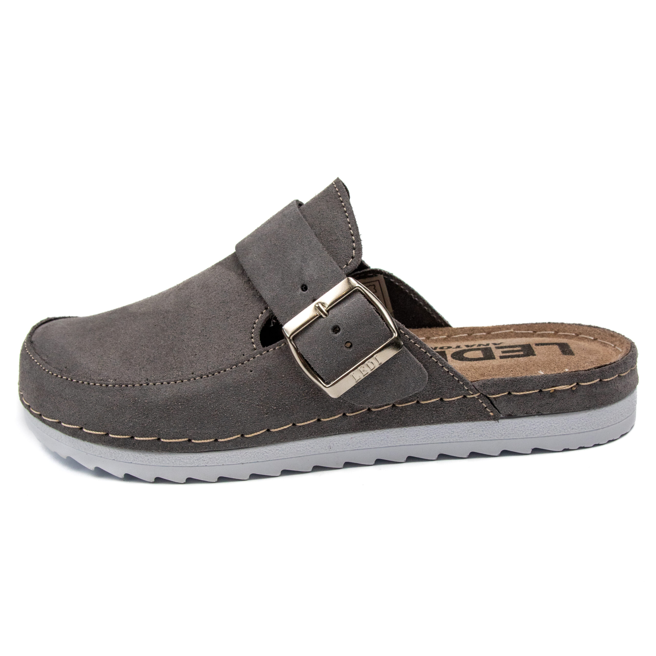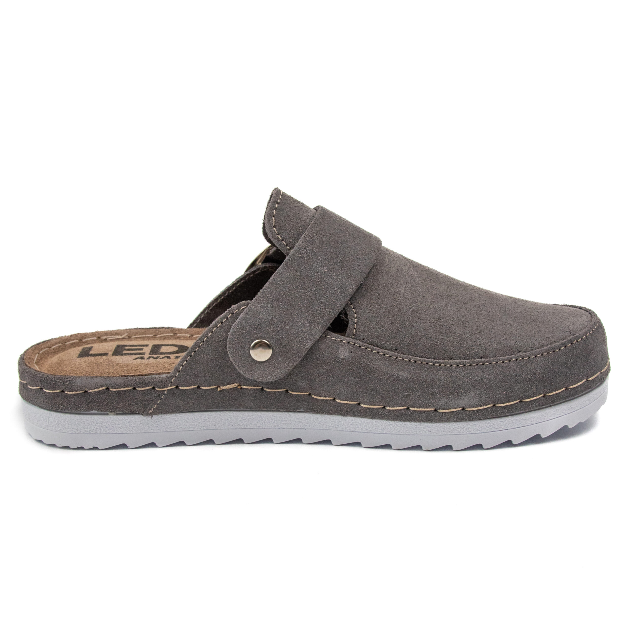 Модерно дамско анатомично сабо в елегантен тъмносив цвят, изработено от висококачествен естествен велур. Меката горна част и стабилната катарама осигуряват перфектно прилепване и комфорт при всяко движение.