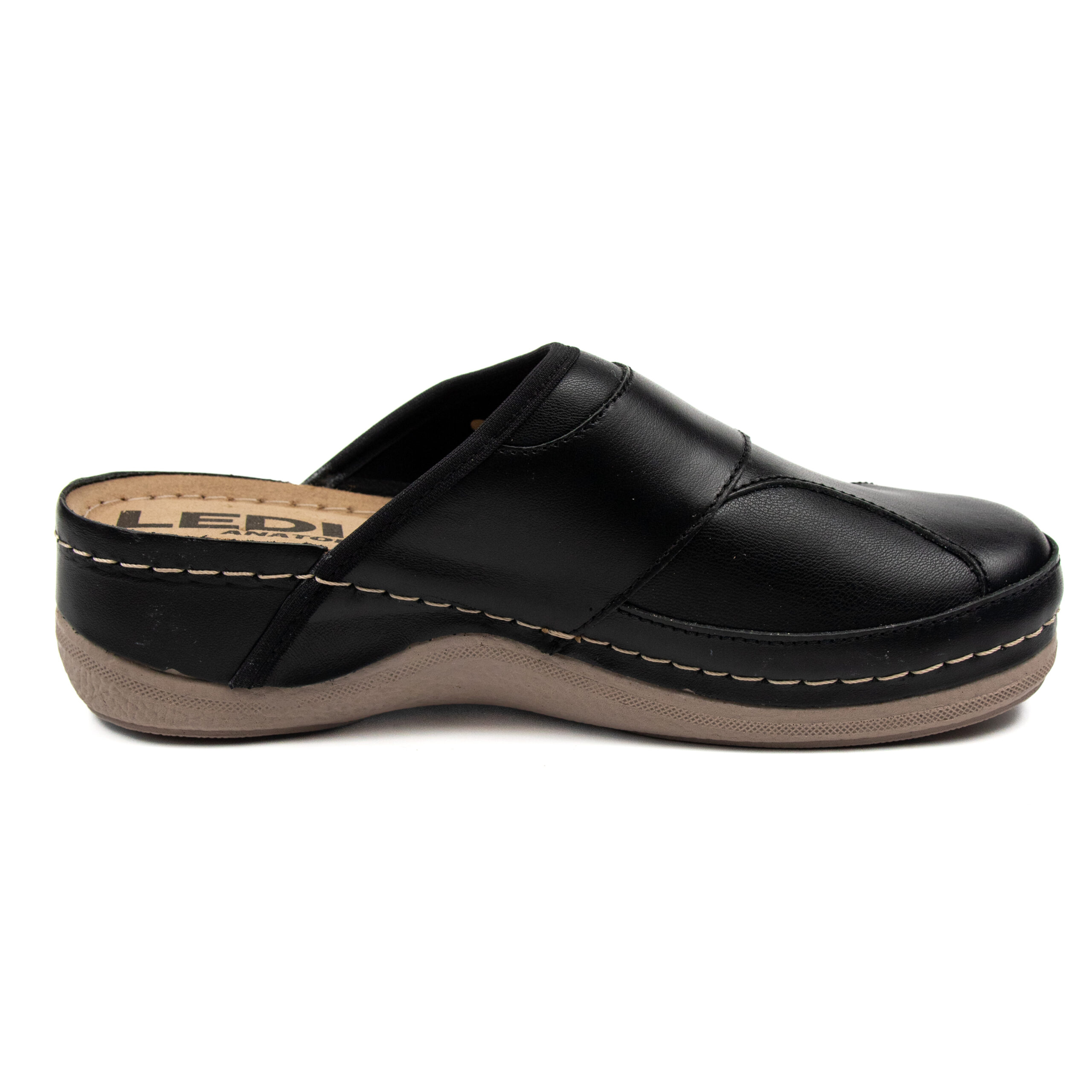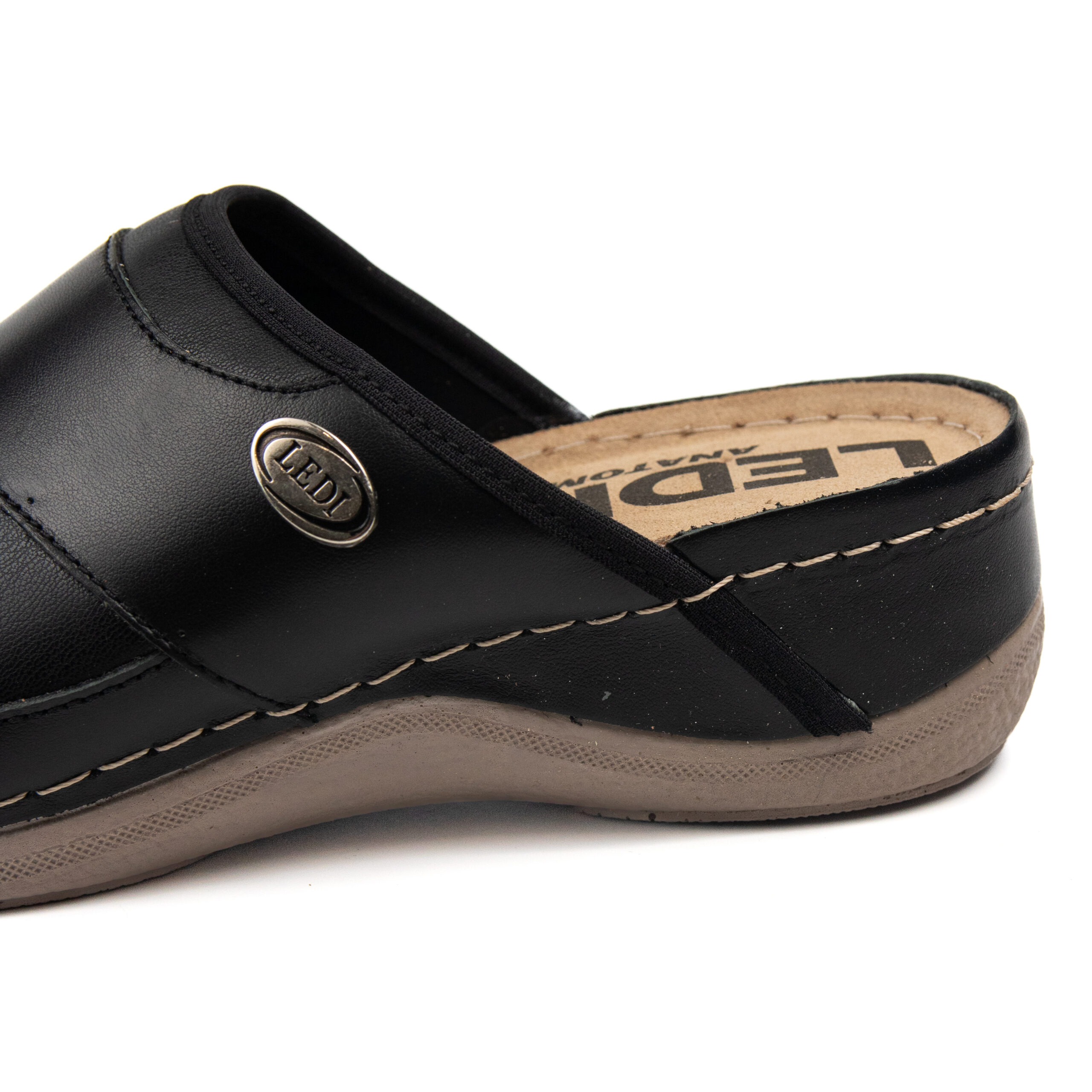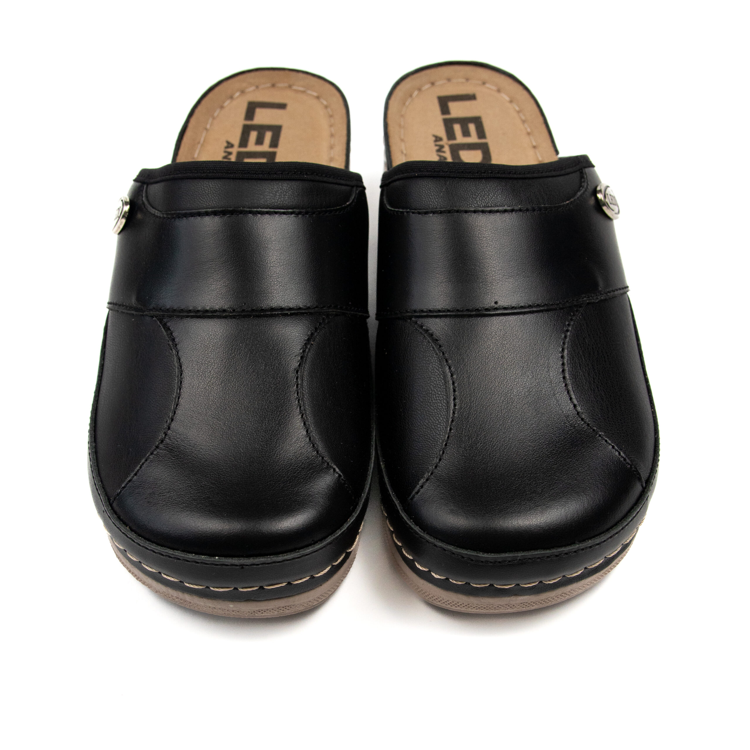 Дамско анатомично сабо, естествена кожа в комбинация със стреч кожа, черен цвят, табанът е средна твърдост - SOFT, на олекотено полиуретаново ходилo с височина 5см. и вградена AntiShock вложка в петъчната част.