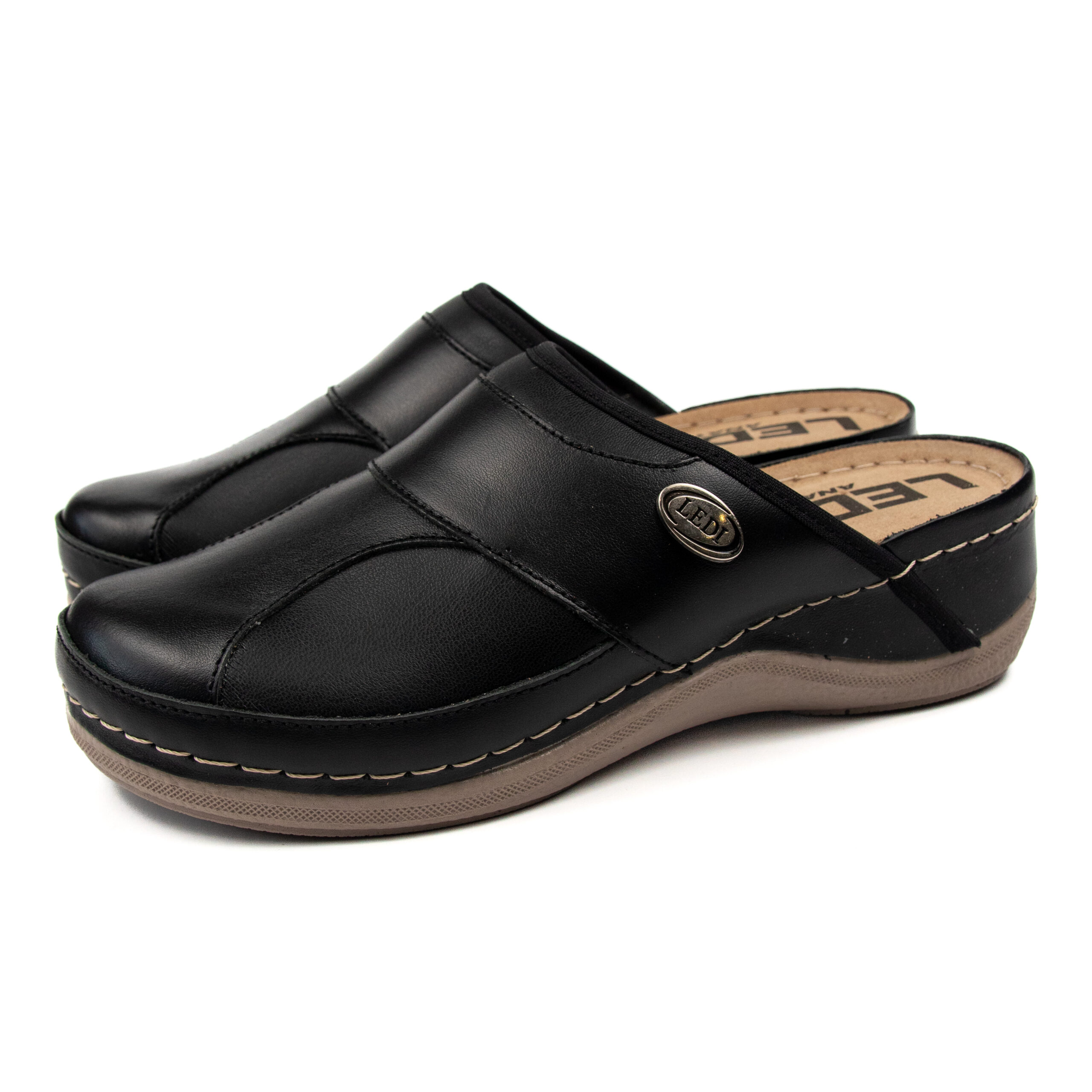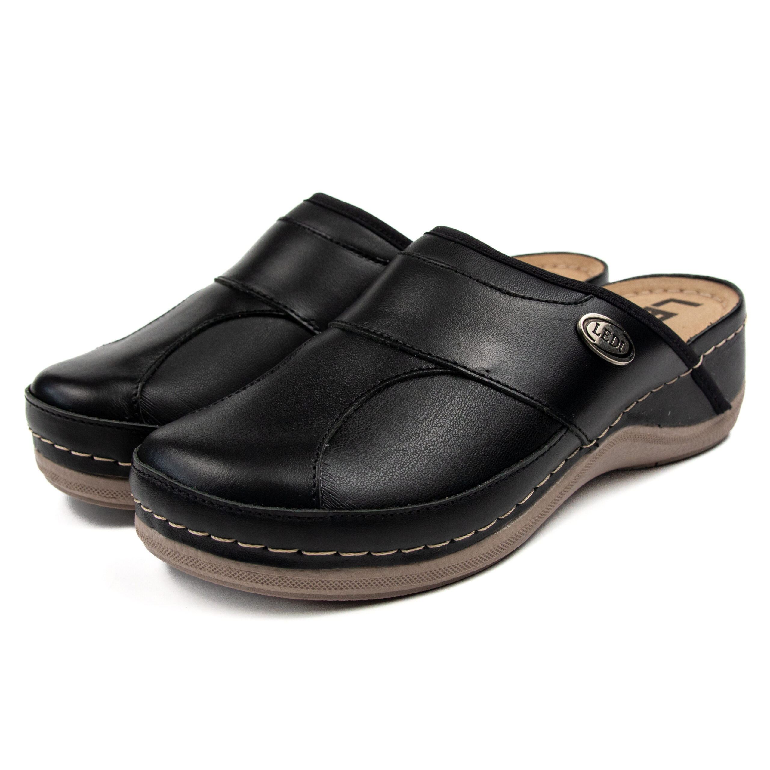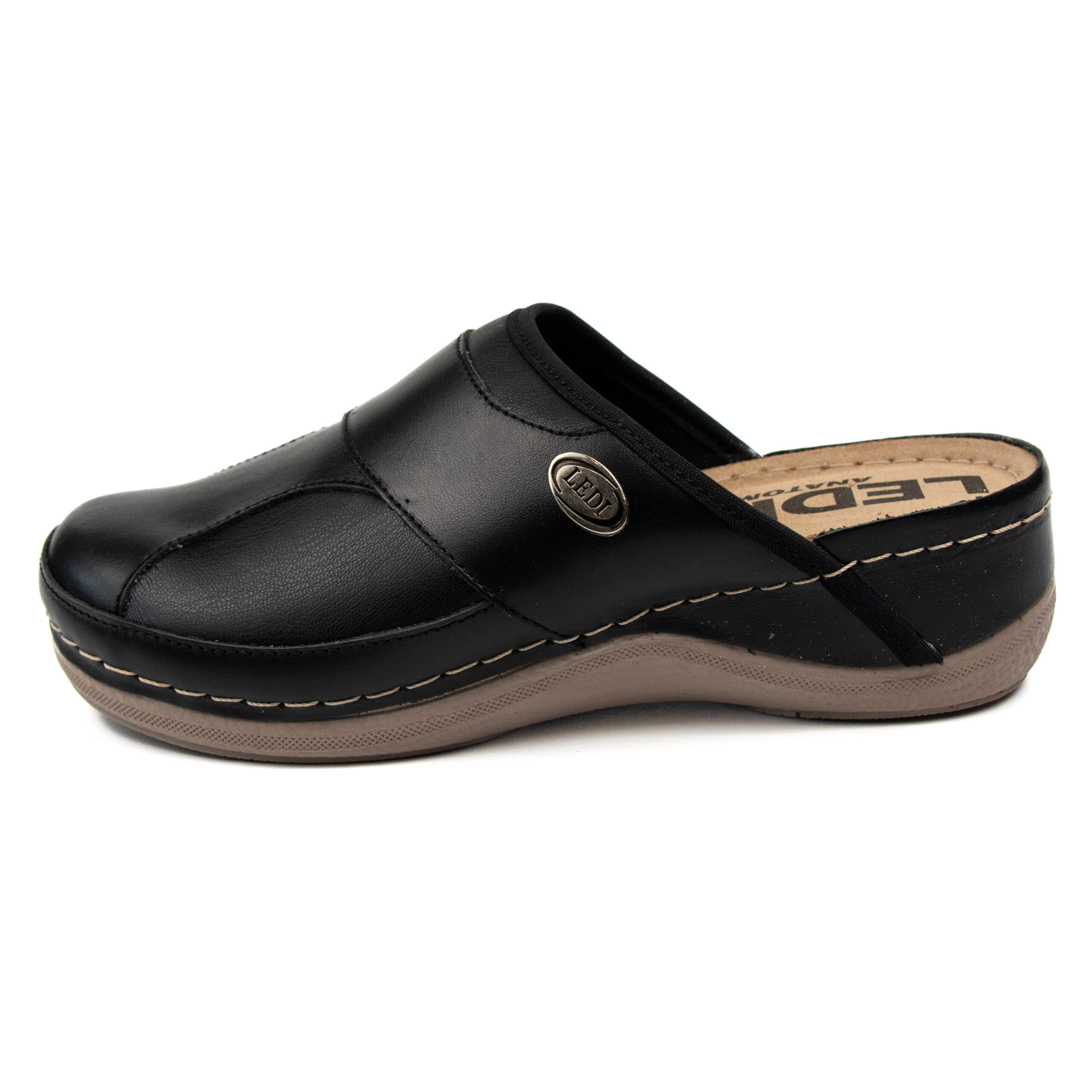 Дамско анатомично сабо, естествена кожа в комбинация със стреч кожа, черен цвят, табанът е средна твърдост - SOFT, на олекотено полиуретаново ходилo с височина 5см. и вградена AntiShock вложка в петъчната част.