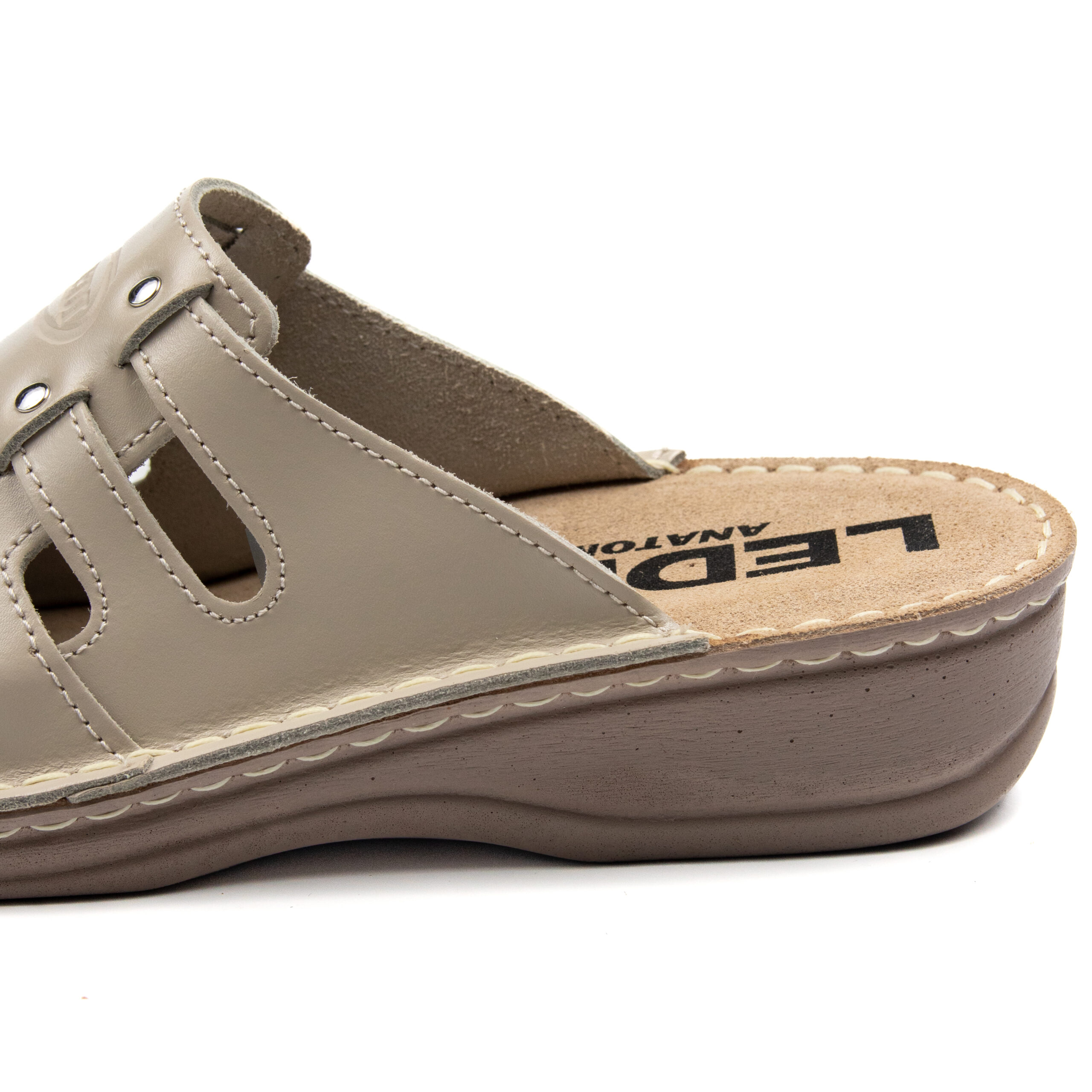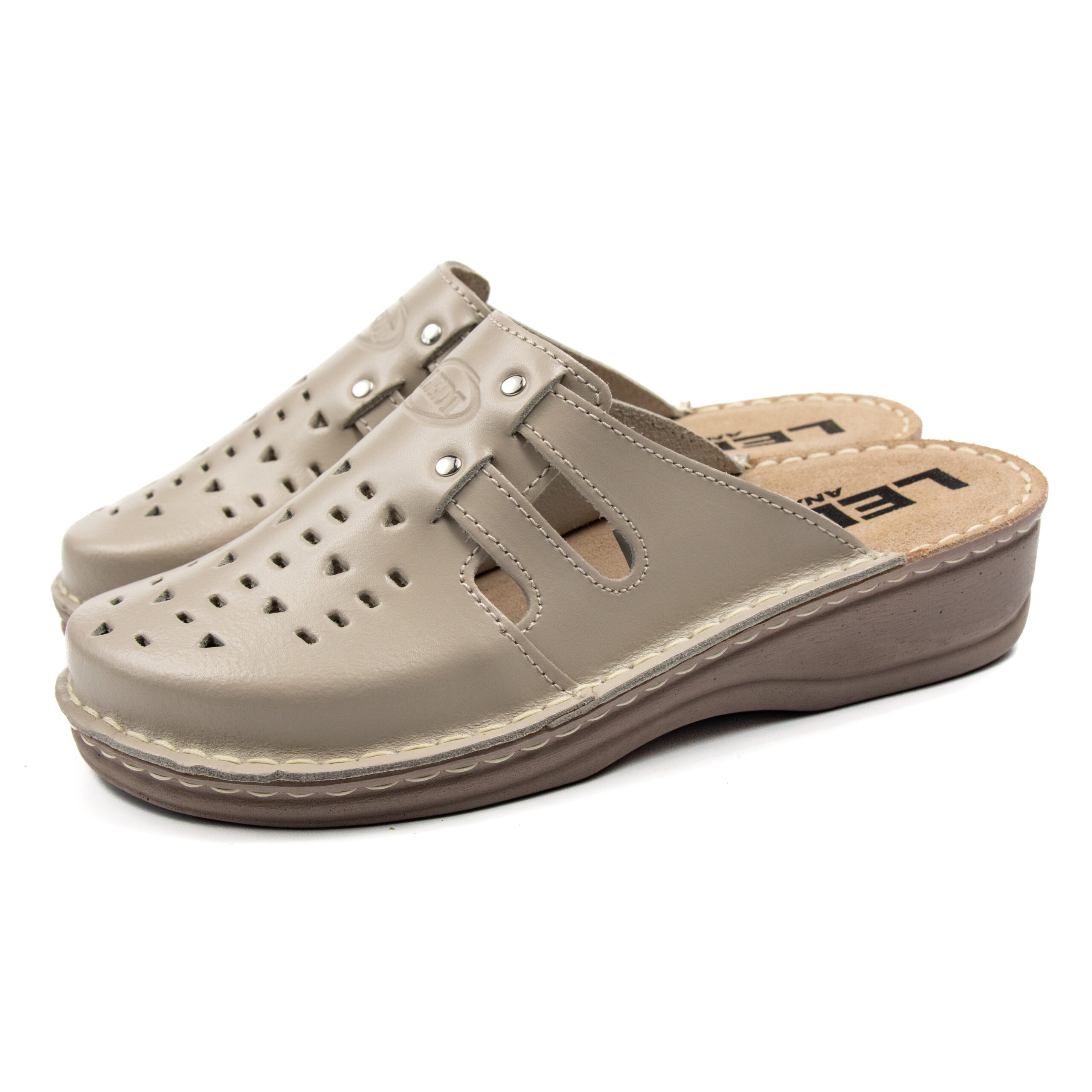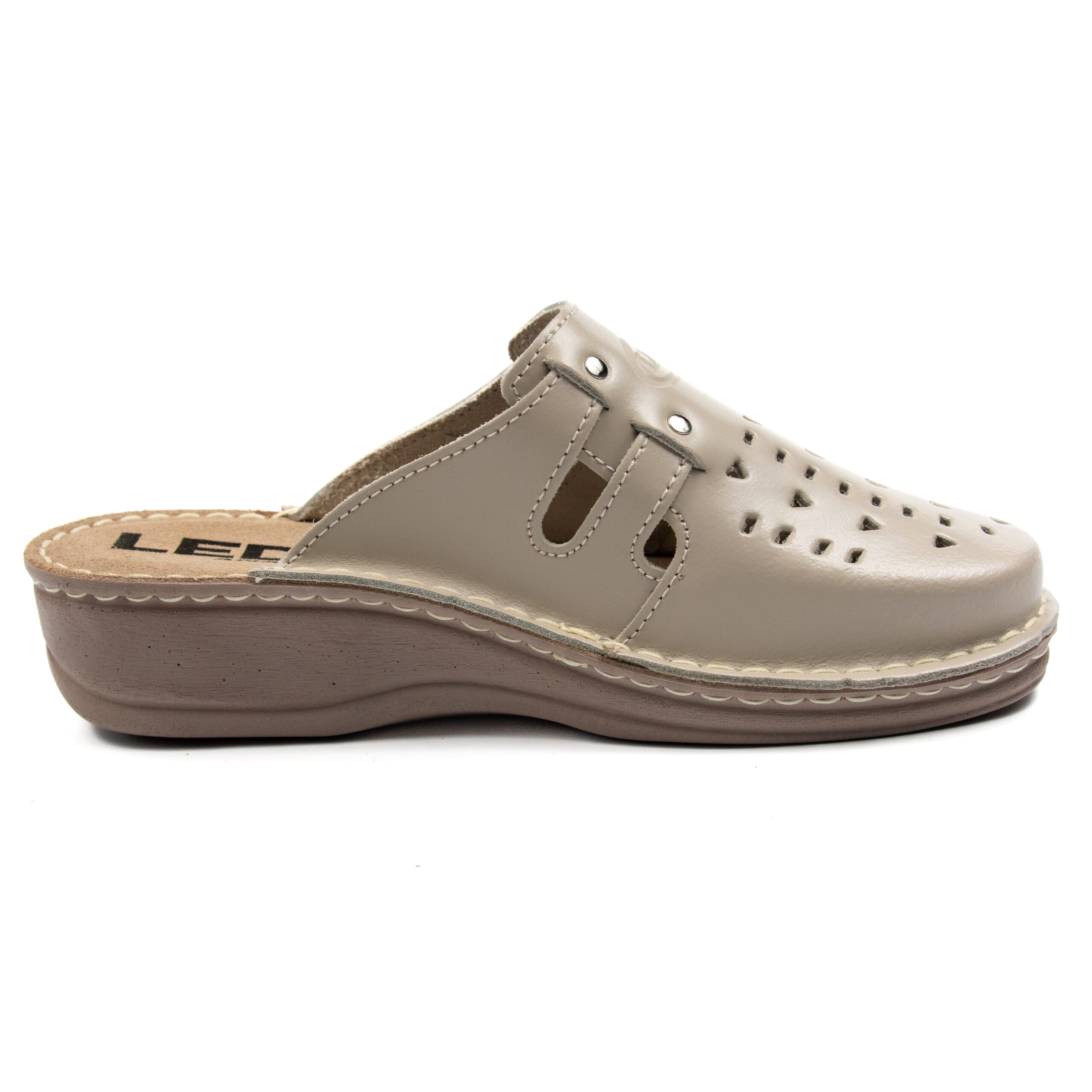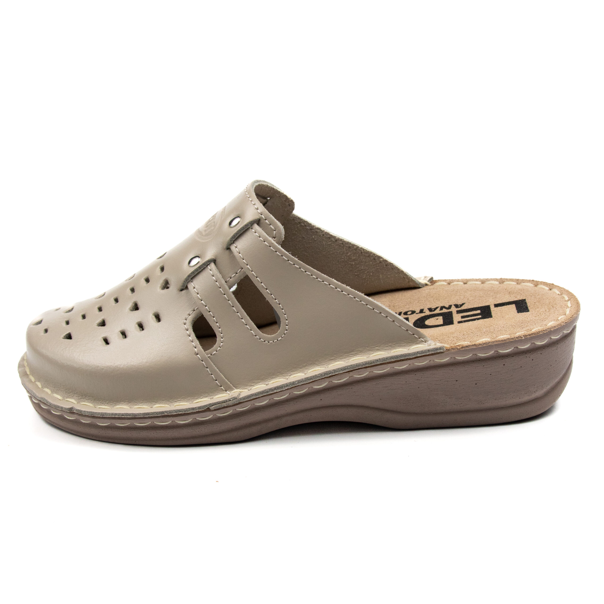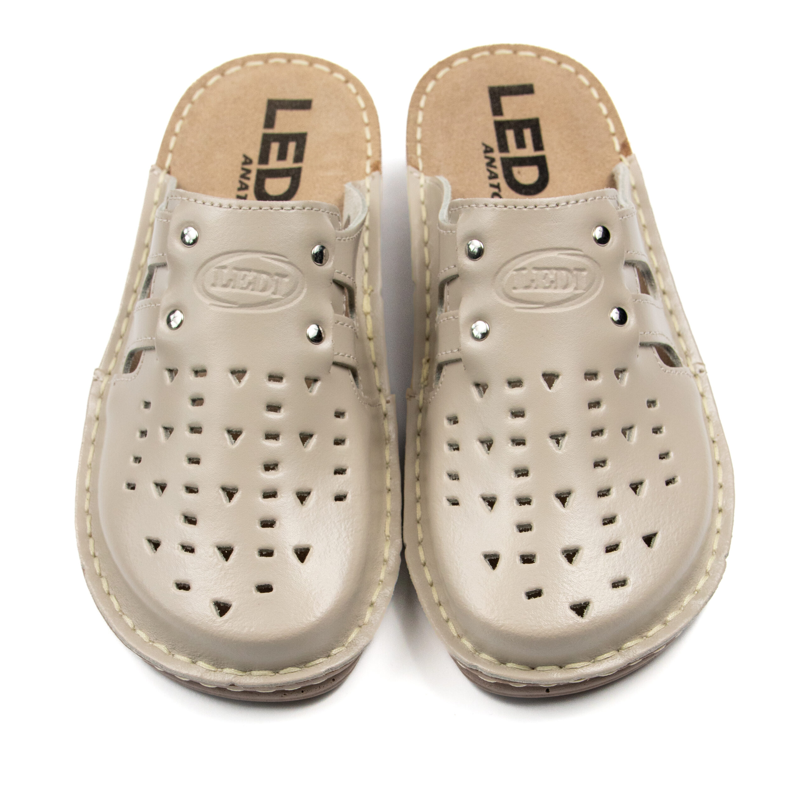 Дамско анатомично сабо, перфорирана естествена кожа, бежов цвят, на мек пено-латексов табан,заемащ формата на стъпалото, на олекотено полиуретаново ходилo с височина 3см.