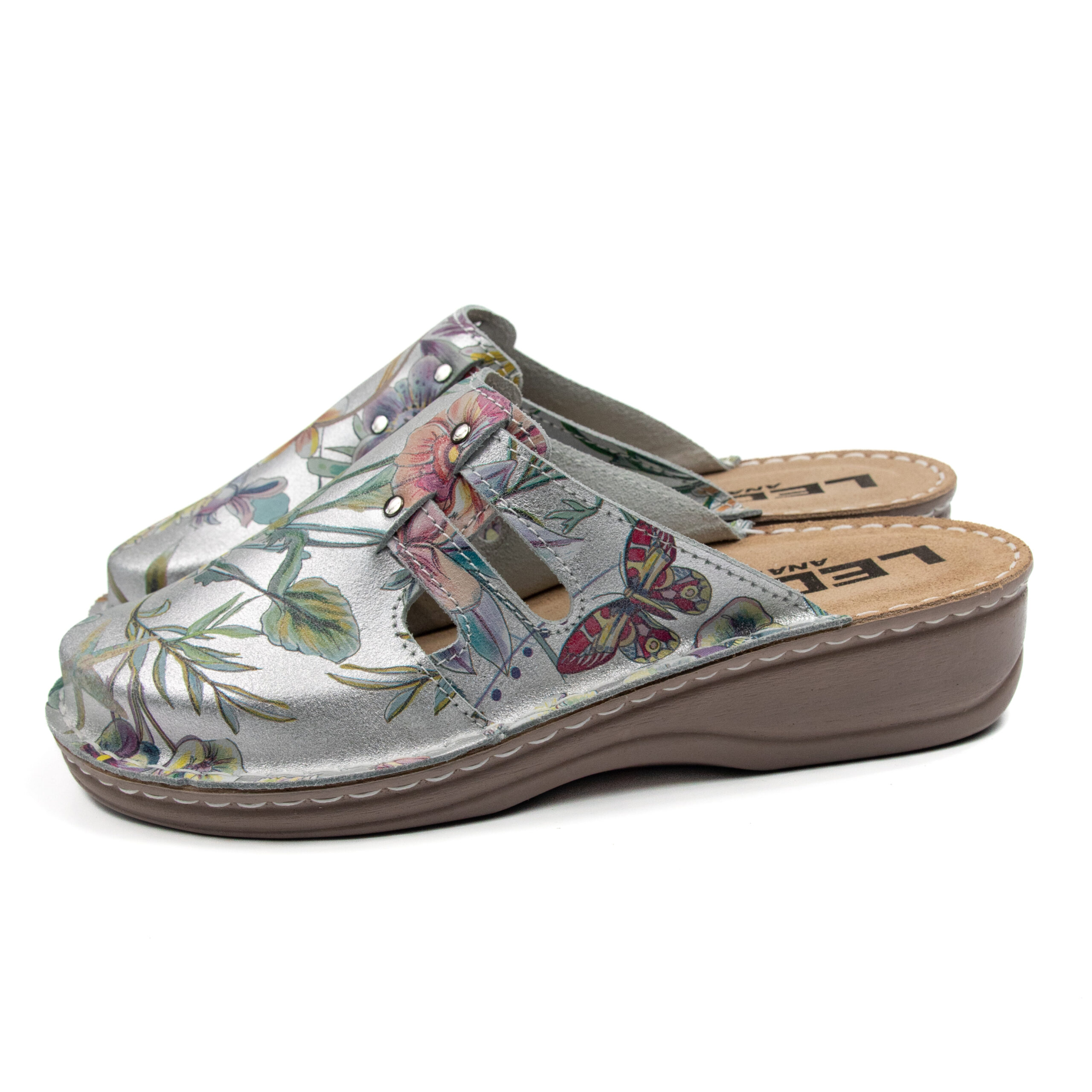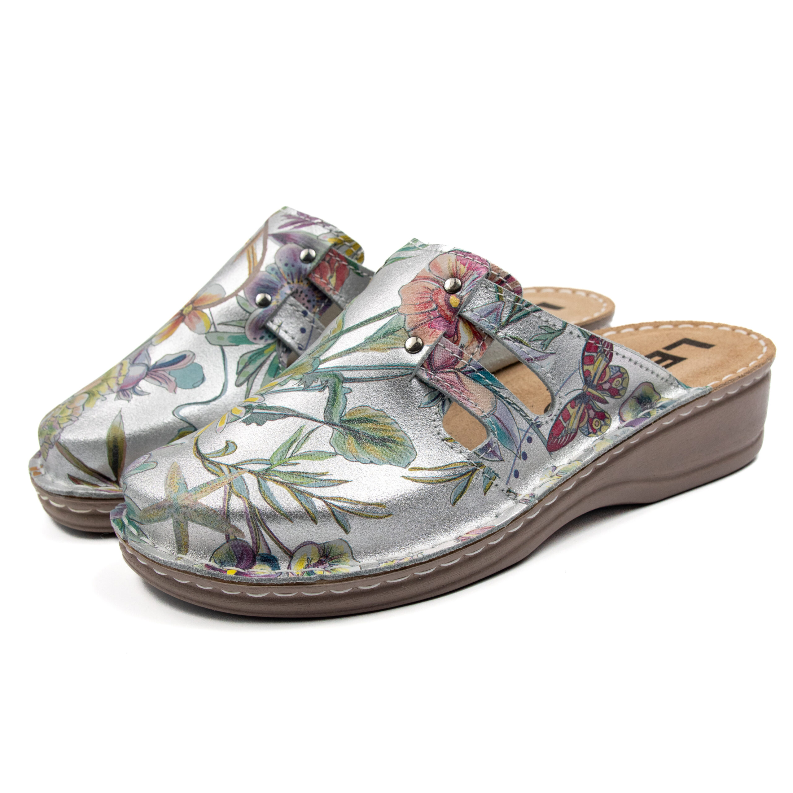 Цветно и елегантно дамско анатомично сабо от естествена кожа с ефектен флорален принт. Моделът съчетава комфорт и стил, подходящ за дами, които ценят удобството и оригиналната визия. Перфорациите и отворените страни осигуряват отлична вентилация, а меката кожена стелка гарантира комфорт през целия ден.