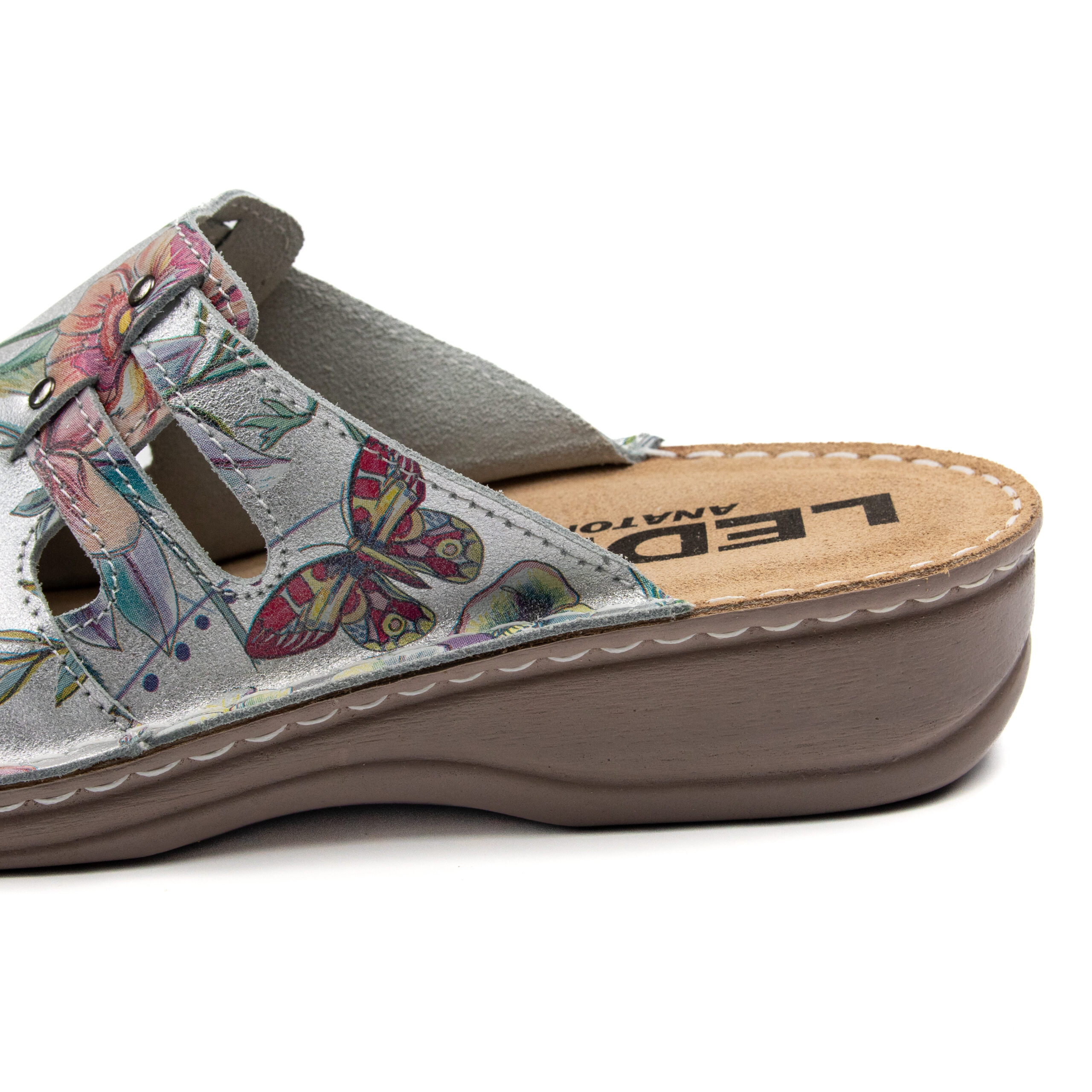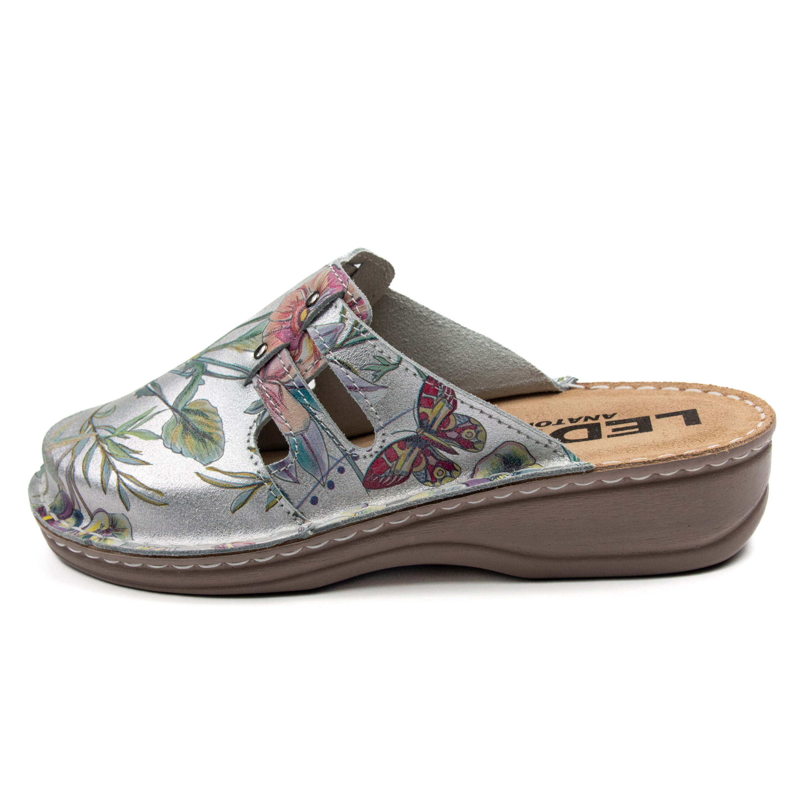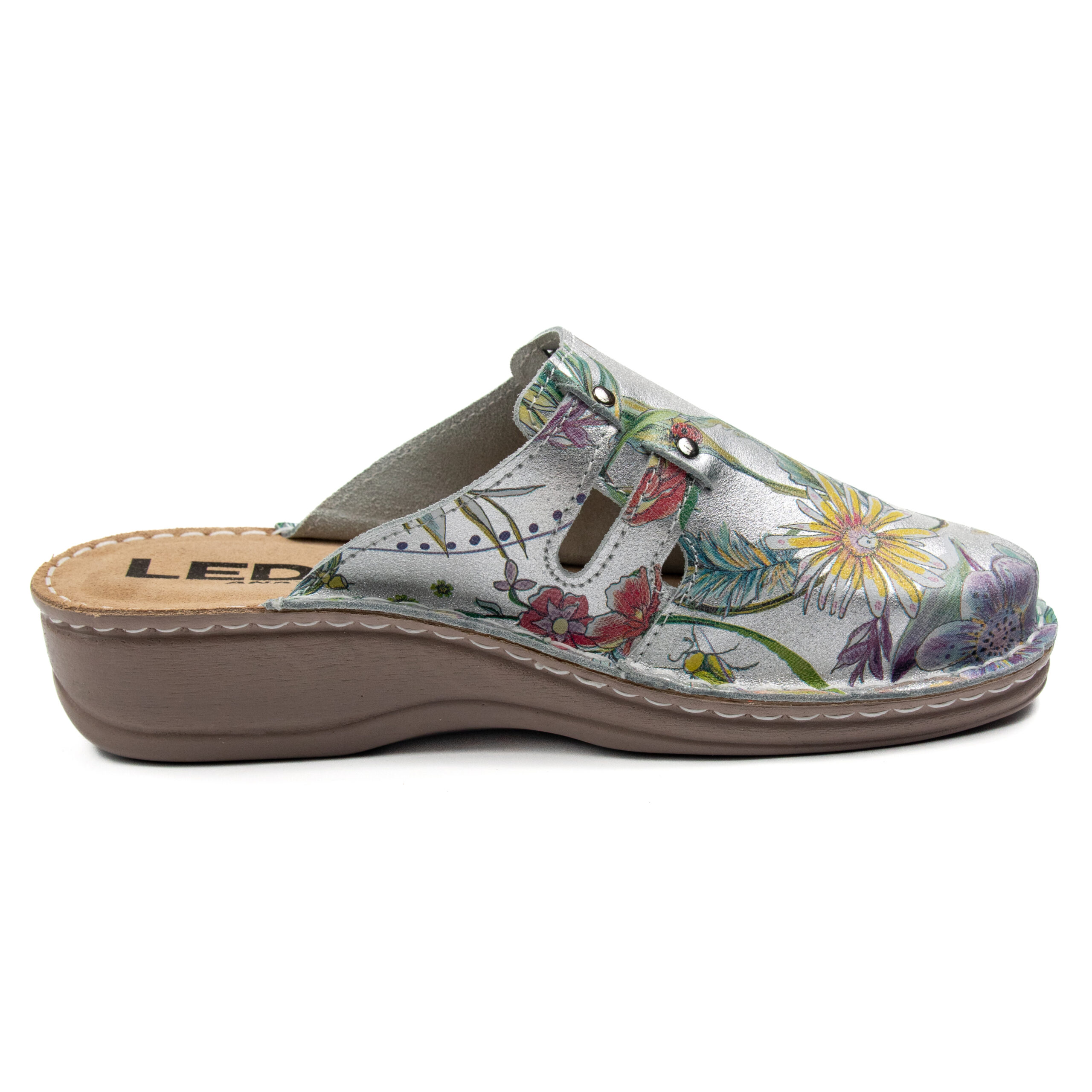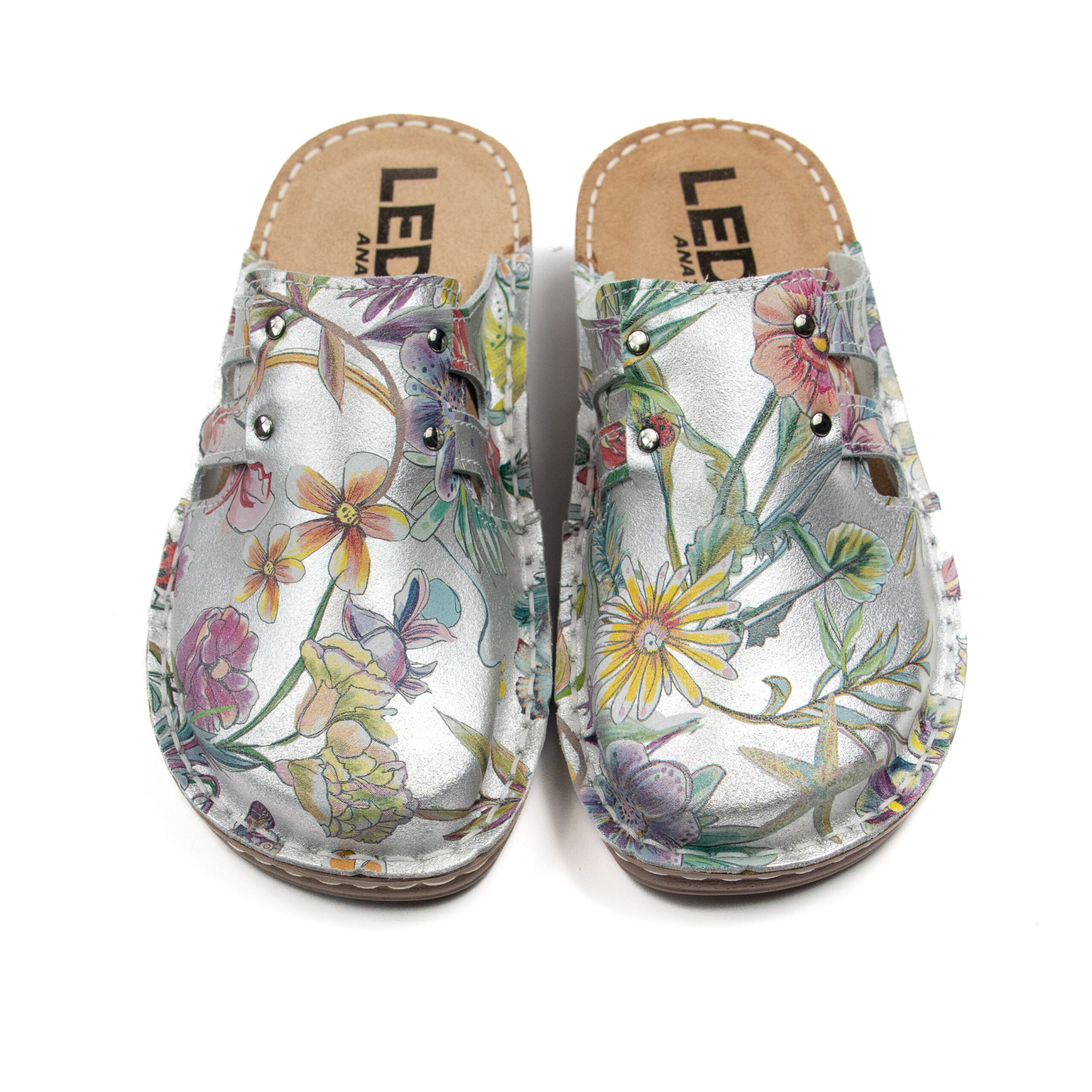 Дамско анатомично сабо, естествена кожа, цвят "мотив-цветя", на мек пено-латексов табан,заемащ формата на стъпалото, на олекотено полиуретаново ходилo с височина 3см.