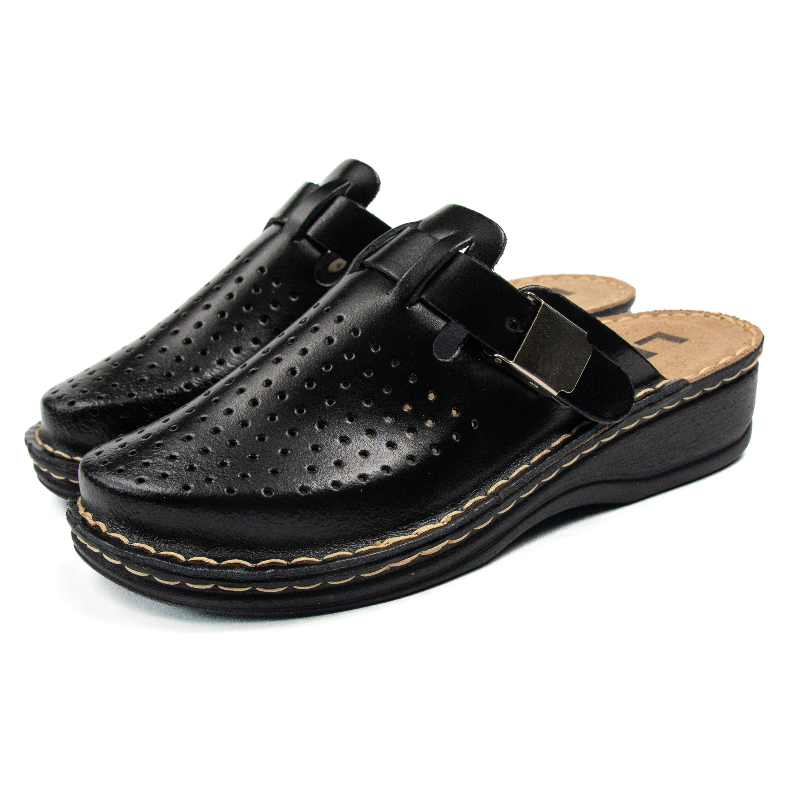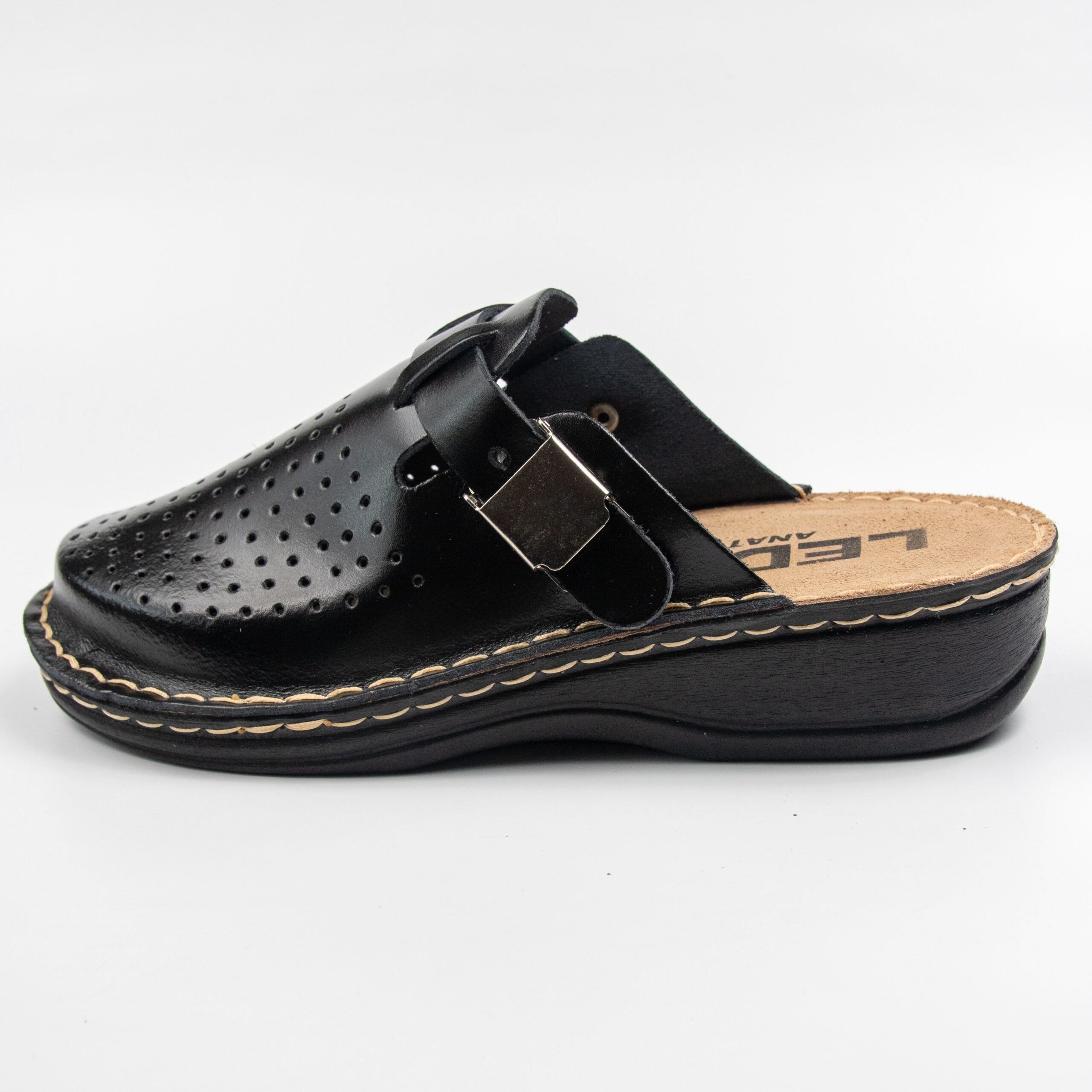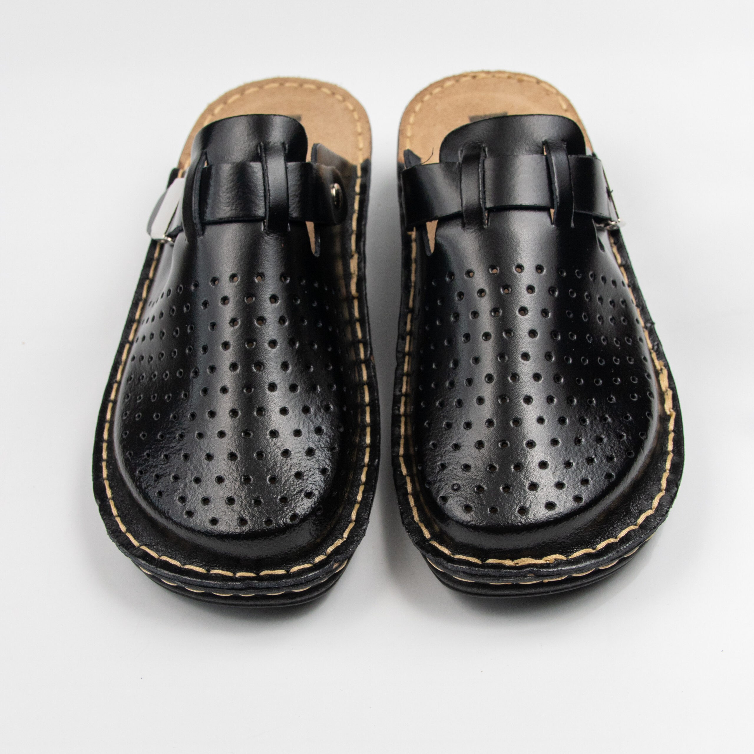 Дамско анатомично сабо, перфорирана естествена кожа, черен цвят, на мек пено-латексов табан,заемащ формата на стъпалото, на олекотено полиуретаново ходилo с височина 3см.