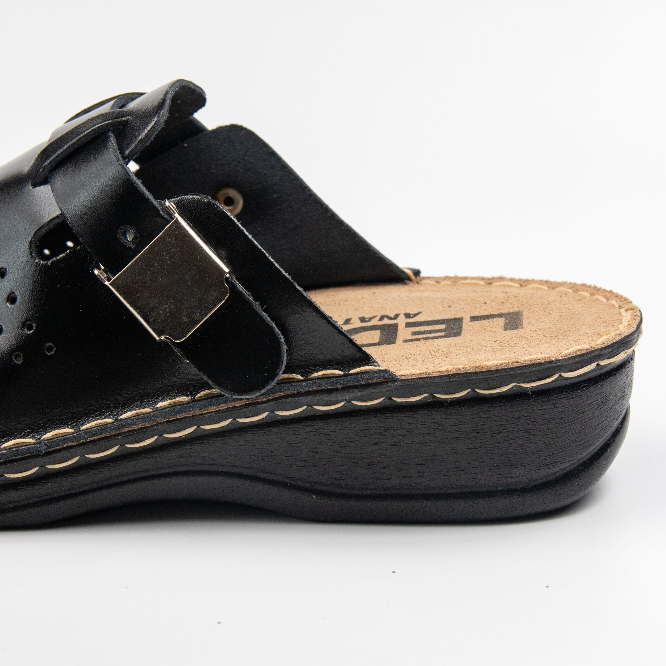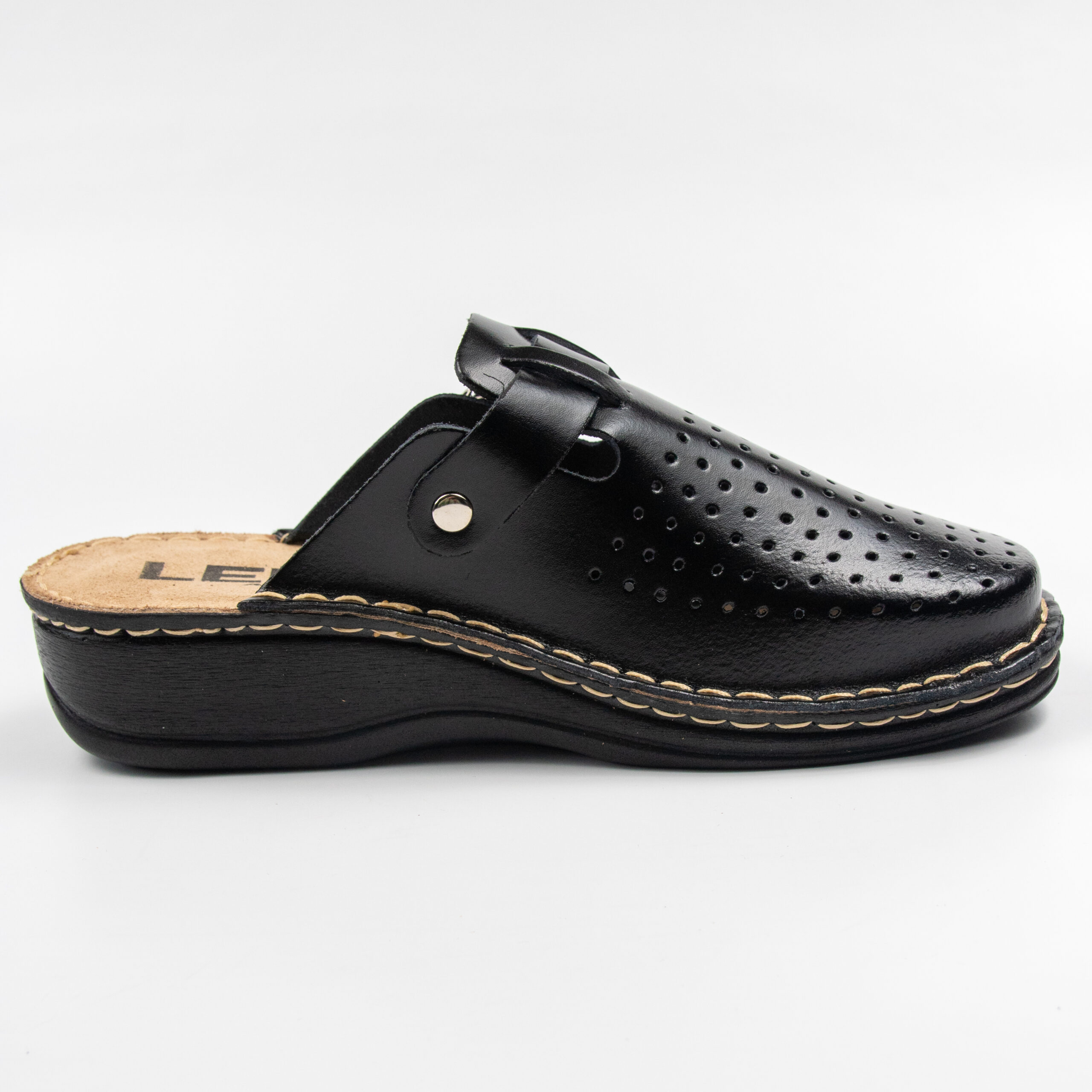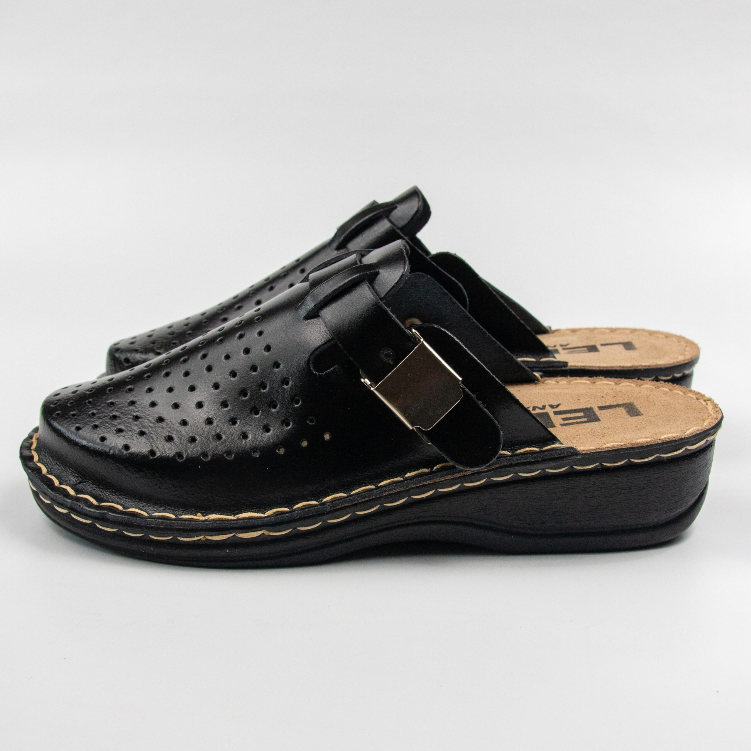 Дамско анатомично сабо, перфорирана естествена кожа, черен цвят, на мек пено-латексов табан,заемащ формата на стъпалото, на олекотено полиуретаново ходилo с височина 3см.
