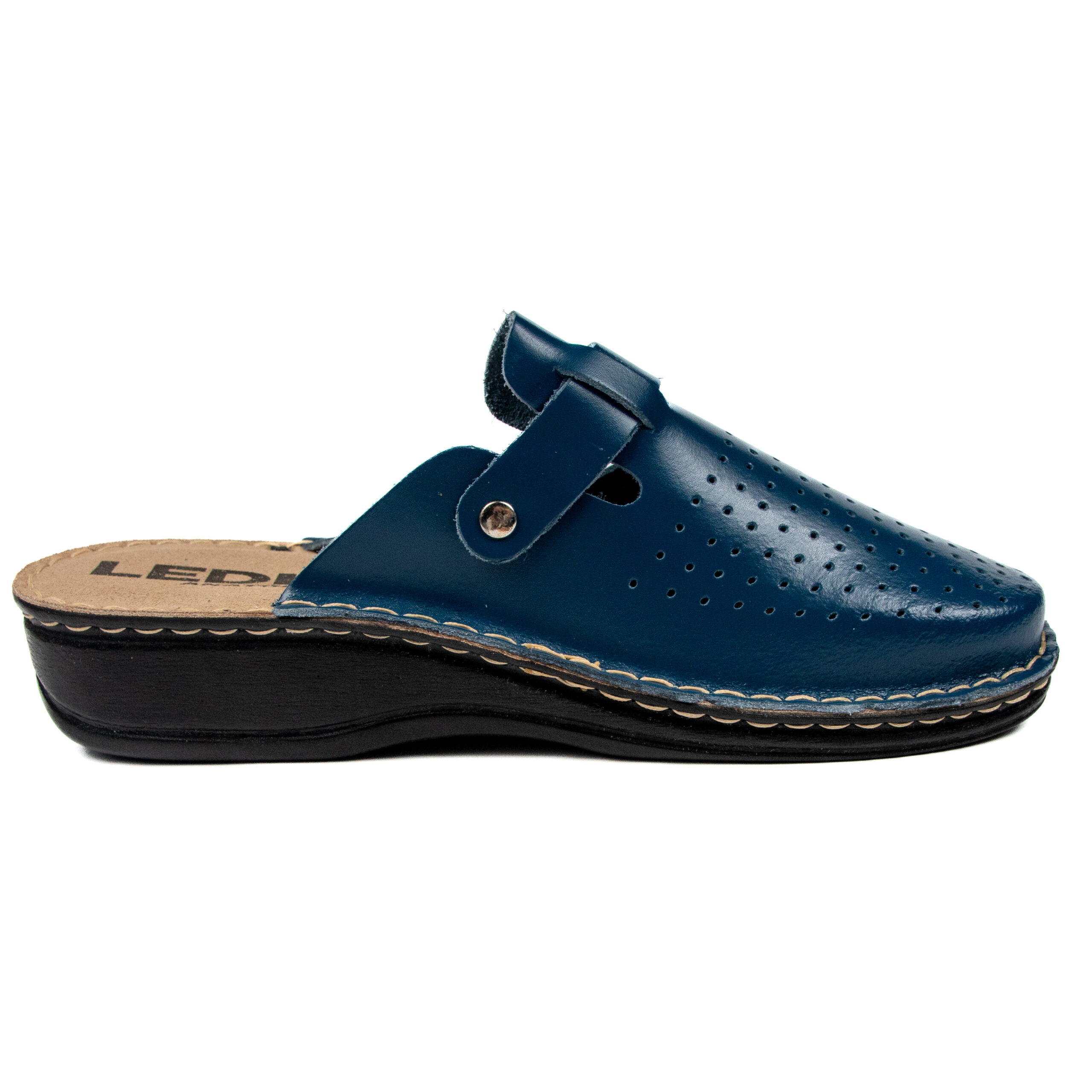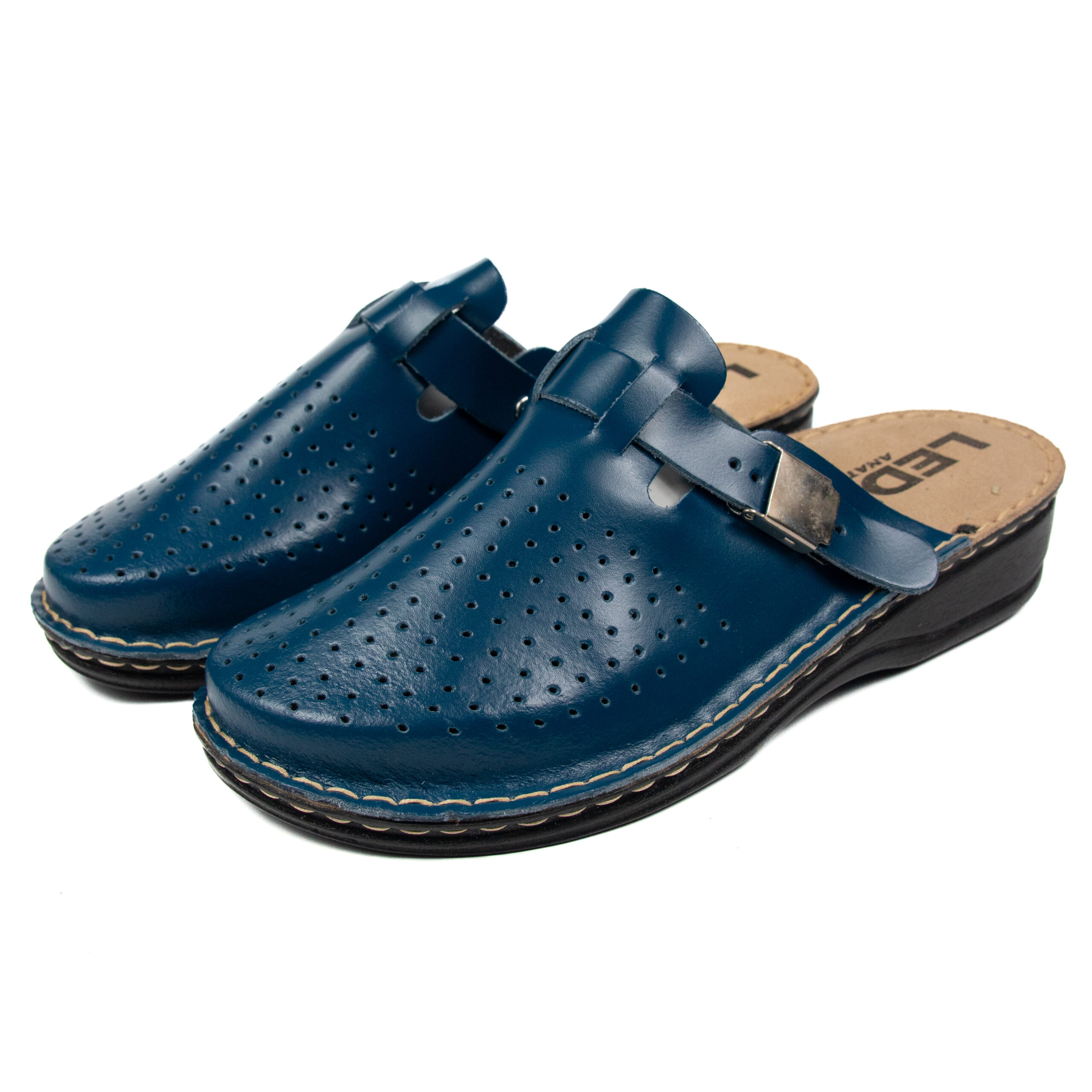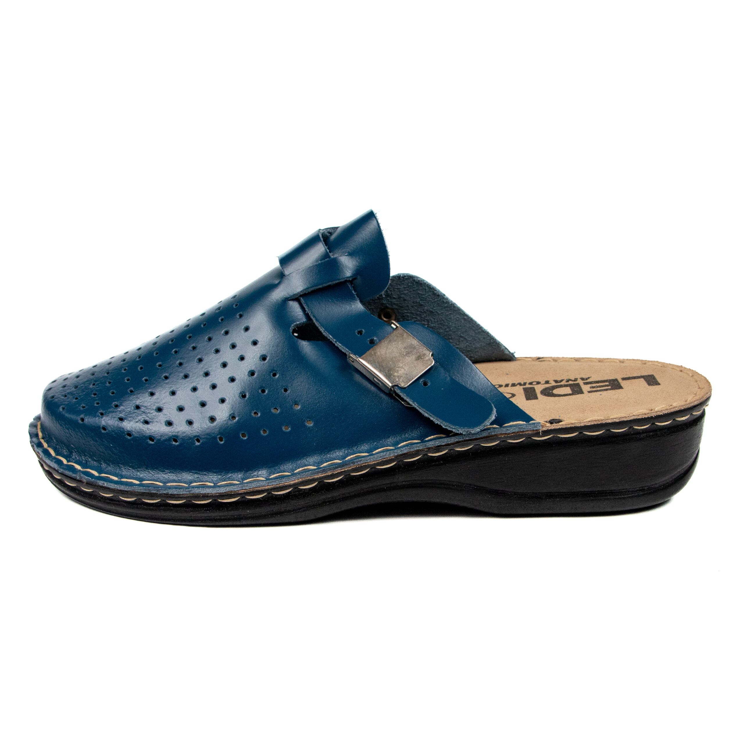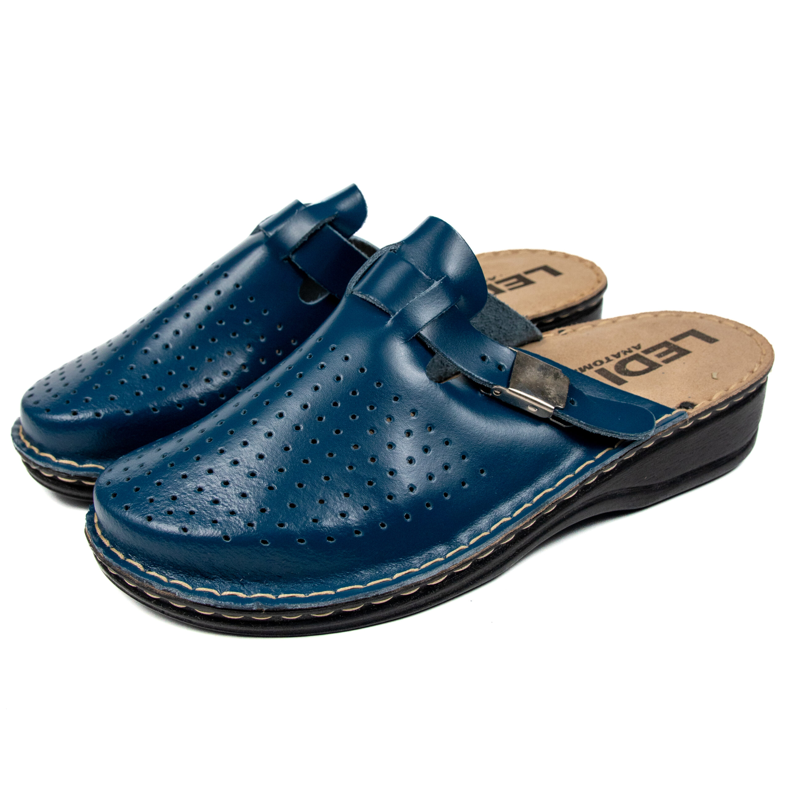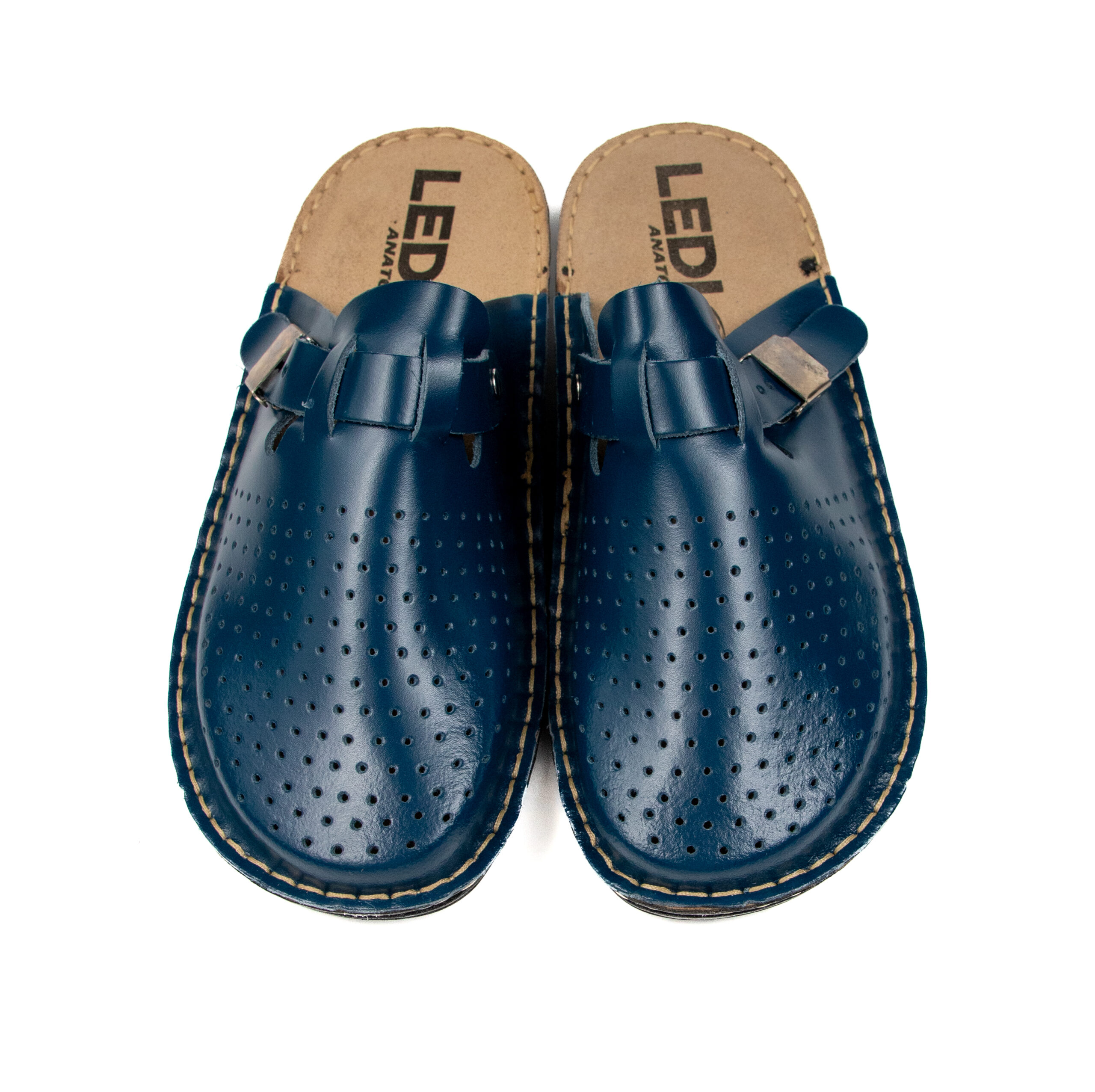 Мъжко анатомично сабо, естествена кожа, син цвят, на мек пено-латексов табан,заемащ формата на стъпалото, на олекотено полиуретаново ходилo с височина 3.5см.