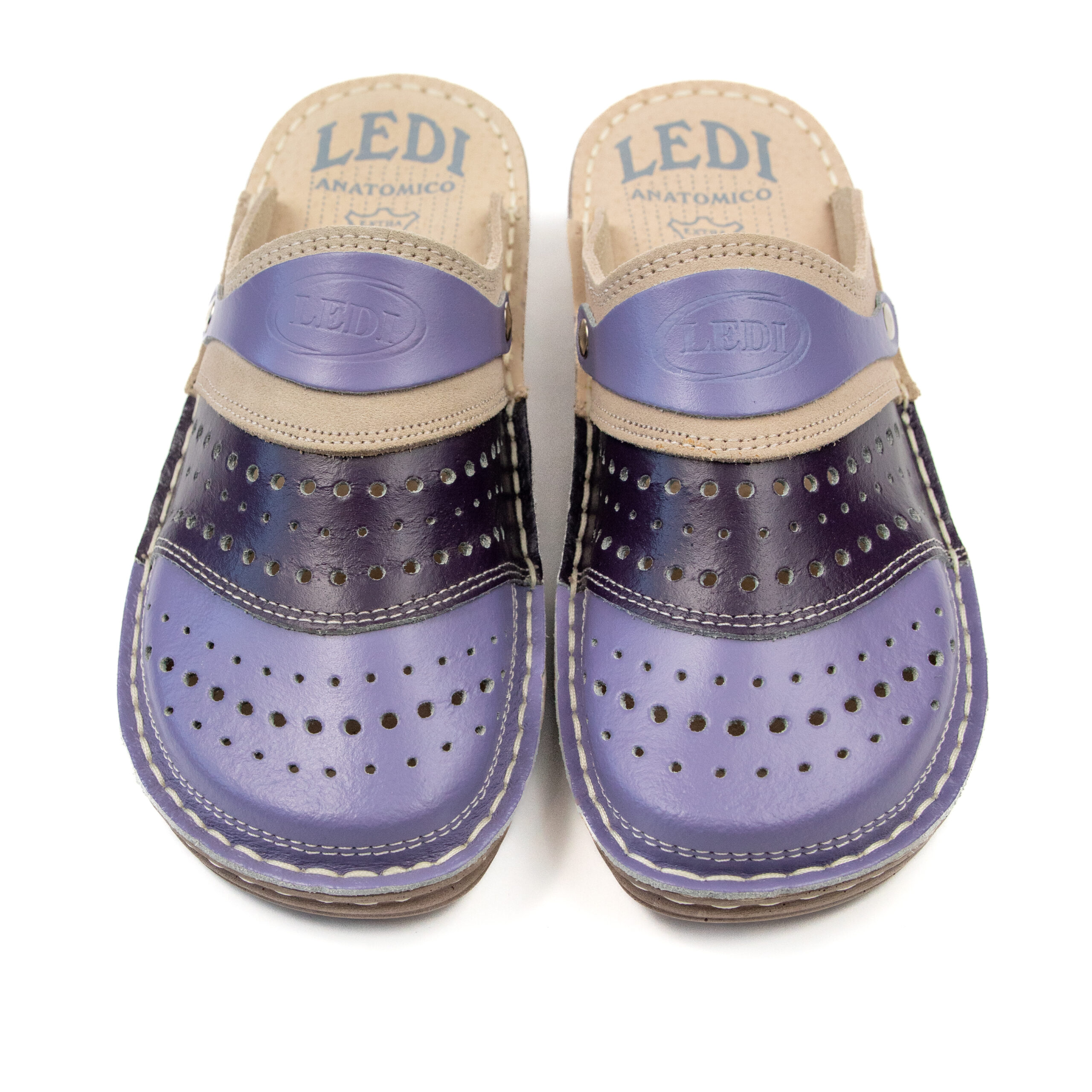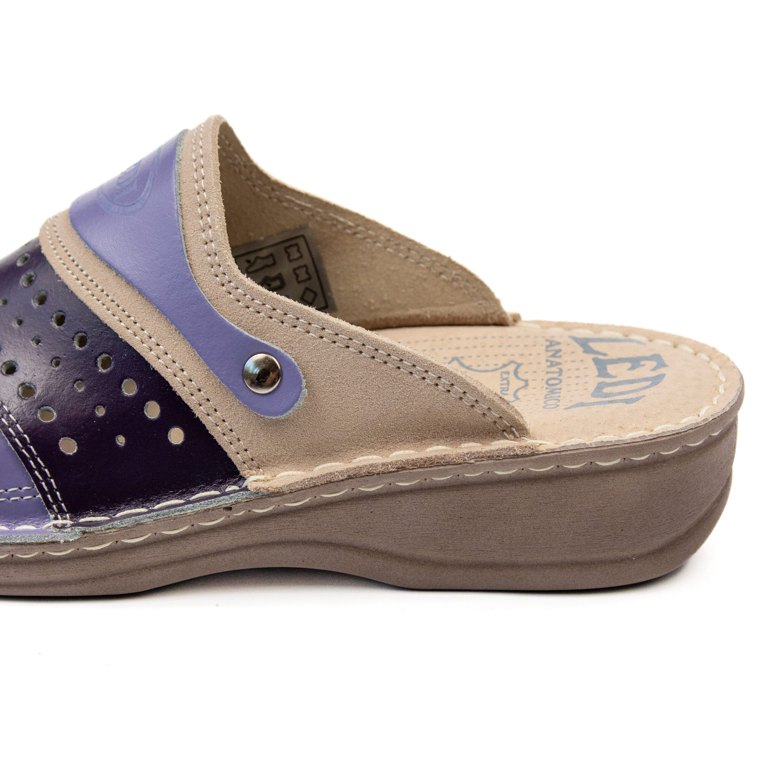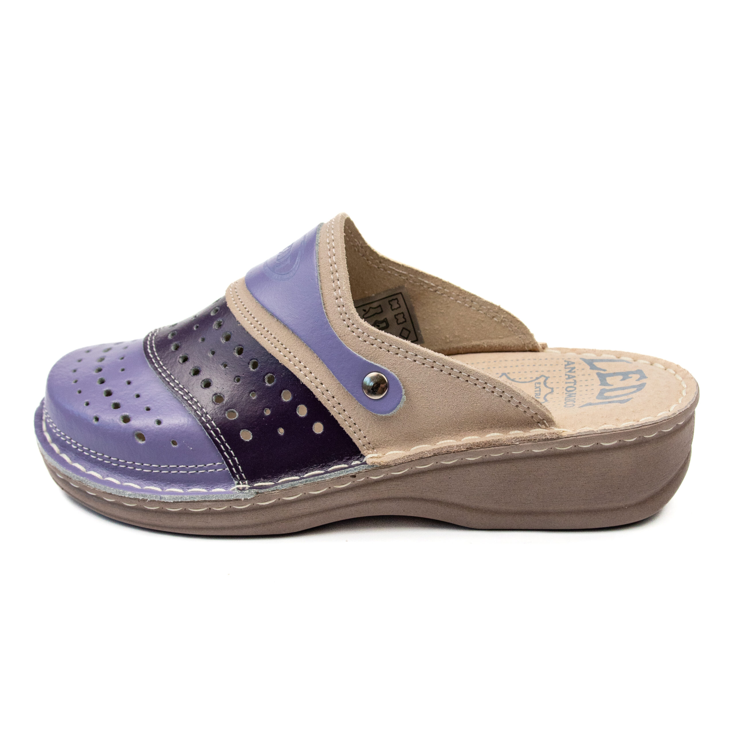 Дамско анатомично сабо, естествена кожа, нежна комбинация от светло лилаво, тъмно лилава кожа и бежов велур, на мек пено-латексов табан,заемащ формата на стъпалото, на олекотено полиуретаново ходилo с височина 3см.