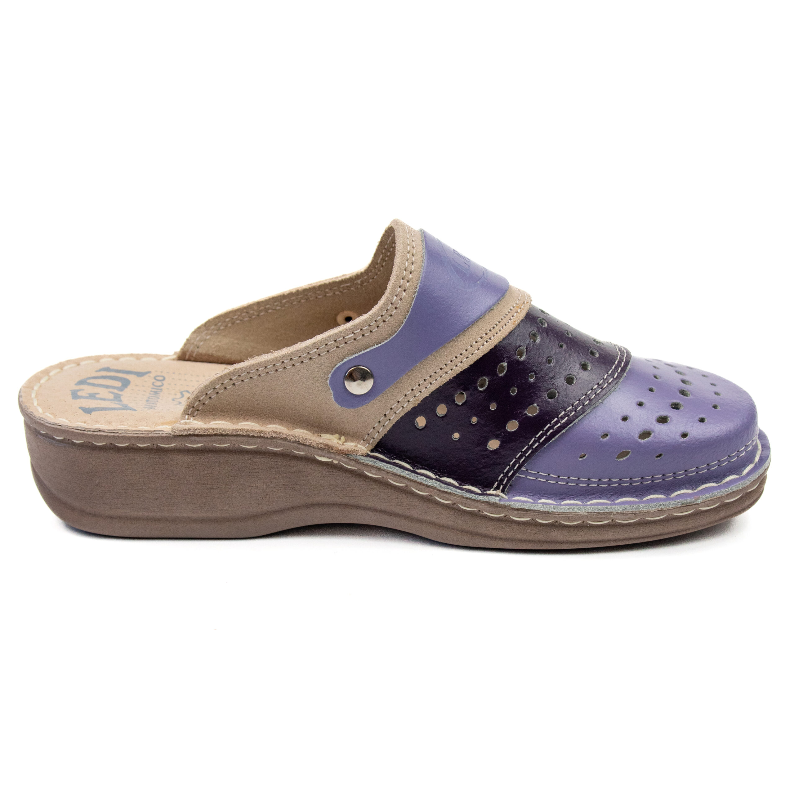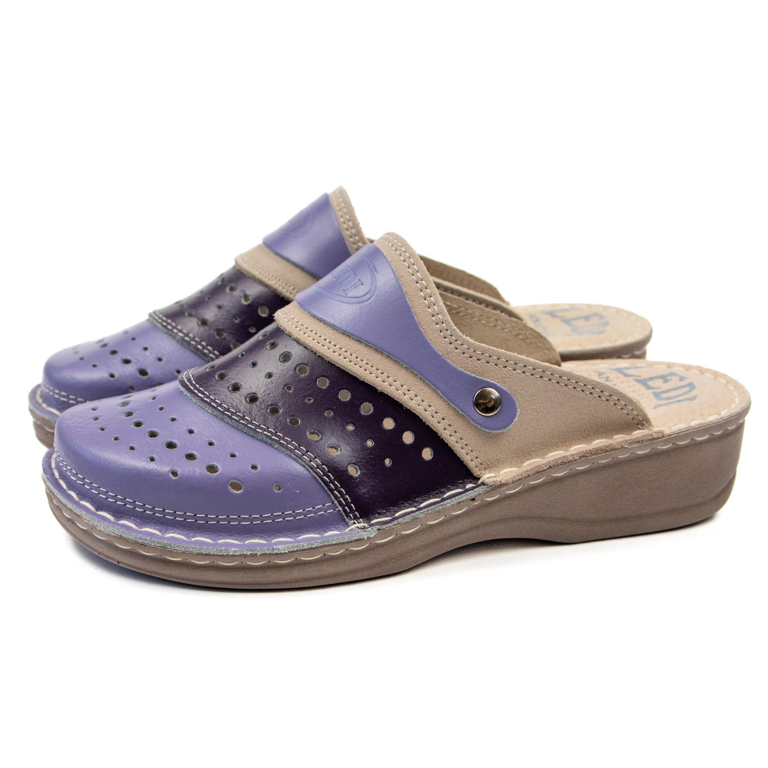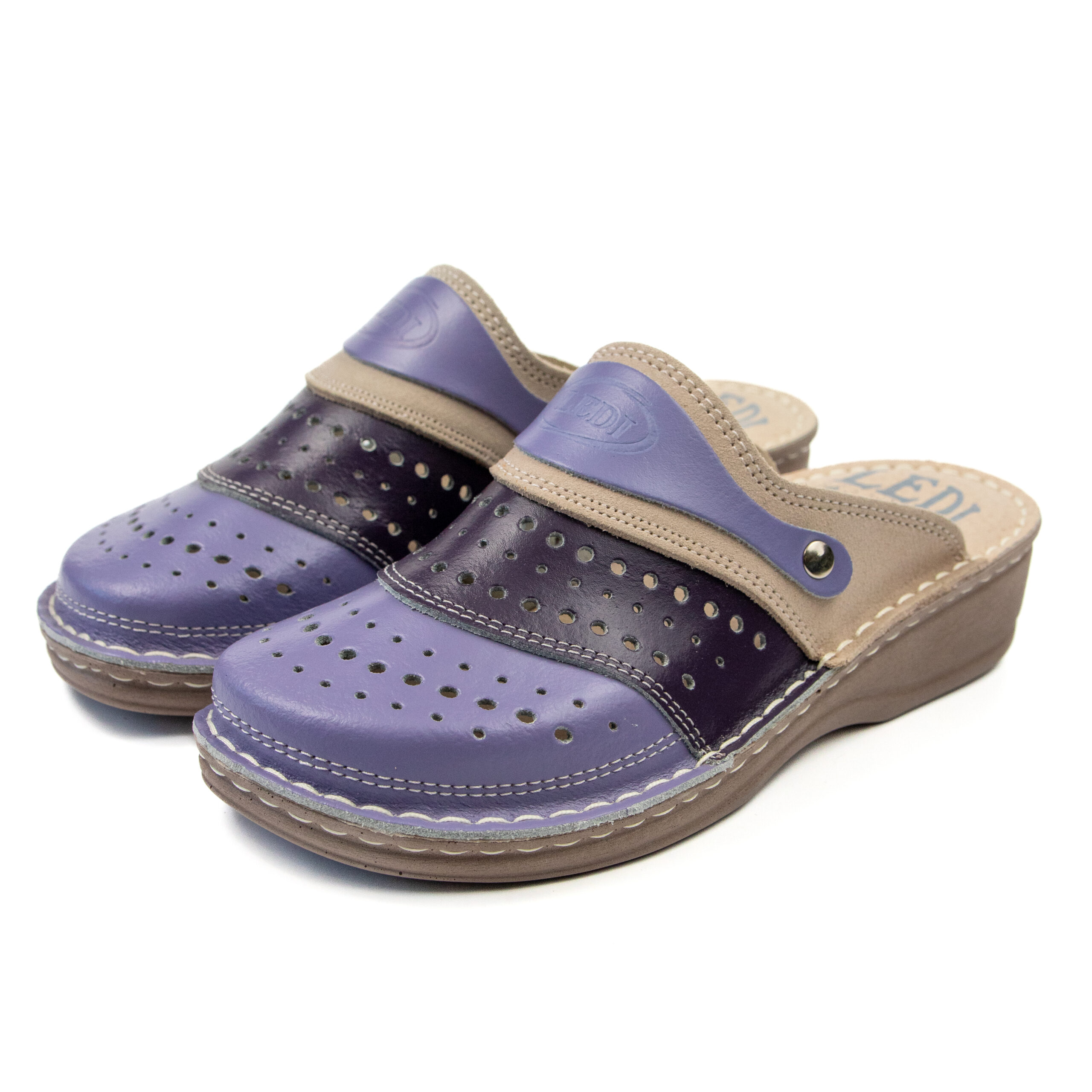 Дамско анатомично сабо, естествена кожа, нежна комбинация от светло лилаво, тъмно лилава кожа и бежов велур, на мек пено-латексов табан,заемащ формата на стъпалото, на олекотено полиуретаново ходилo с височина 3см.