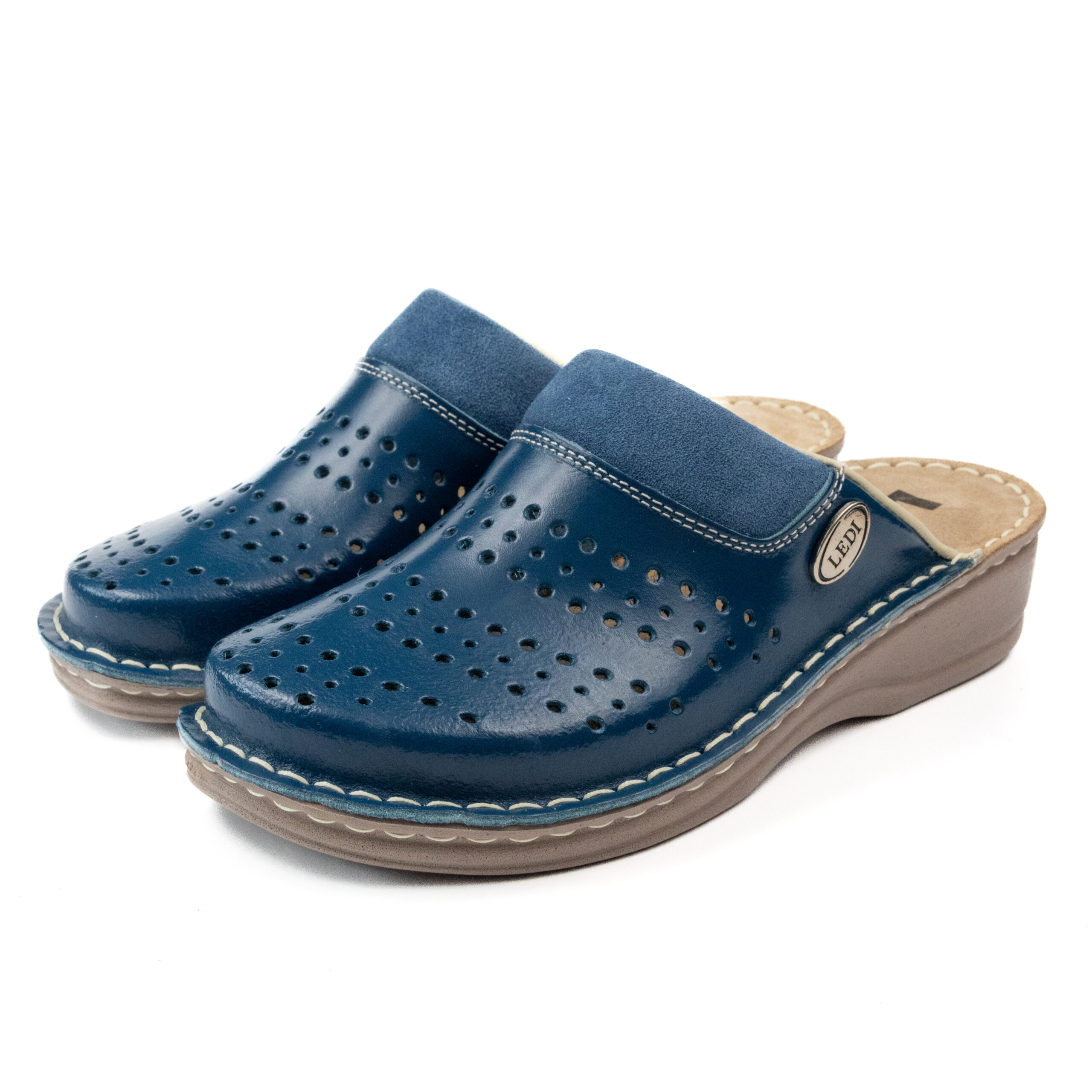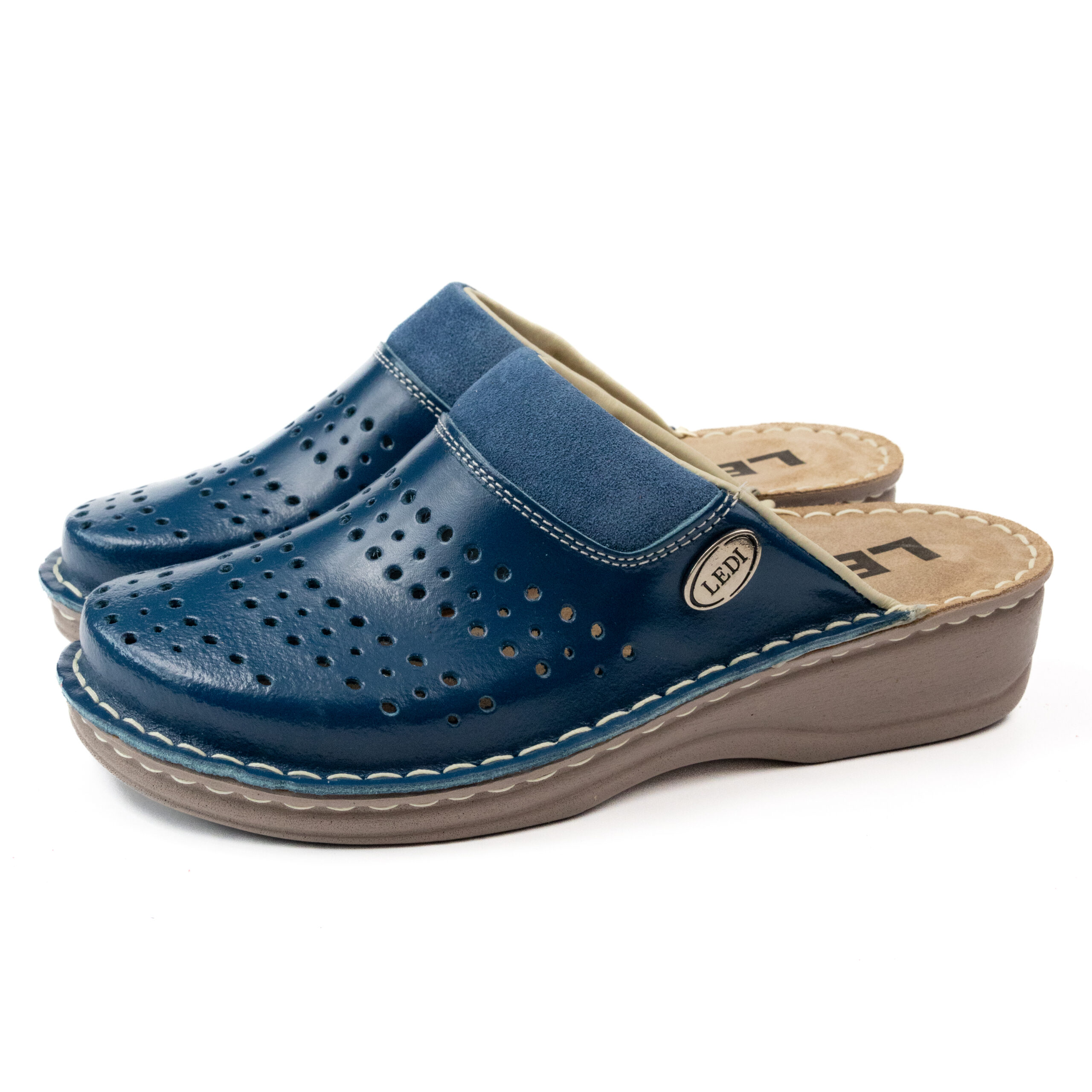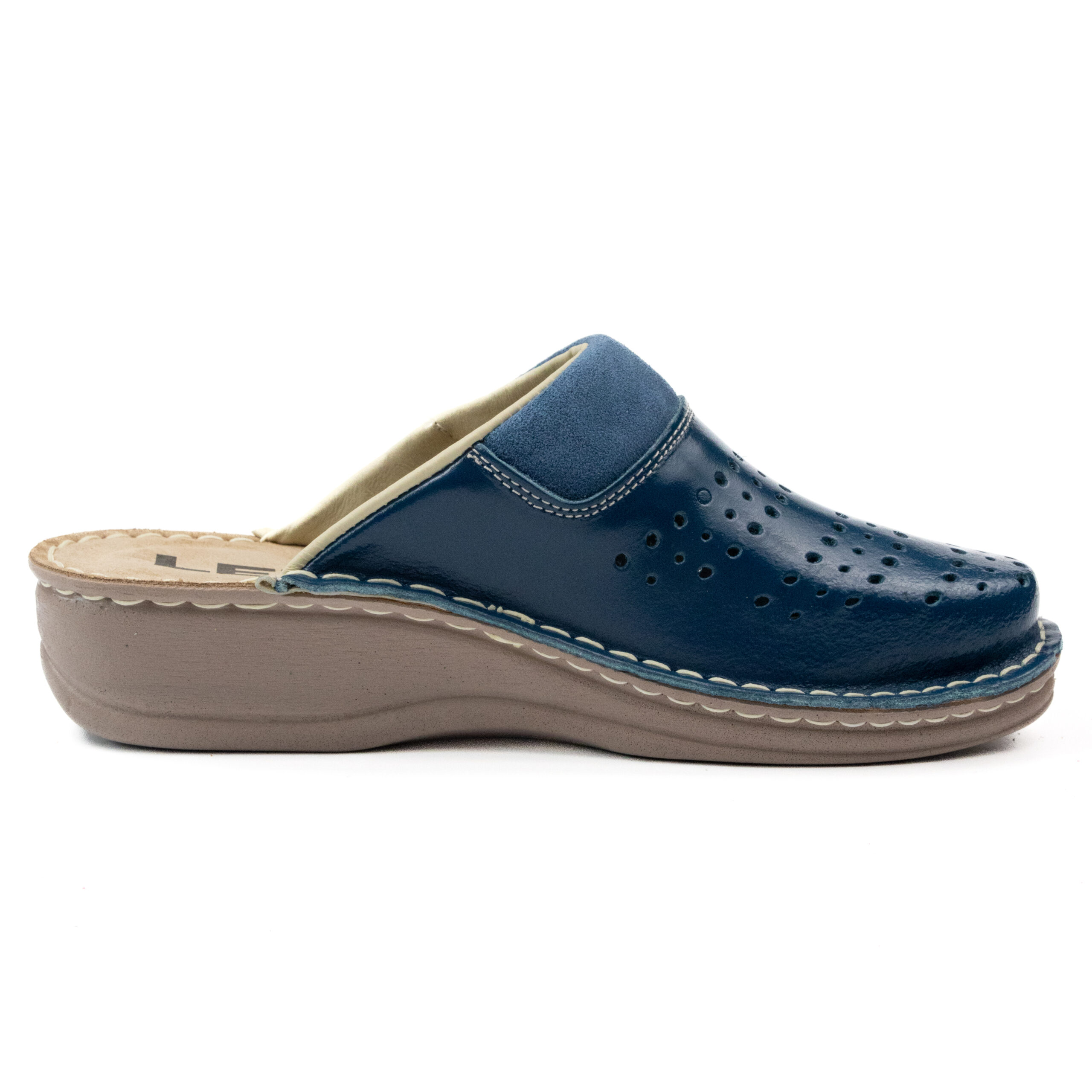 Дамско анатомично сабо, перфорирана естествена кожа, син цвят, в комбинация с естествен велур, на мек пено-латексов табан,заемащ формата на стъпалото, на олекотено полиуретаново ходилo с височина 3см.