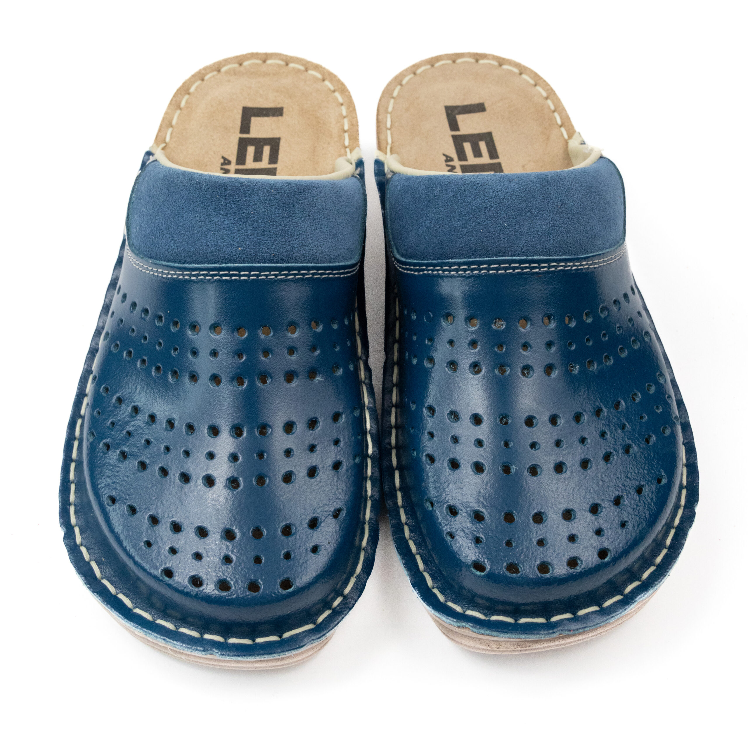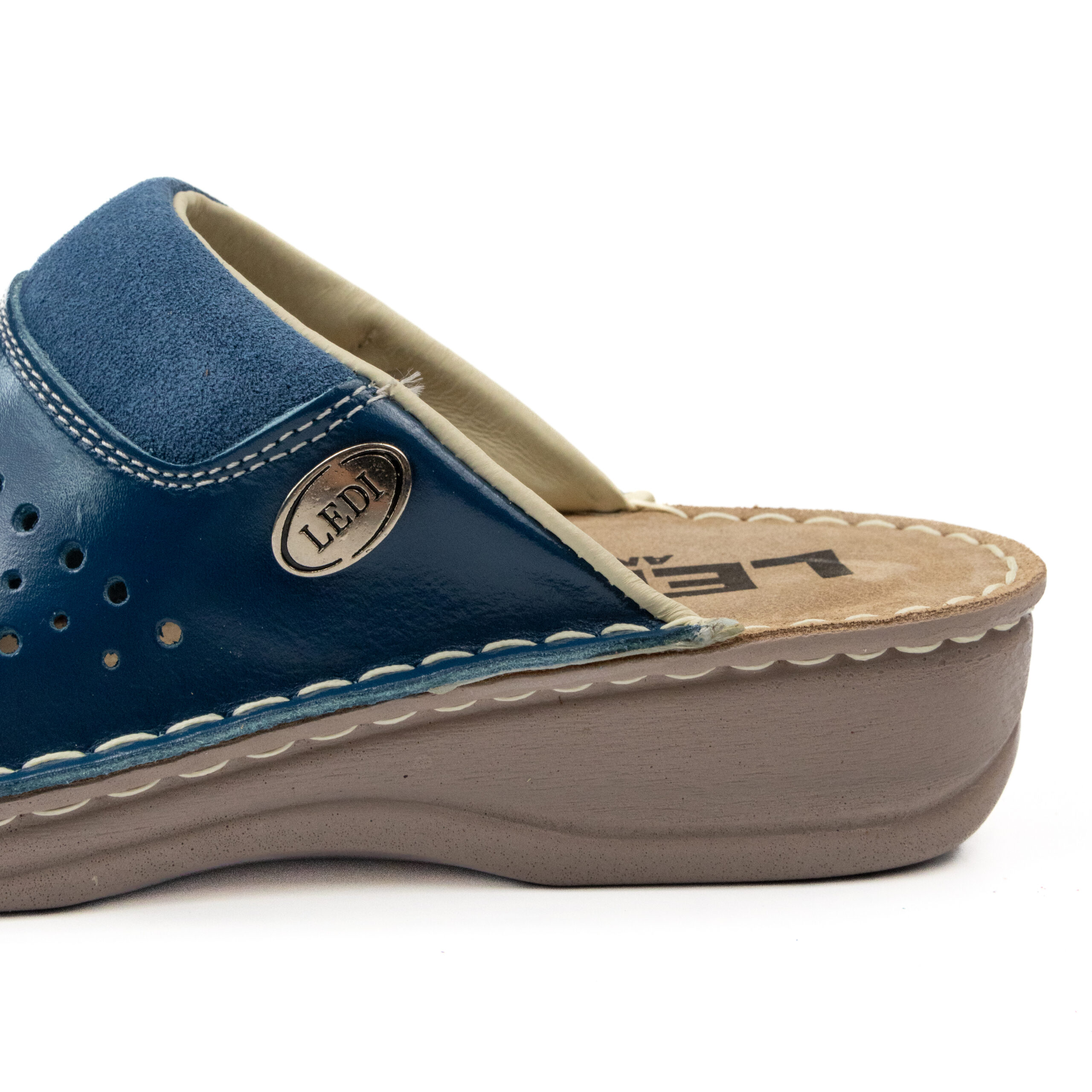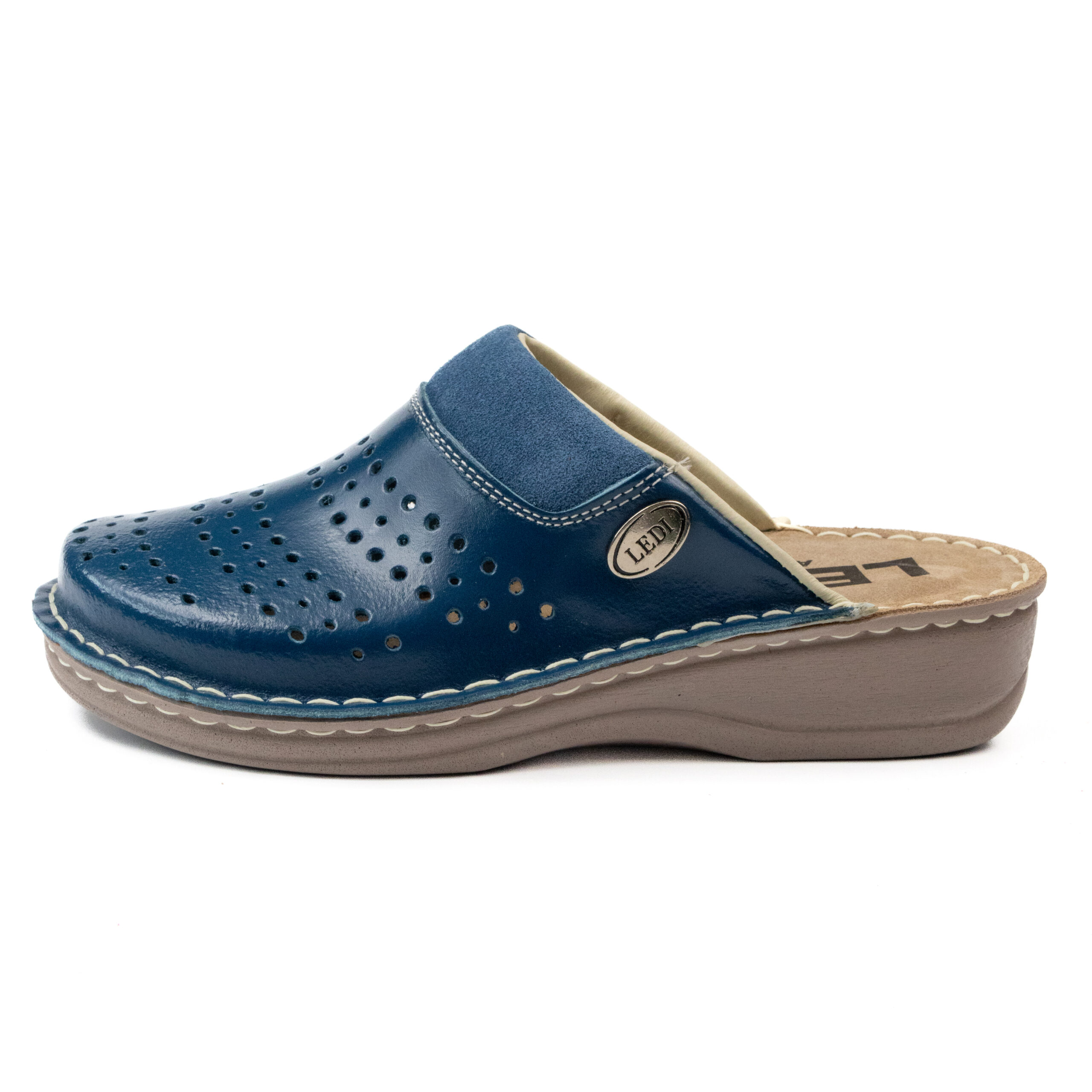 Дамско анатомично сабо, перфорирана естествена кожа, син цвят, в комбинация с естествен велур, на мек пено-латексов табан,заемащ формата на стъпалото, на олекотено полиуретаново ходилo с височина 3см.