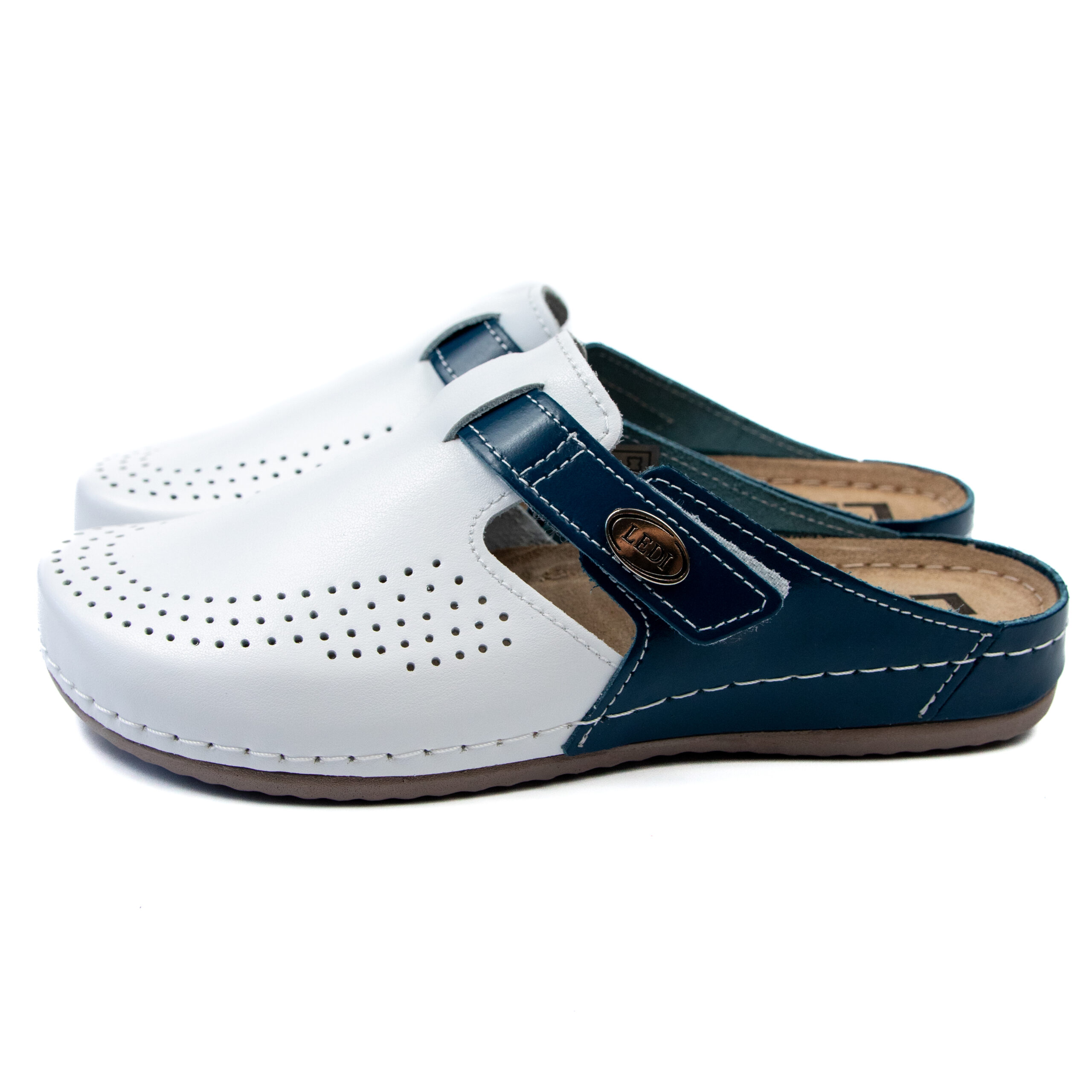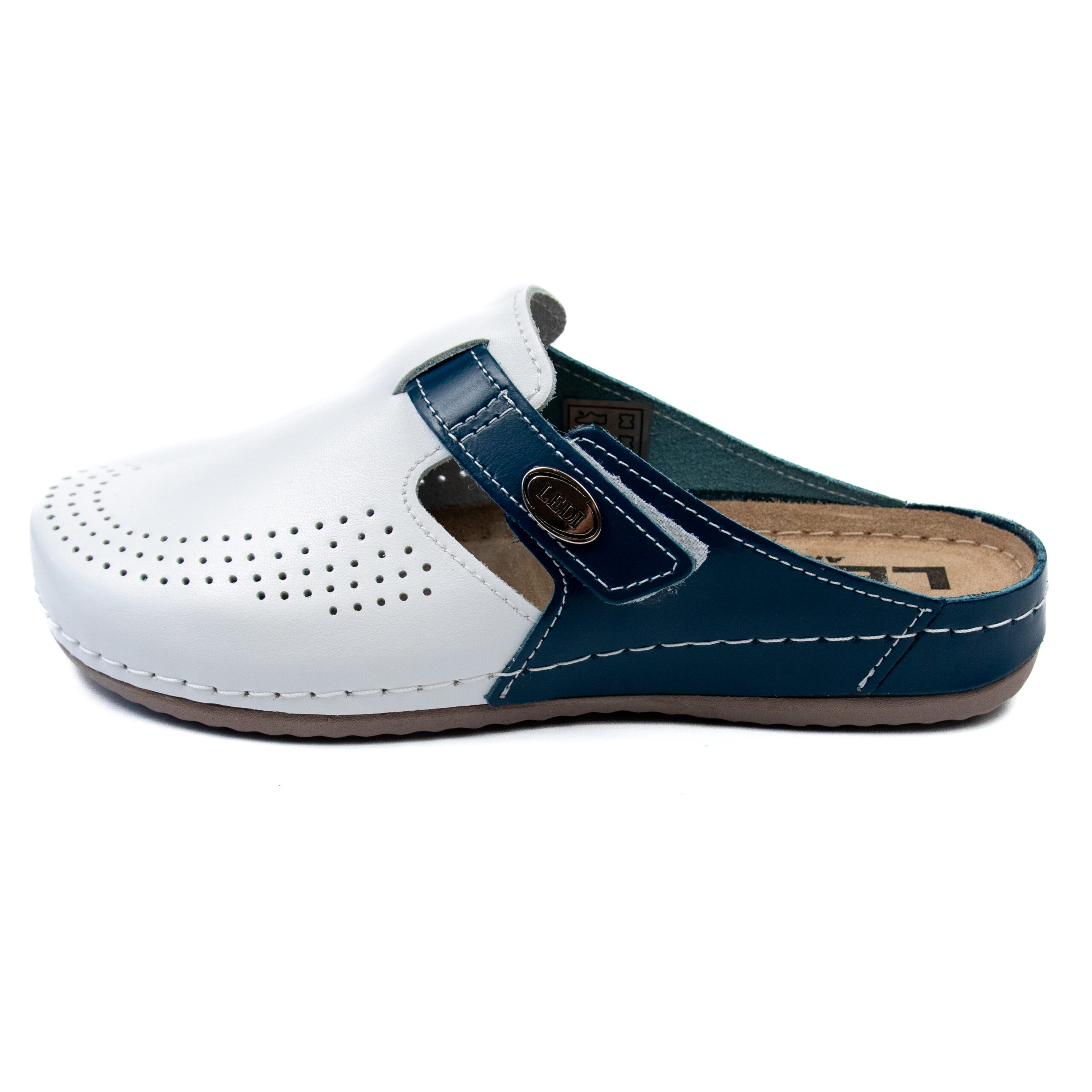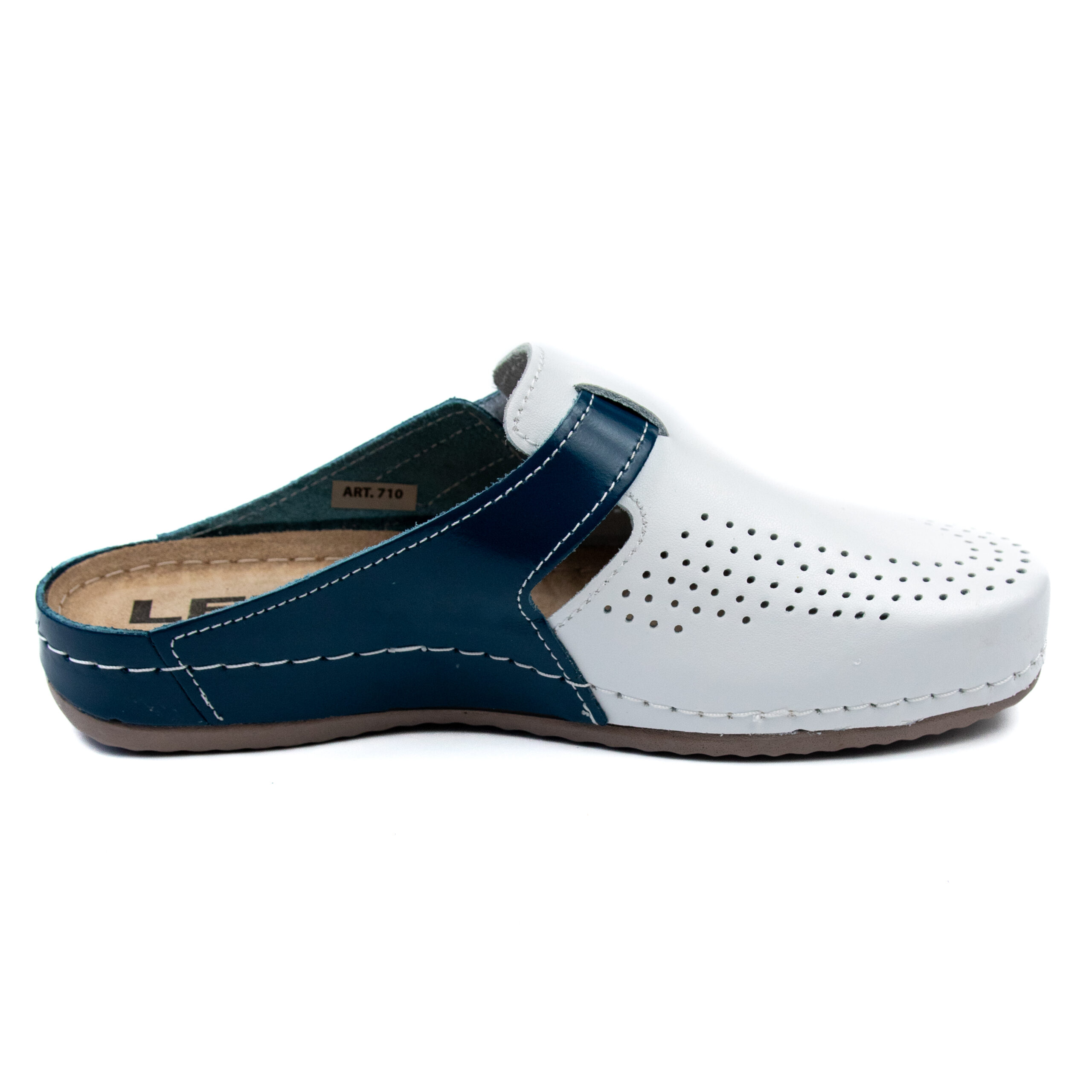 Дамско анатомично сабо, естествена кожа, основен-бял цвят в комбинация със син, на велуризиран табан,който не позволява приплъзване на крака вследствие на изпотяване, на олекотено полиуретаново ходилo с височина 2см.
