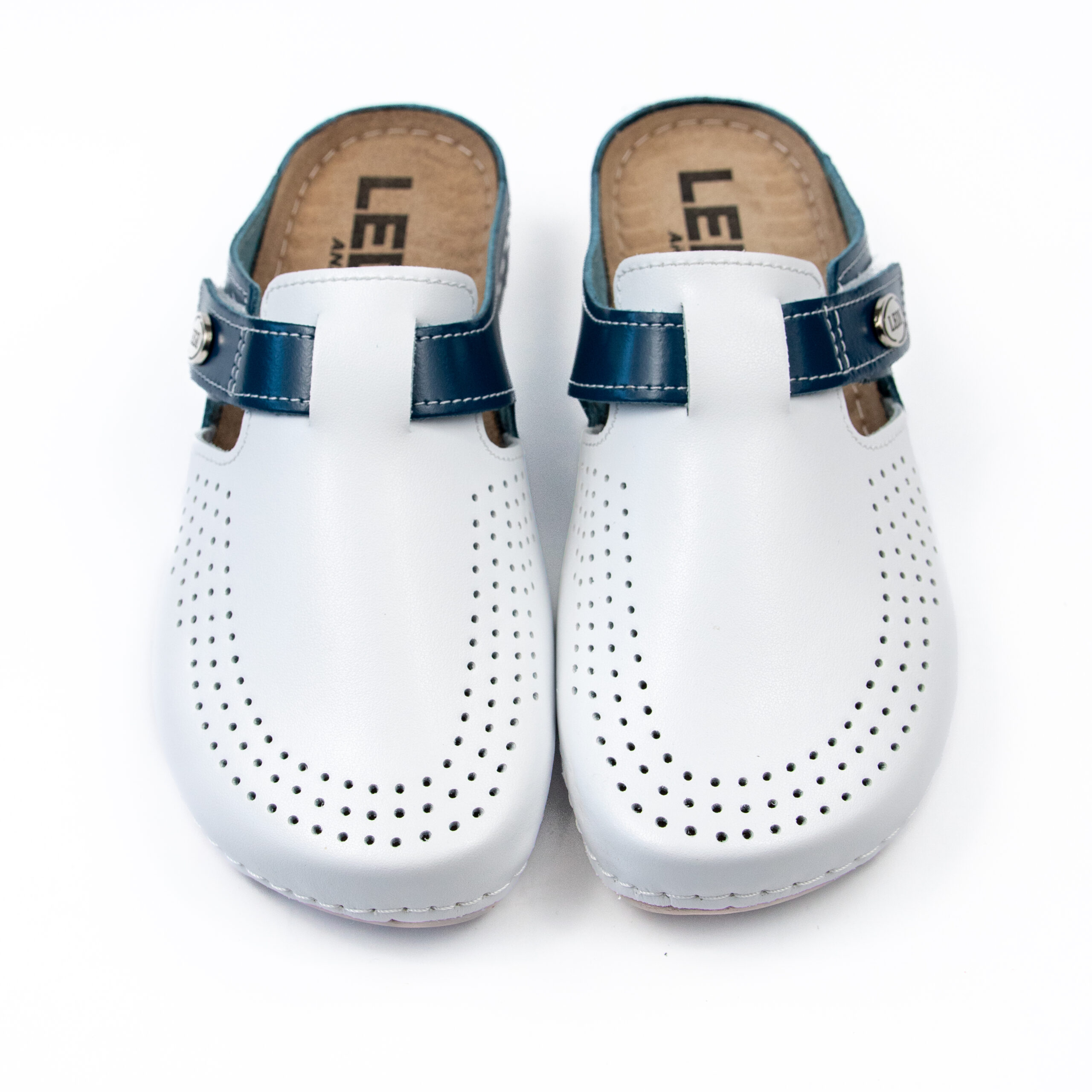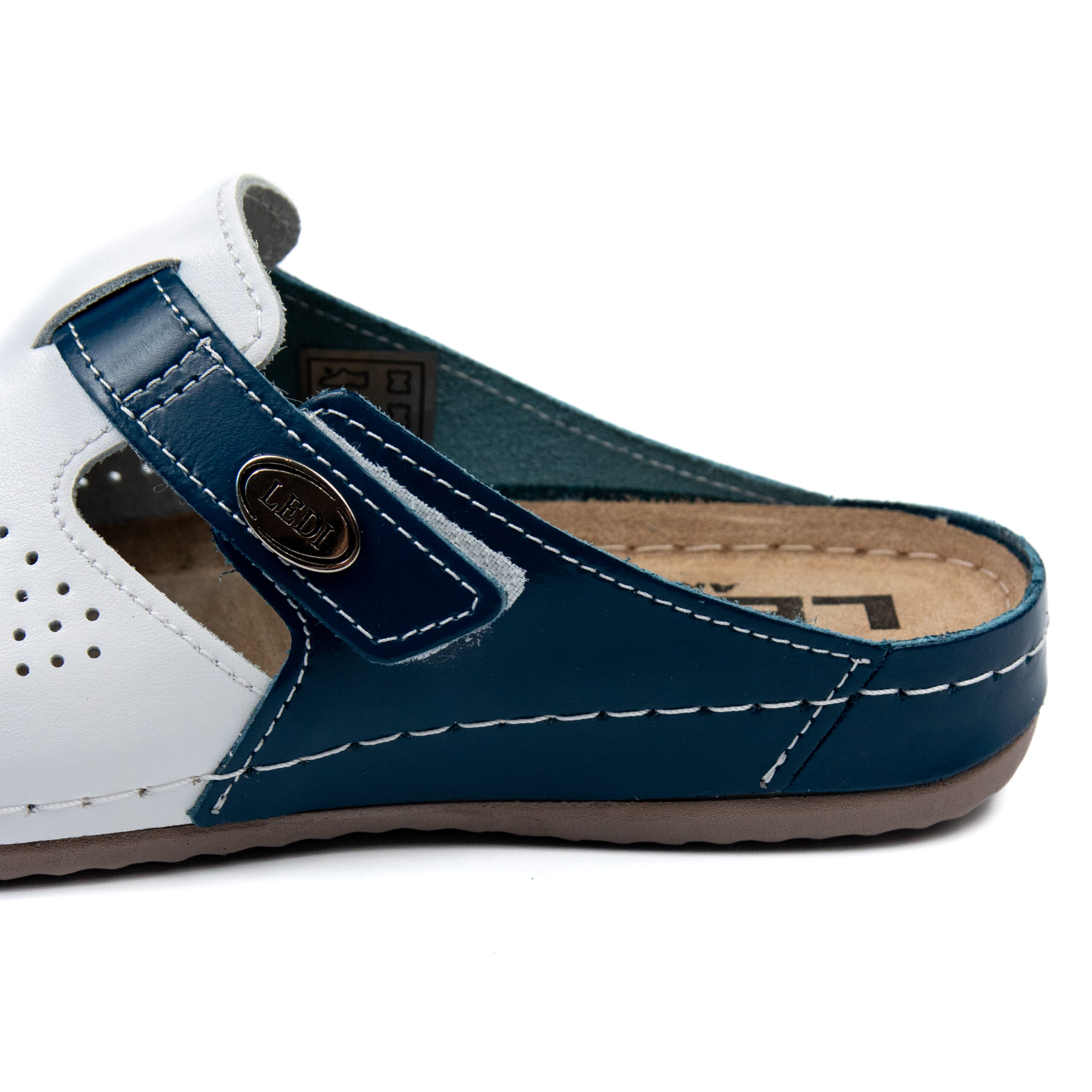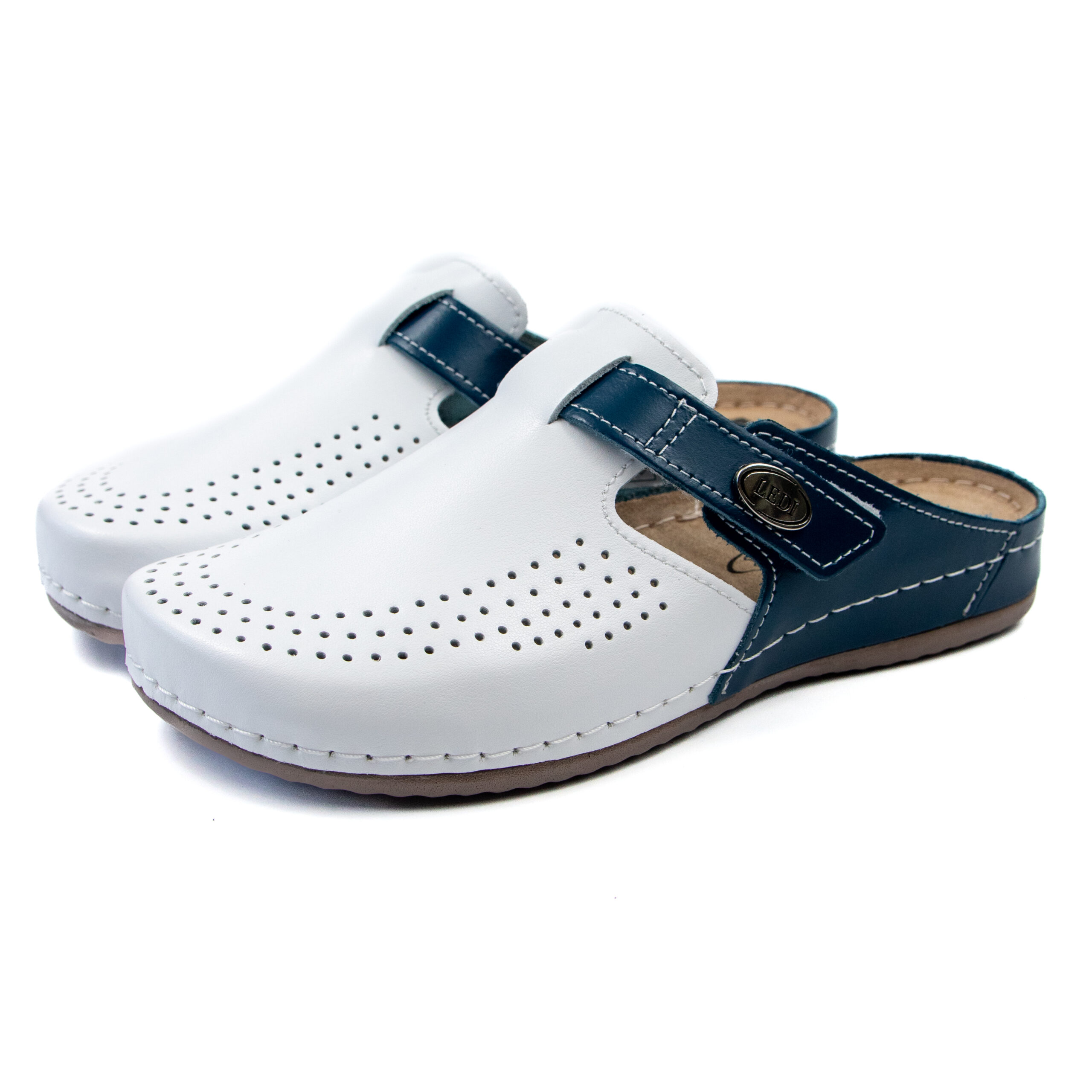 Дамско анатомично сабо, естествена кожа, основен-бял цвят в комбинация със син, на велуризиран табан,който не позволява приплъзване на крака вследствие на изпотяване, на олекотено полиуретаново ходилo с височина 2см.