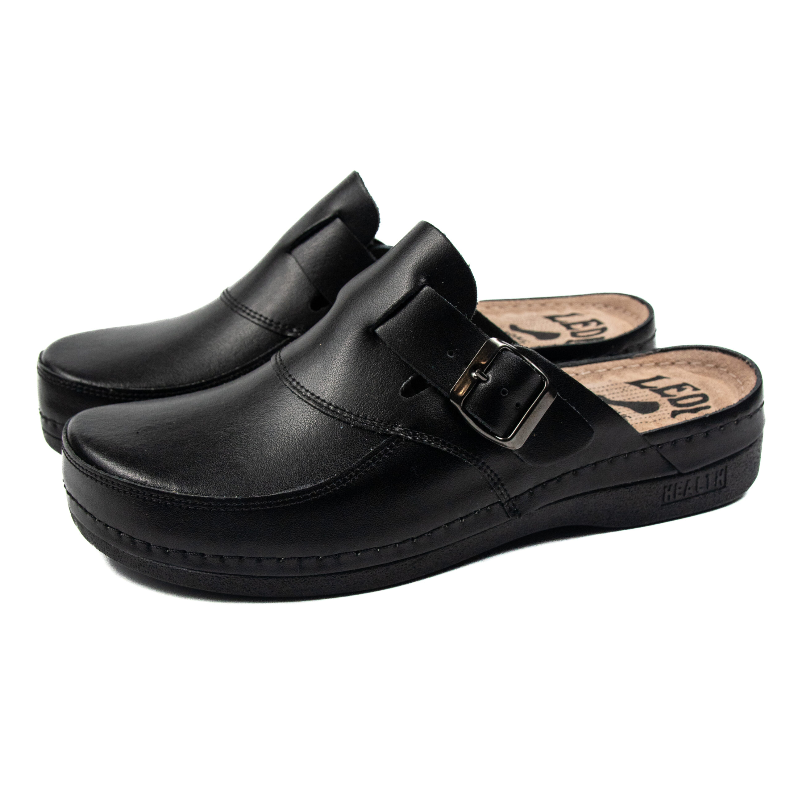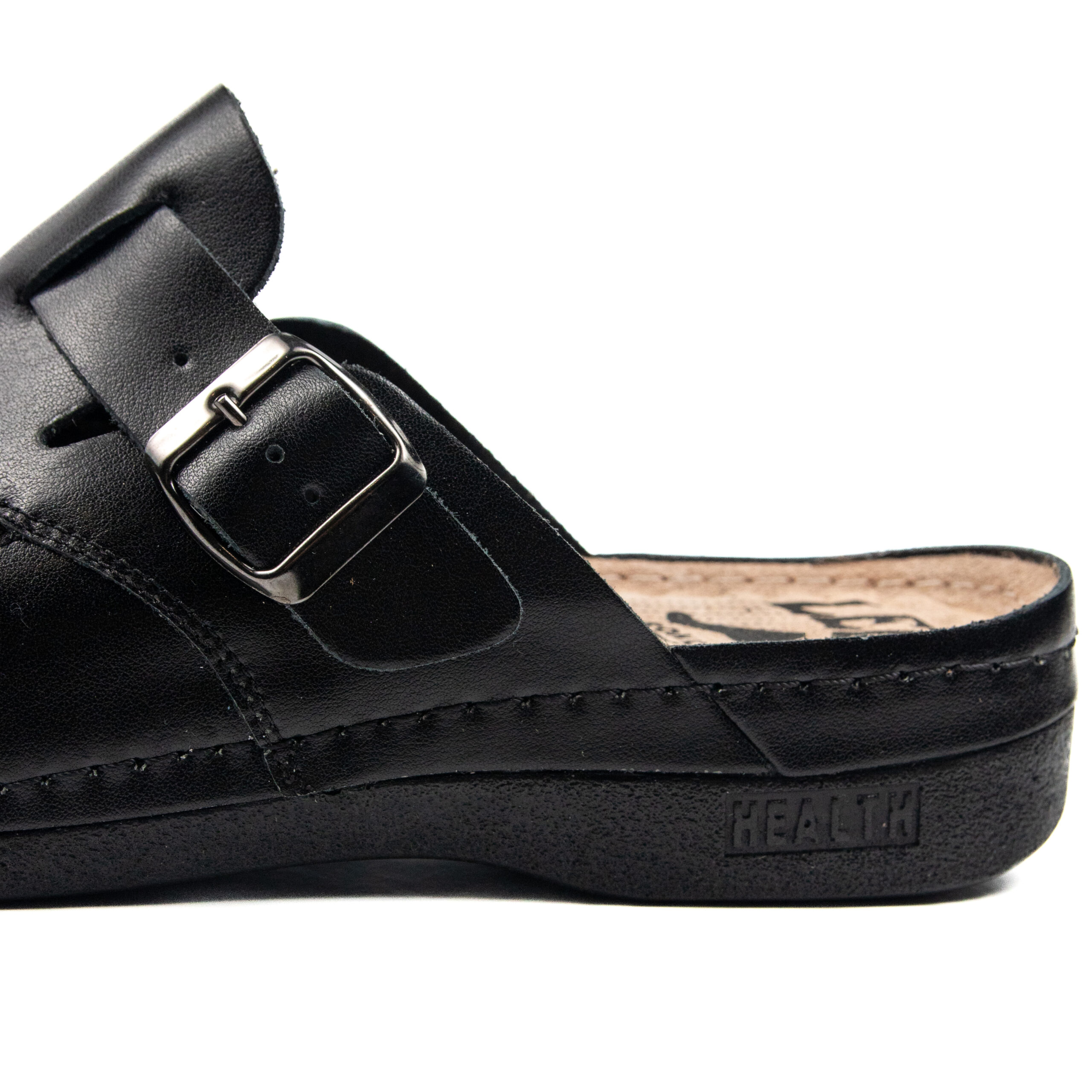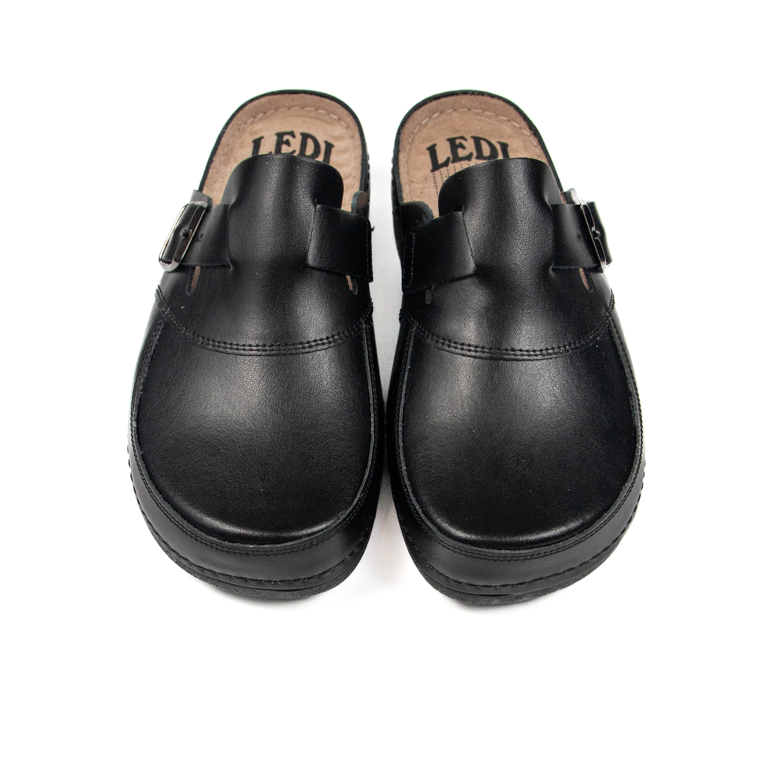 Без перфорация мъжко анатомично сабо, естествена кожа, черен цвят, на мек пено-латексов табан, заемащ формата на стъпалото, на олекотено полиуретаново ходилo с височина 3см.