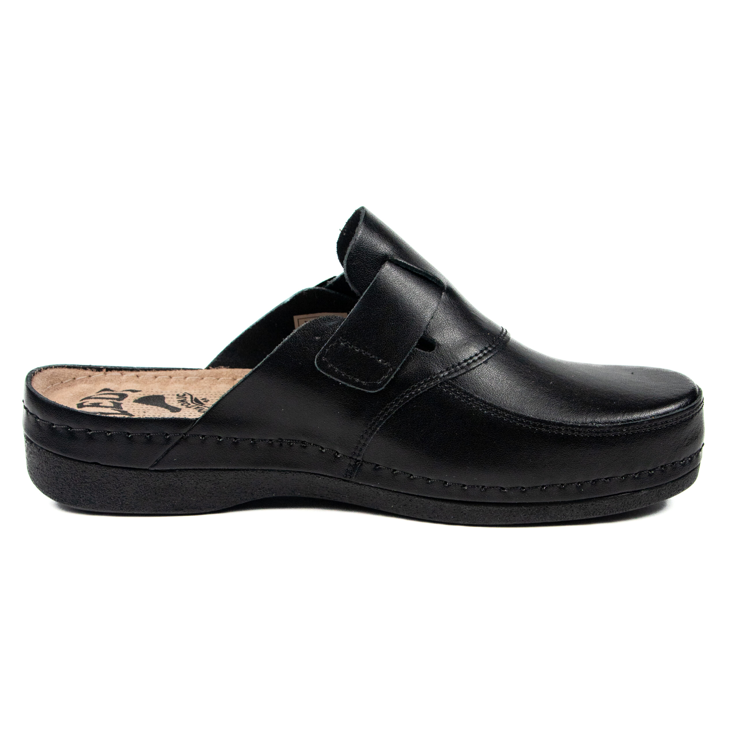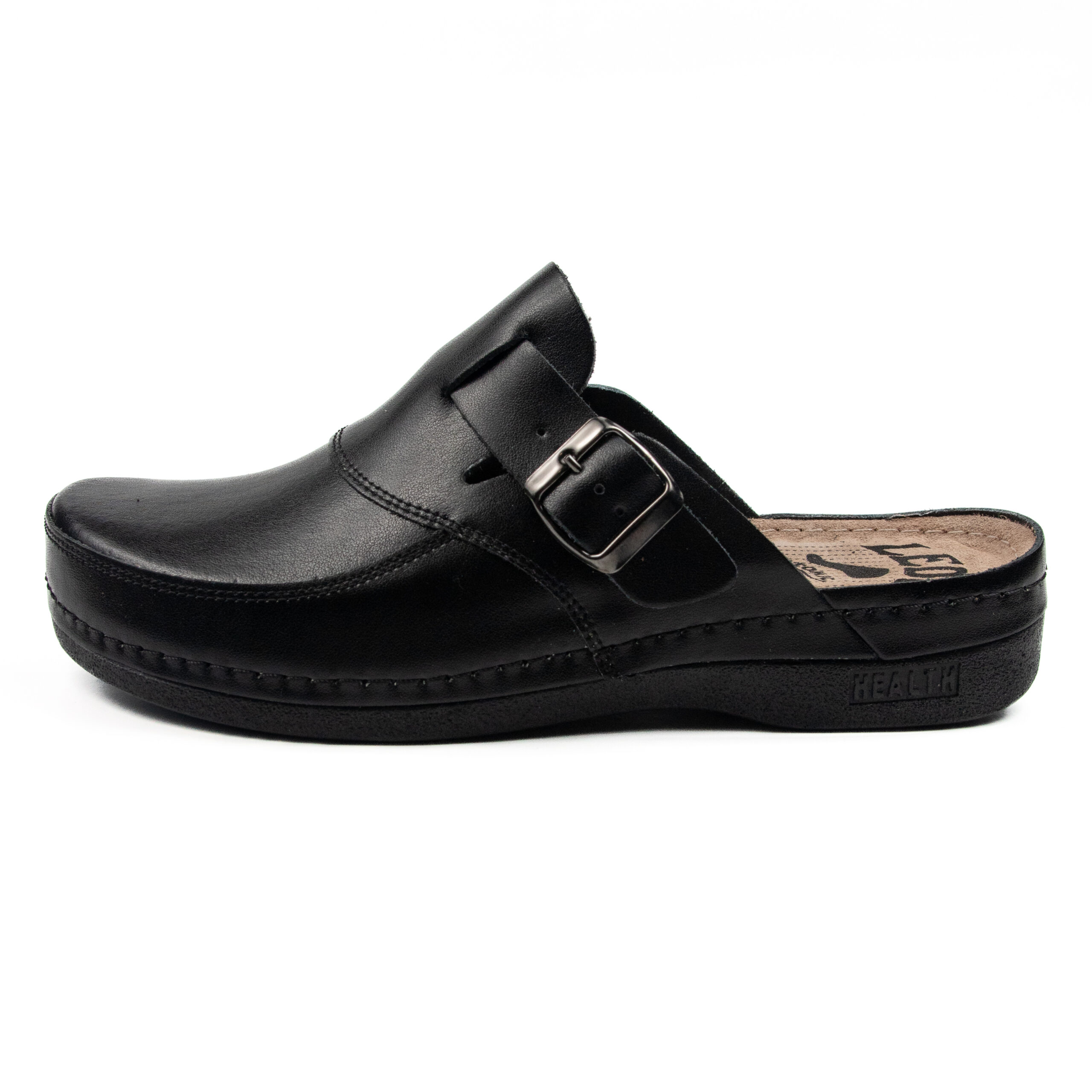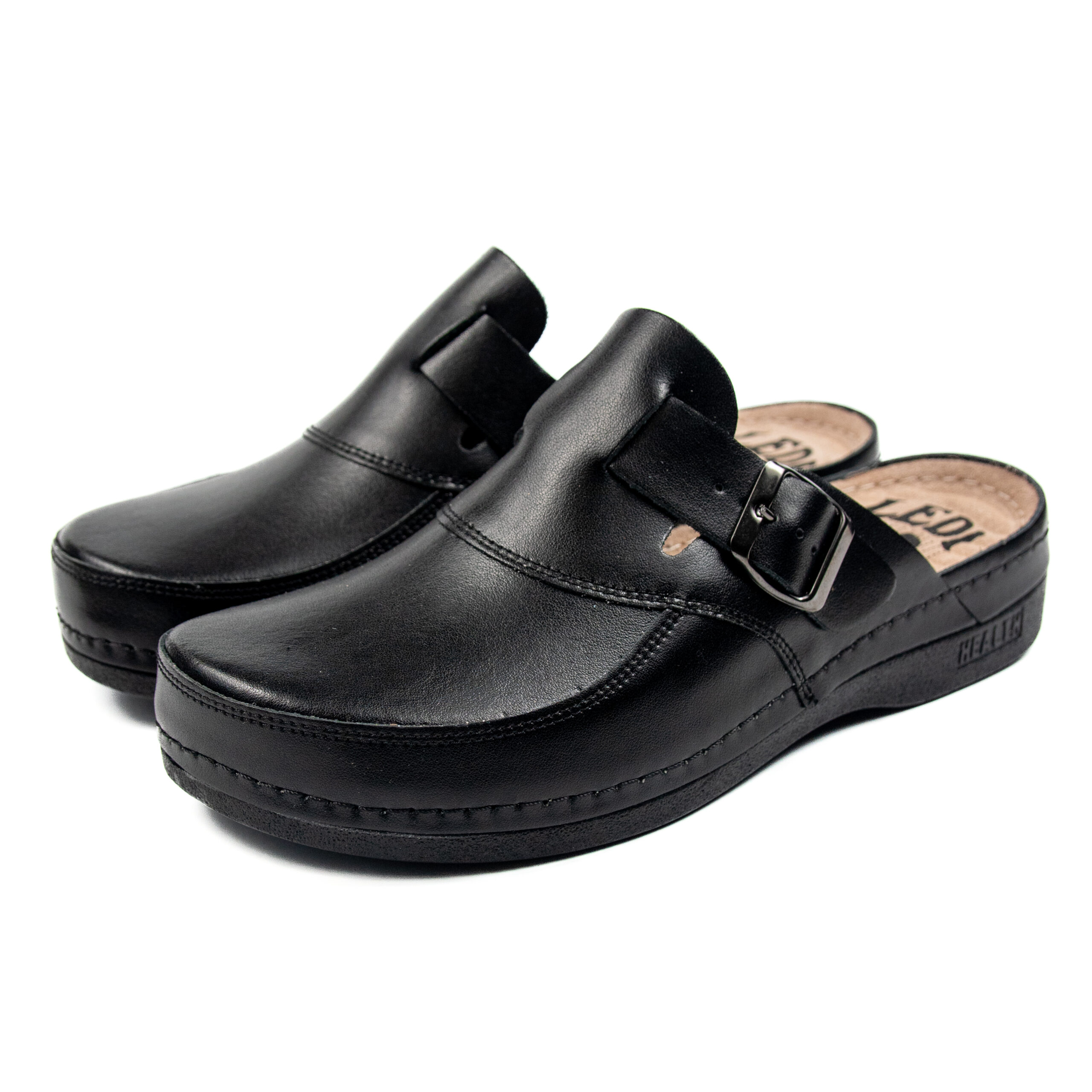 Без перфорация мъжко анатомично сабо, естествена кожа, черен цвят, на мек пено-латексов табан, заемащ формата на стъпалото, на олекотено полиуретаново ходилo с височина 3см.