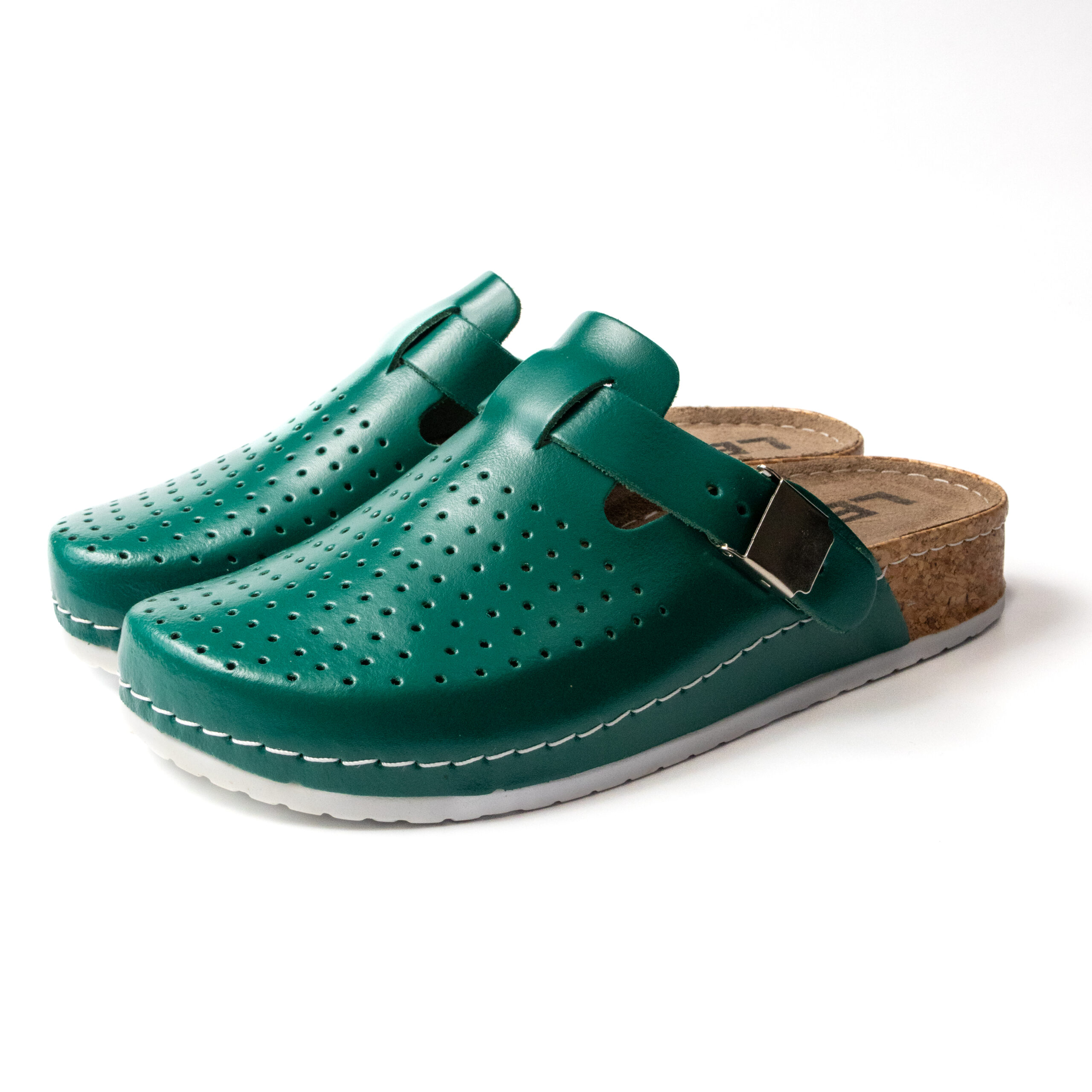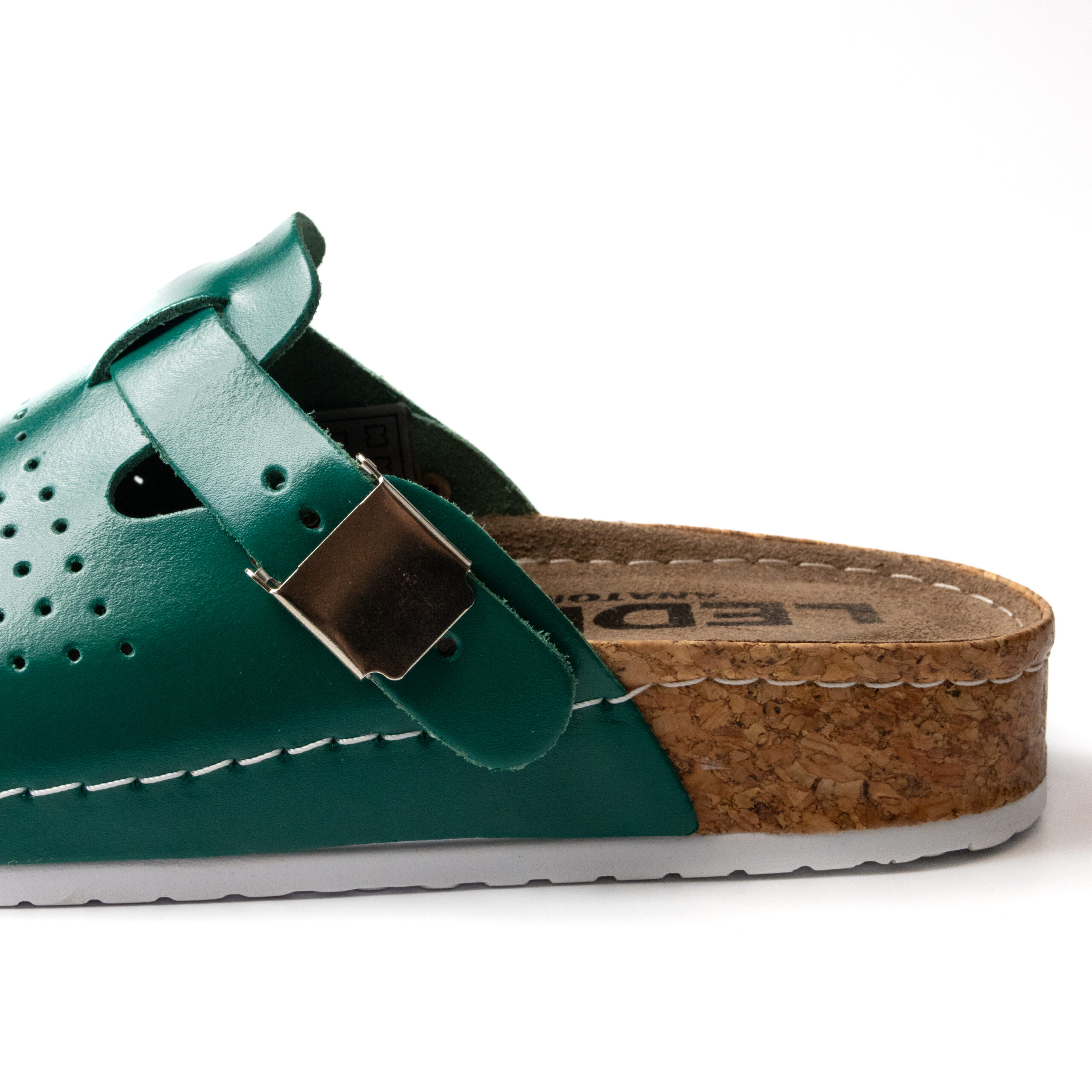 Дамско анатомично сабо, перфорирана естествена кожа, зелен цвят, табанът е средна твърдост - MEDIUM SOFT, на олекотено полиуретаново ходилo с височина 5см.