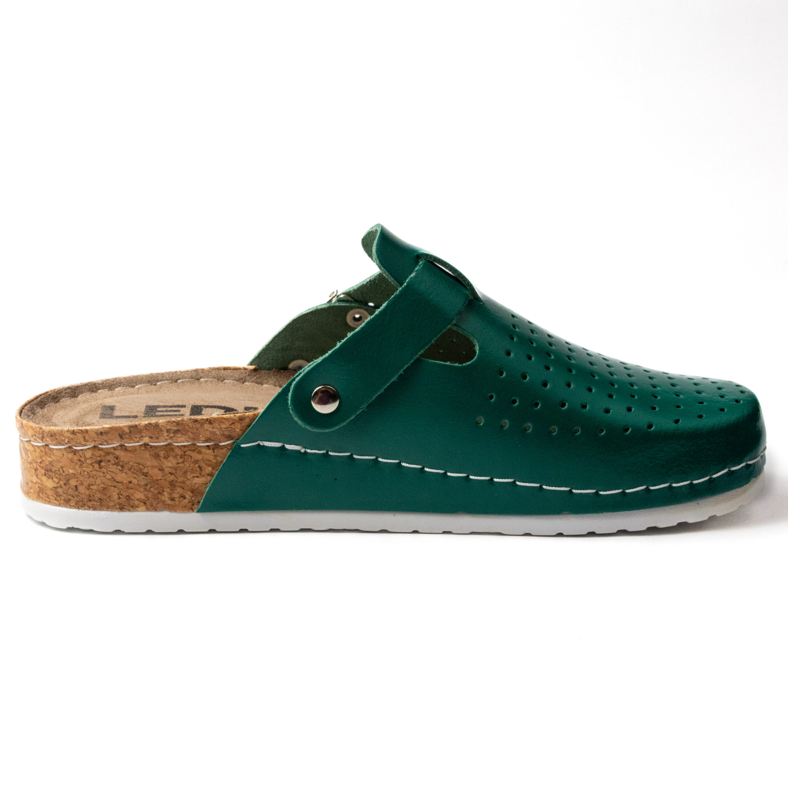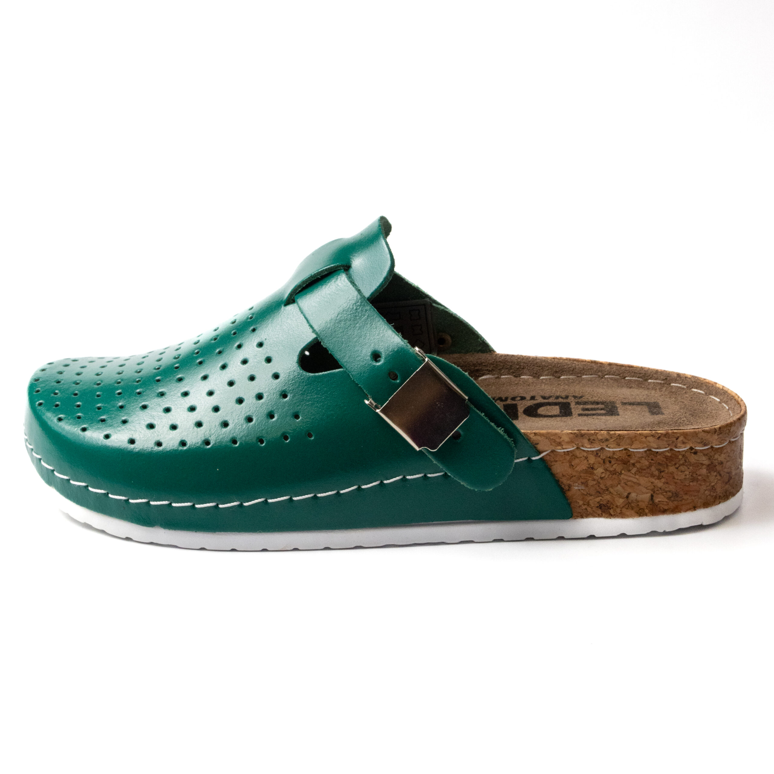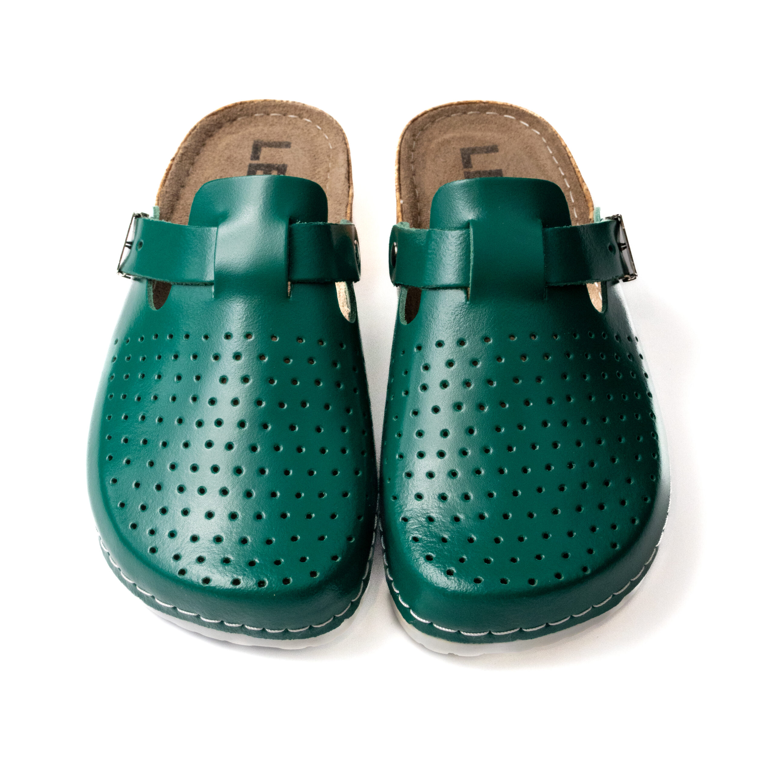 Анатомично дамско сабо LEDi в модерен зелен цвят, изработено от висококачествена естествена кожа. Моделът е с перфорации, които осигуряват оптимална вентилация и комфорт през целия ден. Регулируемата каишка с метална катарама позволява перфектно напасване към крака, а анатомичната стелка подпомага правилната стойка и намалява натоварването в зоната на свода и петата. Леки, удобни и подходящи за ежедневно носене у дома, на работа или в медицинска среда.