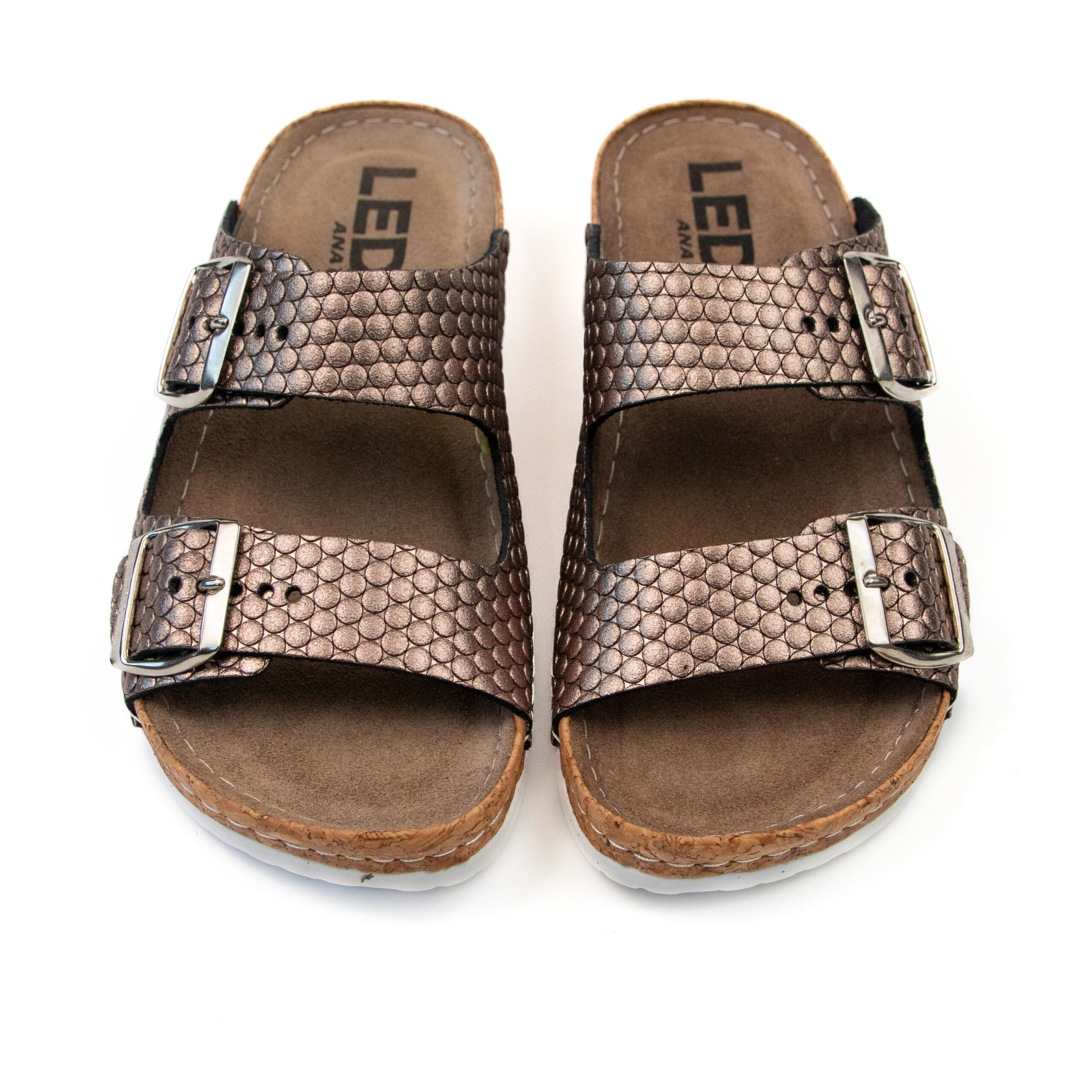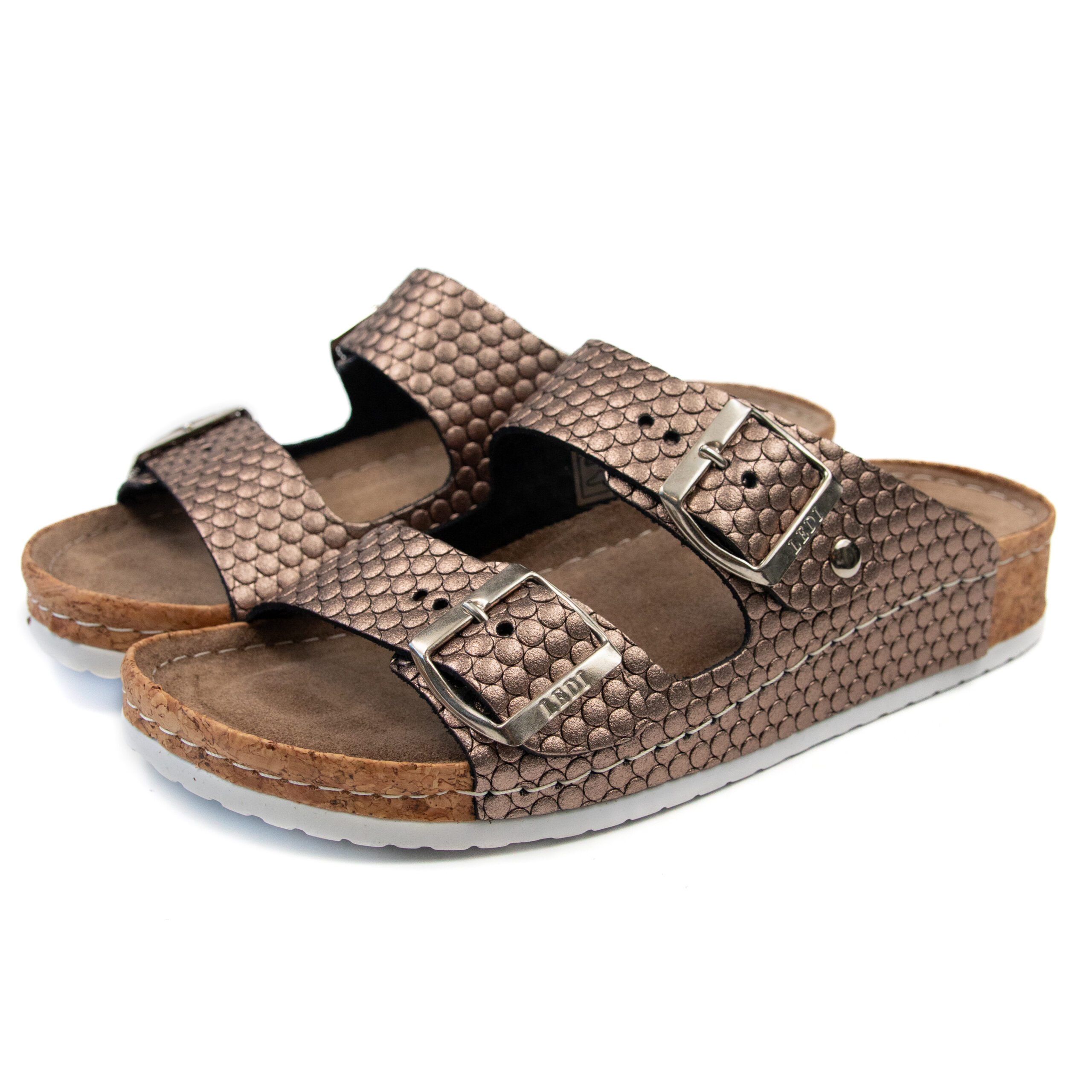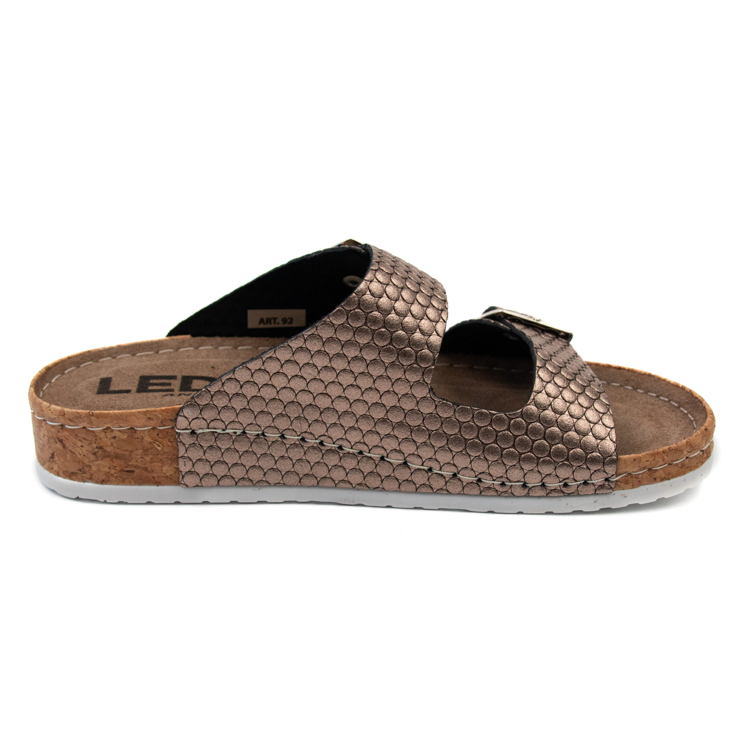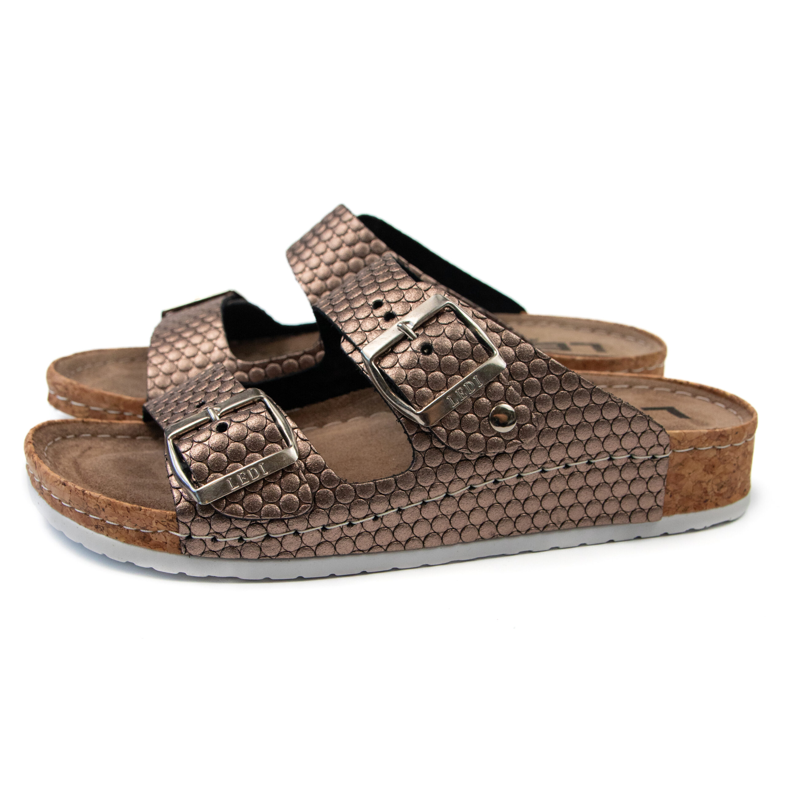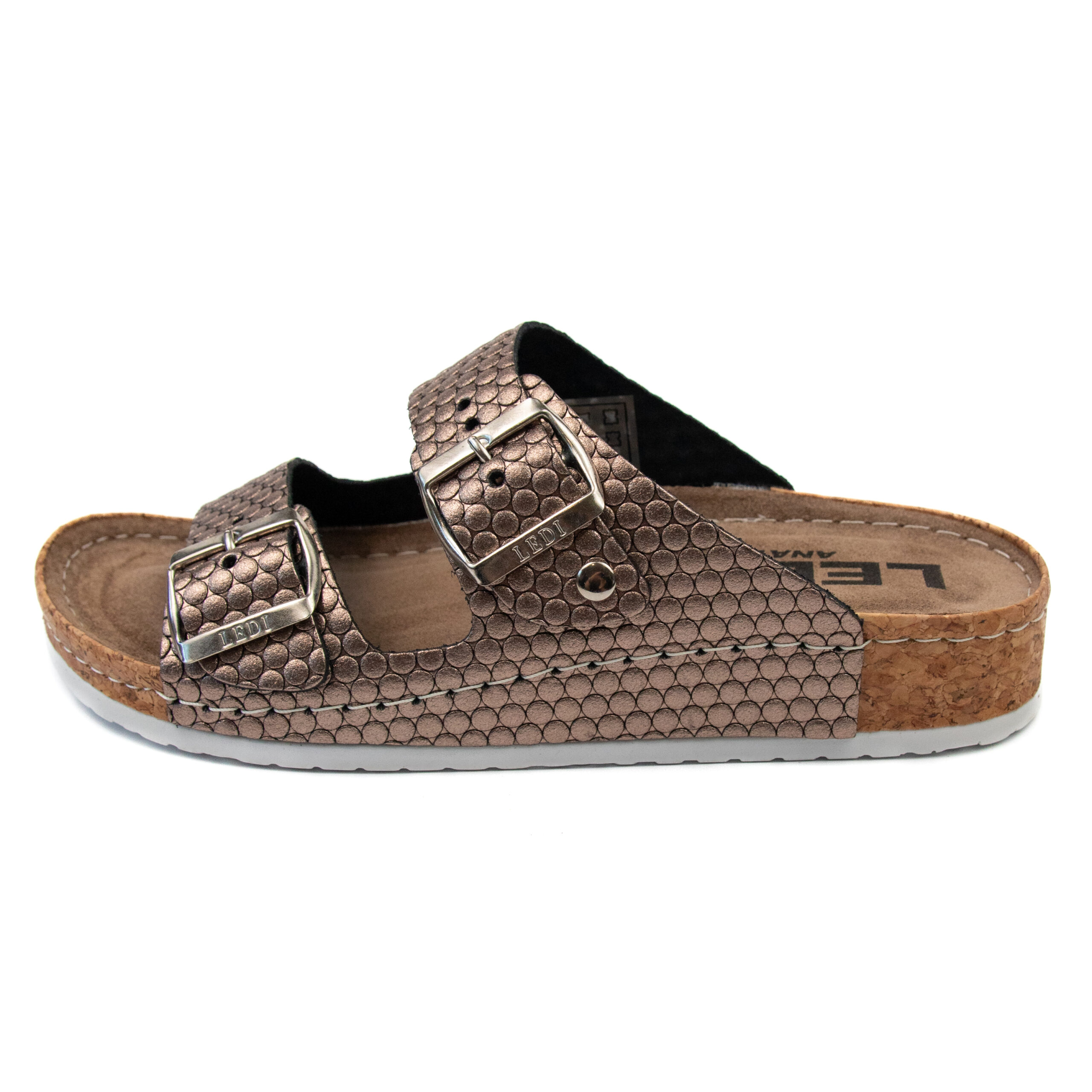 Дамски анатомичен чехъл, релефна естествена кожа, цвят бакър, табанът е средна твърдост - MEDIUM SOFT, на олекотено полиуретаново ходилo с височина 3.5см.