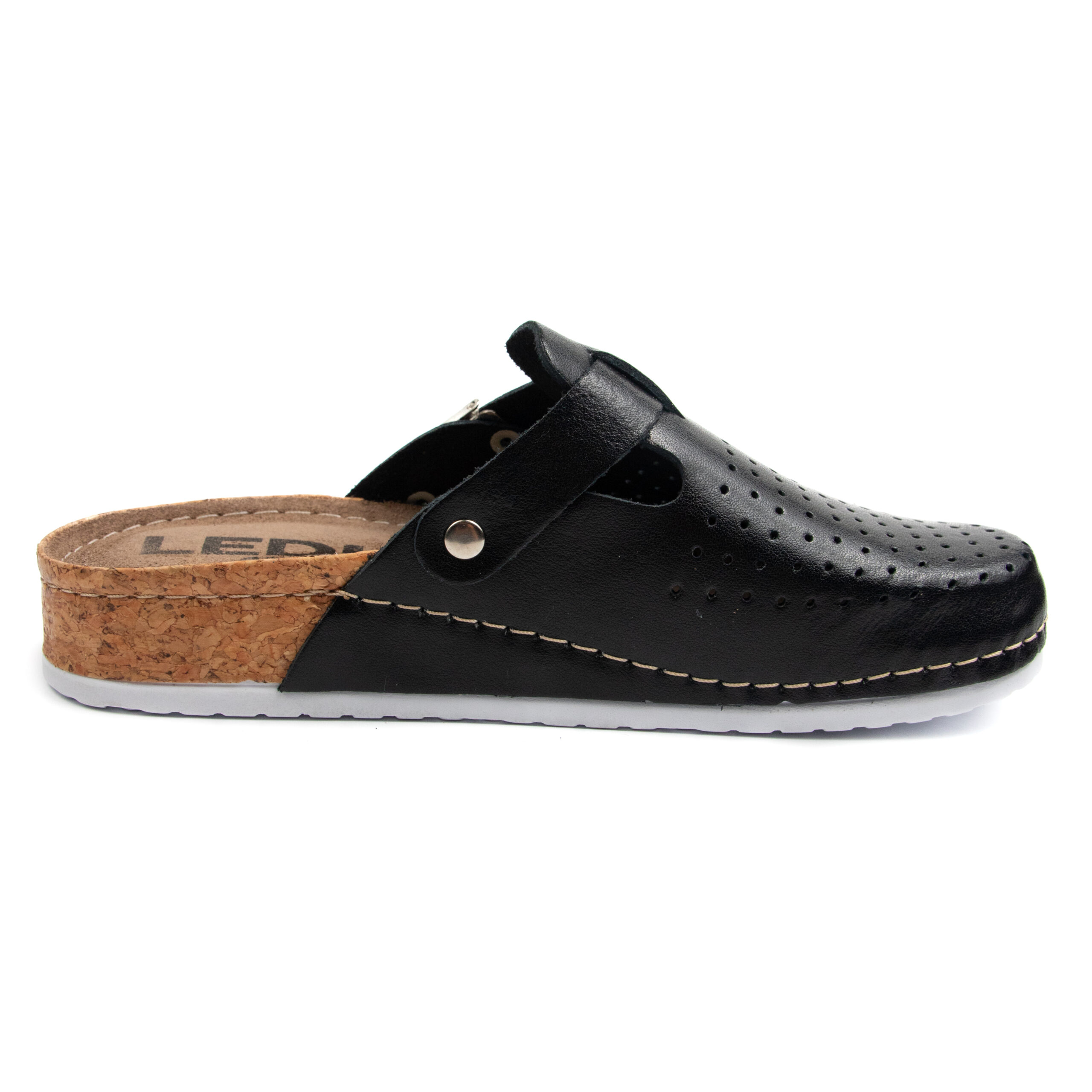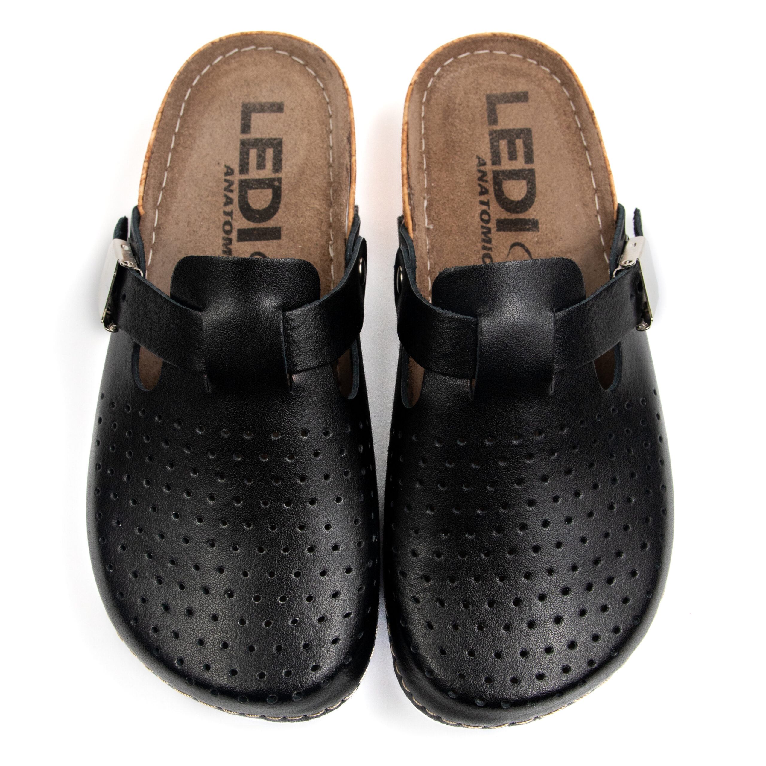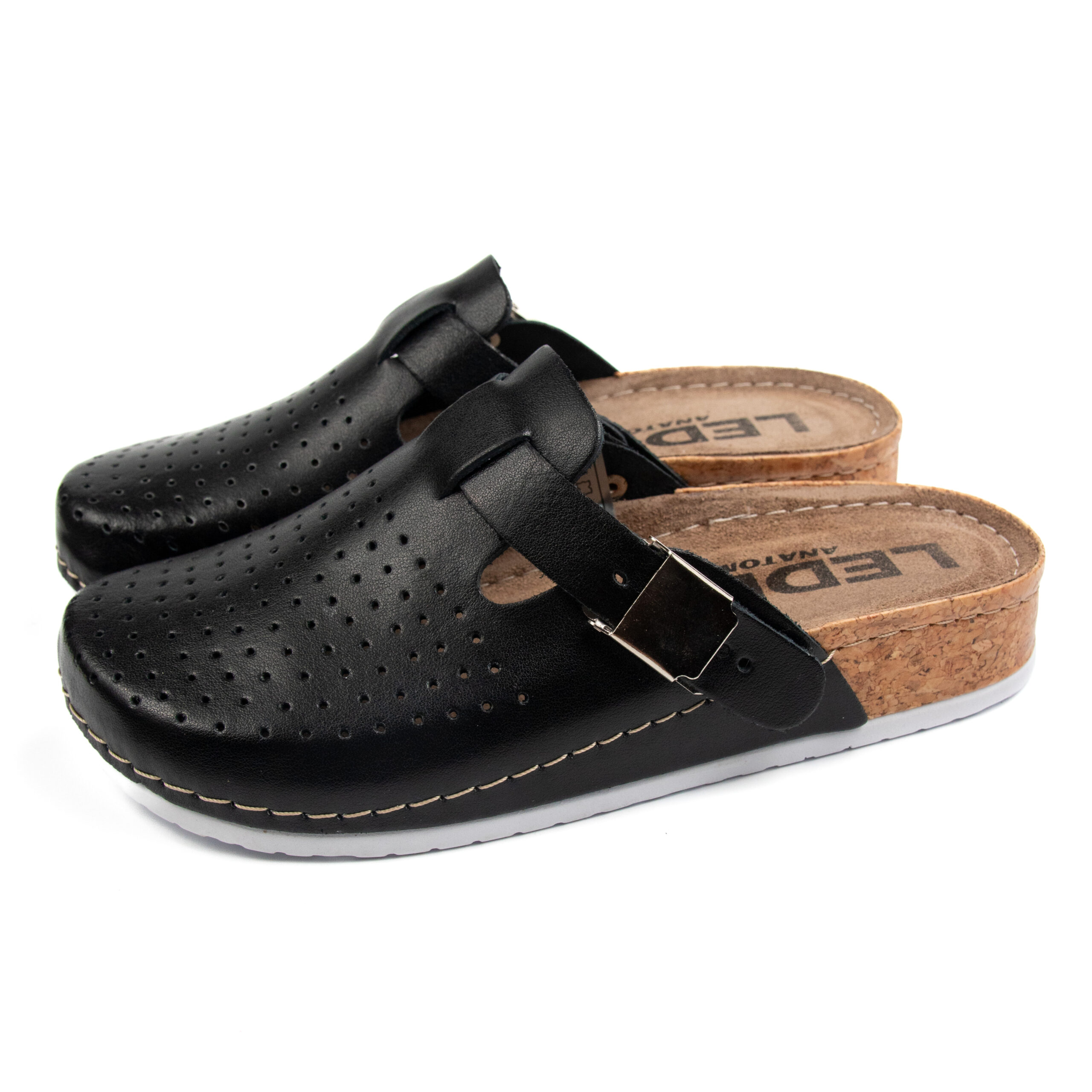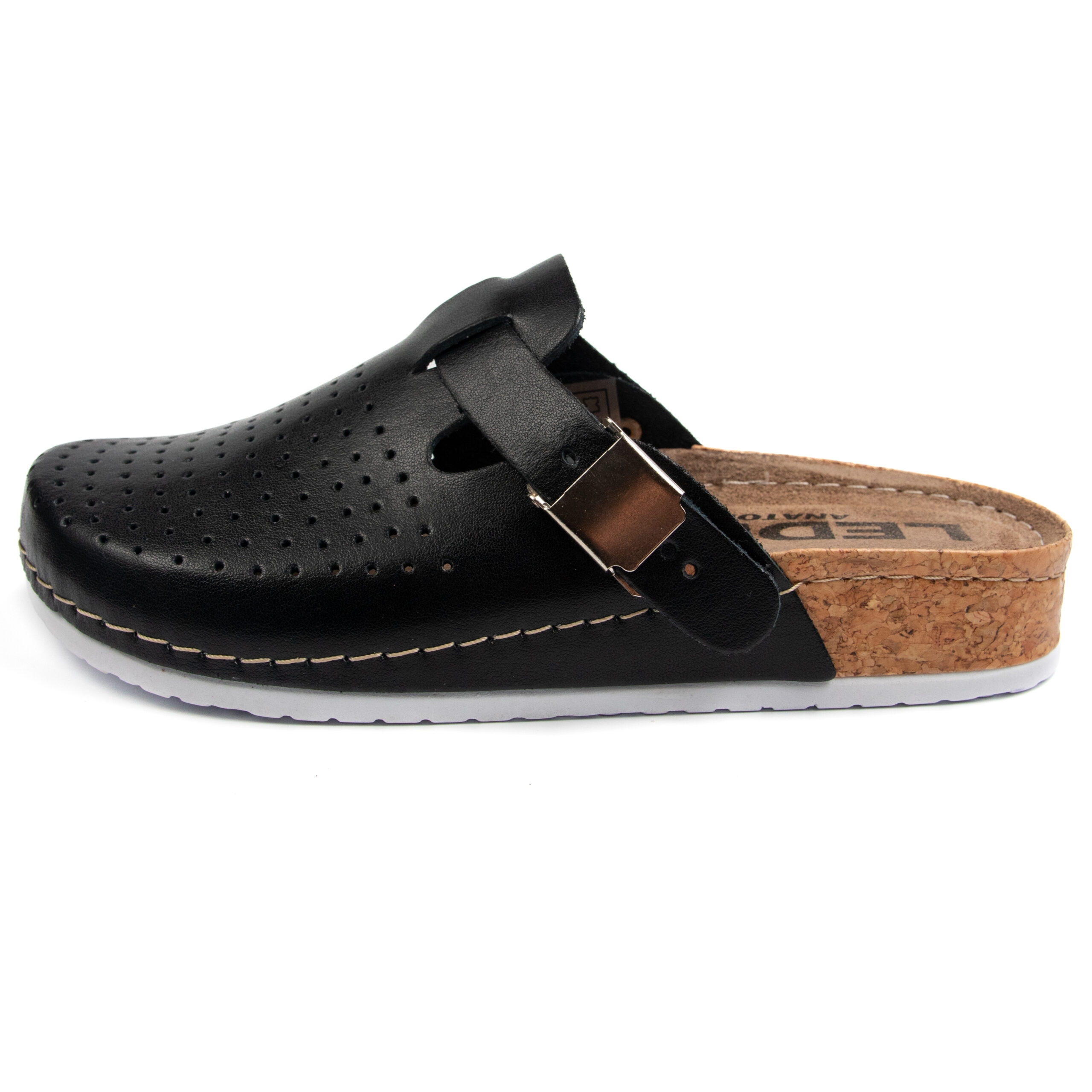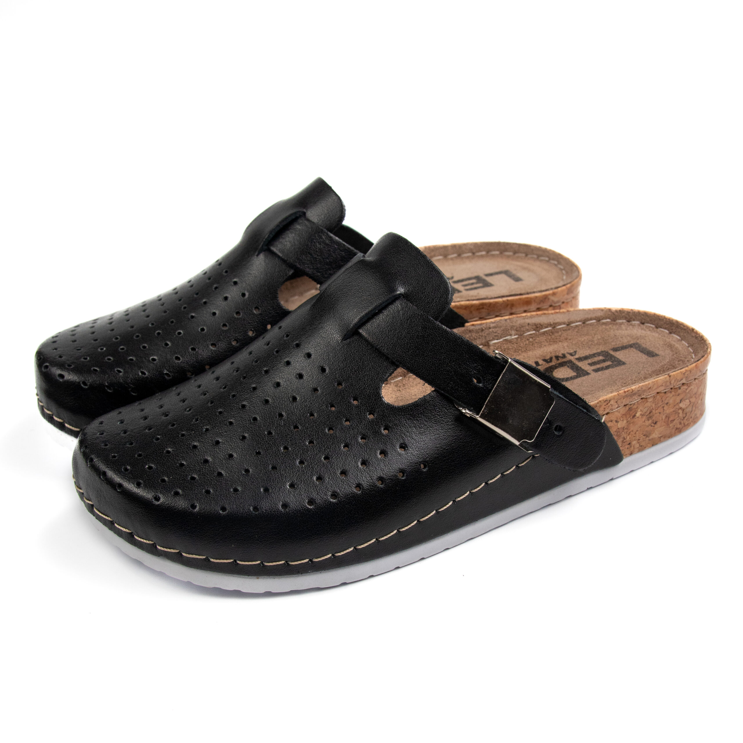 Дамско анатомично сабо, перфорирана естествена кожа, черен цвят, табанът е средна твърдост - MEDIUM SOFT, на олекотено полиуретаново ходилo с височина 5см.