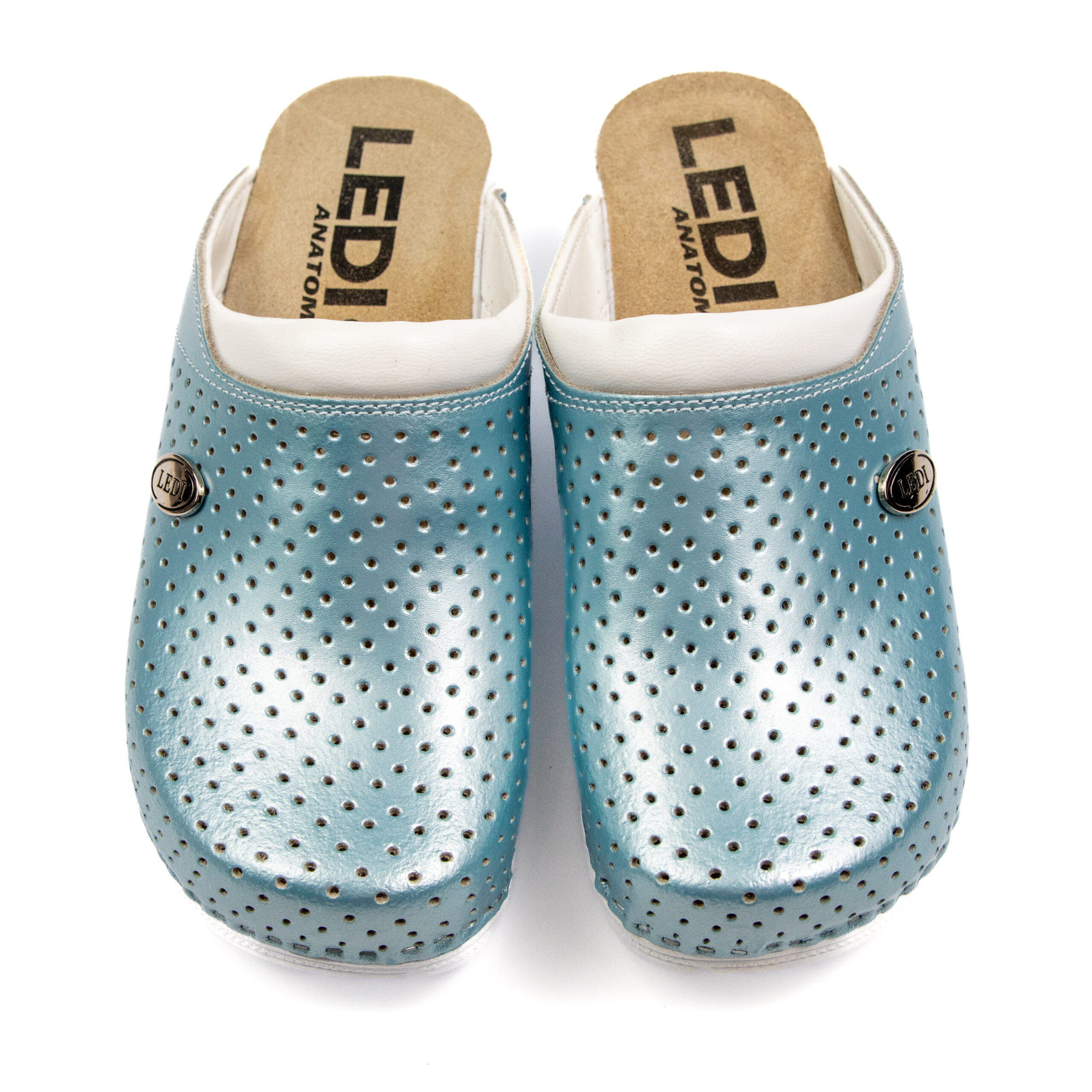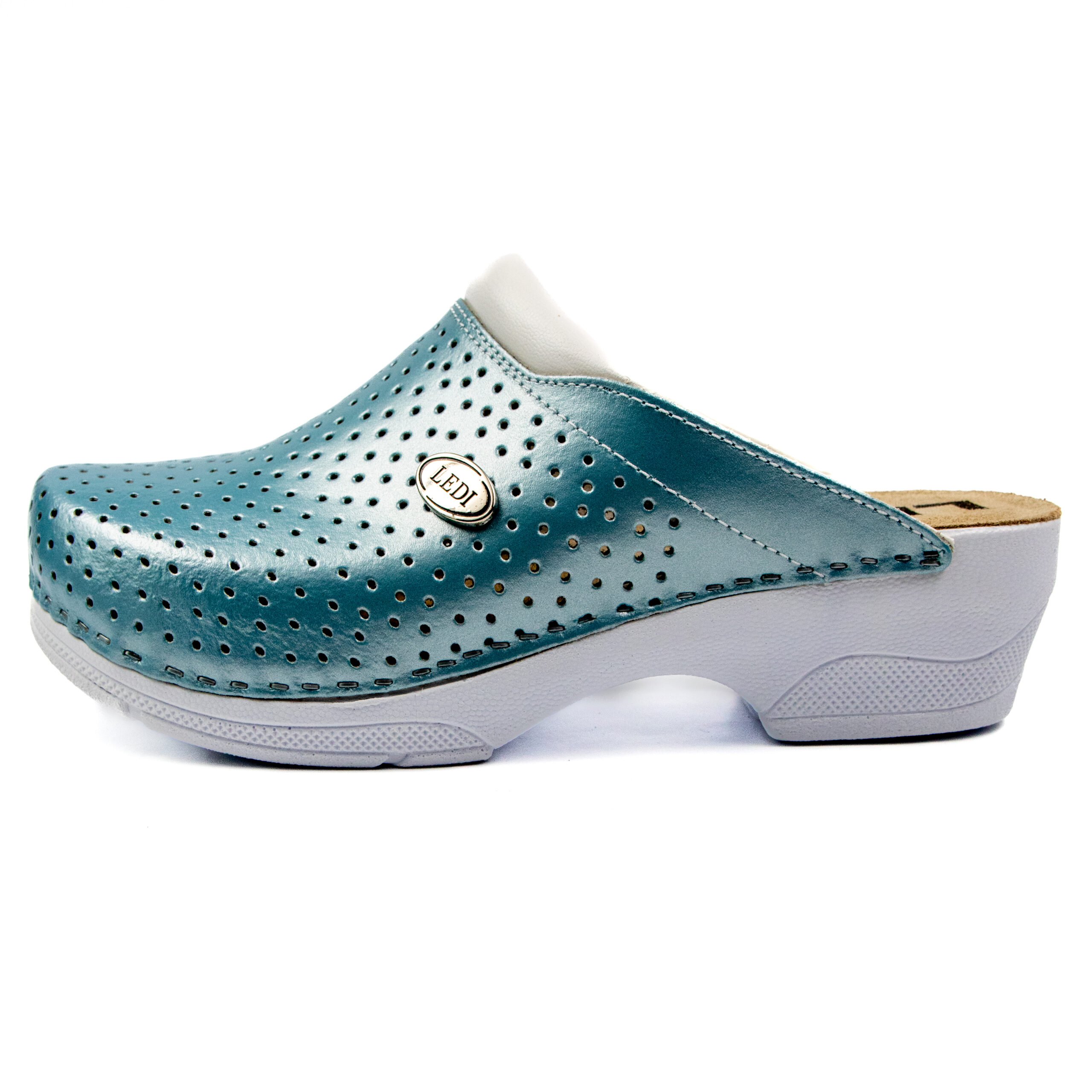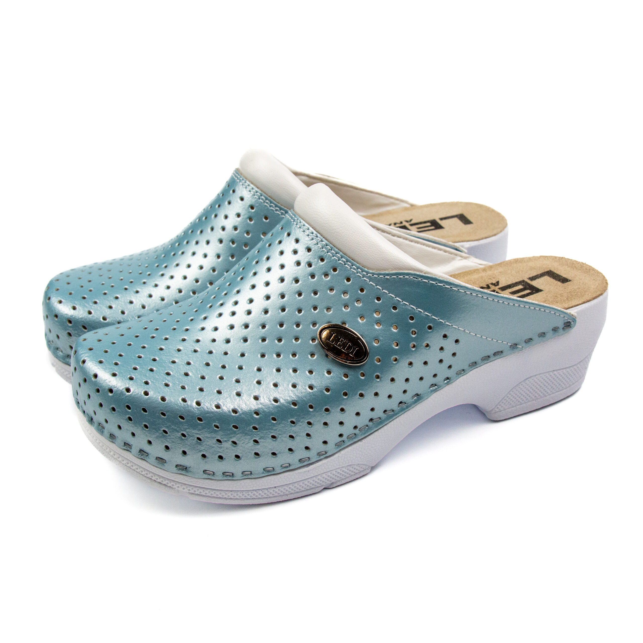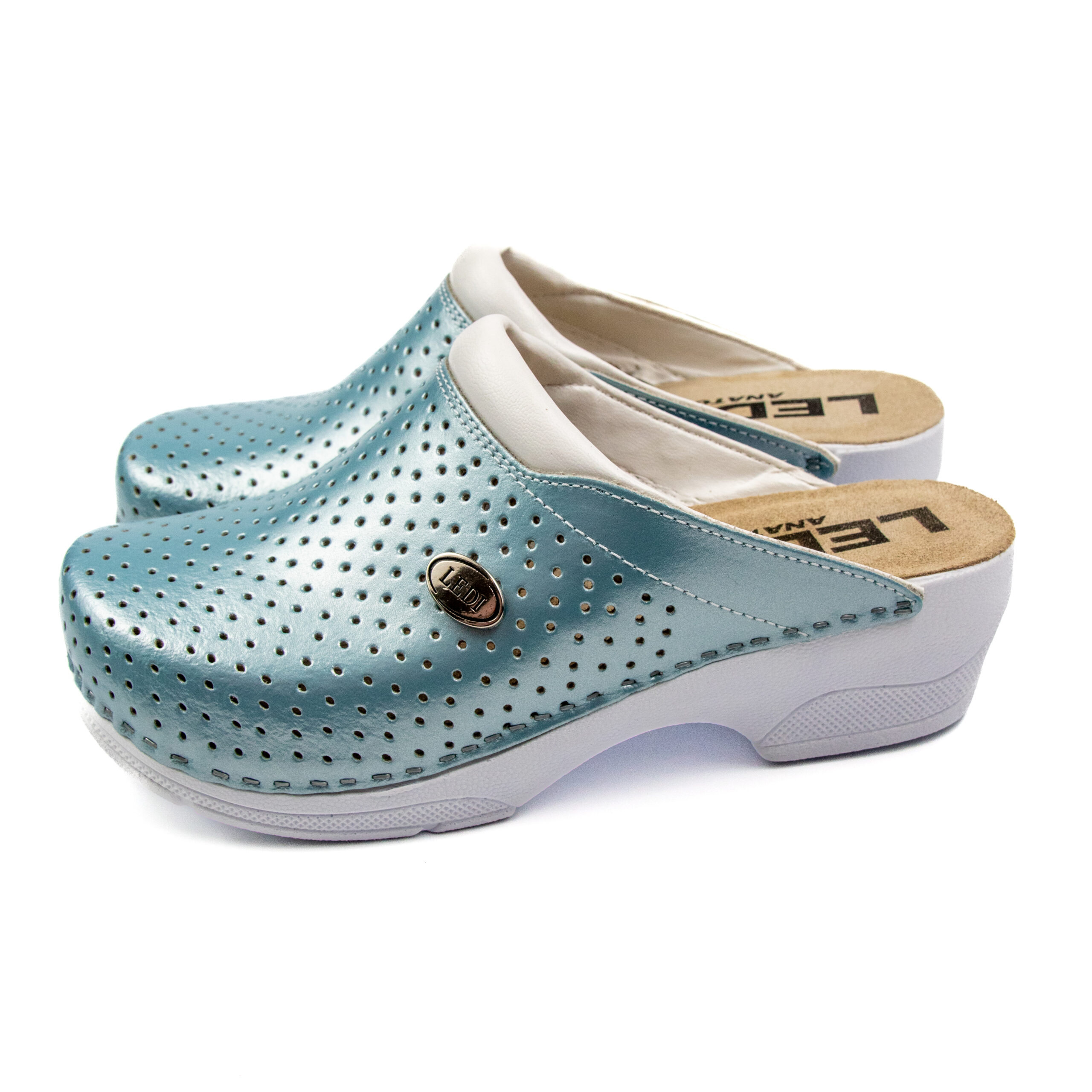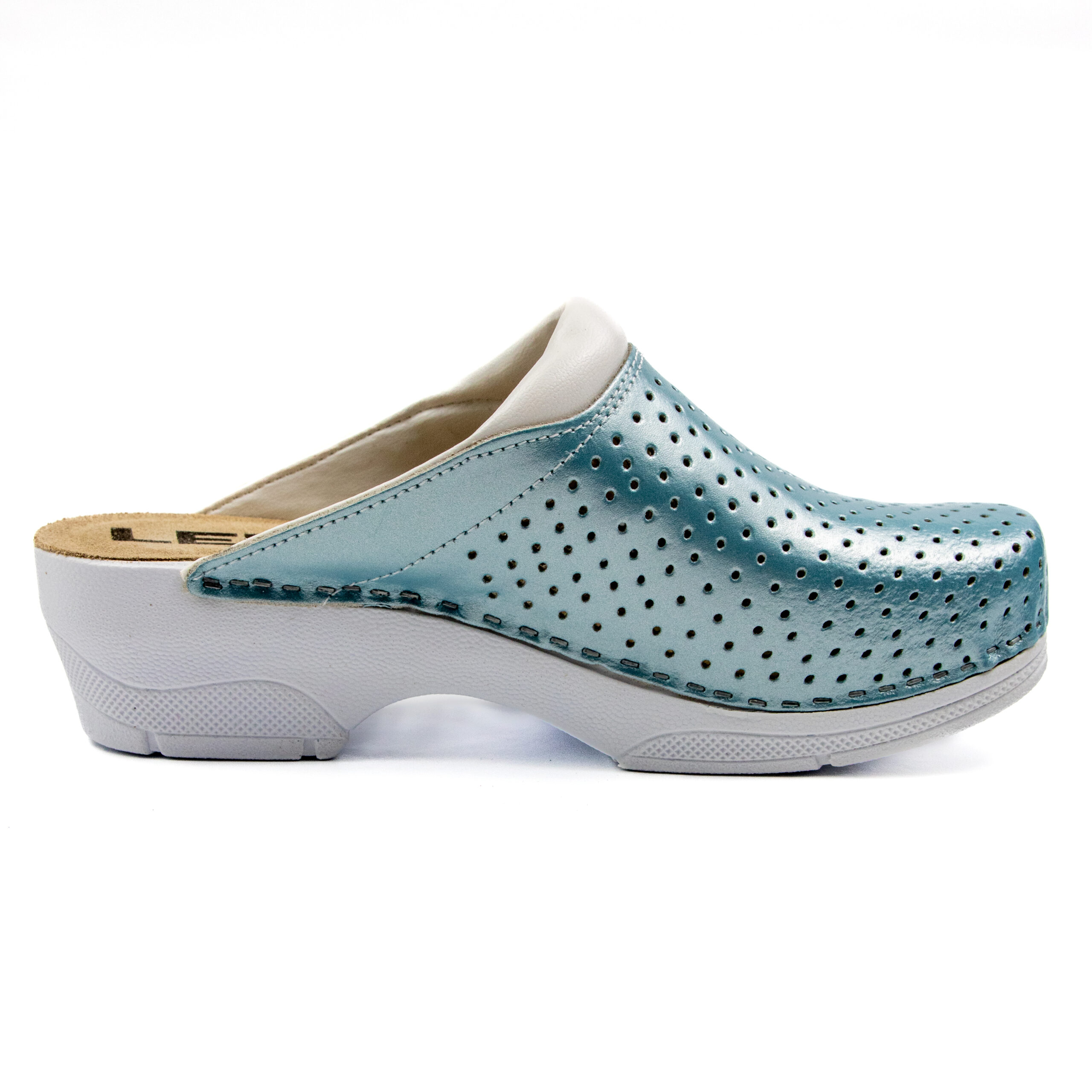 Дамско ортопедично сабо, перфорирана естествена кожа, светло син цвят, на твърд табан, принуждаващ стъпалото да заеме определената от ходилото извивка, на олекотено полиуретаново ходило с височина 5см.