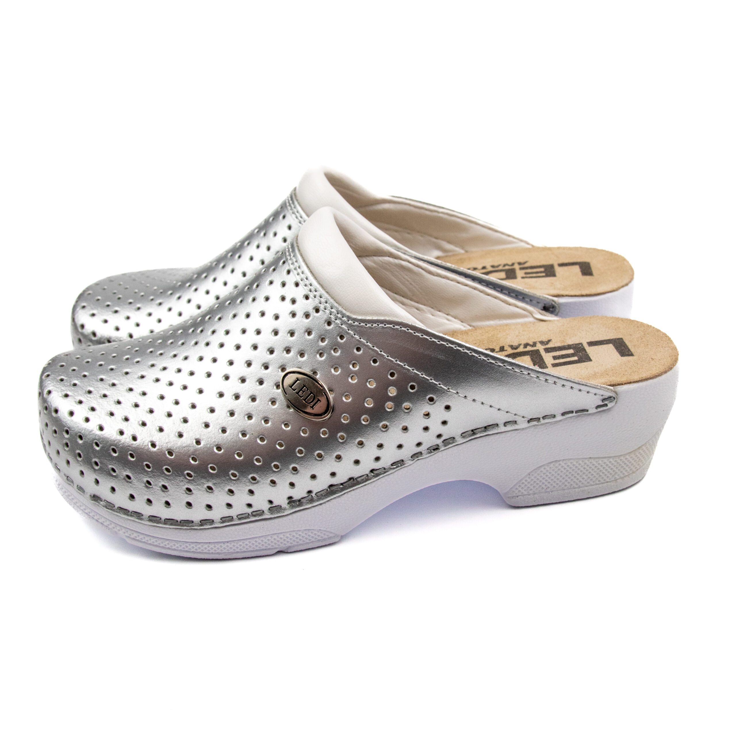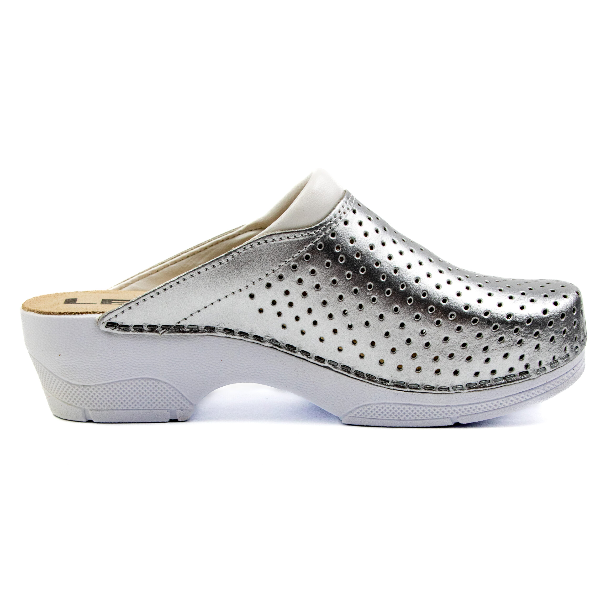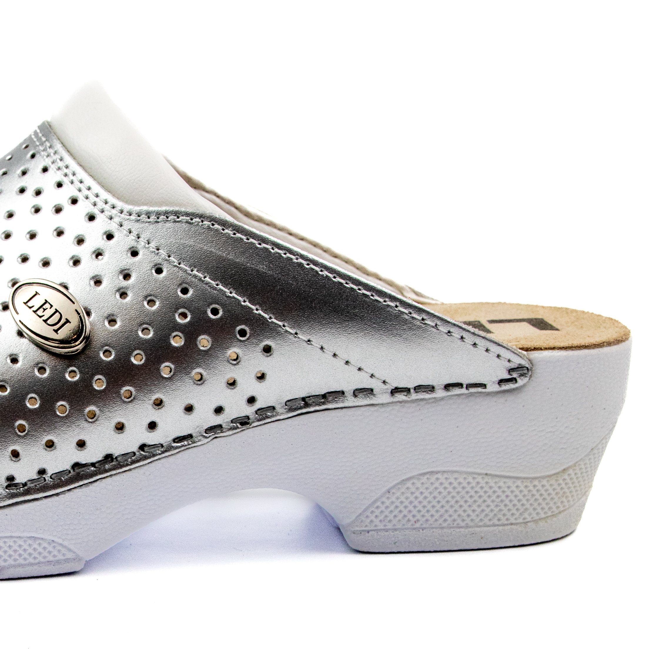 Дамско ортопедично сабо, перфорирана естествена кожа, сребрист цвят, на твърд табан, принуждаващ стъпалото да заеме определената от ходилото извивка, на олекотено полиуретаново ходило с височина 5см.
