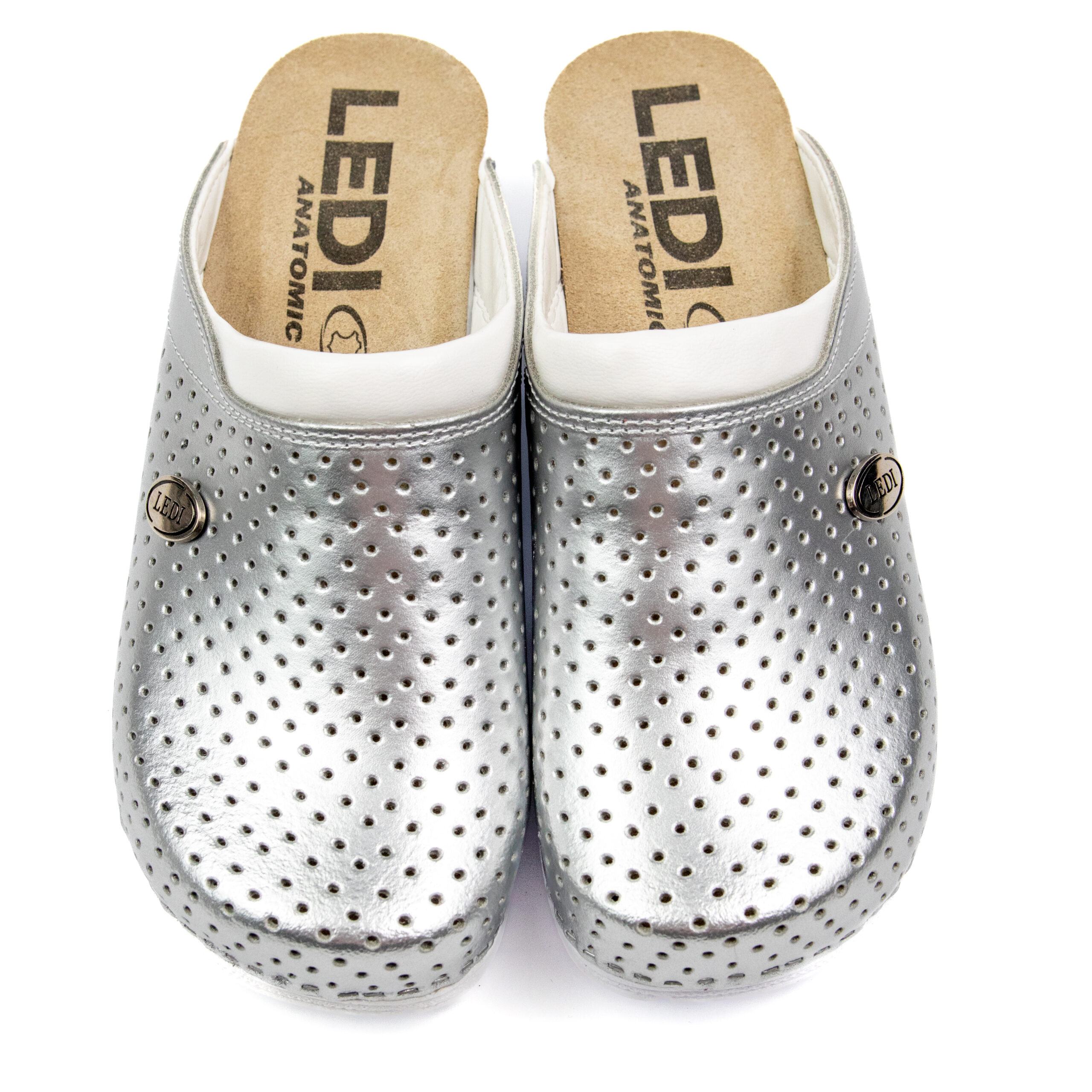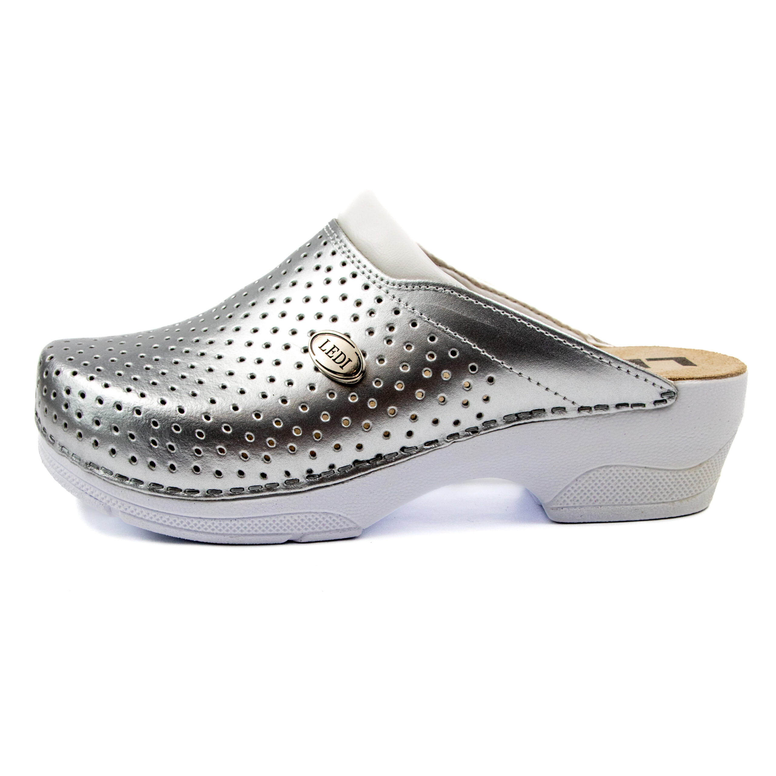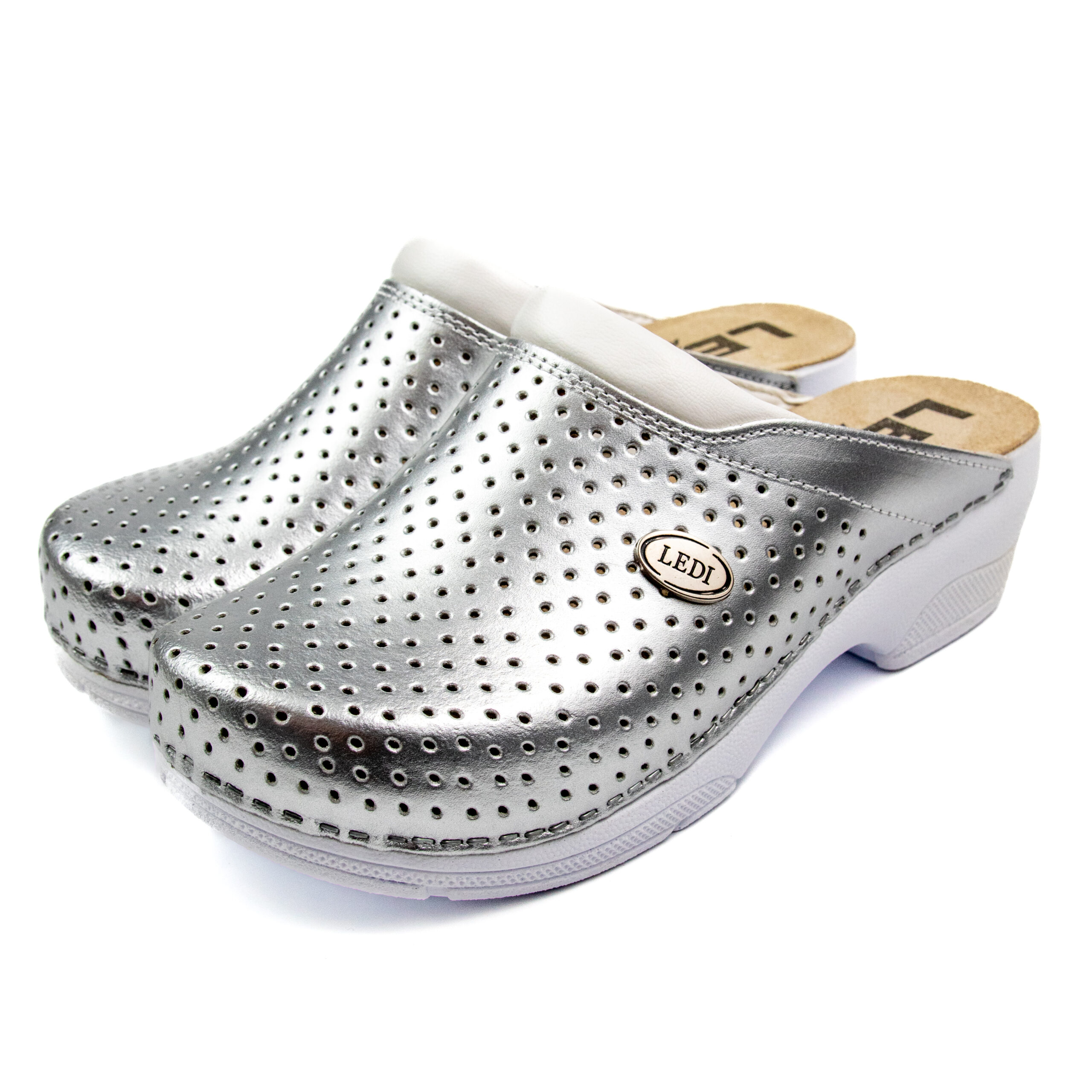 Дамско ортопедично сабо, перфорирана естествена кожа, сребрист цвят, на твърд табан, принуждаващ стъпалото да заеме определената от ходилото извивка, на олекотено полиуретаново ходило с височина 5см.