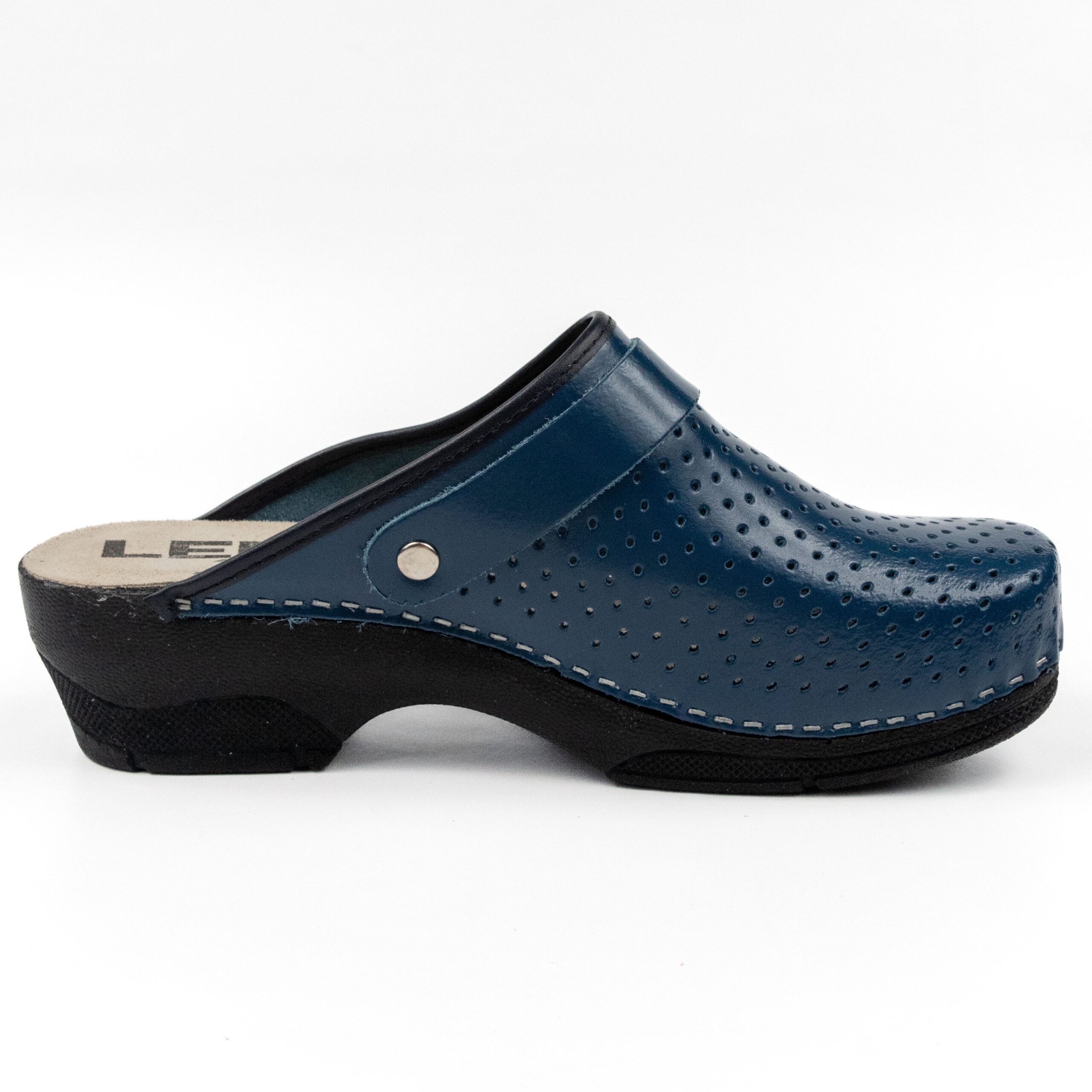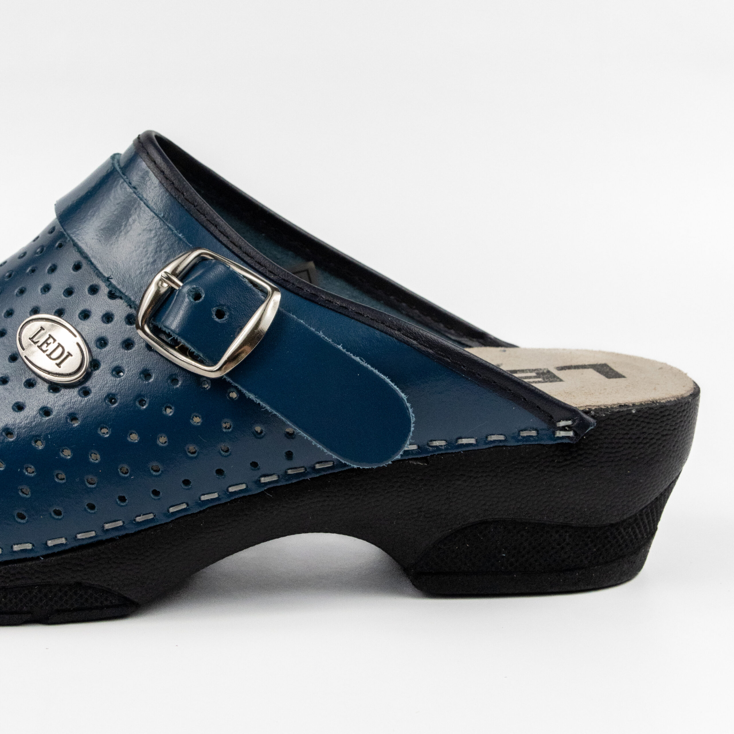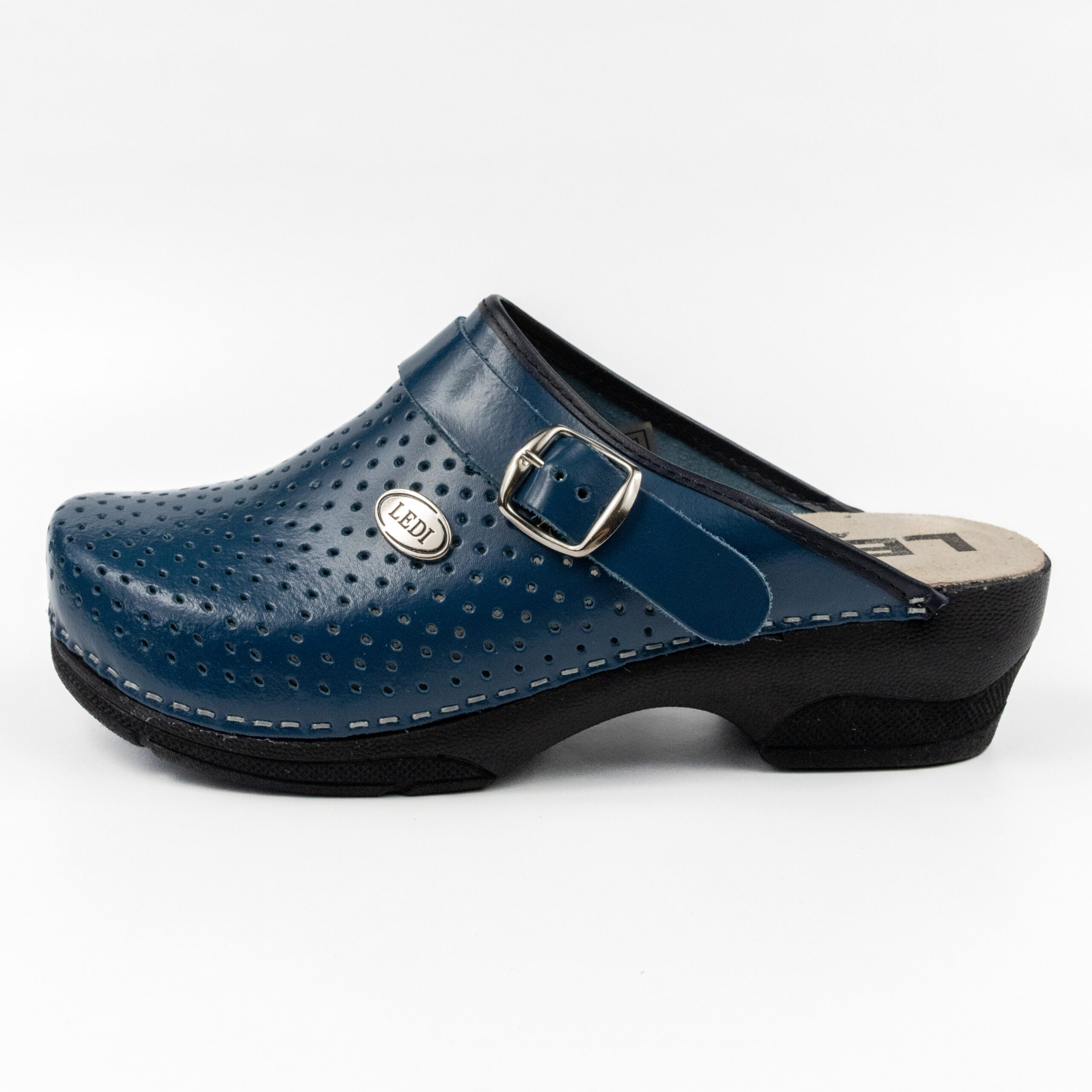 Дамско ортопедично сабо, перфорирана естествена кожа, син цвят, на твърд табан, принуждаващ стъпалото да заеме определената от ходилото извивка, на олекотено полиуретаново ходило с височина 5см.