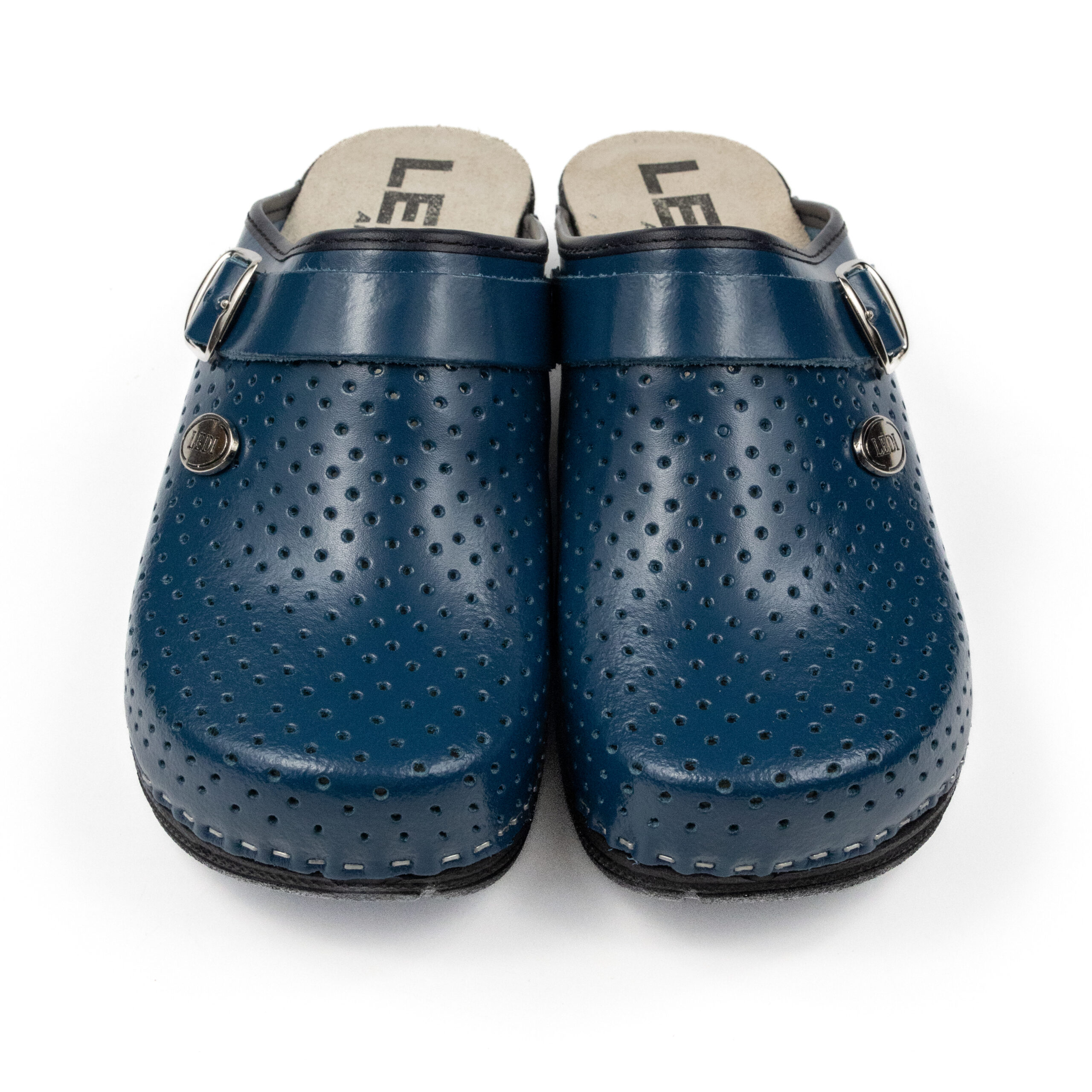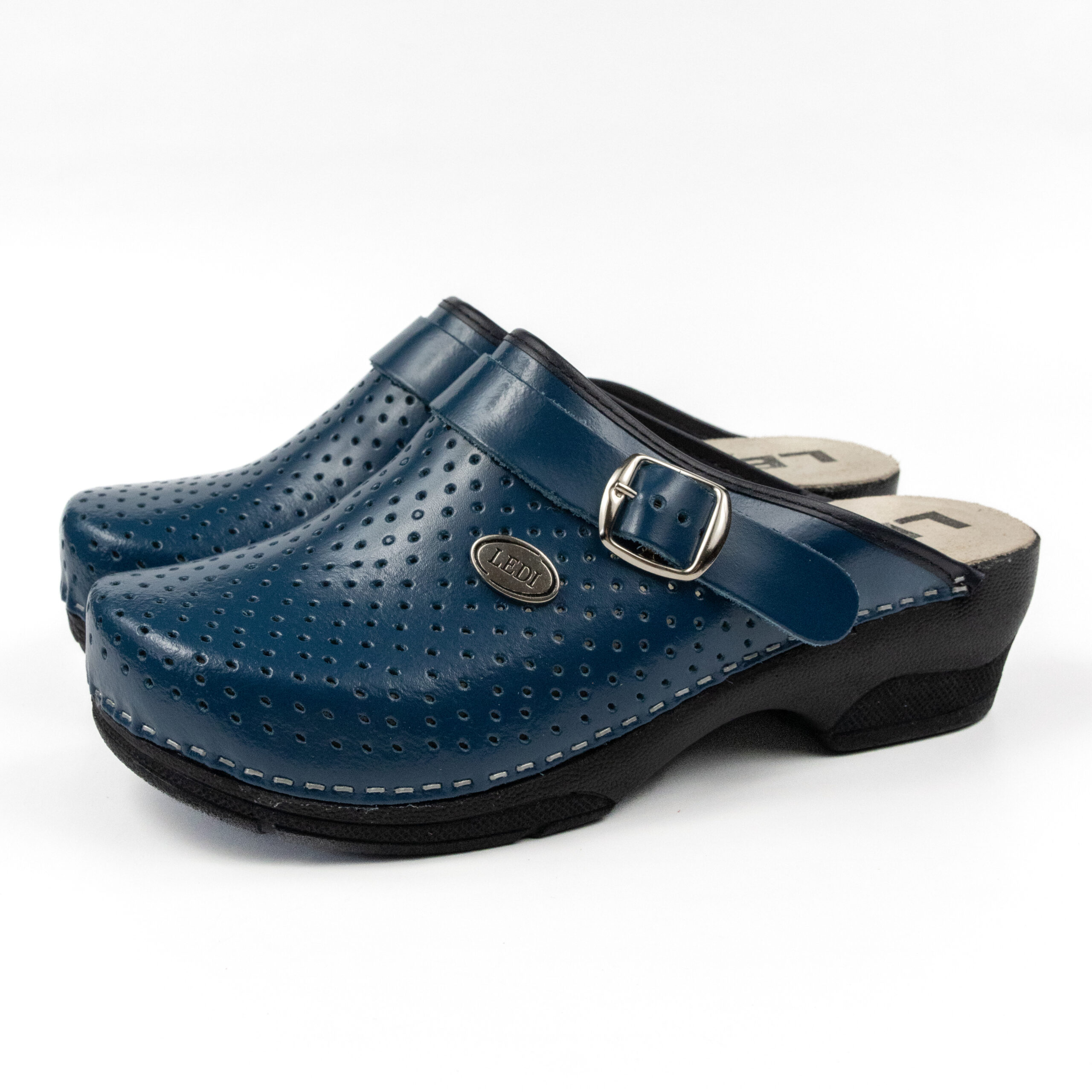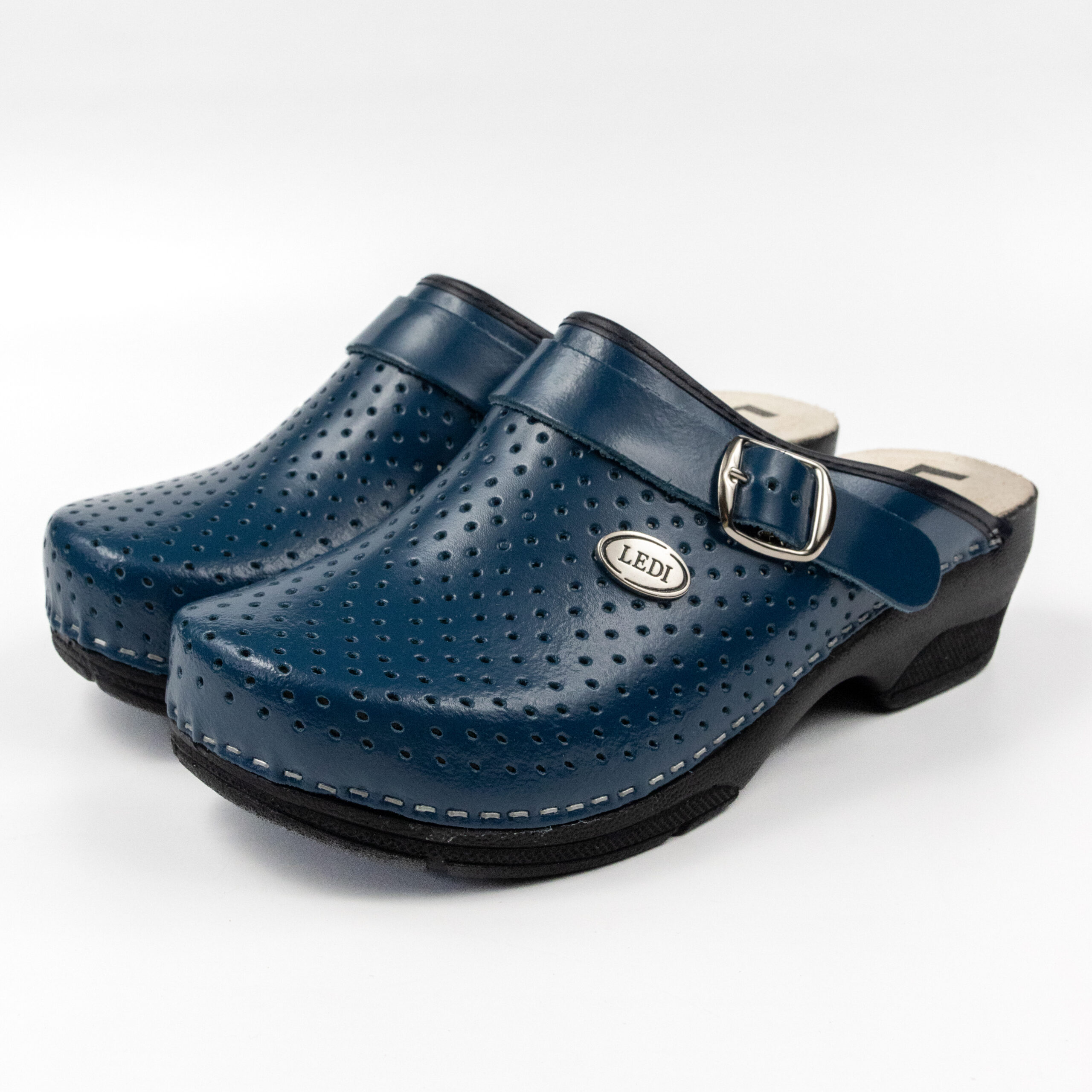 Дамско ортопедично сабо, перфорирана естествена кожа, син цвят, на твърд табан, принуждаващ стъпалото да заеме определената от ходилото извивка, на олекотено полиуретаново ходило с височина 5см.
