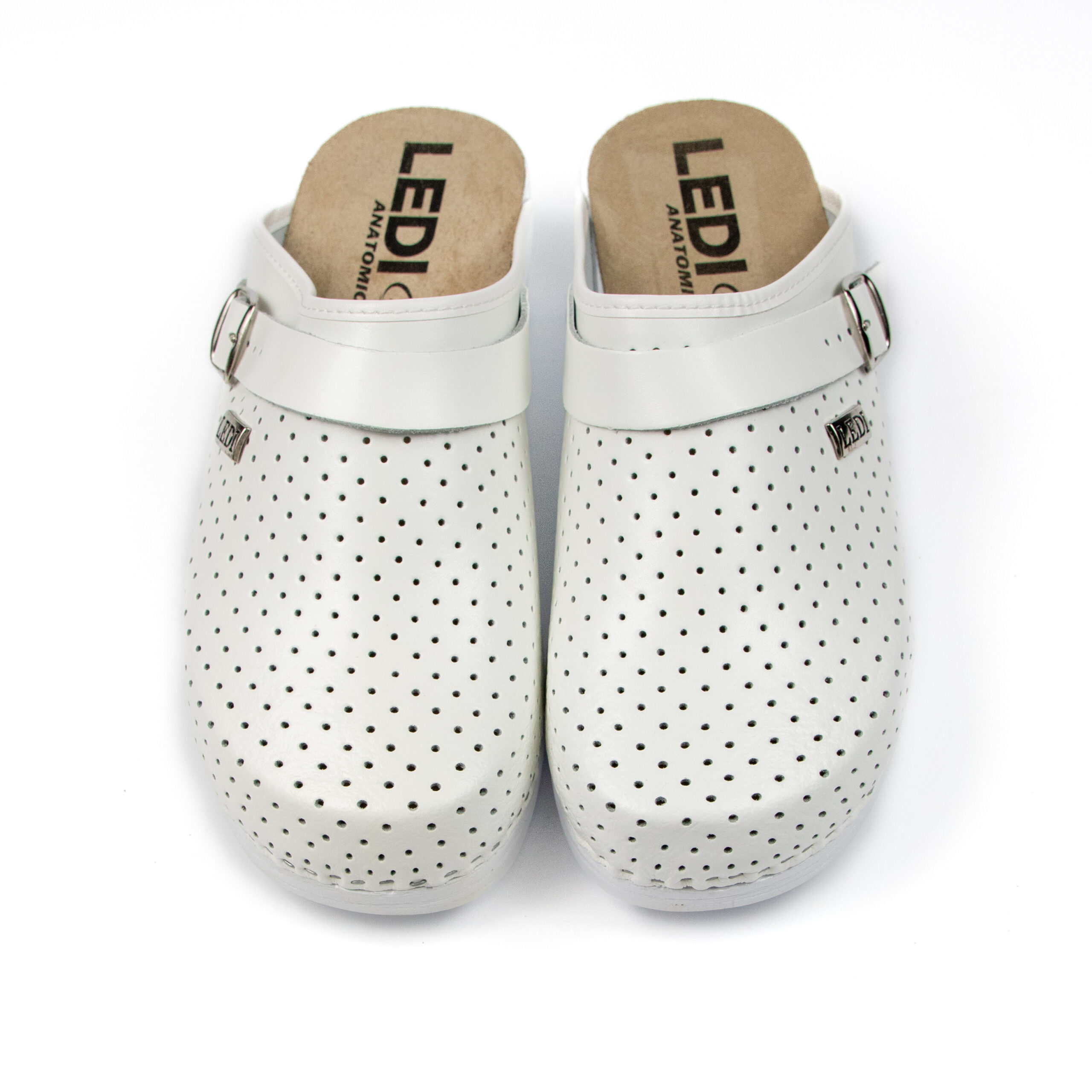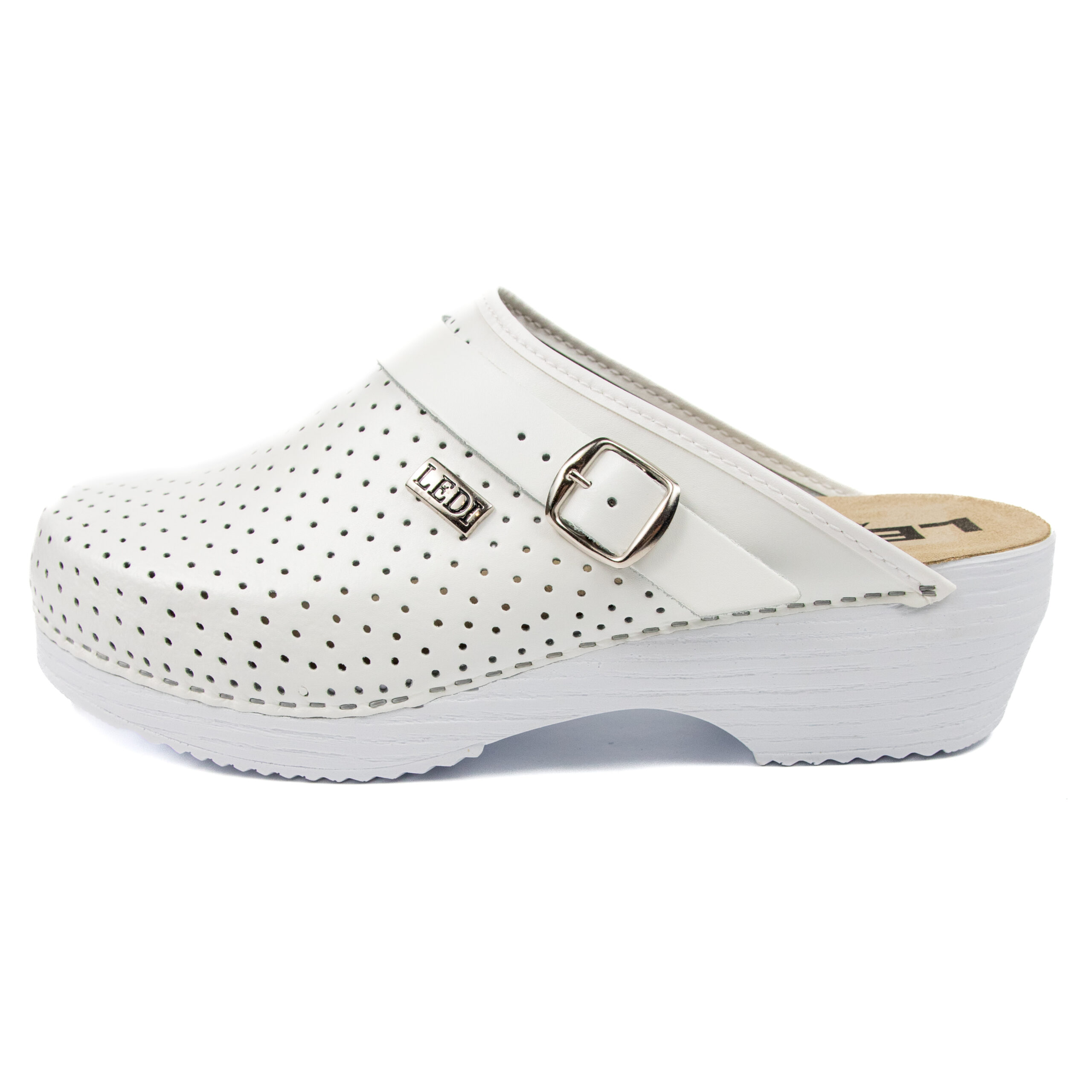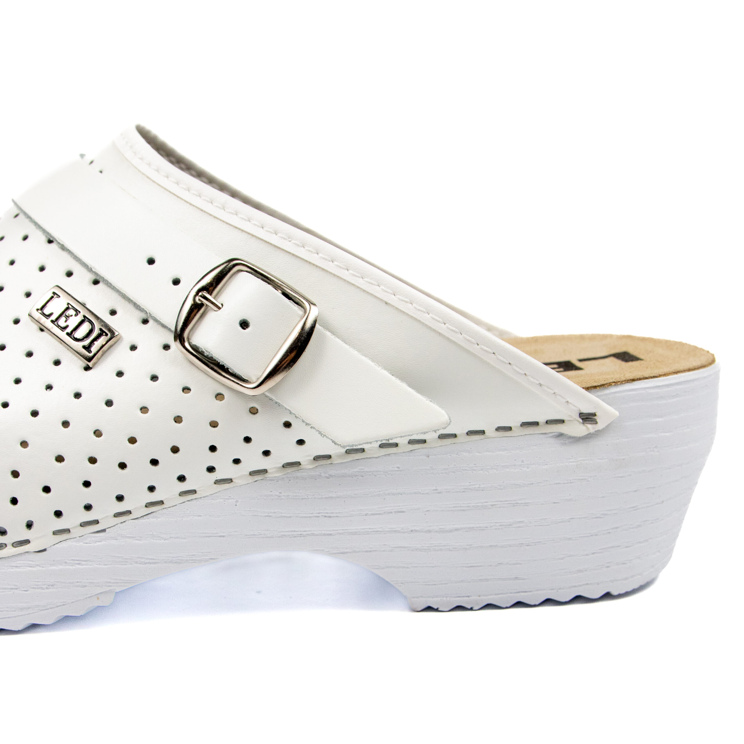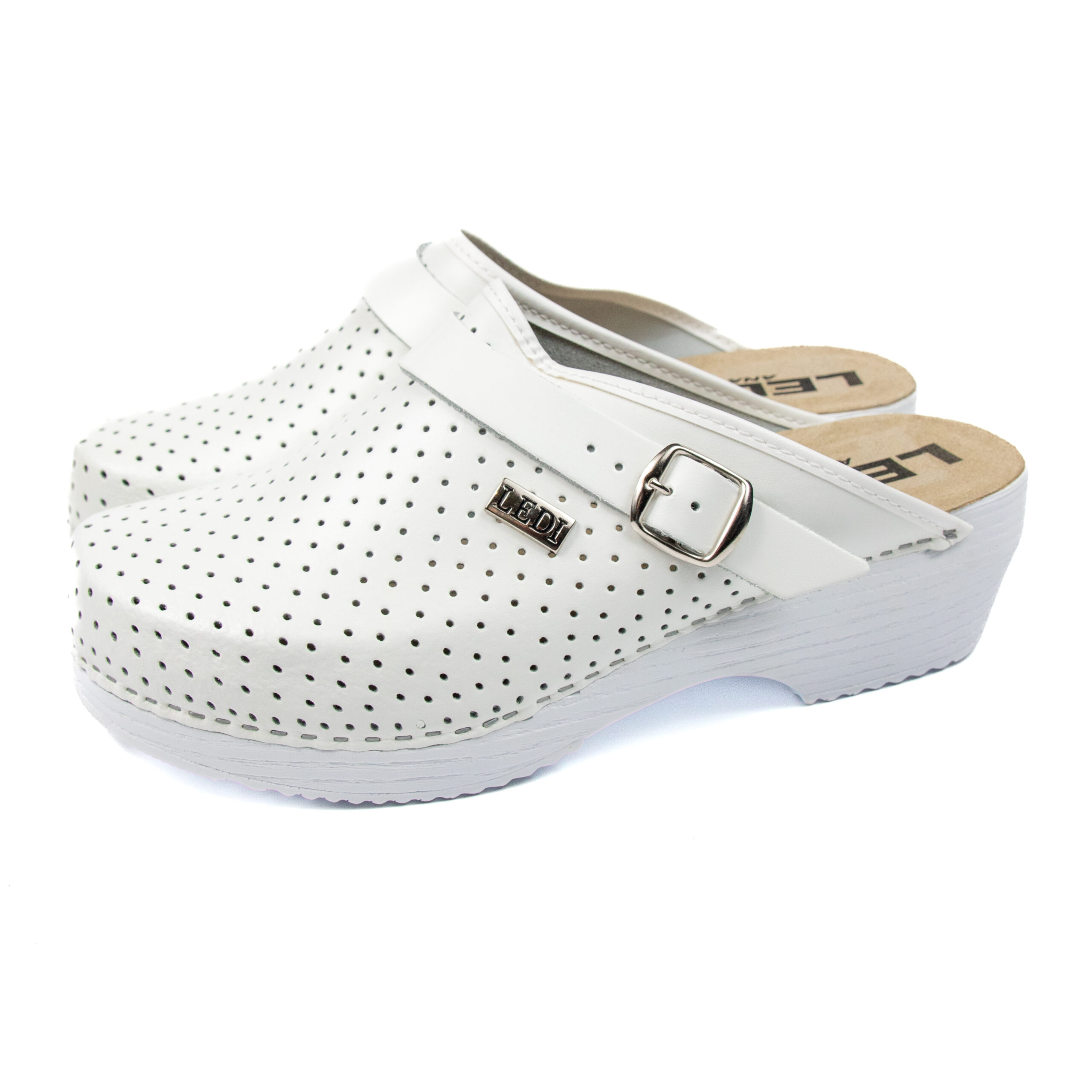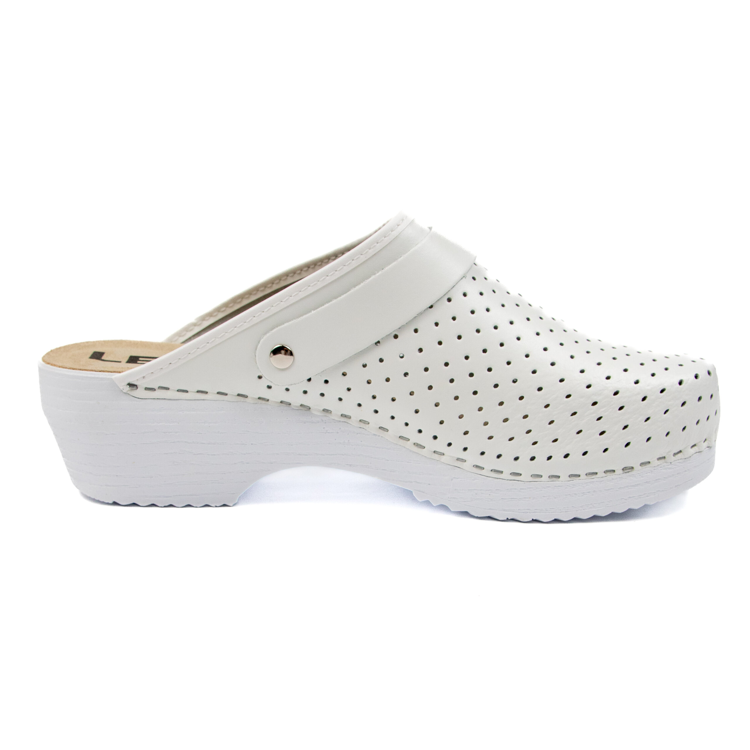 Мъжко ортопедично сабо, перфорирана естествена кожа, бял цвят, на твърд табан, принуждаващ стъпалото да заема определената от ходилото извивка, на олекотено полиуретаново ходило с височина 5см.